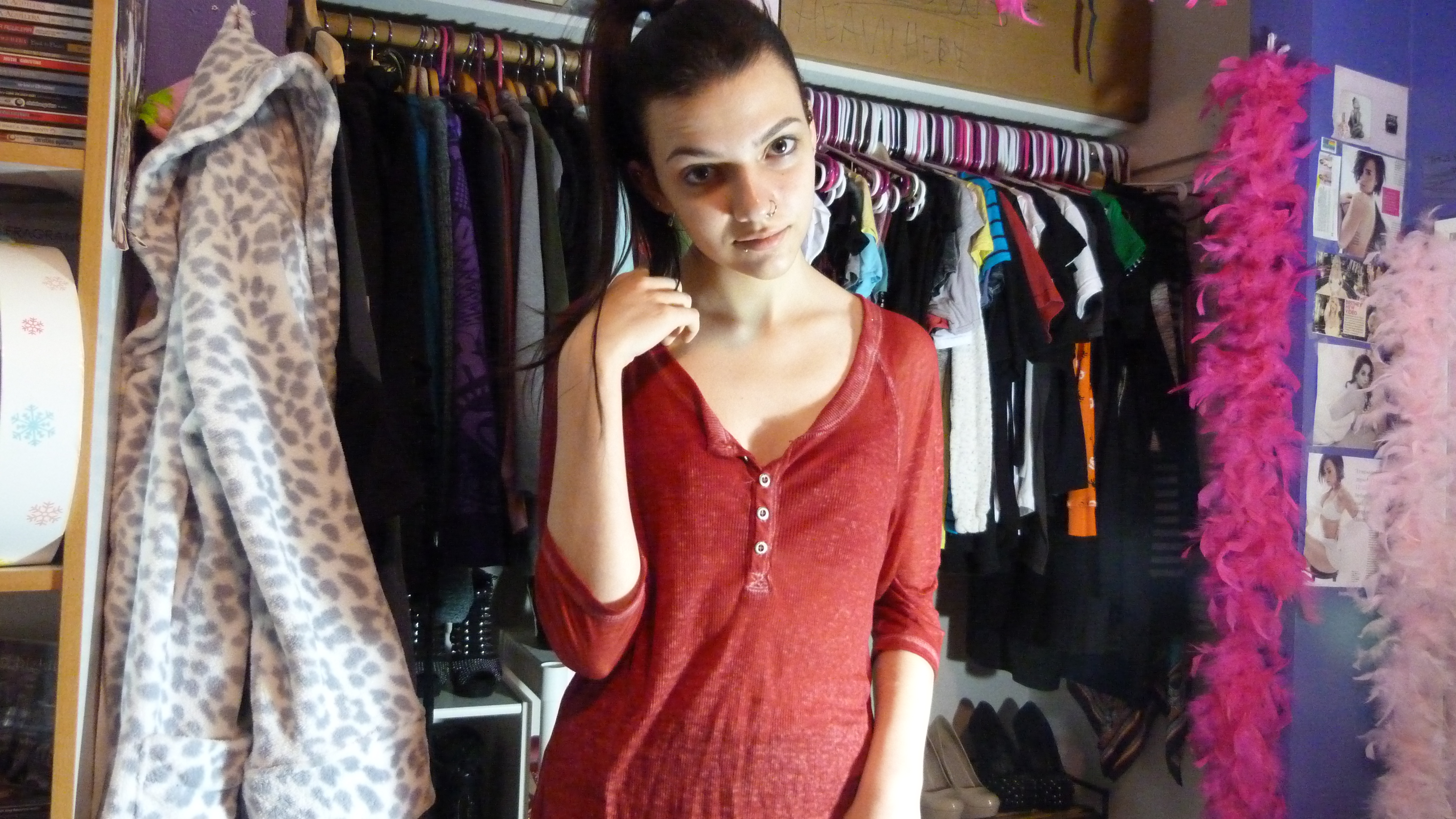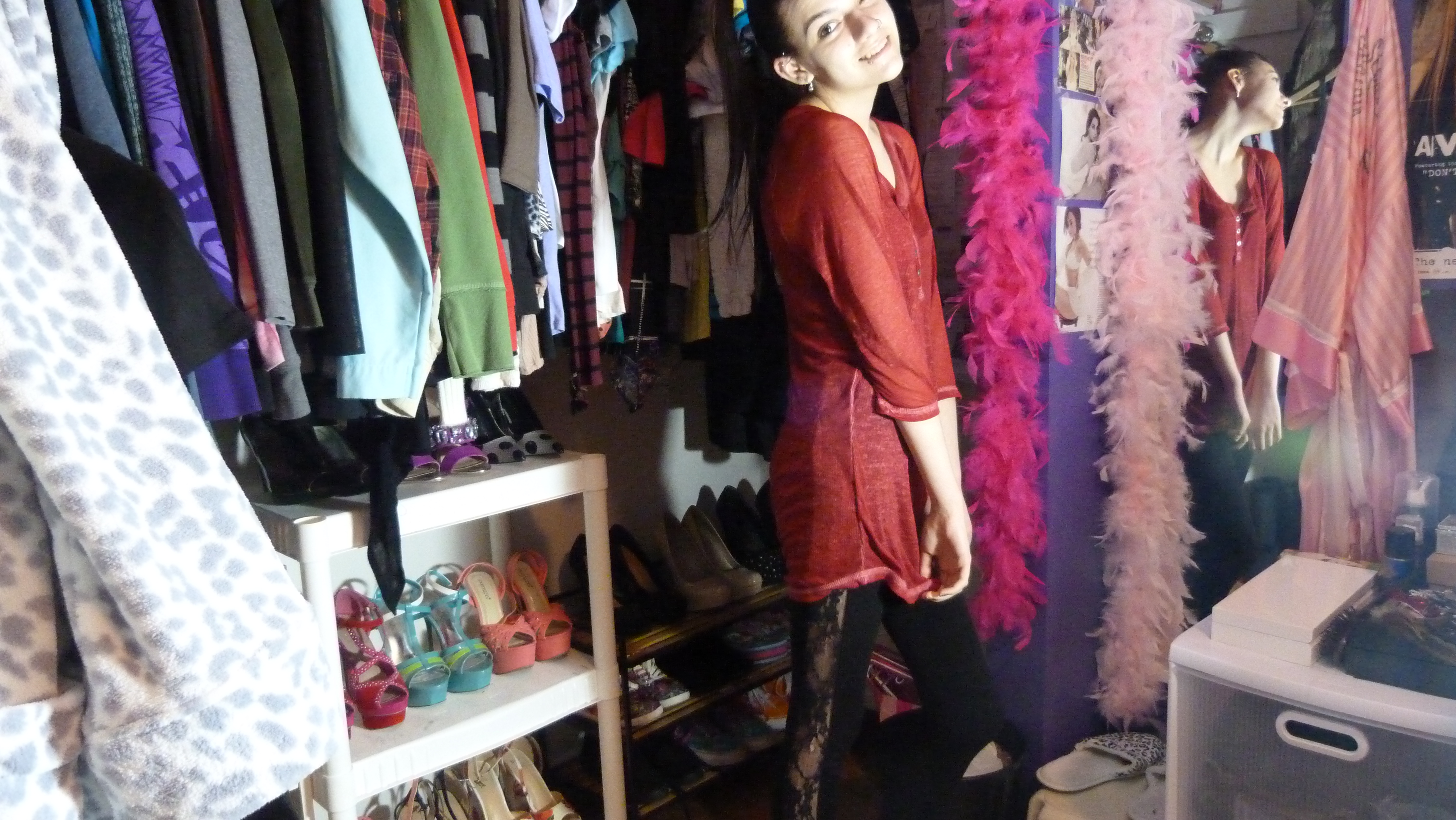 To start off, I’ll talk about the shirt. It’s a nice red color, pretty long on me (it’s a size LG 11-13 from No Boundaries) and pretty sheer. It has a burnout sort of design and is only partially a long sleeve. It goes to my mid thighs. I would never, ever spend my money on a brand like this because I like to save my money for quality, but if someone gives me something I’m not going to toss it just because of the brand. So I usually keep it for a while! Here’s how I styled it.