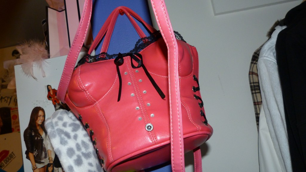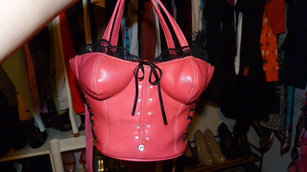 I saved the best for last! She gave me a crossbody/shoulder bag…shaped as a torso in a corset! Haha, most adorable thing! SO me! Definitely my favorite thing of this lot and maybe my new favorite bag. I’m not really sure where it’s from…and the pictures also show the color really badly, it’s just a basic bright hot pink and it’s a lot less coral in person. It comes with two handle-like straps and a crossbody strap (which i prefer) it’s a fair sized crossbody purse it isn’t really that big, maybe a bit smaller than an iPad or something. This purse was made for me.