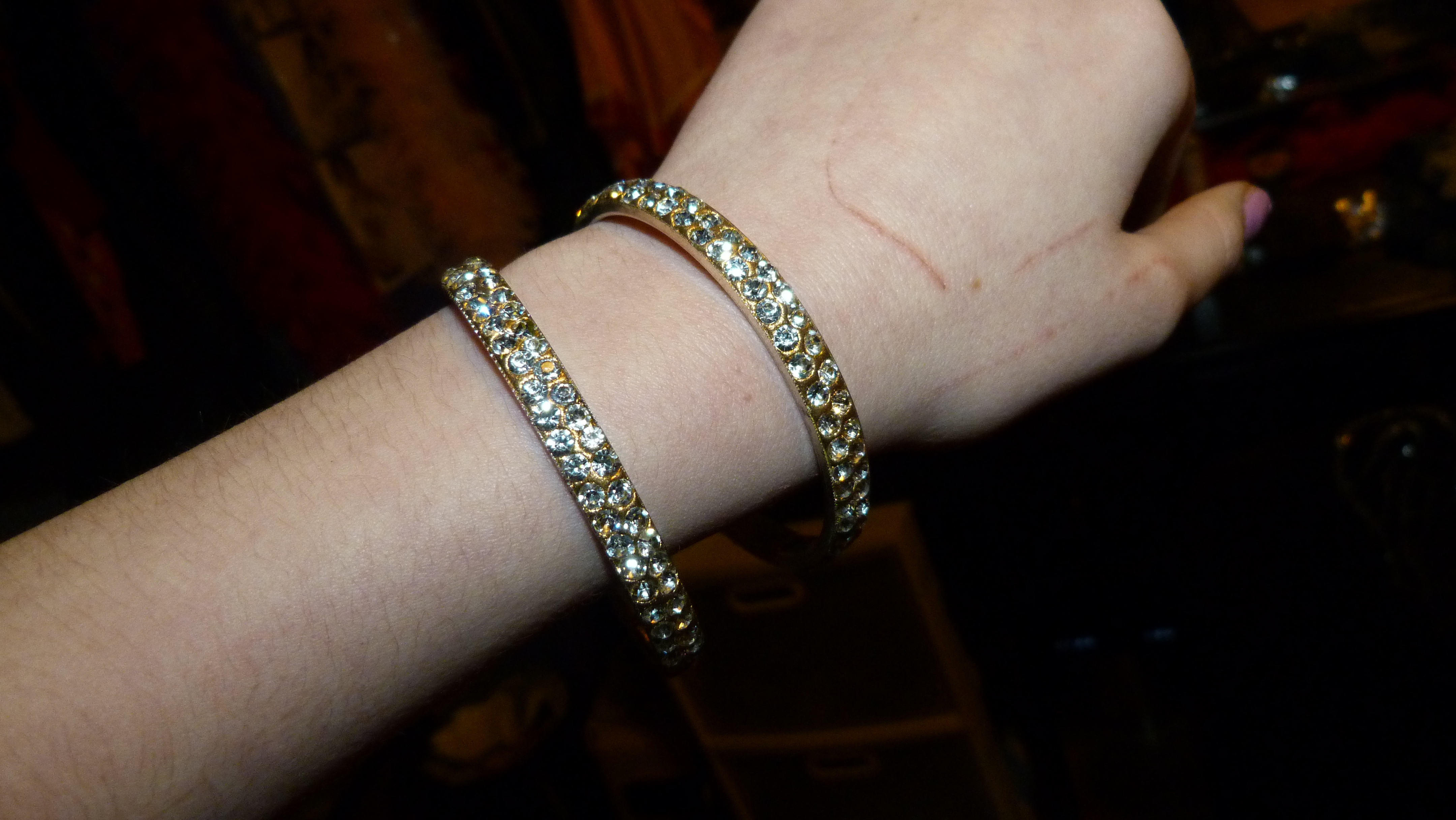 Don’t mind my cat scratches on the top of my hand below, lol! So sparkly with no gems missing, they’re gold with crystals all along the top. So pretty.