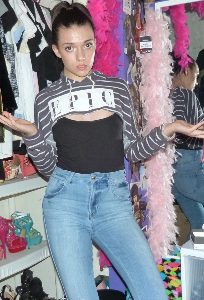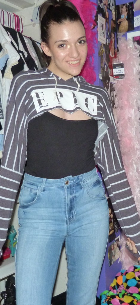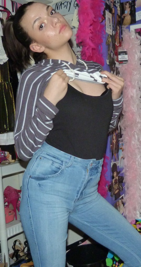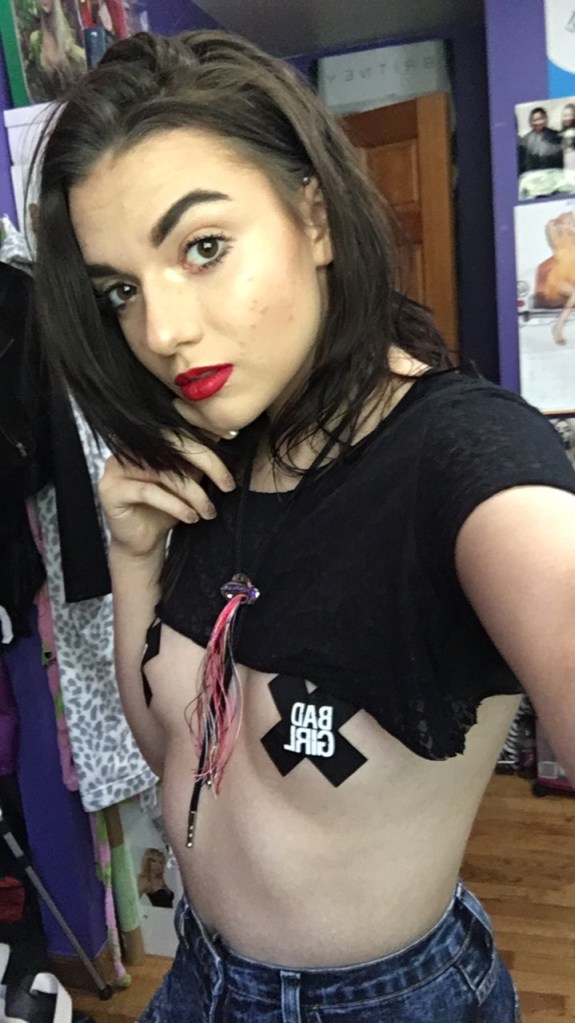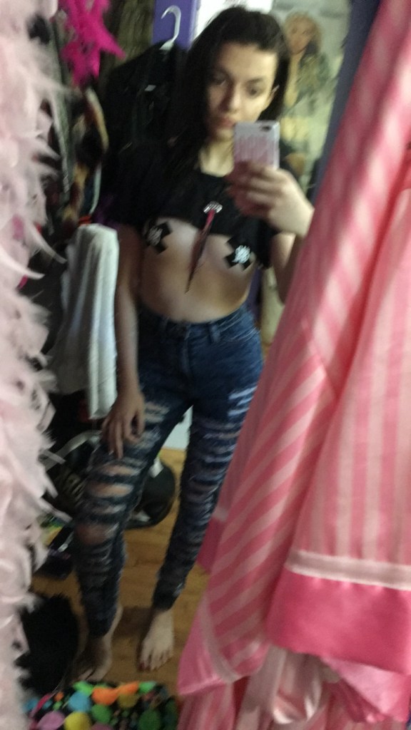 Alright so a couple days after my Epic battle I decided to take this style to the next step. I cut this black shirt really small, and expected it to be like mid-boob length, but it definitely was a lot shorter than that. Lol, so I threw on some pasties that say Bad Girl, drank a smoothie and danced to Kesha on my story. This legit happened and it was great.