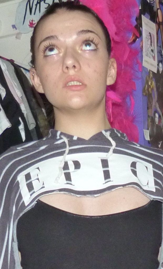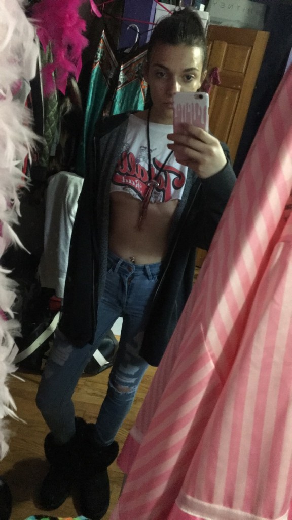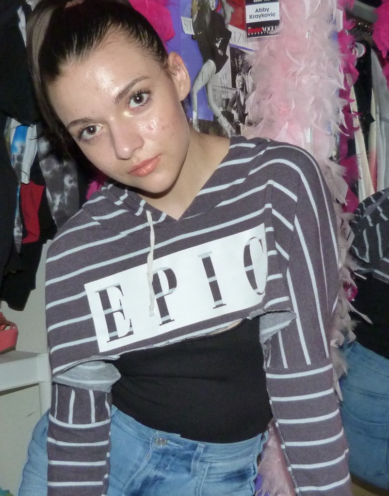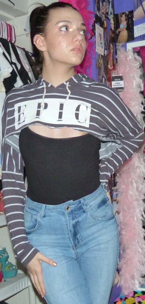 The very first time I saw this trend, Kylie Jenner was rocking it. I’ll include that picture. Anyway, at first I thought it was really dumb. Then I realized it was kind of cool…Like wildfire that trend did spread, being interpreted by a million different people in infinite ways. It wasn’t until now, 4 months later, finally got my chance to fw this trend! I got a big bag of used clothing and had my mind set on re-creating this trend in my own way, so I started snip snip snipping away. Got some really controversial results, but the main one is one I call Epic.