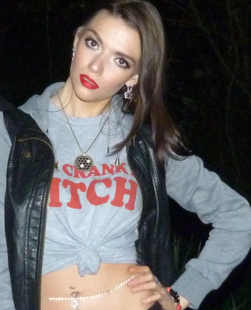 But 4 days before that, I did a little shoot with Ally too, which I’m not gonna crop or anything because I don’t care that much but this was the last shoot of this era before I got my chains all cut off, shackles and cuffs and all that shit, and went into the real world. But of course first there was this, and the reason I wanna show it is because I’m wearing my Nasty Gal shirt that says One Cranky Bitch. Lol. Not only that but I had like a beehive or honeycomb type necklace which feeds into my current obsession with bees!