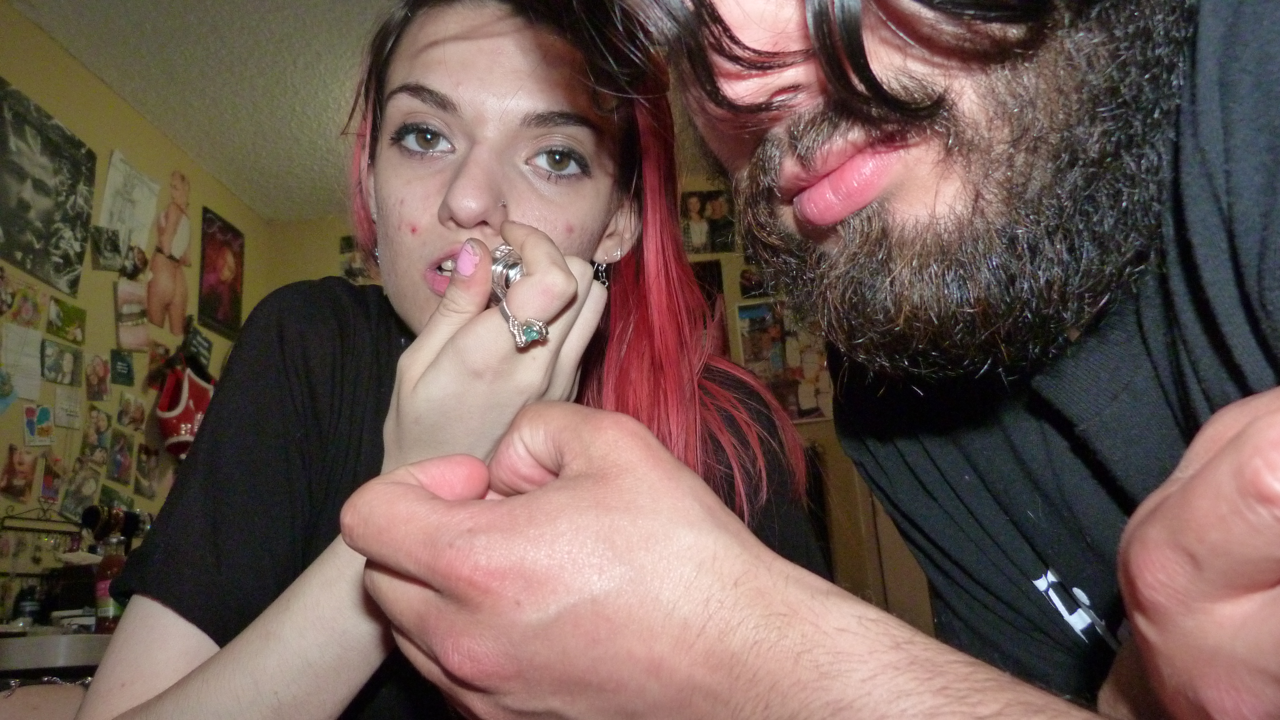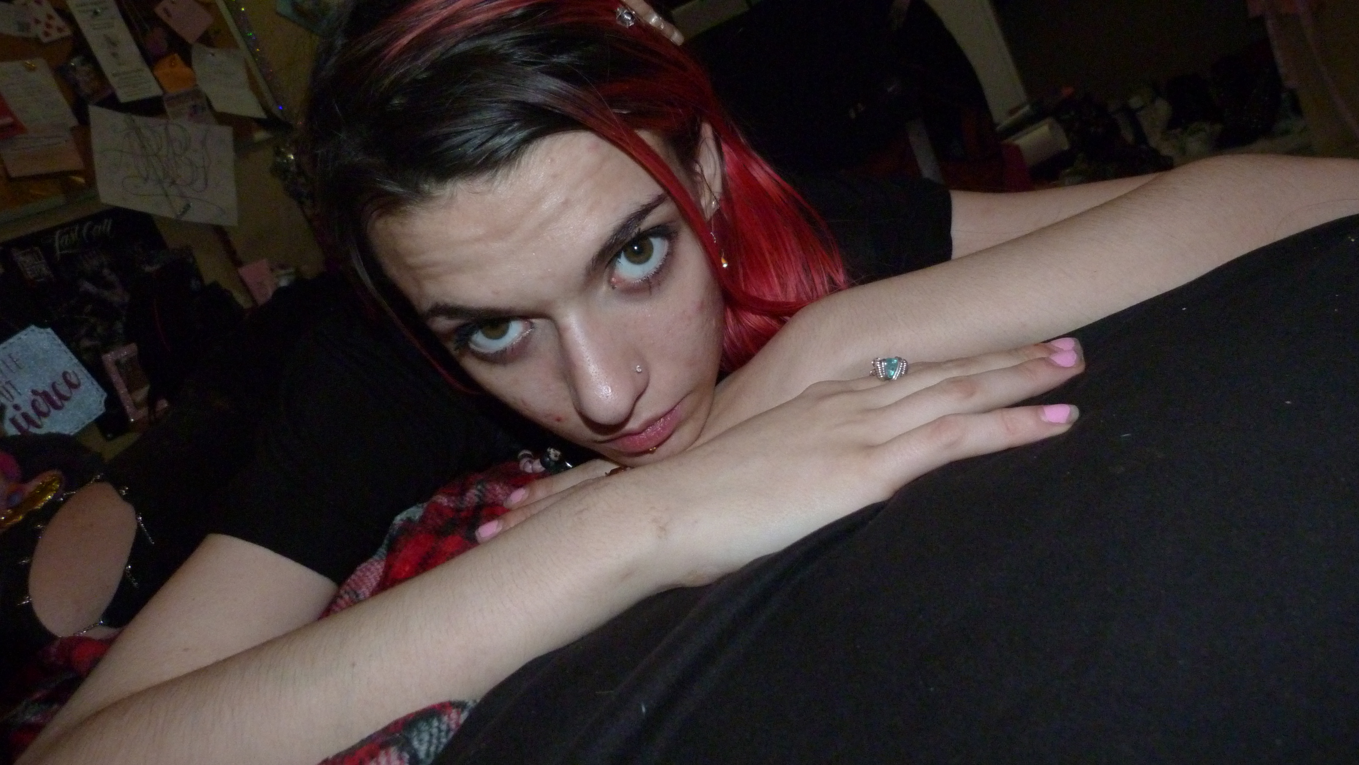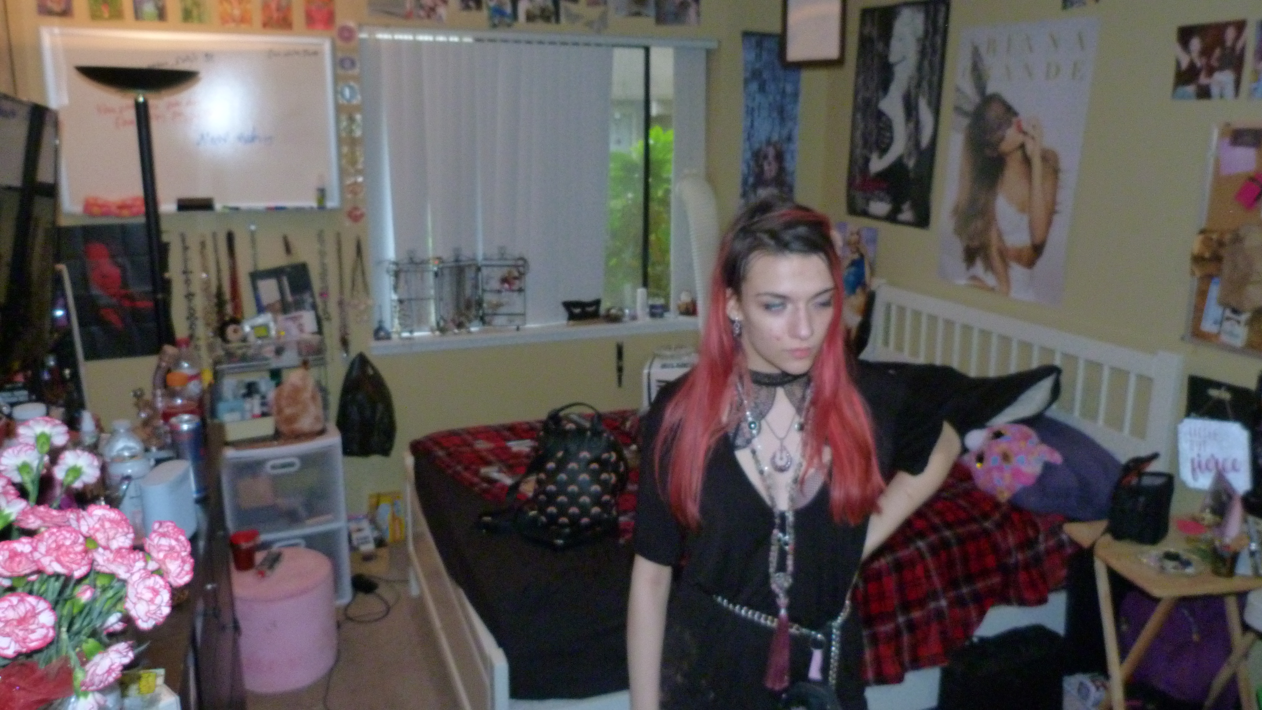 This is like a blurry, misc. mini photoshoot around my slightly messy but organized room that we took pictures of me in! I was wearing one of my favorite necklaces & had slightly red hair, with that cute black top & chain. It’s an 8-picture photoshoot that we ended up doing, with like the 2 room pictures & 3 bed pictures, then finally the last three pictures of me putting on lip gloss! My favorite lip gloss of all time, up & down, this Dior lip plumping pink lip gloss that I lost but was perfect here!