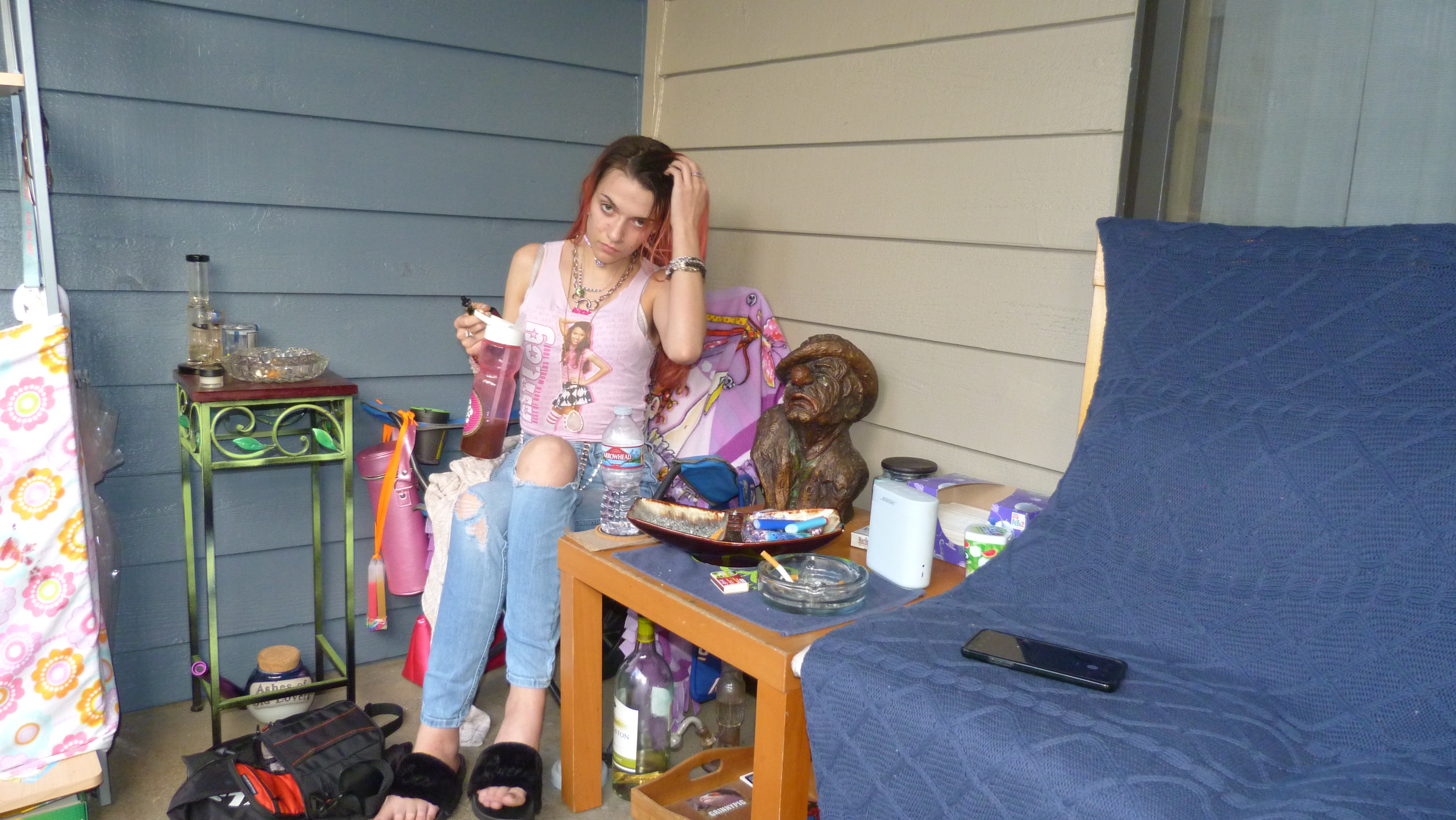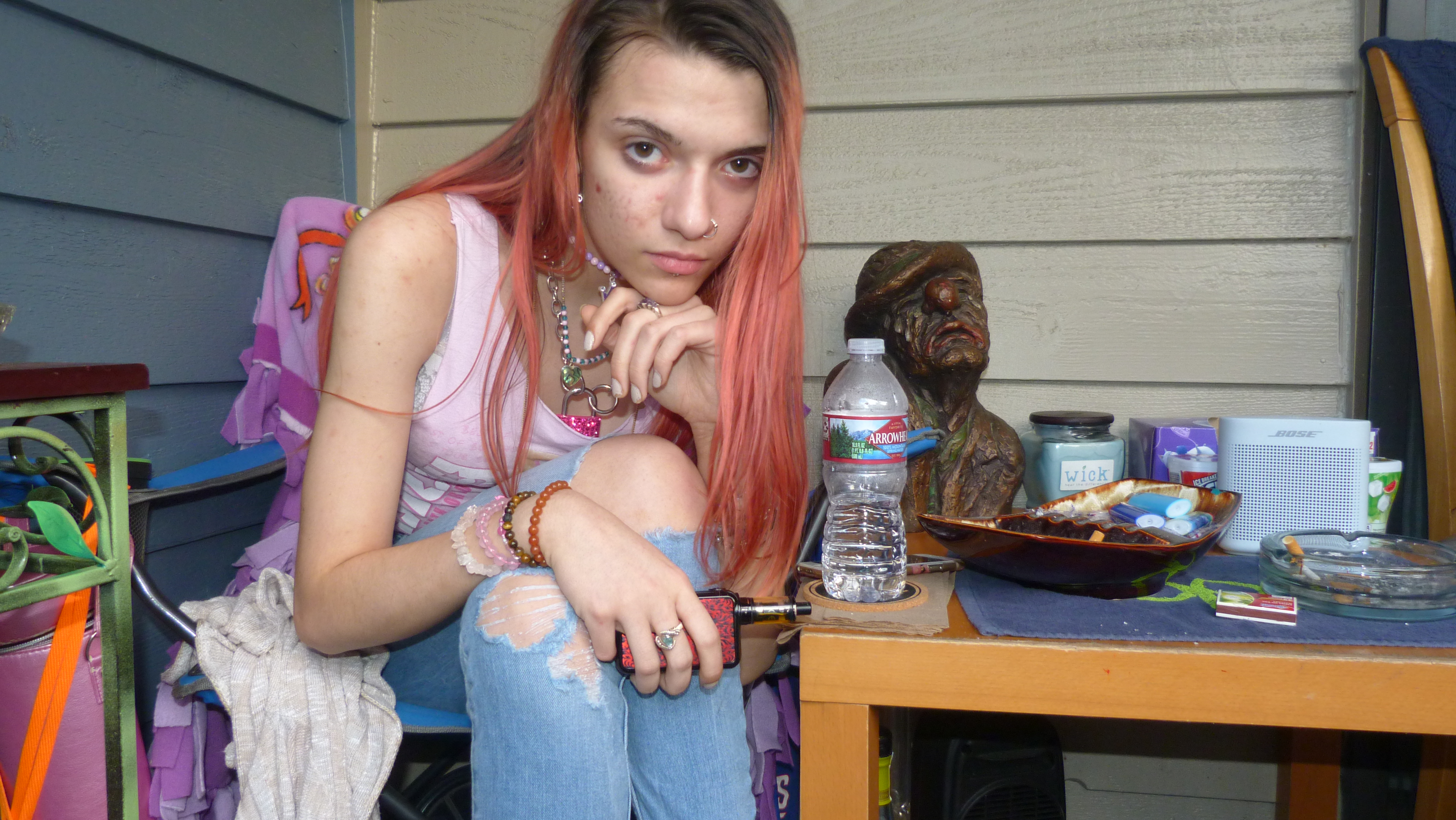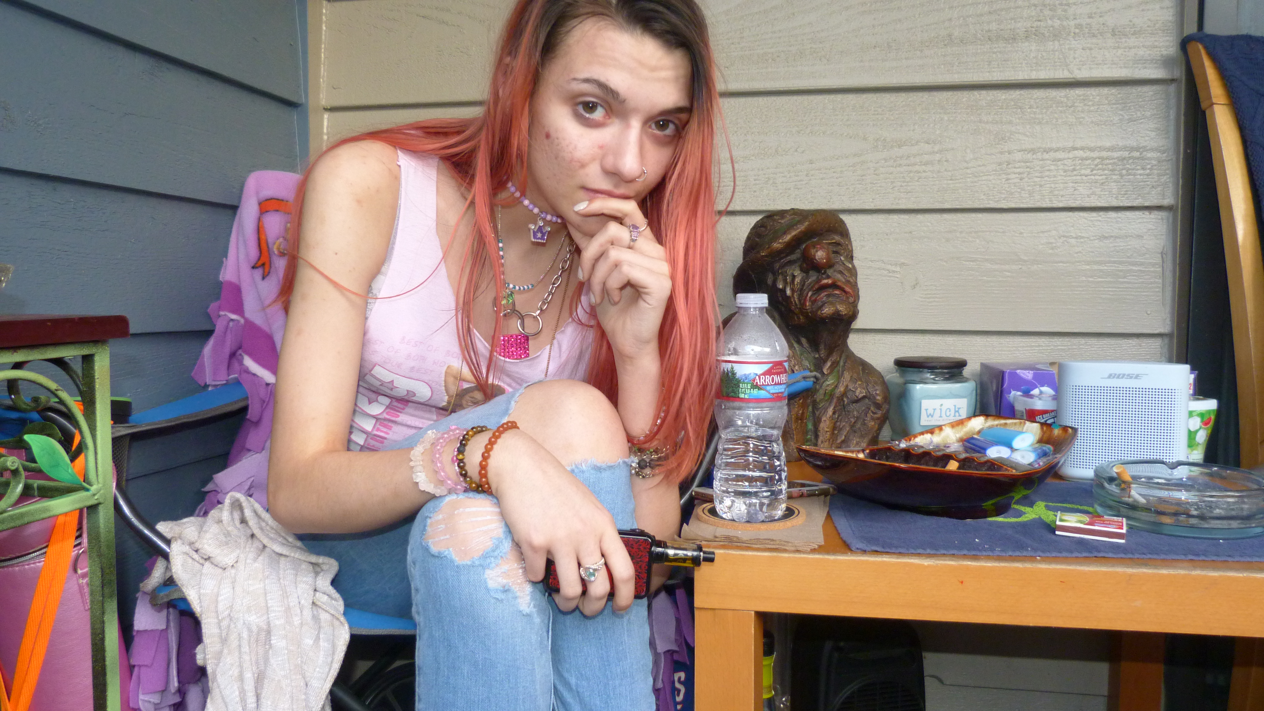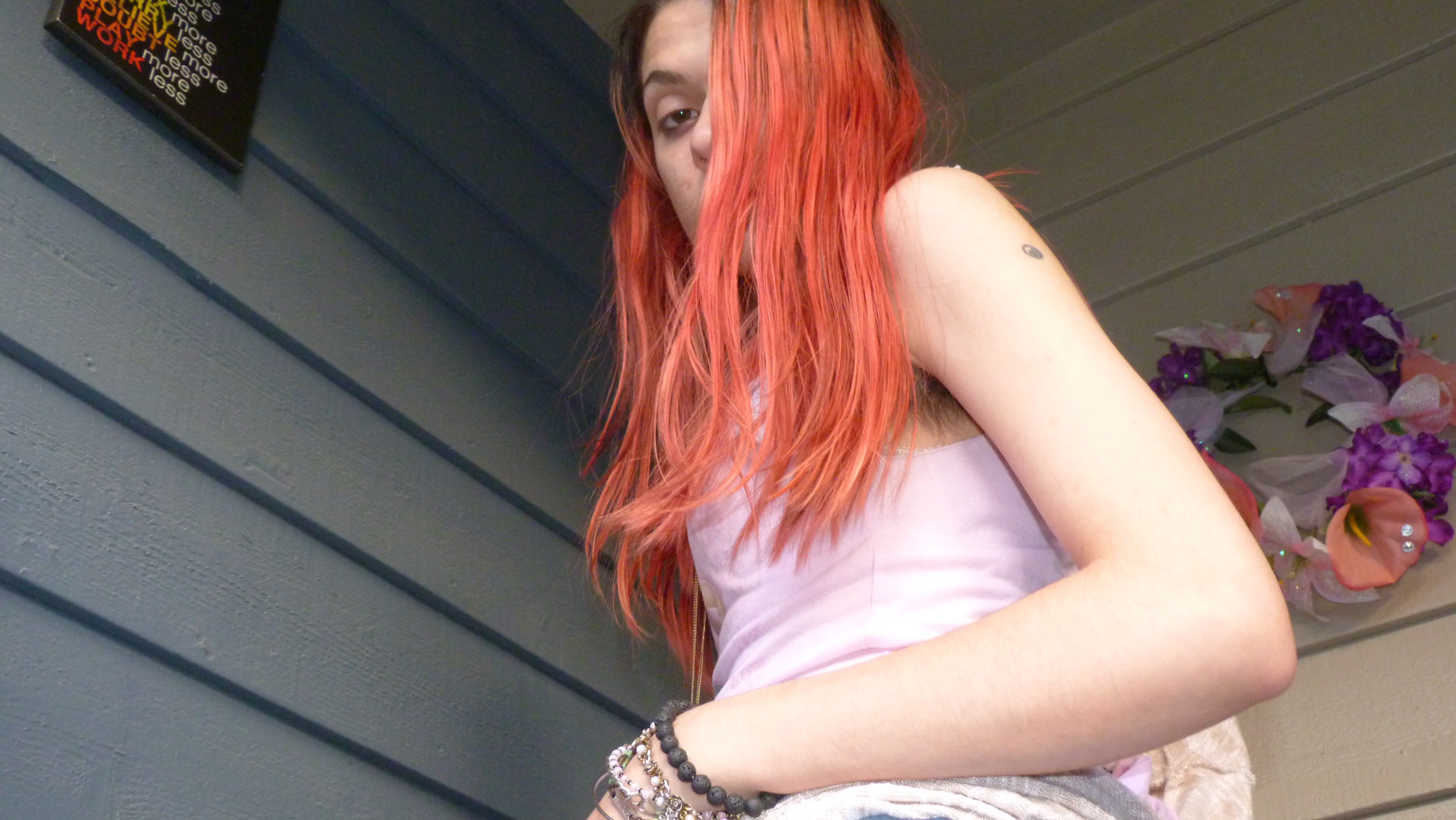 Now for the last two pictures, there’s this cute picture of my butt & the patch on those jeans, with the chain included, then finally a light reddish hair picture that shows off my small yin & yang tattoo (which matched my bong from the first collage of pictures) & was kind of just a last picture for the photoshoot! The jeans picture has good lighting, that was cool & I like my bracelets in the last picture with the tattoo!