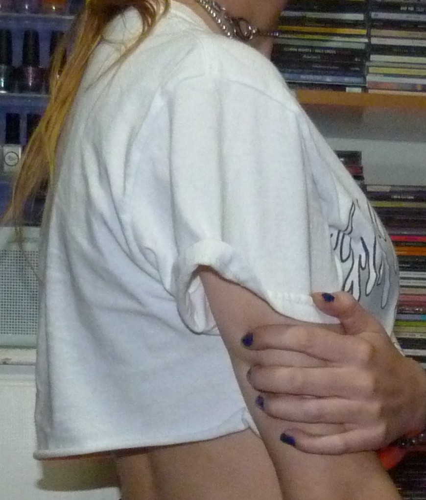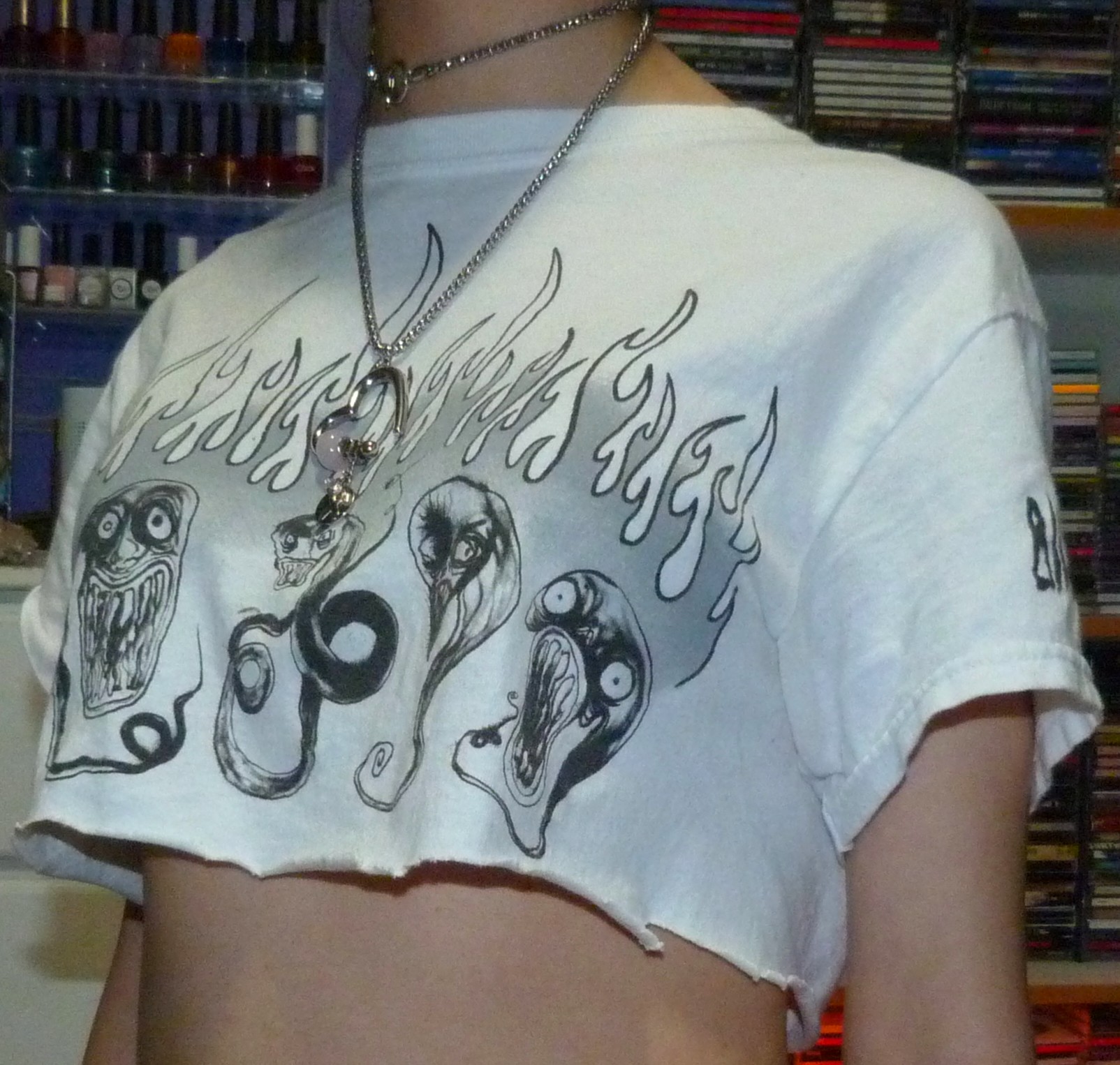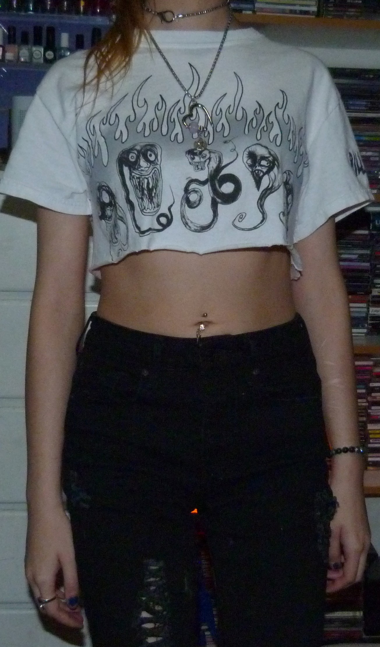 I’m getting to the point where my jewelry is from like “Goodwill” now or something (or just from my stepmom) so maybe not the best time to mention that this is not as good but good enough for what it’s worth, like how every gold piece of jewelry I have is pretty much old or handed to me like Jessie would but it does explain a lot with how much of my jewelry she actually makes or fixes. Maybe it’s not that important but the little lucky guy necklace with the Jade stone in it is a cool thing. So from now on when I do shoots it’s not going to be straight out of a box from any brand, even though Yes! This shirt is from Miss Guided! And it’s not going to be correlated to much that I can keep like a receipt, it’ll just be anything I’m inspired by at the time with what I’m wearing. Inspire me to wear skirts and dresses more and I’ll have something like that for you. But hey, other than graphic tees like this, I have so many concert tees and tops and crops and lots, like both may be considered a graphic tee but they go in a different part of my closet. Now on to the one I cropped! 1/2