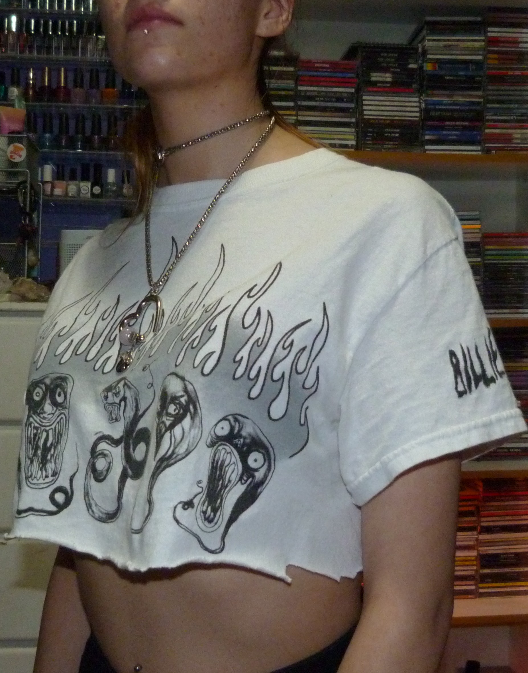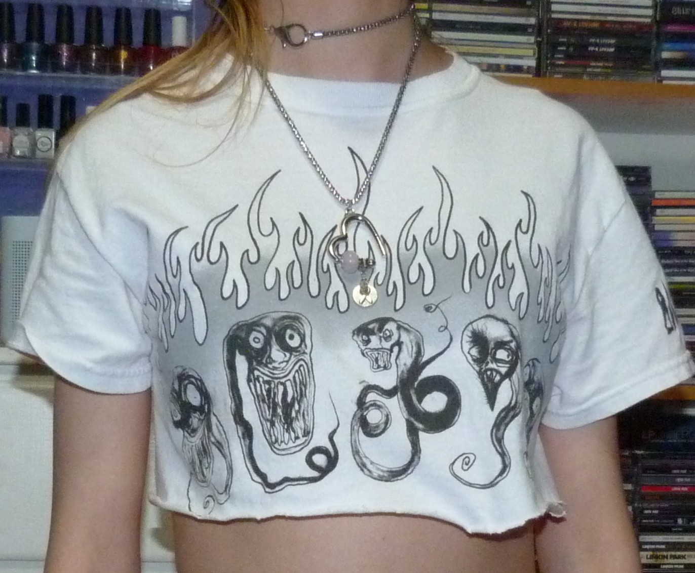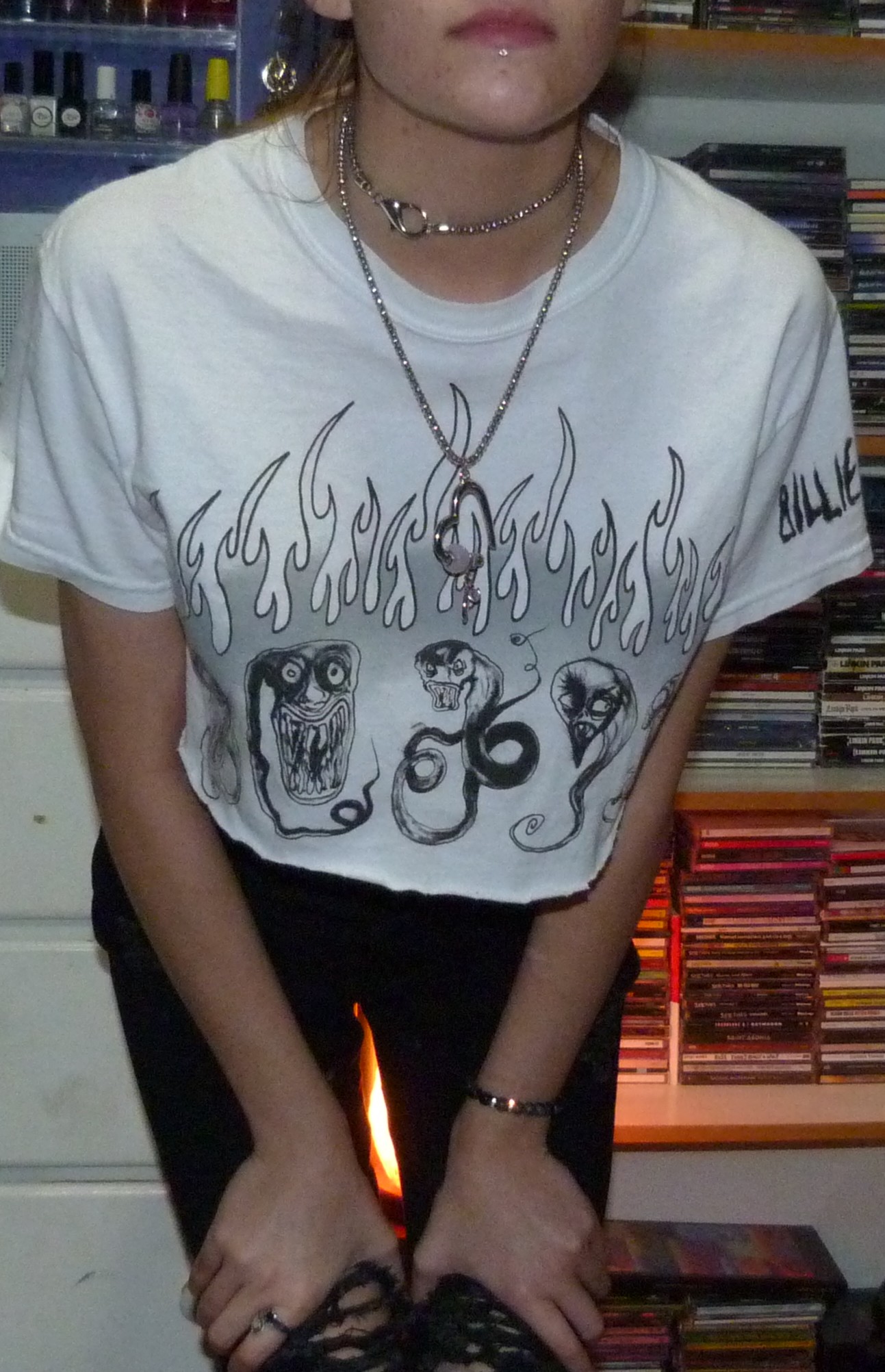 I started dreaming really well a couple weeks ago (and yes I’m 22 now, my birthday was on the 15th) and now I’ve been loving sleep. Seriously I think these are nightmare monsters on this shirt, and what inspired me to finally cut it was surprising actually, because I had two Billie shirts from the last Seattle concert she did but I didn’t get to see the concert. I missed it, sort of, but at least we got the shirts! Still not sure if I care to cut the other Billie World Tour crop with the dates on the back so I’ll just leave it. For now I actually got home and took pictures of this shirt one time when I was hanging out with a friend wearing it, so yeah November 11th is when I did this shoot and believe me that I call it Scary World. I’ve been inspired a million times by songs and the names tied to them, but I wanted to call this just that. It seems like what I’d call this shirt. So Celebrity Merch Base will be different but it’ll be a collective of all these pictures similar to this with just way less writing so that’s always a good thing to catalog. Let’s check out more pictures of it, I know what month it is, it seems weird that I’ve been blogging with months going by in between but I’ll pick up the speed.