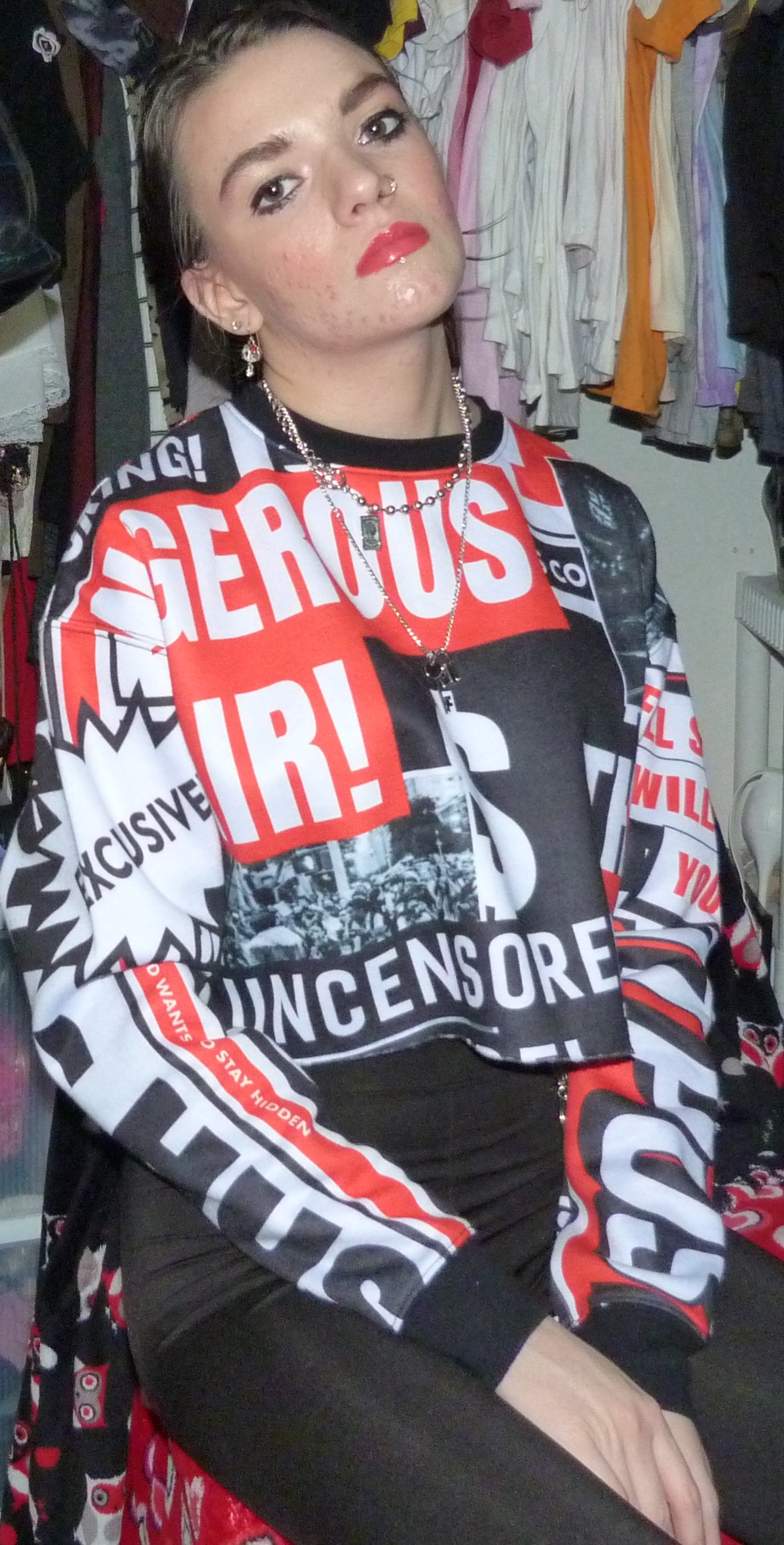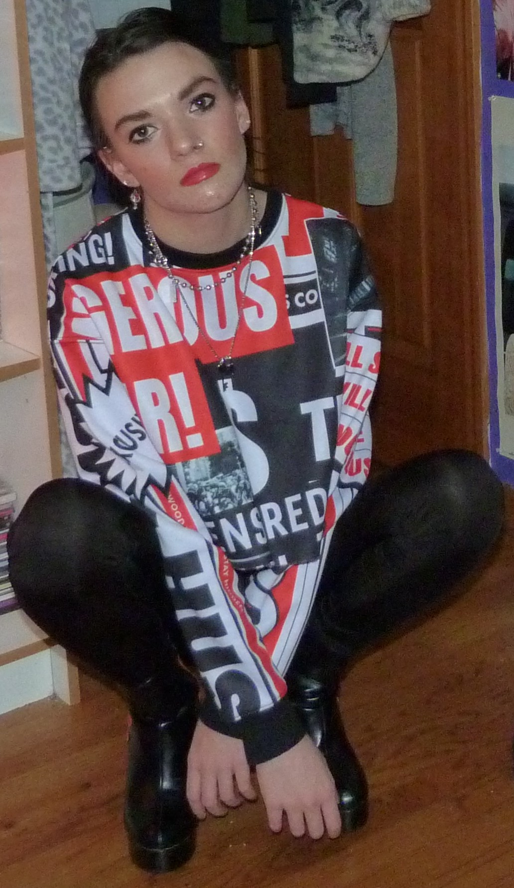 I need to get out more I think. I’ll tell you all more about that in my next blog post I have to do which is another shoot I did with my ex-boyfriend. That’s the I-get-out-all-the-time blog post. Him and I are back to photoshooting together so that’s hot. This shoot I did alone in my room with my latest Dolls Kill order. In fact this shirt might still be available. Just search for Current Mood on the site, if this blog post just dropped. The shirt was called Hit the Headlines. I have so much left to shoot from there. It’ll be Dolls Kill for days coming up, even old orders that I’ve had forever that I’m finally getting around to.