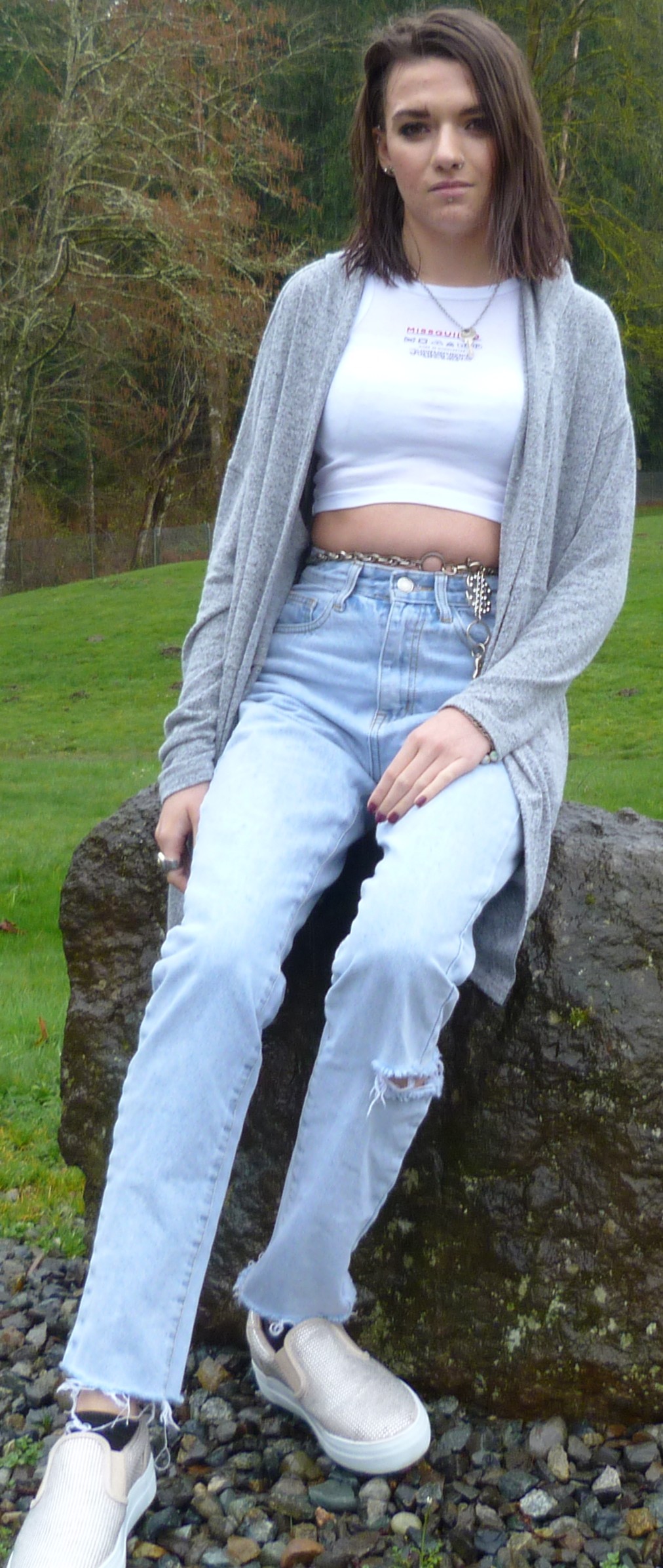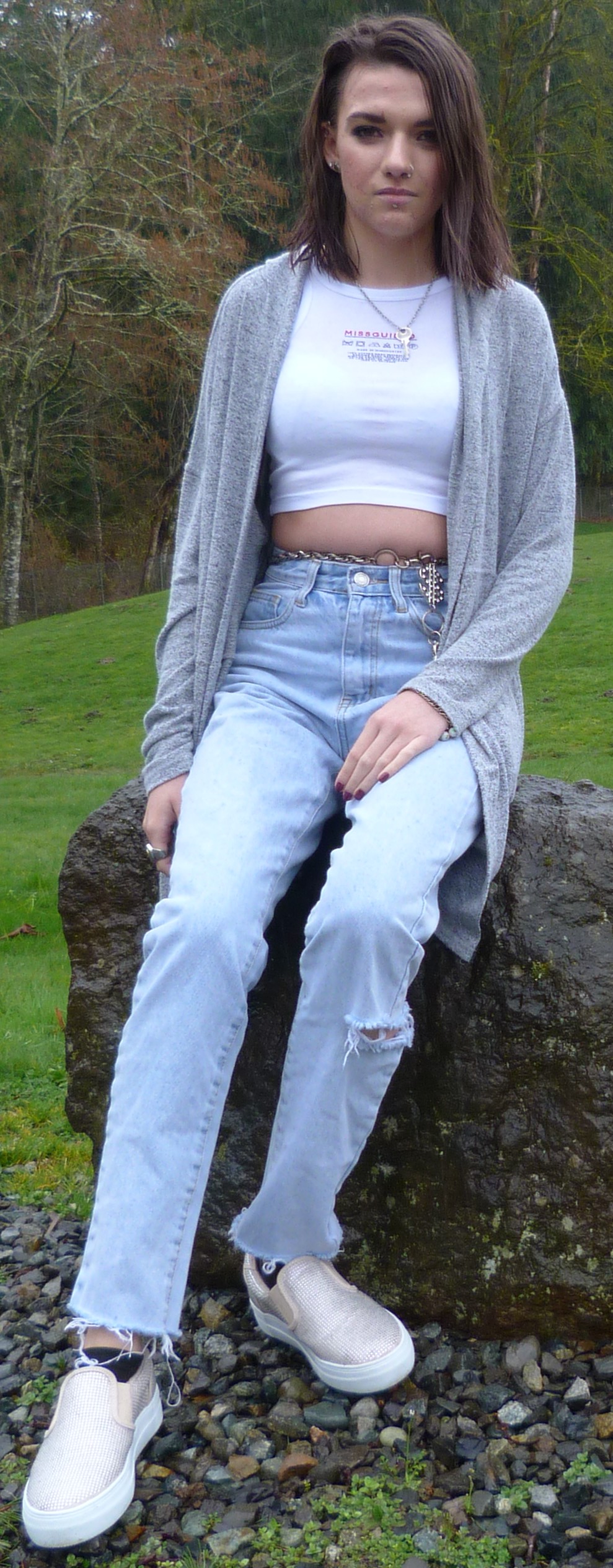 My hair was interesting for this shoot, kind of funny even. Either way, still rocking the short hair, and I’ll eventually go back to dying it (maybe in the summertime). That’ll be good to go back to. Speaking of which, I picked back up a cigarette habit, and it’s almost annoying. I went off nicotine pretty hard this year, but there was always something that made me get back to it here and there. For now I’ll go easy on myself, and not beat myself up. It’s been a hard month, April. A little difficult to understand, but I’ve got a good grip on myself. I know where I’m at with things and I know how to address each little feeling that I have. So that’s good, Care Label really makes sense to me, like as if I have to special wash myself sometimes. Even these sparkly shoes speak to me, I got them for Christmas from my mom. They’re from JustFab I think. That cardigan I got from Goodwill actually, and it’s a good one. Anyway I took the cardigan off for the rest of the pictures, dang it was cold outside with that rain. Let’s see how the rest of it turned out.