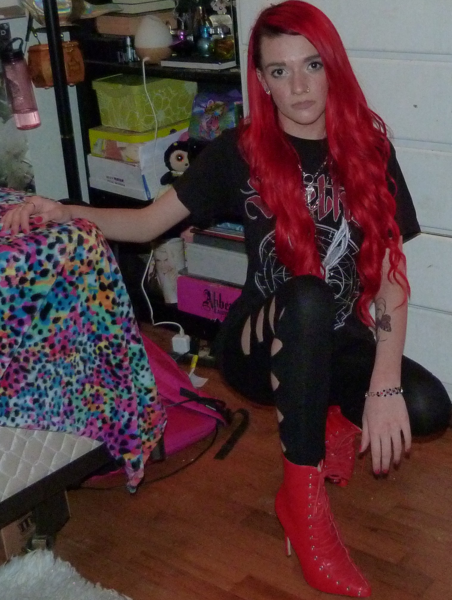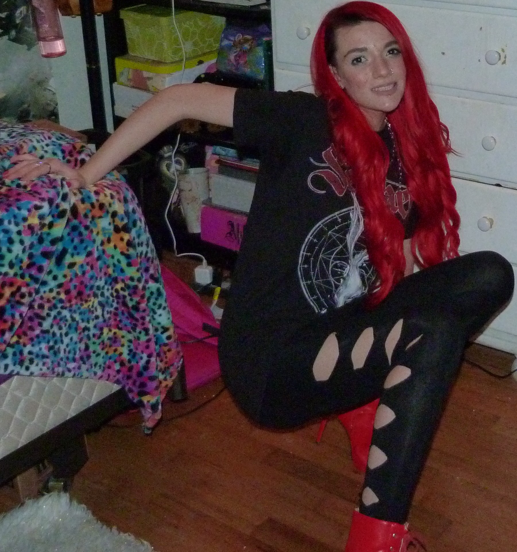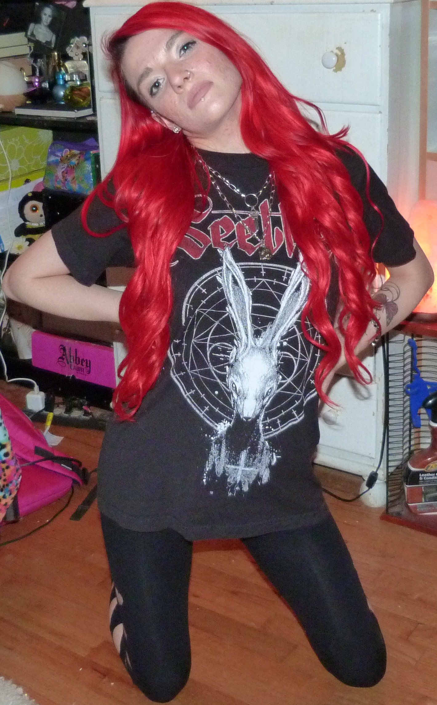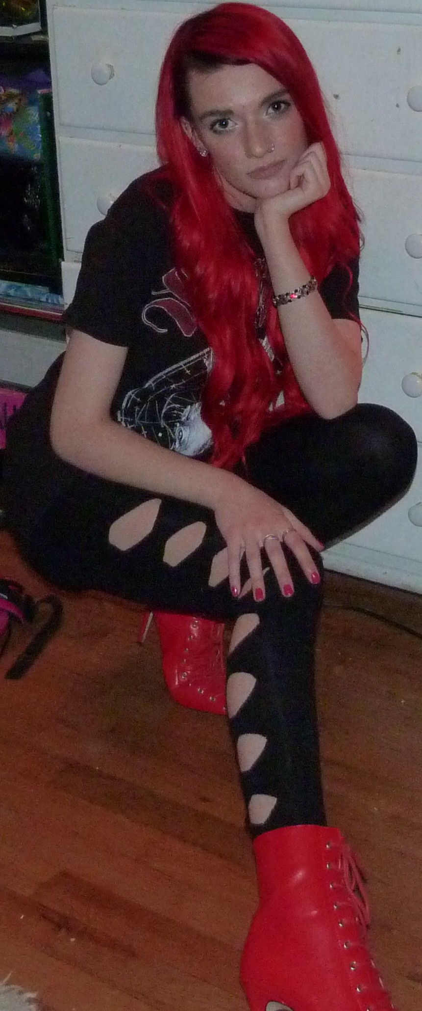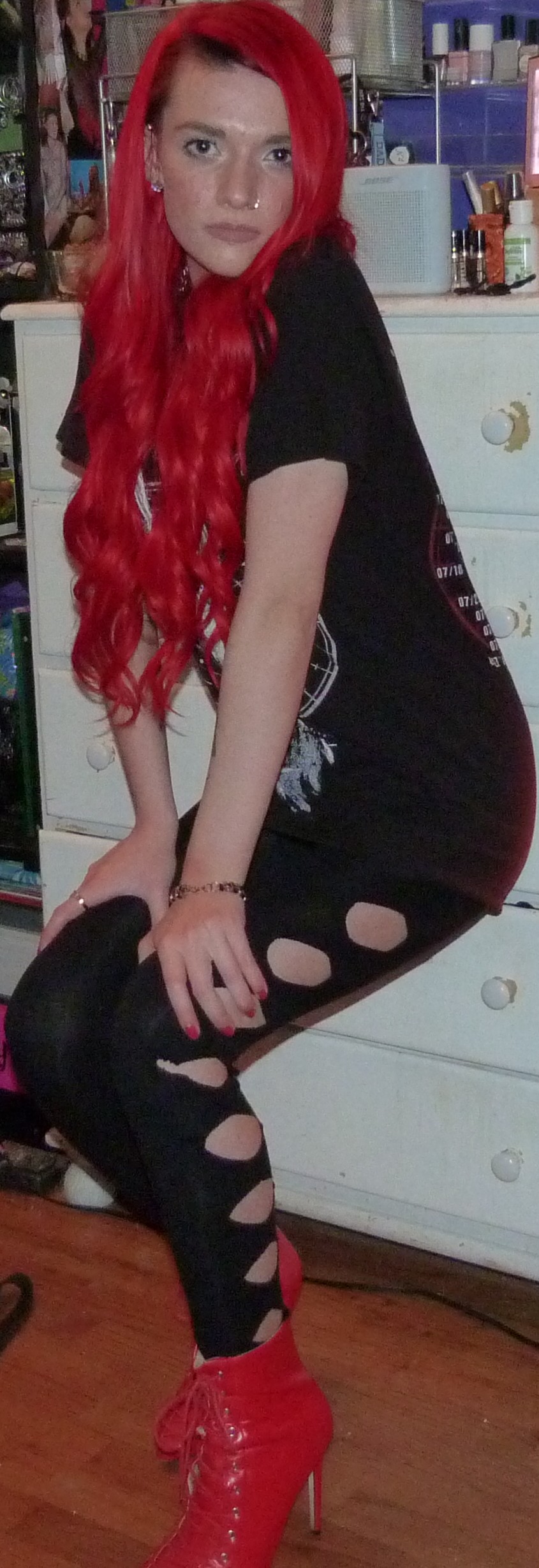 Now to finally get down to the better pictures of the boots, on the ground of my room, I can tell you where I got the shoes from! These ones are from Nasty Gal, and they were called Can’t Hold Us Down after the Xtina song from 2002. I really loved black booties growing up and then in 2018 I found these bright red ones that went with how many pairs of black ones I have so I just had to have these. You can also check out these boots in my other blog post named after the shoes, Can’t Hold Us Down! That was a pretty good one, featuring me with some of my friends from back then. I love how the color of these booties pops with my hair! Moving on, I love these diamond-shaped cutout leggings I got from Boohoo in my mid-teen years, like age 15 or so. I had another pair or two that were similar but I don’t know what I did with them! I love the style of the cutout (or my old chain ones I need to fix) in terms of these leggings from back in the day, and I will still always wear them. I would’ve worn my lace-up or chain ones with this shirt this time but instead wore the same ones I wore in this blog post, but I’ll fix the other ones soon too! For the last thing I’m going to list, it’s finally the concert tee, which I’ll get up here on my other blog to catalog it for my collection. It features the same bunny from their Poison the Parish album cover with the tour dates on the back of it, but I didn’t get any pictures of the back of the shirt for some reason! Took me a while for this shoot anyway, but I had just gotten home from my hair appointment so I wasn’t that prepared for getting everything together better! Still turned out pretty great in the pictures, right?