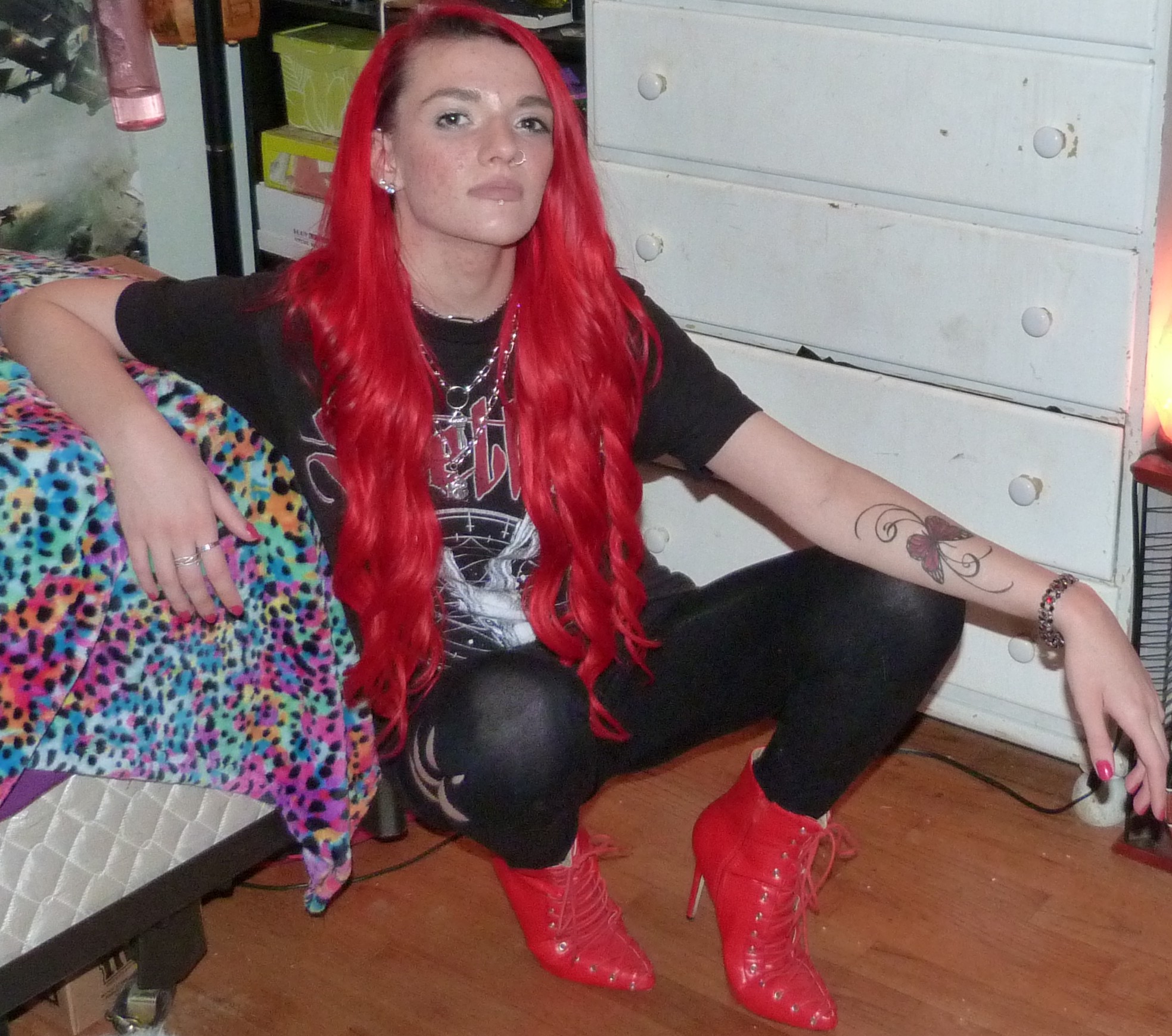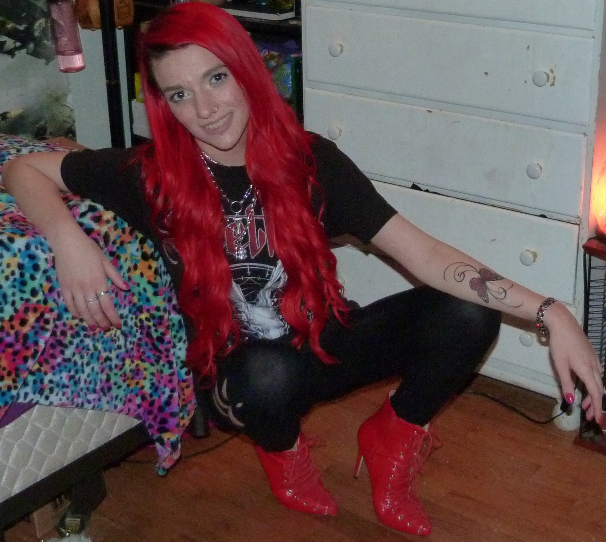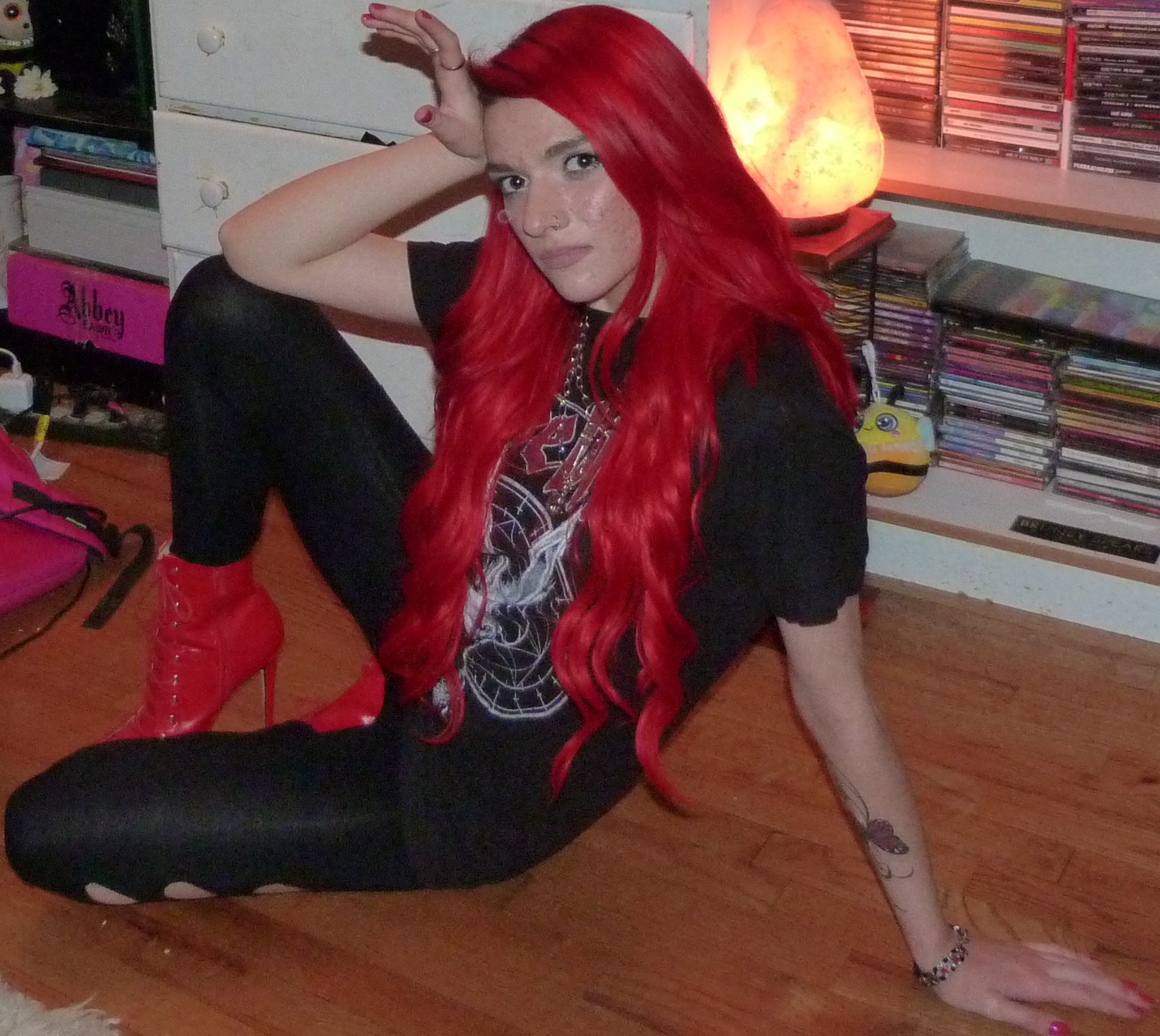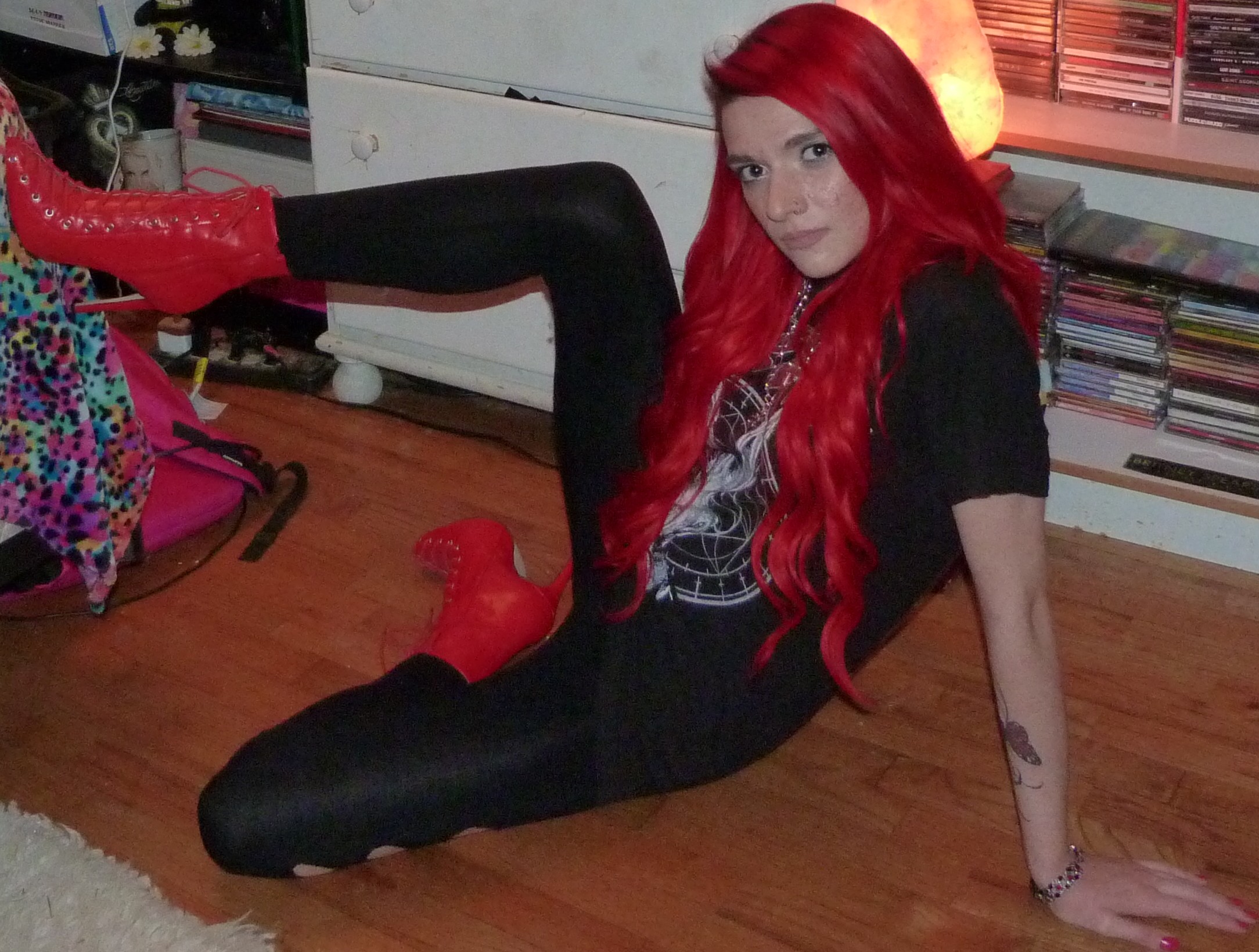 Now to finally get down to the better pictures of the boots, on the ground of my room, I can tell you where I got the shoes from! These ones are from Nasty Gal, and they were called Can’t Hold Us Down after the Xtina song from 2002. I really loved black booties growing up and then in 2018 I found these bright red ones that went with how many pairs of black ones I have so I just had to have these. You can also check out these boots in my other blog post named after the shoes, Can’t Hold Us Down! That was a pretty good one, featuring me with some of my friends from back then. I love how the color of these booties pops with my hair! Moving on, I love these diamond-shaped cutout leggings I got from Boohoo in my mid-teen years, like age 15 or so. I had another pair or two that were similar but I don’t know what I did with them! I love the style of the cutout (or my old chain ones I need to fix) in terms of these leggings from back in the day, and I will still always wear them. I would’ve worn my lace-up or chain ones with this shirt this time but instead wore the same ones I wore in this blog post, but I’ll fix the other ones soon too! For the last thing I’m going to list, it’s finally the concert tee, which I’ll get up here on my other blog to catalog it for my collection. It features the same bunny from their Poison the Parish album cover with the tour dates on the back of it, but I didn’t get any pictures of the back of the shirt for some reason! Took me a while for this shoot anyway, but I had just gotten home from my hair appointment so I wasn’t that prepared for getting everything together better! Still turned out pretty great in the pictures, right?