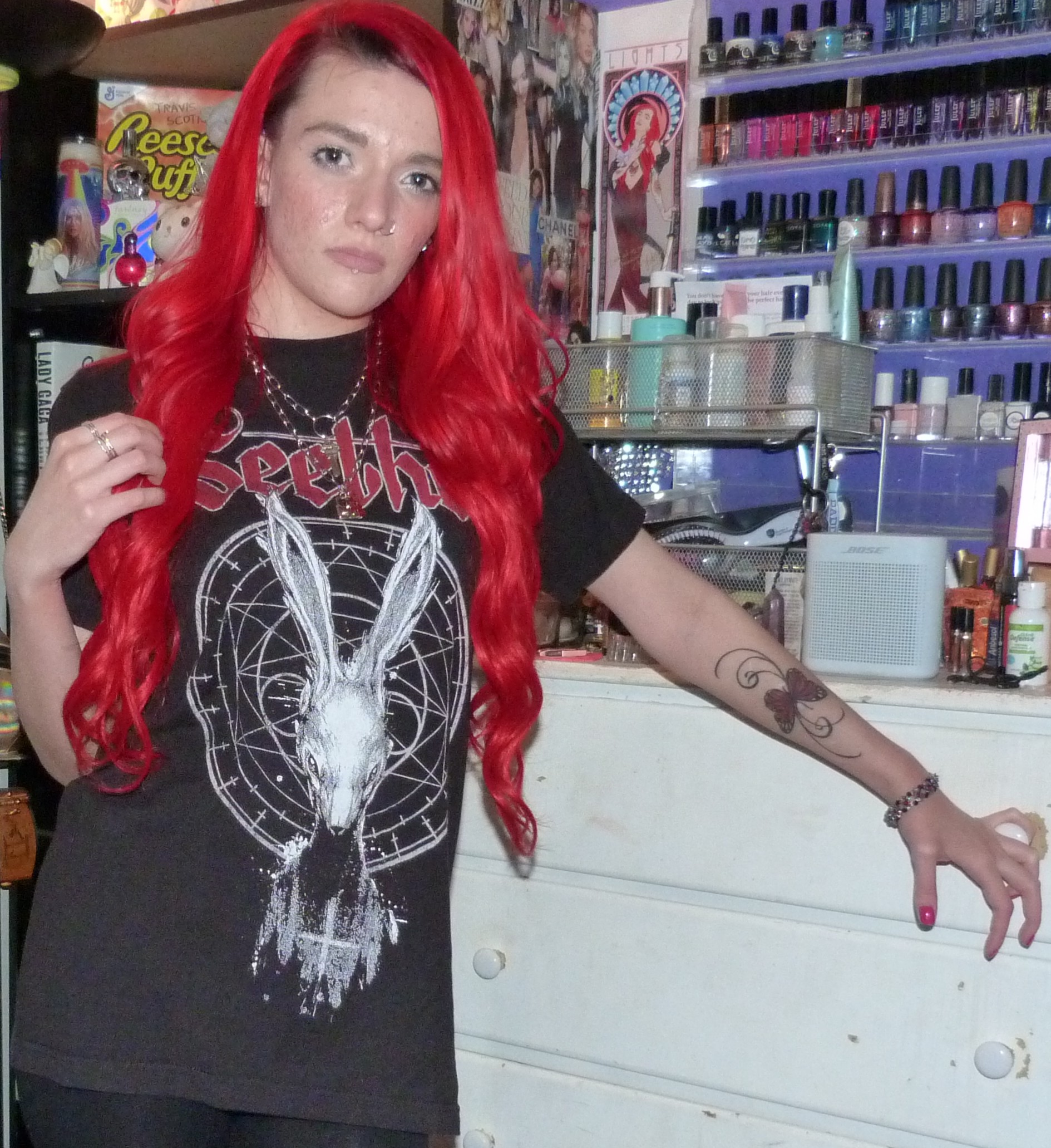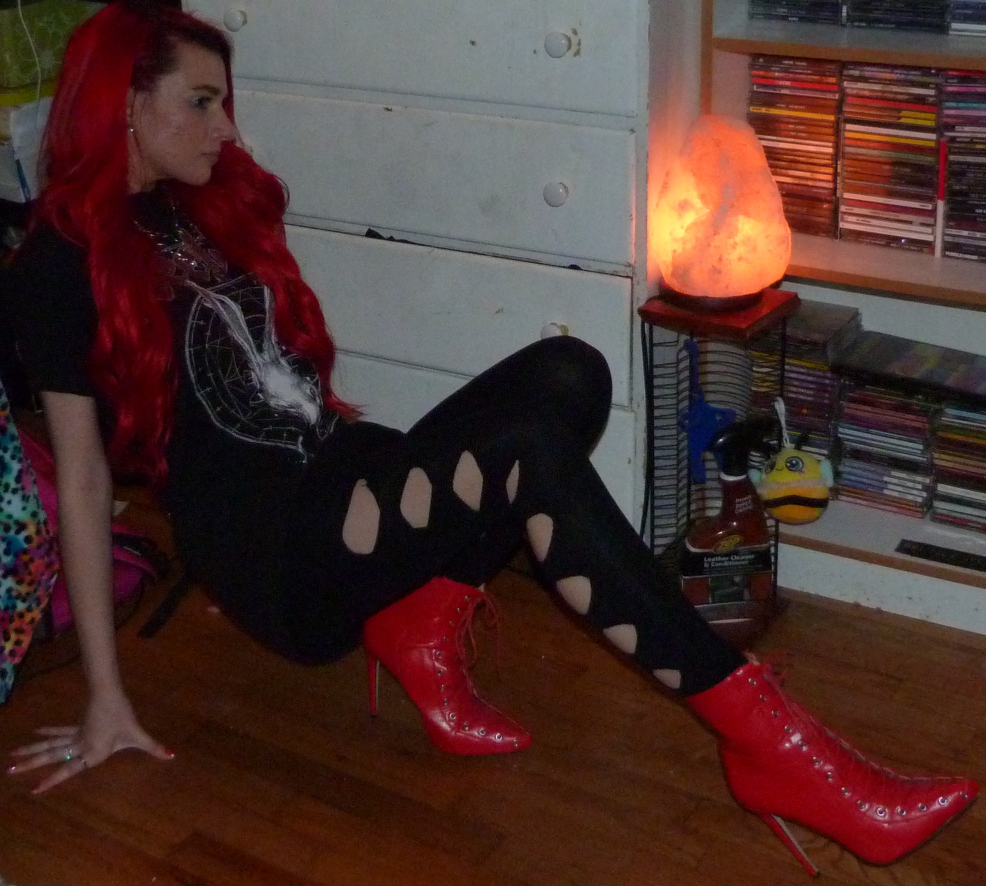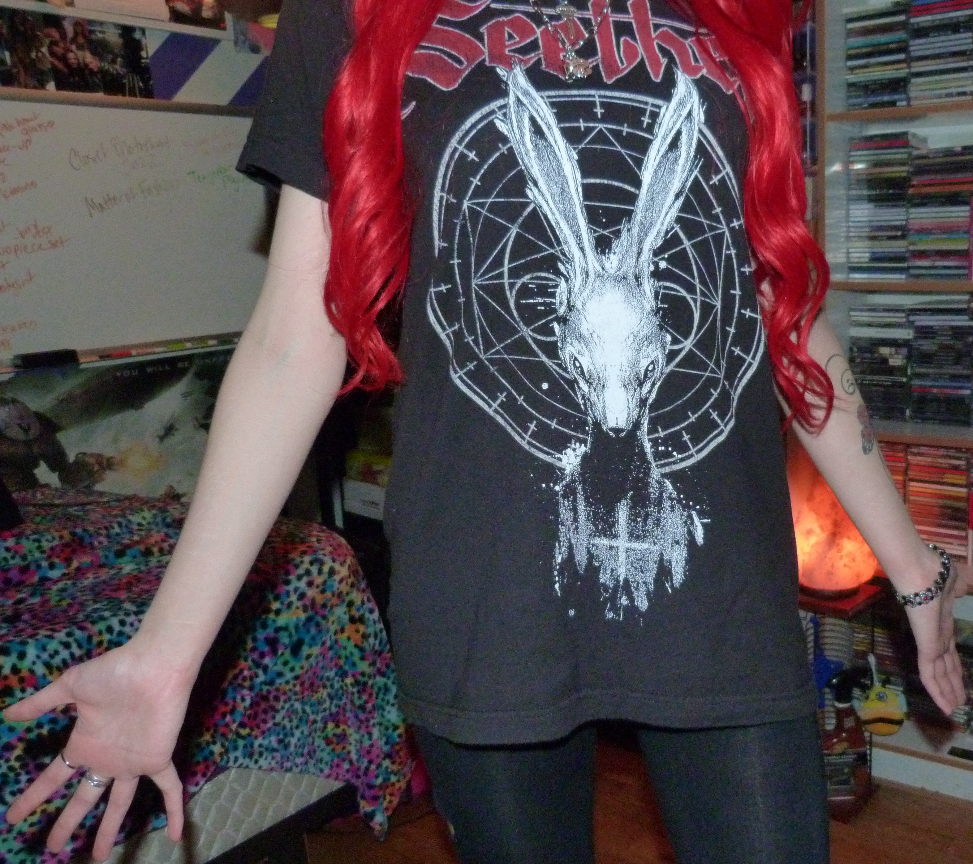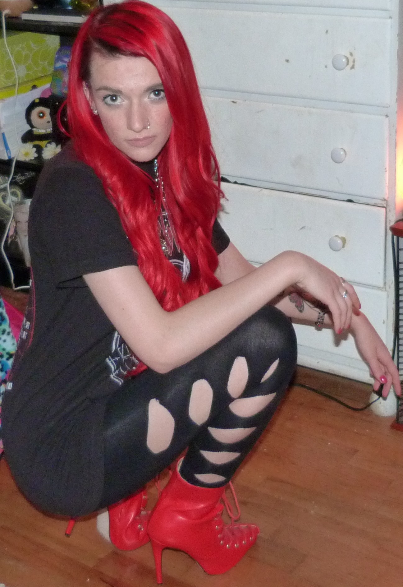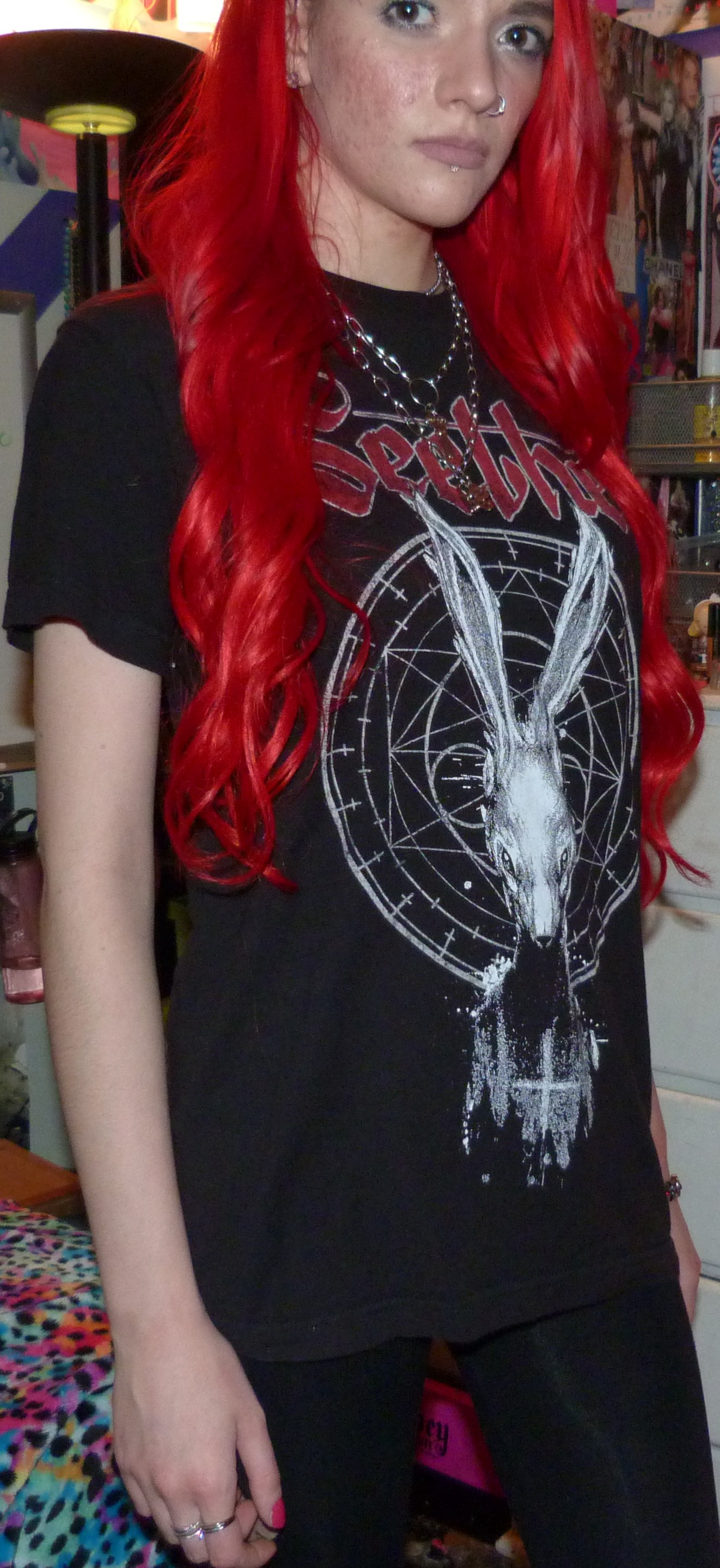 Now to finally get down to the better pictures of the boots, on the ground of my room, I can tell you where I got the shoes from! These ones are from Nasty Gal, and they were called Can’t Hold Us Down after the Xtina song from 2002. I really loved black booties growing up and then in 2018 I found these bright red ones that went with how many pairs of black ones I have so I just had to have these. You can also check out these boots in my other blog post named after the shoes, Can’t Hold Us Down! That was a pretty good one, featuring me with some of my friends from back then. I love how the color of these booties pops with my hair! Moving on, I love these diamond-shaped cutout leggings I got from Boohoo in my mid-teen years, like age 15 or so. I had another pair or two that were similar but I don’t know what I did with them! I love the style of the cutout (or my old chain ones I need to fix) in terms of these leggings from back in the day, and I will still always wear them. I would’ve worn my lace-up or chain ones with this shirt this time but instead wore the same ones I wore in this blog post, but I’ll fix the other ones soon too! For the last thing I’m going to list, it’s finally the concert tee, which I’ll get up here on my other blog to catalog it for my collection. It features the same bunny from their Poison the Parish album cover with the tour dates on the back of it, but I didn’t get any pictures of the back of the shirt for some reason! Took me a while for this shoot anyway, but I had just gotten home from my hair appointment so I wasn’t that prepared for getting everything together better! Still turned out pretty great in the pictures, right?