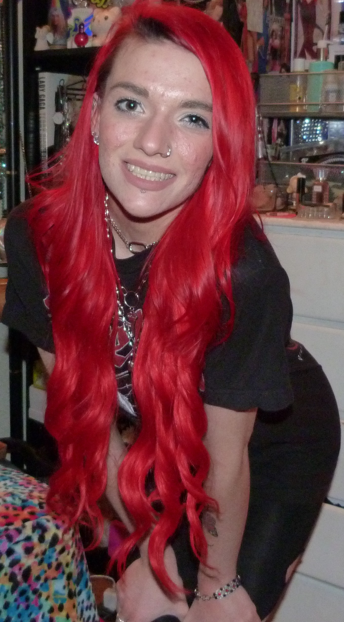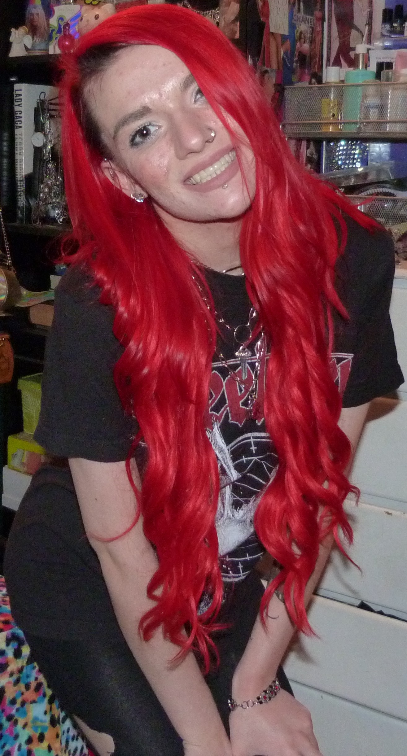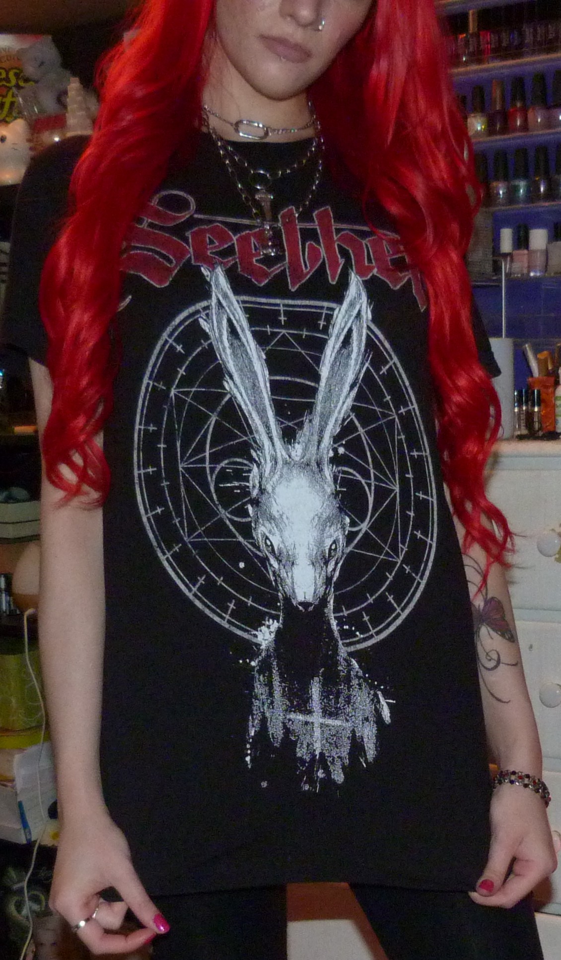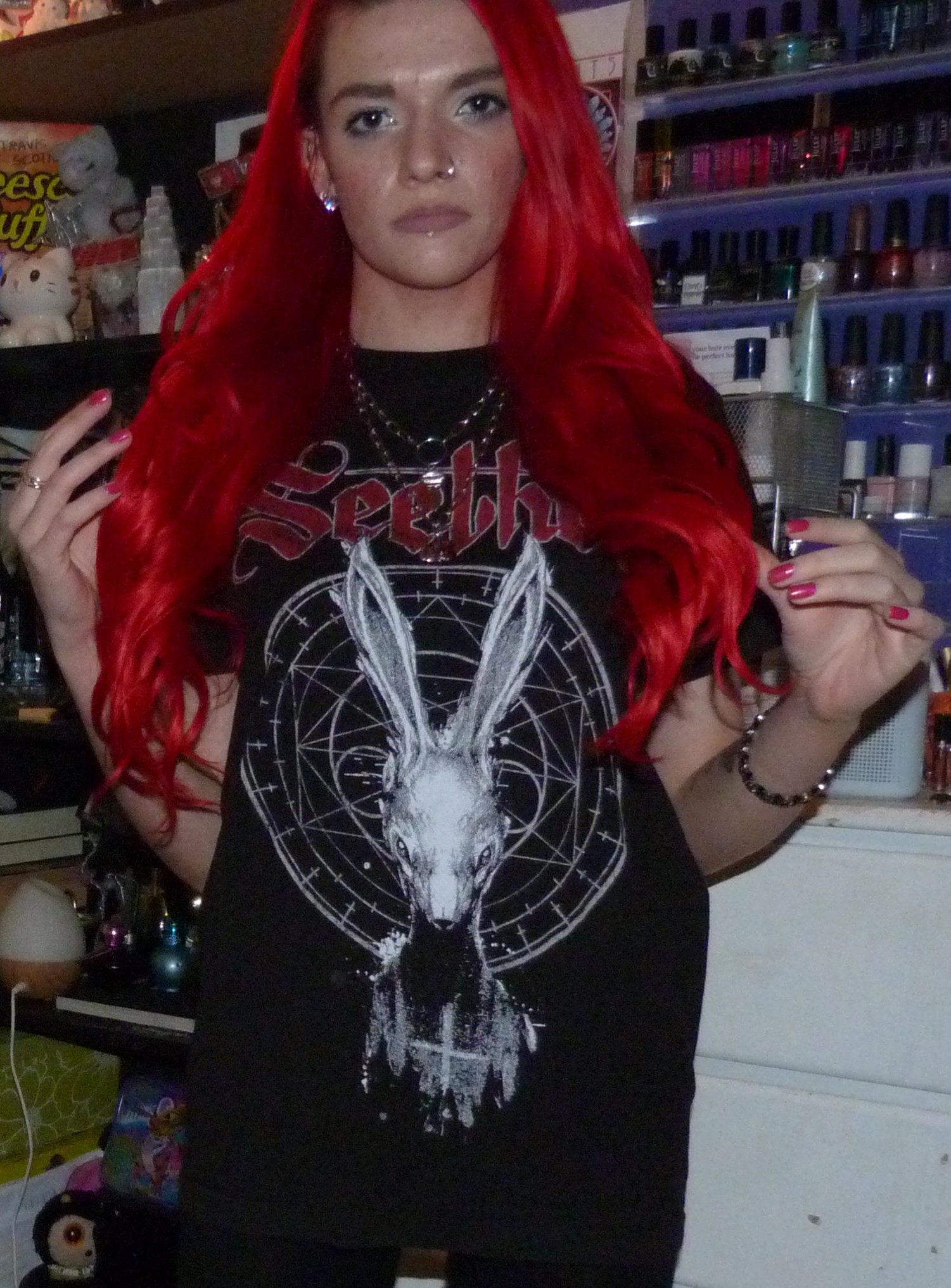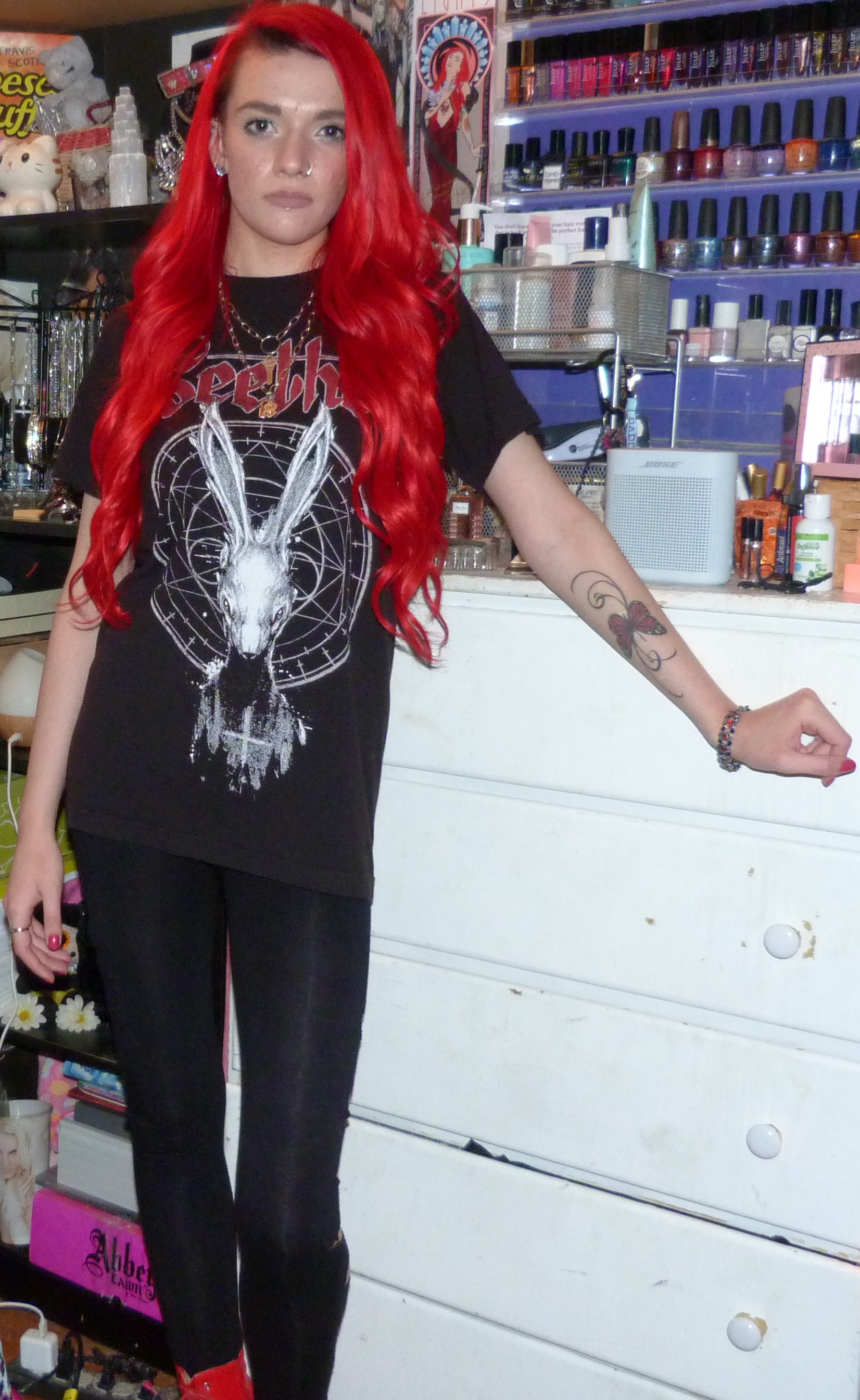 Now to finally get down to the better pictures of the boots, on the ground of my room, I can tell you where I got the shoes from! These ones are from Nasty Gal, and they were called Can’t Hold Us Down after the Xtina song from 2002. I really loved black booties growing up and then in 2018 I found these bright red ones that went with how many pairs of black ones I have so I just had to have these. You can also check out these boots in my other blog post named after the shoes, Can’t Hold Us Down! That was a pretty good one, featuring me with some of my friends from back then. I love how the color of these booties pops with my hair! Moving on, I love these diamond-shaped cutout leggings I got from Boohoo in my mid-teen years, like age 15 or so. I had another pair or two that were similar but I don’t know what I did with them! I love the style of the cutout (or my old chain ones I need to fix) in terms of these leggings from back in the day, and I will still always wear them. I would’ve worn my lace-up or chain ones with this shirt this time but instead wore the same ones I wore in this blog post, but I’ll fix the other ones soon too! For the last thing I’m going to list, it’s finally the concert tee, which I’ll get up here on my other blog to catalog it for my collection. It features the same bunny from their Poison the Parish album cover with the tour dates on the back of it, but I didn’t get any pictures of the back of the shirt for some reason! Took me a while for this shoot anyway, but I had just gotten home from my hair appointment so I wasn’t that prepared for getting everything together better! Still turned out pretty great in the pictures, right?