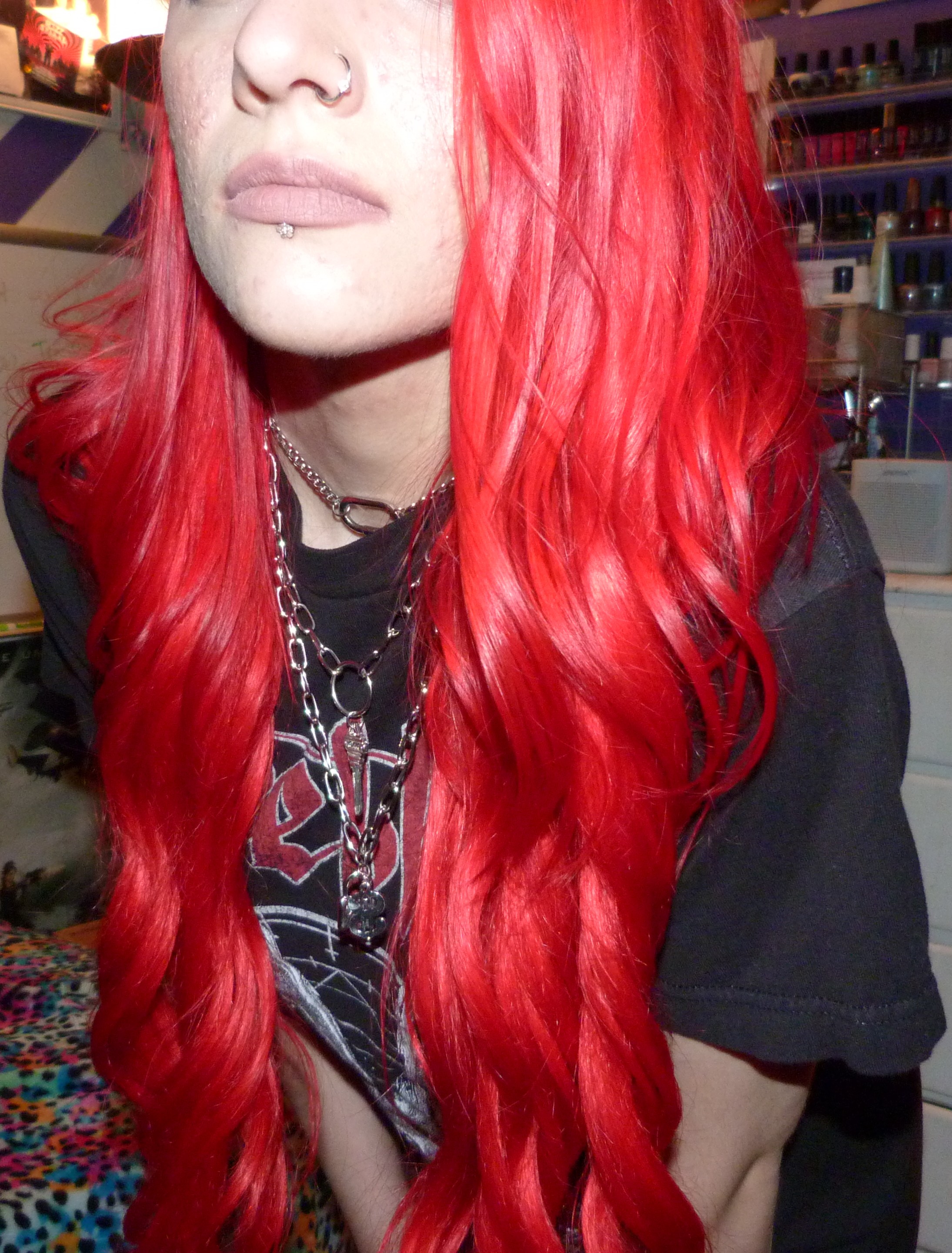 This layered necklace that I’m wearing is now one of my very favorite necklaces! It’s a silver key one from Dolls Kill, also including a lock and dollar sign on the last layer, with a little loop on the choker part. I’m so glad I got this one the last time I ordered from them online, my favorite place ever to buy clothes! With that I also wore this bracelet my mom gave me, which is red and a darker silver metal on it. You can see that better in the second to last picture with my tattoo. I’m also wearing a couple rings including one of them that I got from Pandora, my snake ring. Finally I had a couple pairs of silver stud earrings in, but my hair kind of covered them up for most of the pictures, so there’s just glimpses of them. The rest of my jewelry has better close-ups and everything coming up later in the photoshoot, so that’ll be cool to see them better. I thought that was simple accessorizing to go well with the merch tee, and that white ink on the shirt really stands out well with the silver. The last thing I’ll mention here is going to be my Julep nail color in the bright pink shade Adeline, which I thought was controversial in terms of standing out upon the bright reds and typical black mix as an outfit. I love how the three shades of red mix in this outfit too!