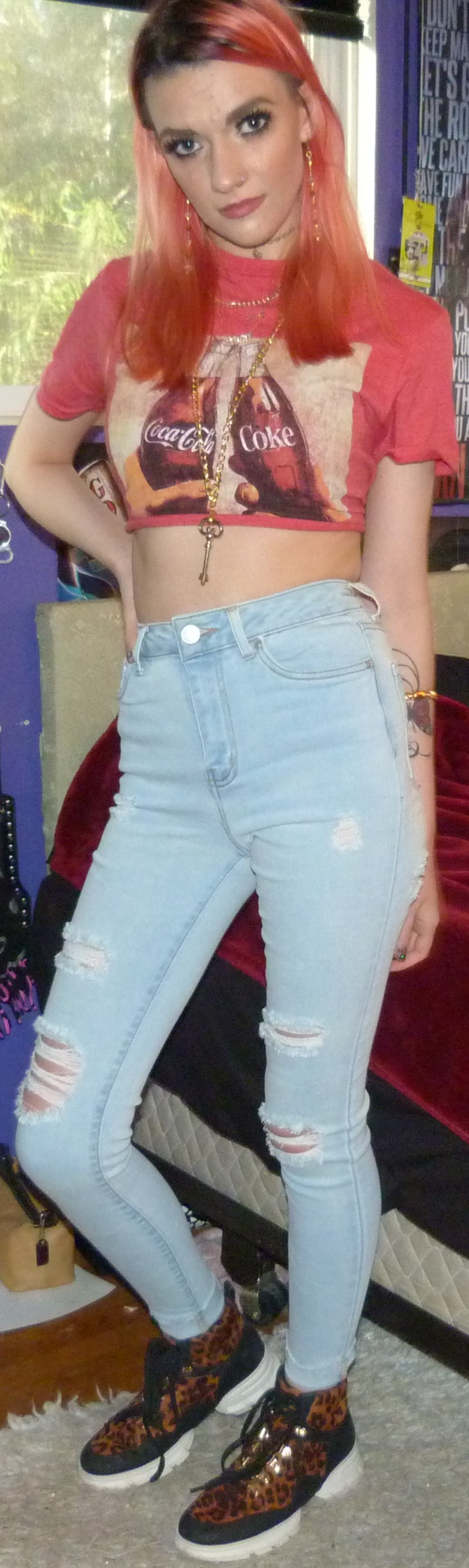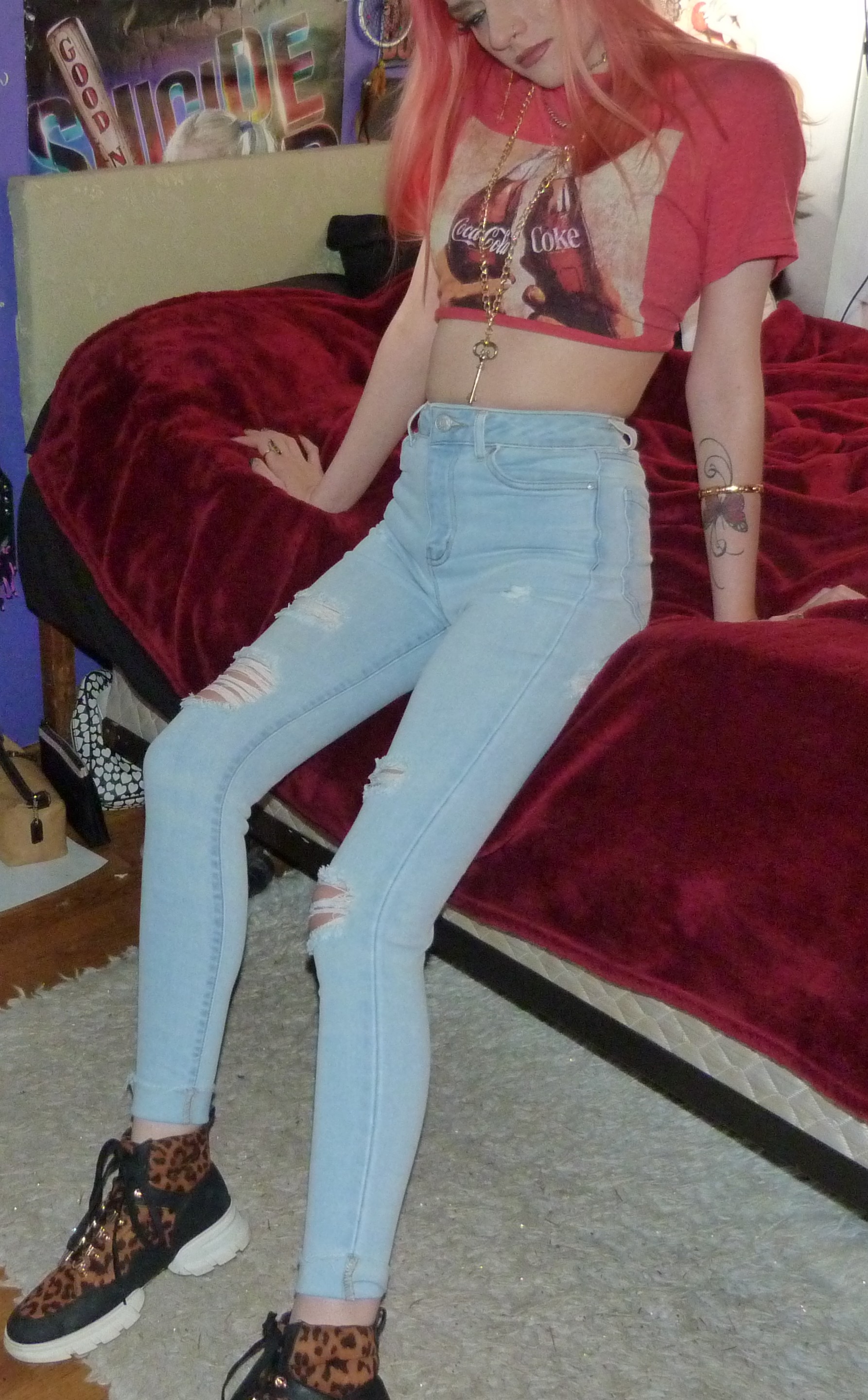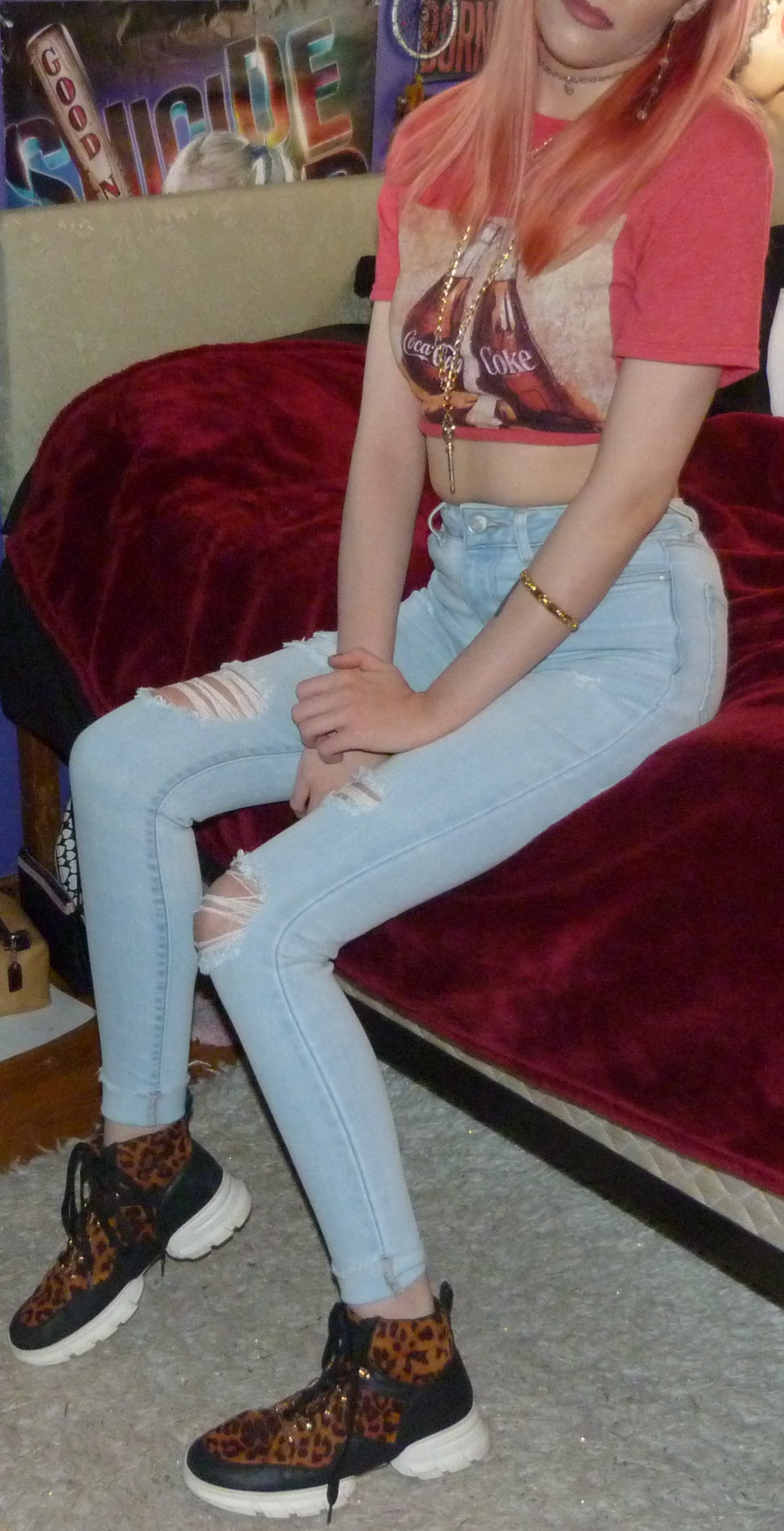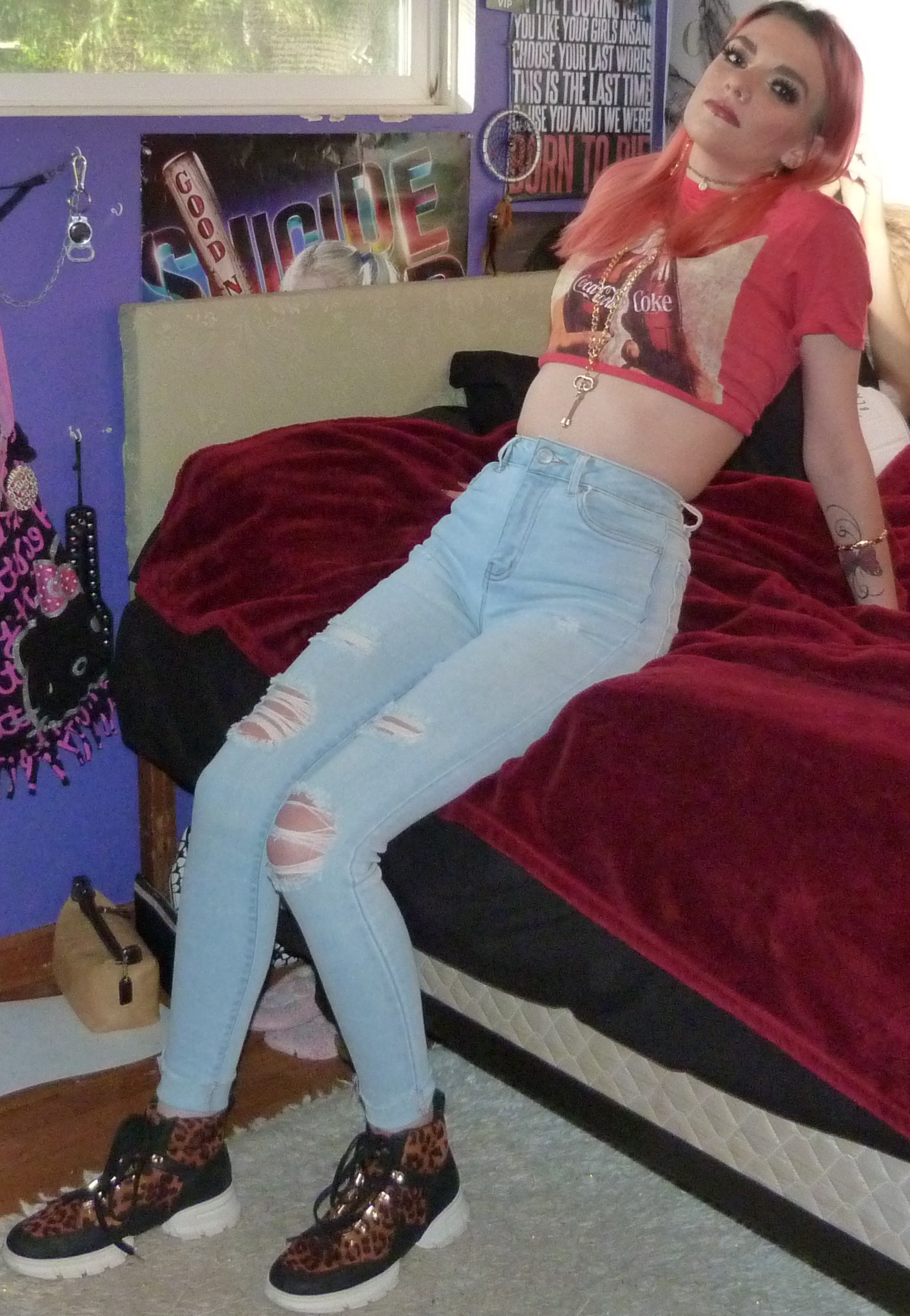 I’ve been pretty glad about how things have been going with me around here, everything is a little better than I was expecting it to be by now. Like sometime last year I kept wondering about how I pass my time and hoping I could speed things up or have more to do with my time, and by now I finally actually do. I’m getting better at folding things around my time to get things done and stay active around my house and room and just getting out the usual amount too which goes pretty well every week. I finally was able to make time to set-up this photoshoot, with a Coca-Cola graphic tee I turned into a crop top that I got for my birthday (from a friend) in November 2020. I got three shirts from him, one which was already like a crop top (Angel Like Me) and the other which I cut like this one (MTV Pt. 1) and they all turned out really great, in terms of how I cut the shirts and did the photoshoots. I love how all of that went, I was able to do the shoots pretty quickly in 2021 for those two but it took me until now to finally get this one done! It all is looking pretty good though, I think I’m aligning this year really well with my outfit choices. Plus, four of the main things that I wore in this photoshoot are things I haven’t done a shoot with yet, so I was sort of getting a lot done with putting them altogether like that! The fact that they all worked well together like that was a good sign to me, I really wanted to get these things up on my blog eventually. I have this list I go by sometimes of all these items I bought and still haven’t put in a shoot, and it’s up in my room on my whiteboard. I’ve been making progress on it too, especially with how I’m more active on my blog now with photoshooting! At least a couple times a month I’ve been posting since the new year, and I’m pretty good with aligning it all properly. For this one in particular, I like the almost vintage look they’re going for with the Coca-Cola on this soft red t-shirt, and I think the color of these jeans works really well with it. I of course went for gold with this one, which was the first time in a while I’ve done a shoot with gold, and one of my favorites (other than the big gold key from my other friend) is this ‘1998’ necklace I got from MissGuided last year, and I was so excited that it was my year they had in stock! It was almost exactly a year after my order had arrived that I ended up finally getting to shoot and blog about this necklace, but I’m glad I finally am getting it up there today! Lastly, my cheetah sneakers with gold on them are awesome, I got them shipped to me in rehab in like September of 2019 and I loved them there. It took me so long to finally get them into a shoot but I’m so glad about how all of this came together so well this time! It’s even a shoot in a different angle in my room which is rad. Thanks so much for checking out my blog, continue reading to see more of the post!