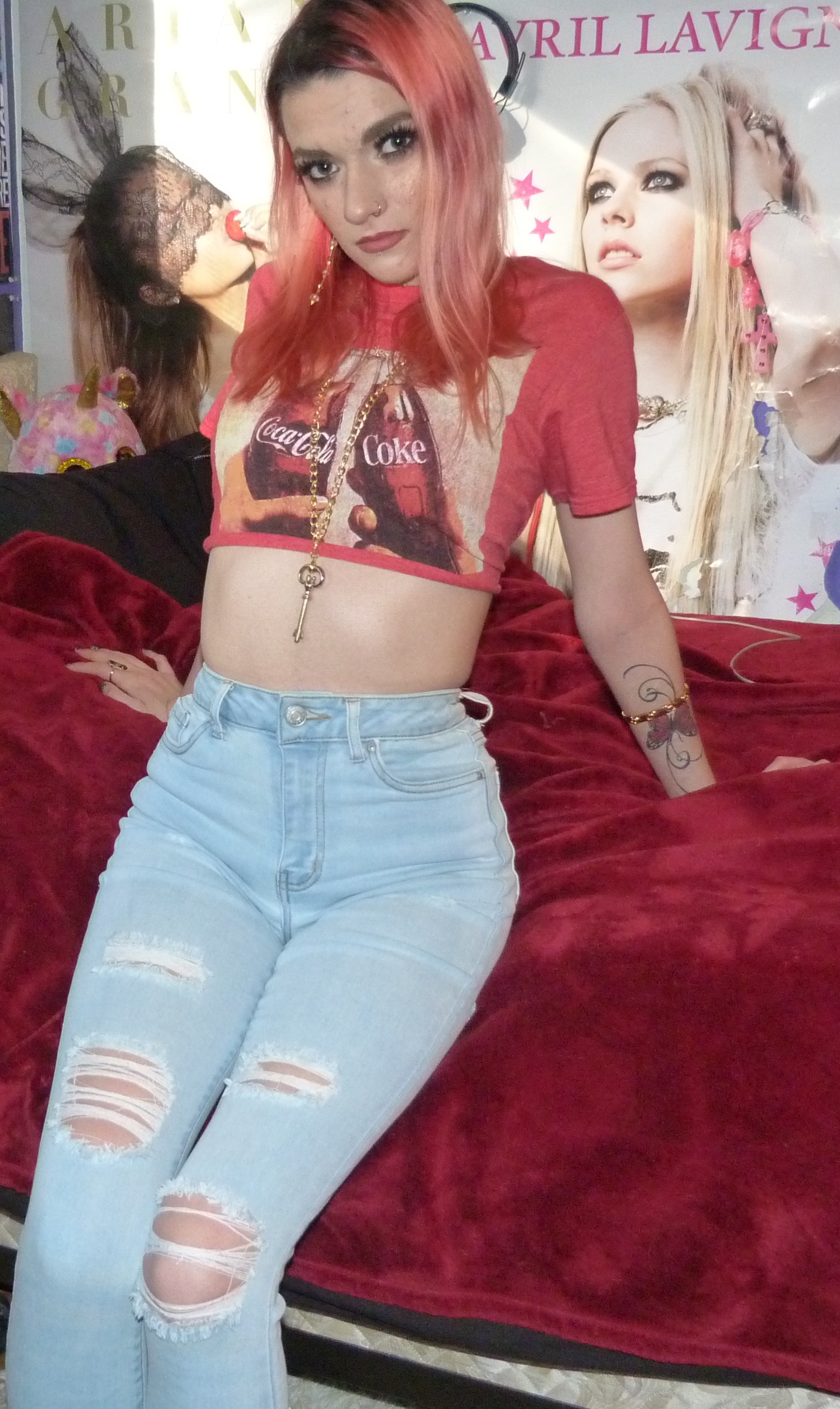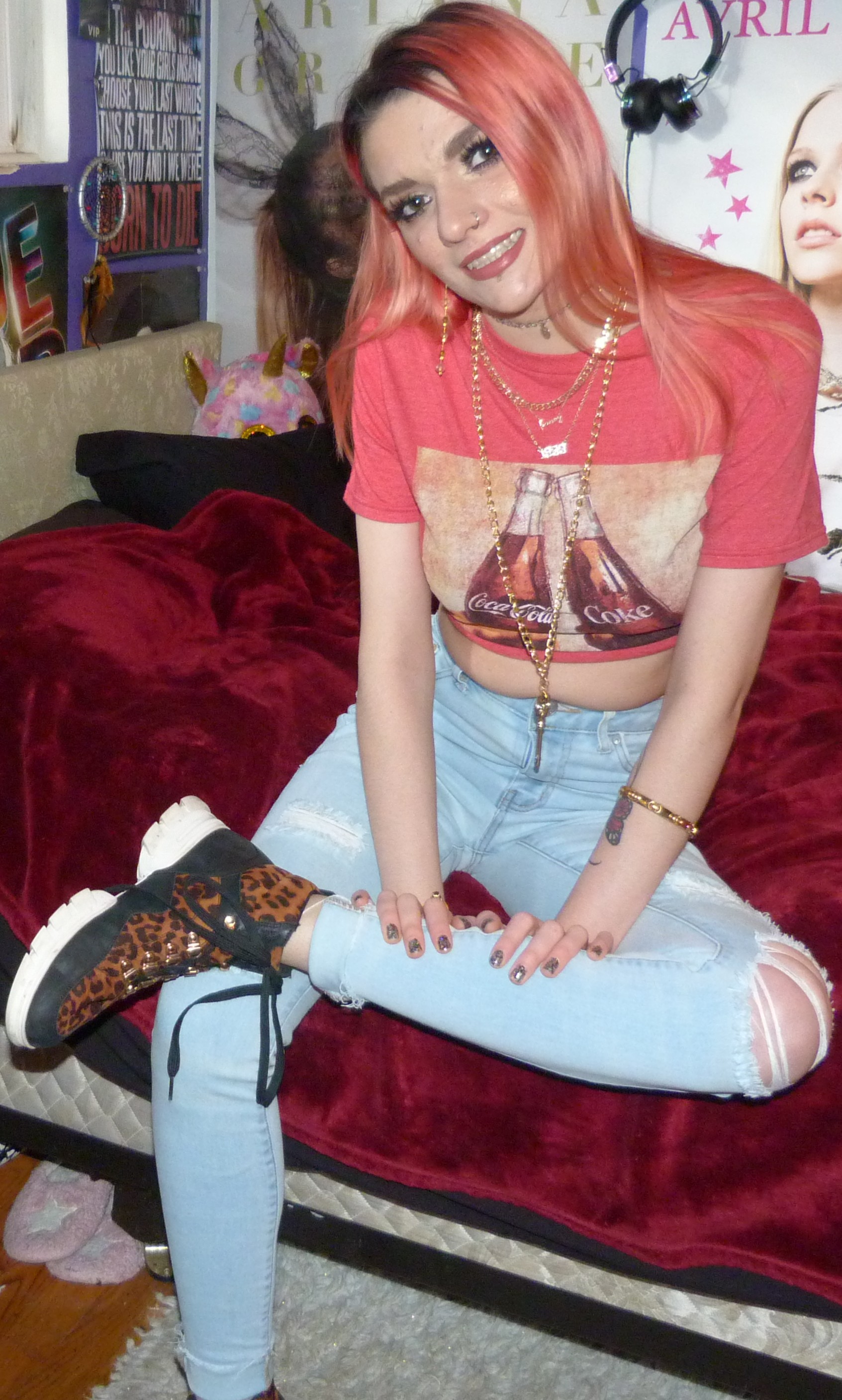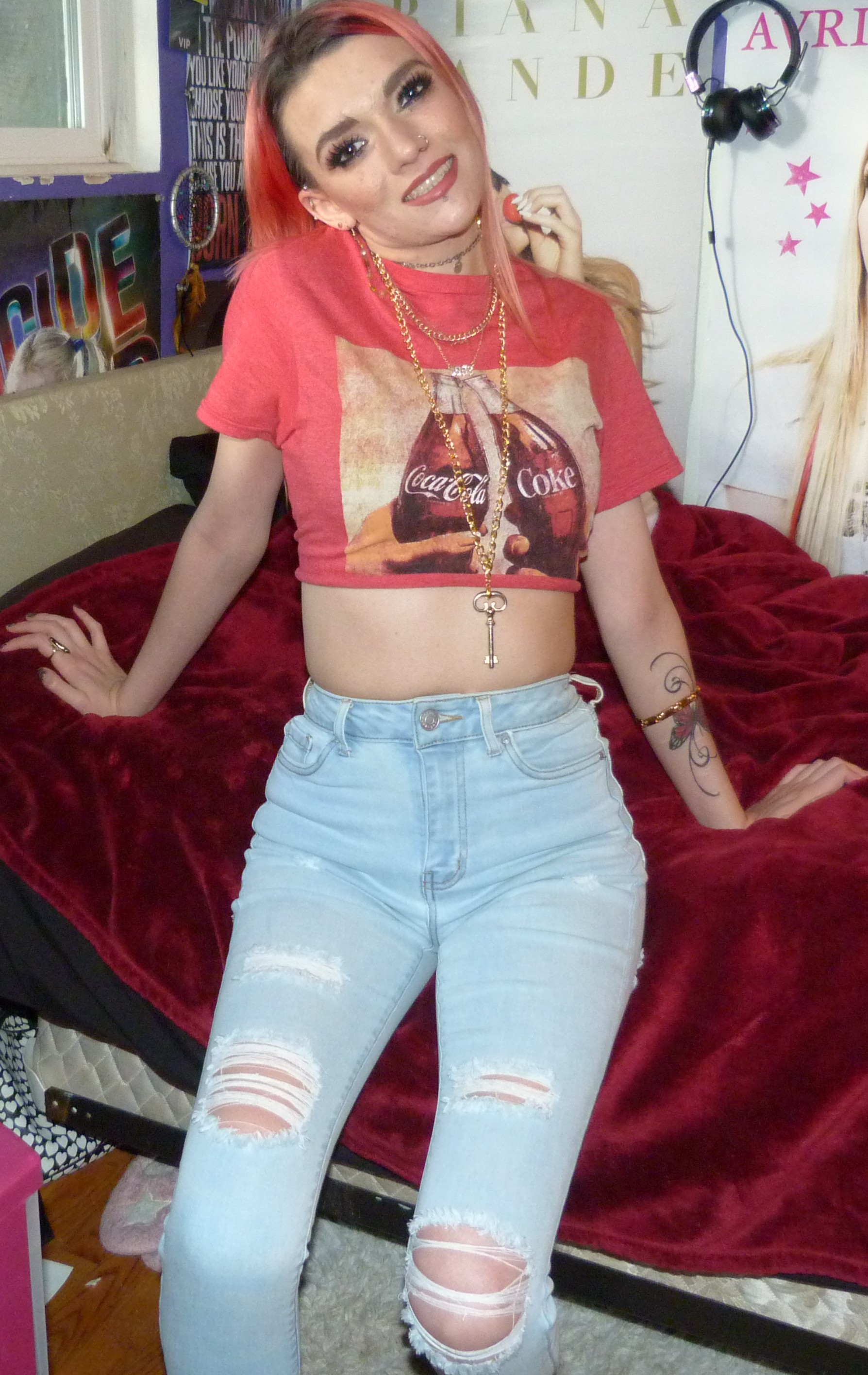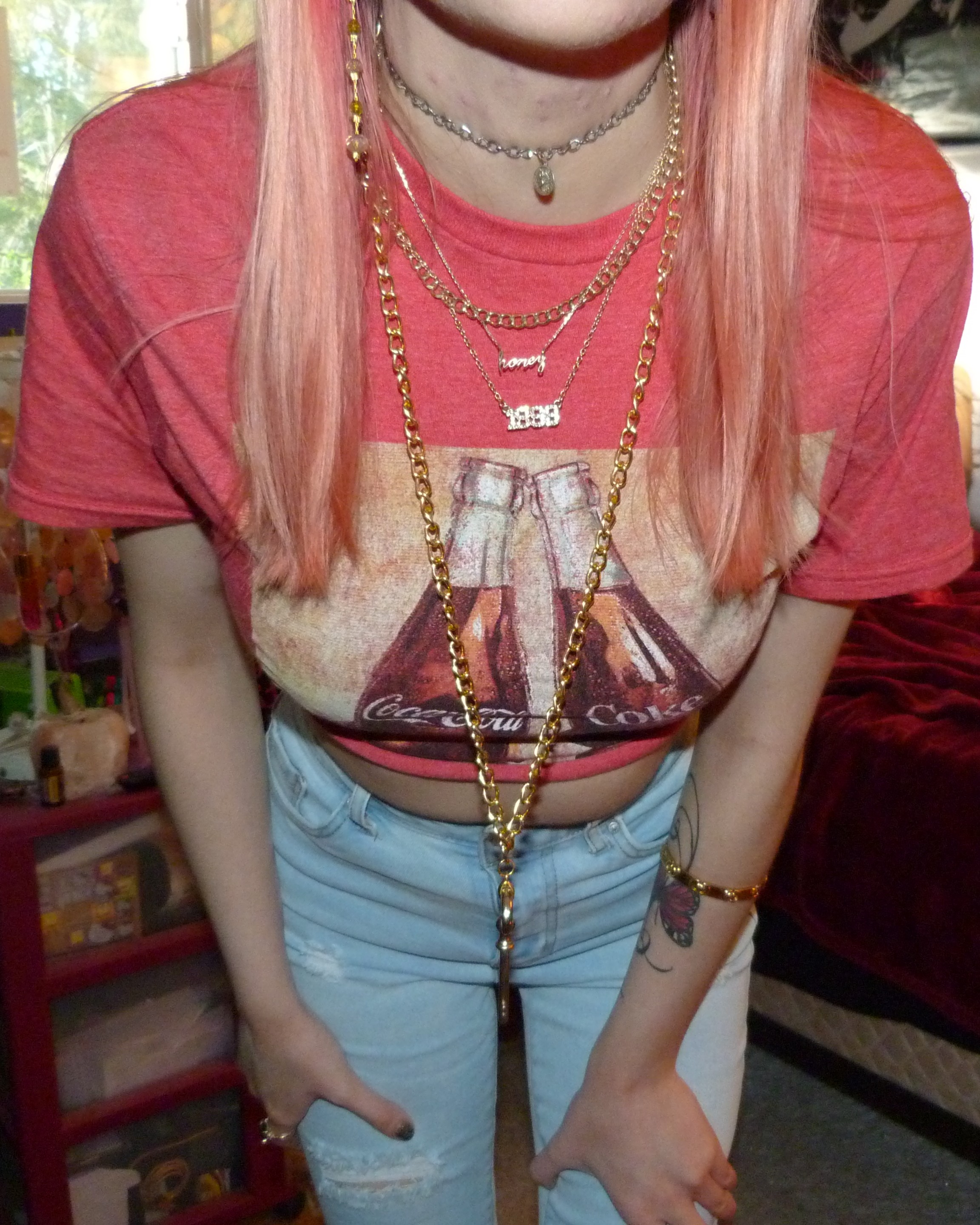 I’ve been pretty glad about how things have been going with me around here, everything is a little better than I was expecting it to be by now. Like sometime last year I kept wondering about how I pass my time and hoping I could speed things up or have more to do with my time, and by now I finally actually do. I’m getting better at folding things around my time to get things done and stay active around my house and room and just getting out the usual amount too which goes pretty well every week. I finally was able to make time to set-up this photoshoot, with a Coca-Cola graphic tee I turned into a crop top that I got for my birthday (from a friend) in November 2020. I got three shirts from him, one which was already like a crop top (Angel Like Me) and the other which I cut like this one (MTV Pt. 1) and they all turned out really great, in terms of how I cut the shirts and did the photoshoots. I love how all of that went, I was able to do the shoots pretty quickly in 2021 for those two but it took me until now to finally get this one done! It all is looking pretty good though, I think I’m aligning this year really well with my outfit choices. Plus, four of the main things that I wore in this photoshoot are things I haven’t done a shoot with yet, so I was sort of getting a lot done with putting them altogether like that! The fact that they all worked well together like that was a good sign to me, I really wanted to get these things up on my blog eventually. I have this list I go by sometimes of all these items I bought and still haven’t put in a shoot, and it’s up in my room on my whiteboard. I’ve been making progress on it too, especially with how I’m more active on my blog now with photoshooting! At least a couple times a month I’ve been posting since the new year, and I’m pretty good with aligning it all properly. For this one in particular, I like the almost vintage look they’re going for with the Coca-Cola on this soft red t-shirt, and I think the color of these jeans works really well with it. I of course went for gold with this one, which was the first time in a while I’ve done a shoot with gold, and one of my favorites (other than the big gold key from my other friend) is this ‘1998’ necklace I got from MissGuided last year, and I was so excited that it was my year they had in stock! It was almost exactly a year after my order had arrived that I ended up finally getting to shoot and blog about this necklace, but I’m glad I finally am getting it up there today! Lastly, my cheetah sneakers with gold on them are awesome, I got them shipped to me in rehab in like September of 2019 and I loved them there. It took me so long to finally get them into a shoot but I’m so glad about how all of this came together so well this time! It’s even a shoot in a different angle in my room which is rad. Thanks so much for checking out my blog, continue reading to see more of the post!