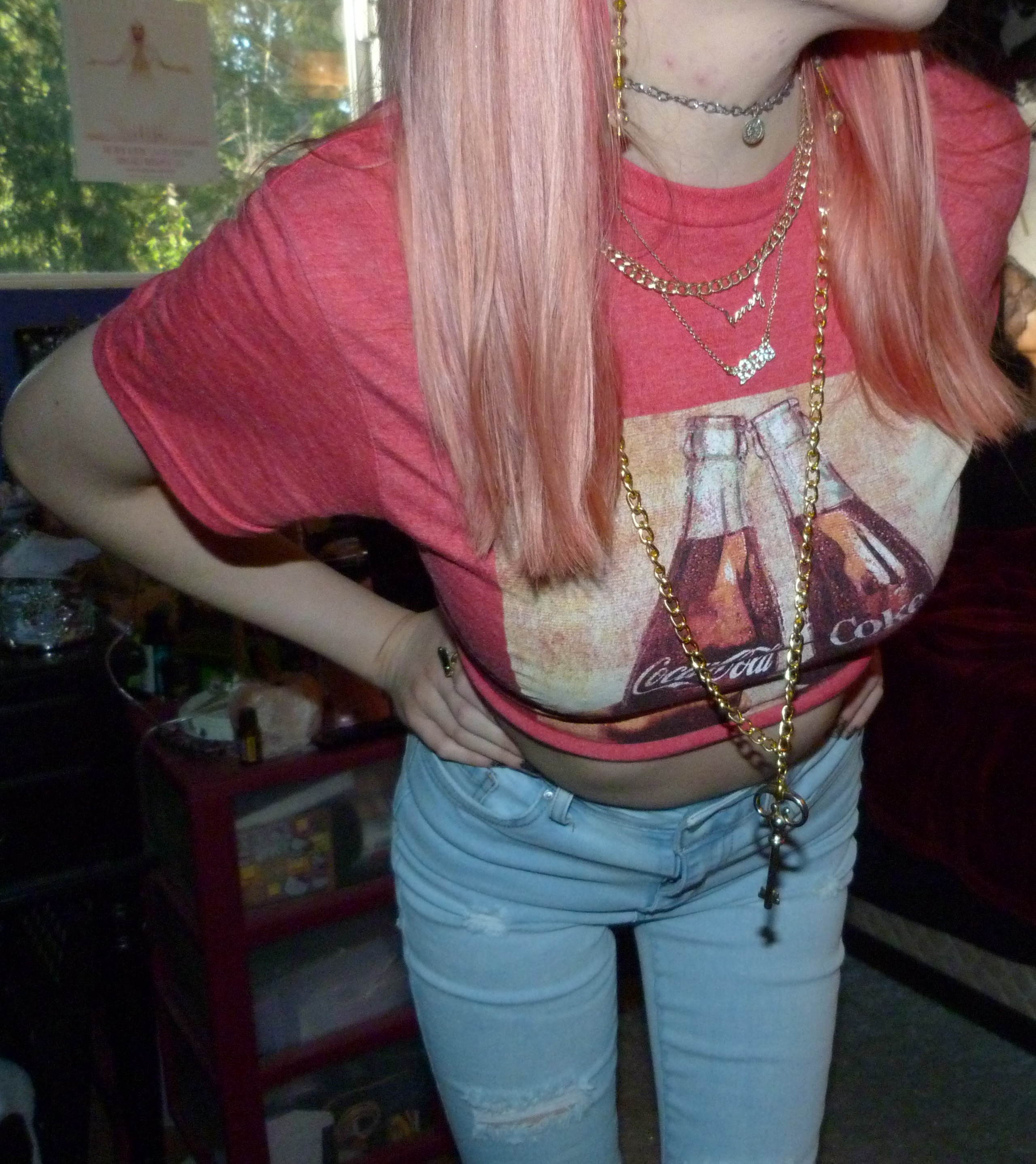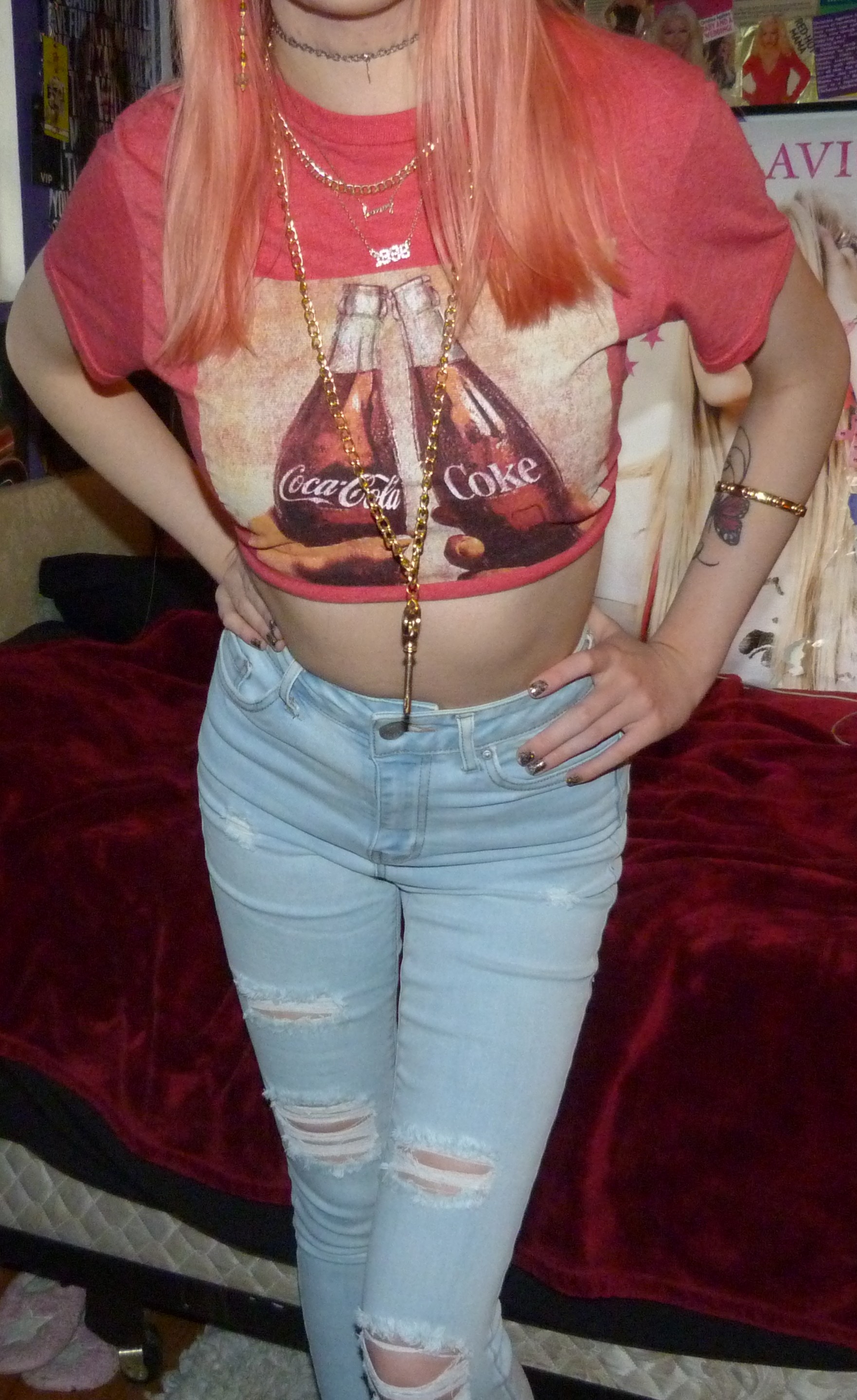 - Coca-Cola t-shirt with two bottles on it, one saying the whole name & the other saying Coke. Red graphic tee I got from my friend Toney in November 2020 for my 22nd birthday from Fred Meyer. I cut it myself with scissors into a crop top and tied it in the back with a hair tie too!