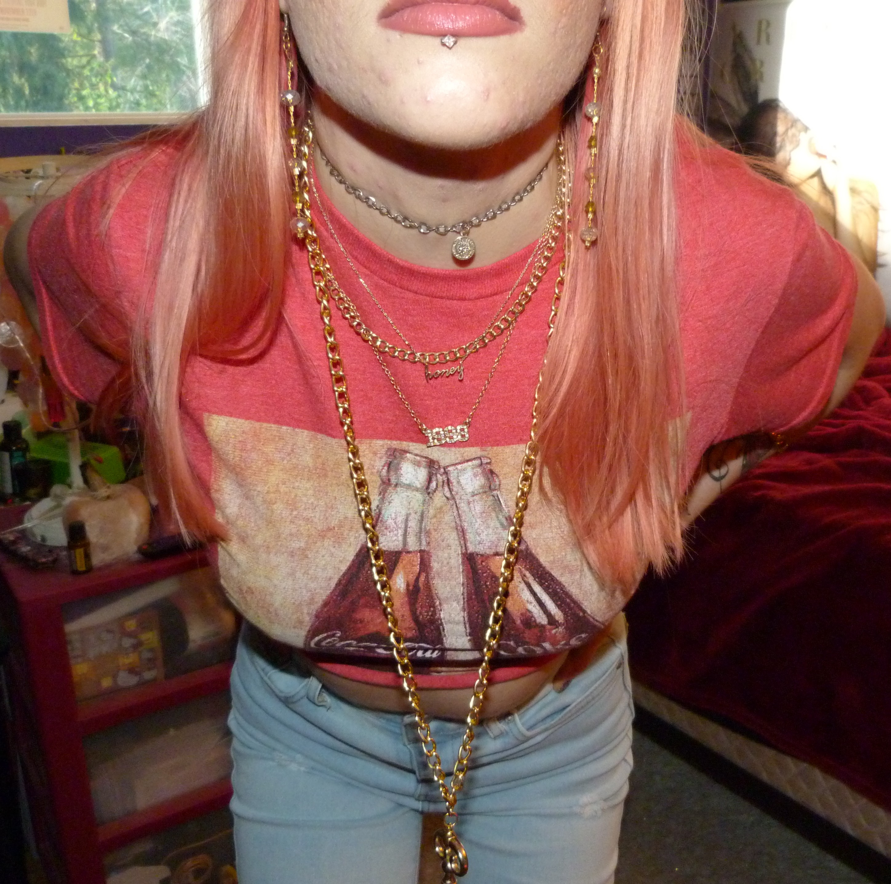 - Gold coin choker necklace & mismatched gold stud earrings in each ear that I also got from my friend Toney, in probably also the year 2020 if not the next year. My stepmom also helped me put the coin on a chain, this is one of my very favorite chokers too!