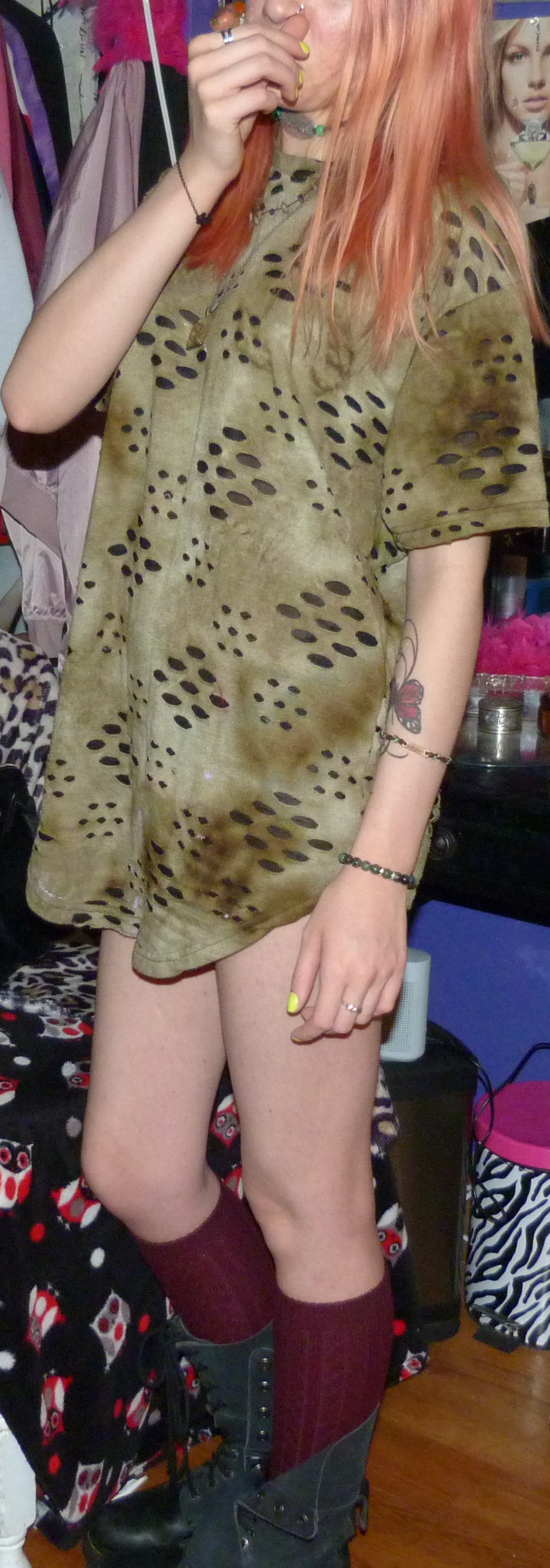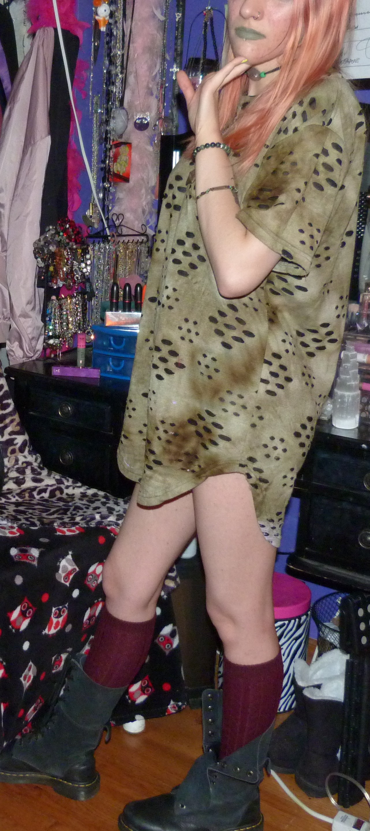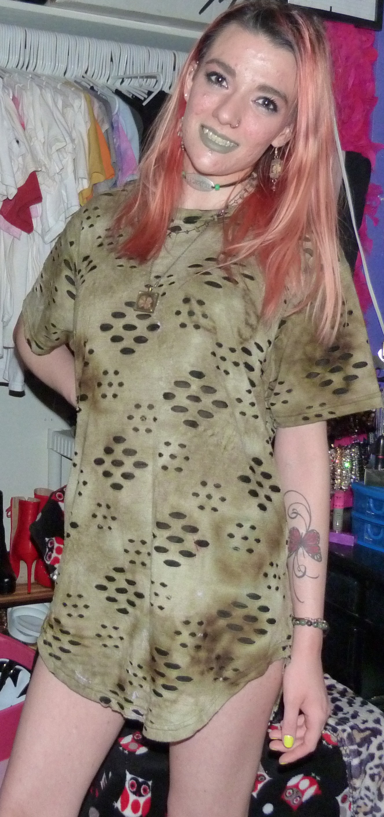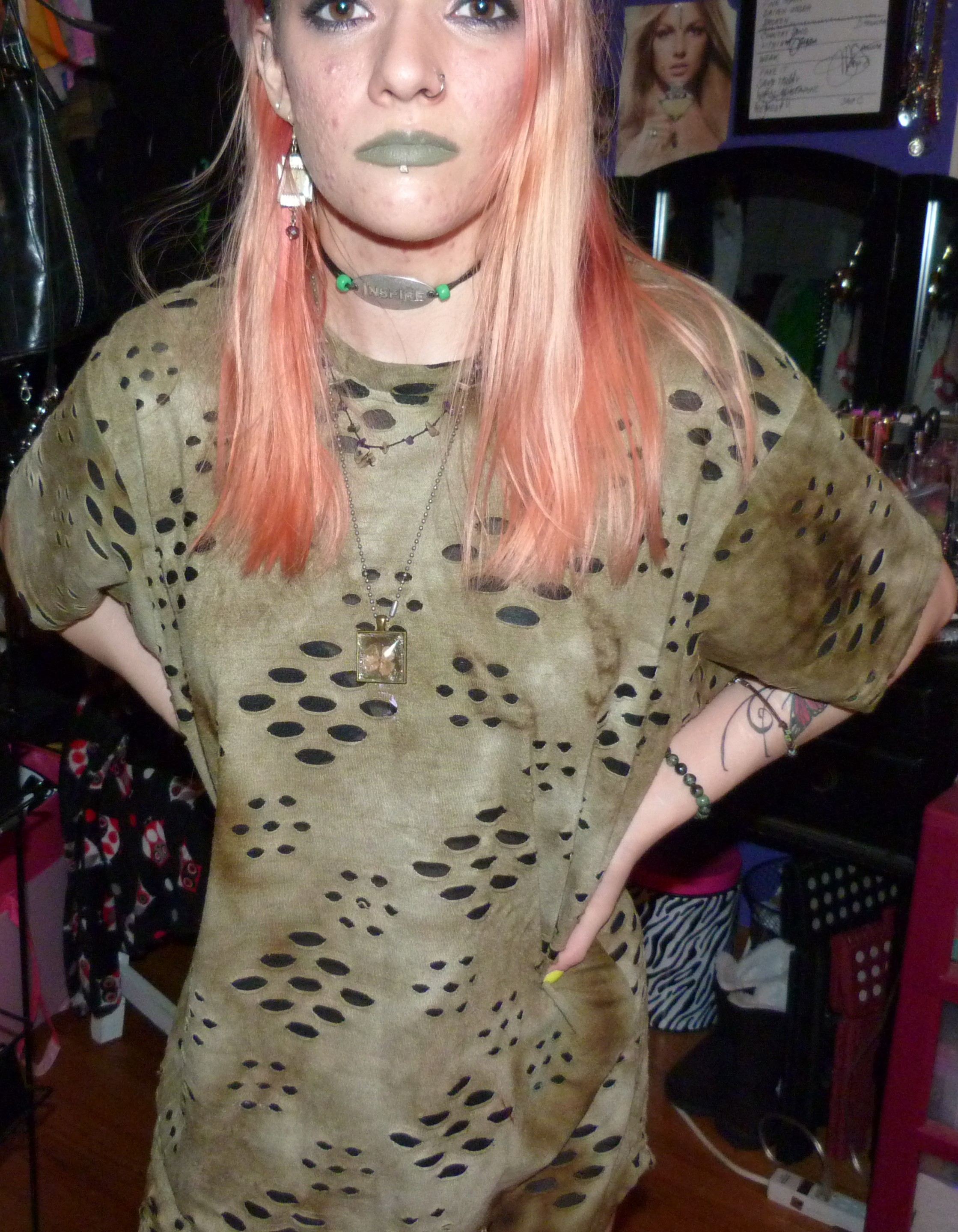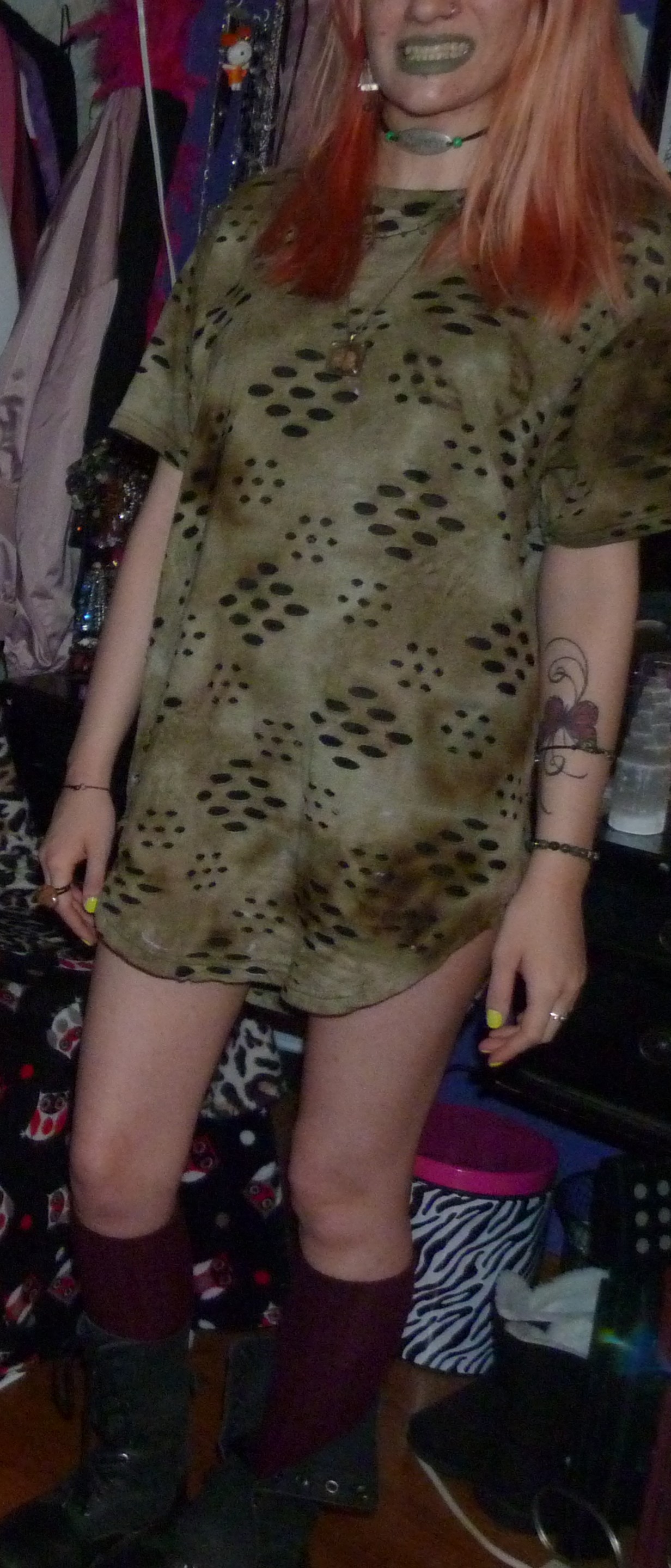 - Green distressed, grungy t-shirt dress that I wore as a dress. I got this from my friend Gordon in like 2020 or some year like that, along with a few other things.