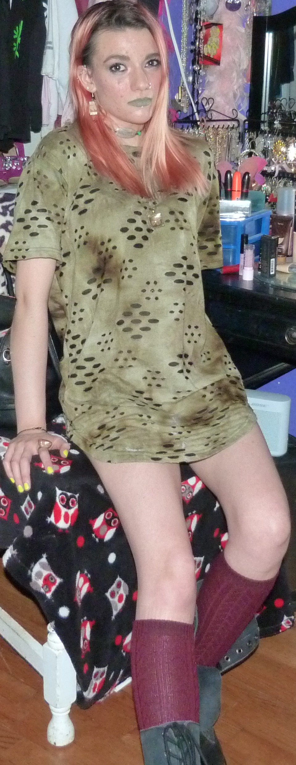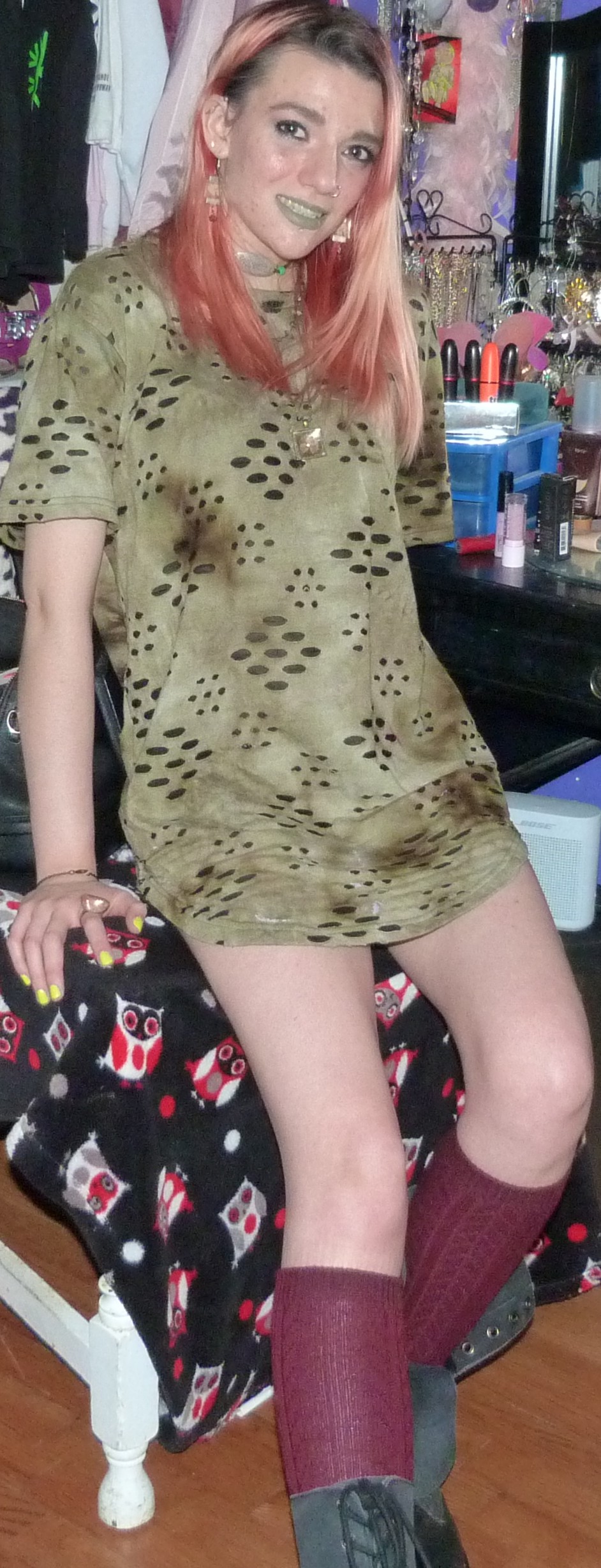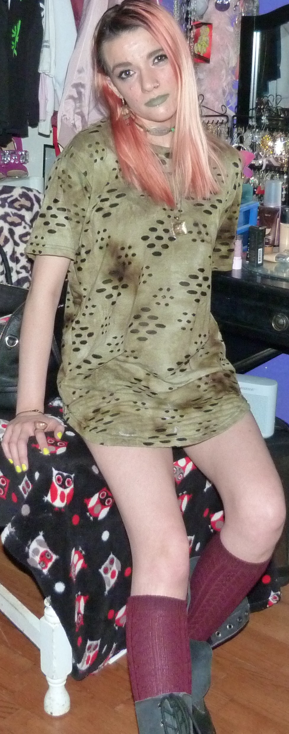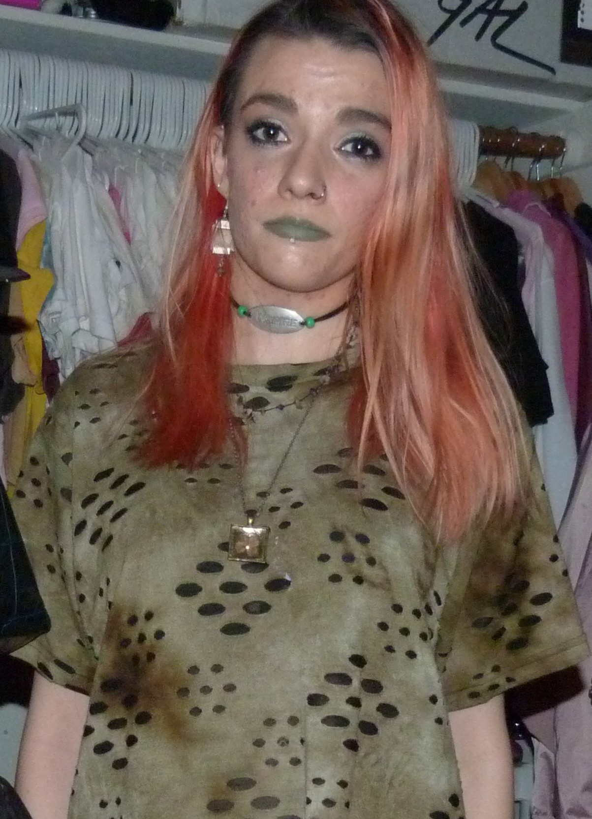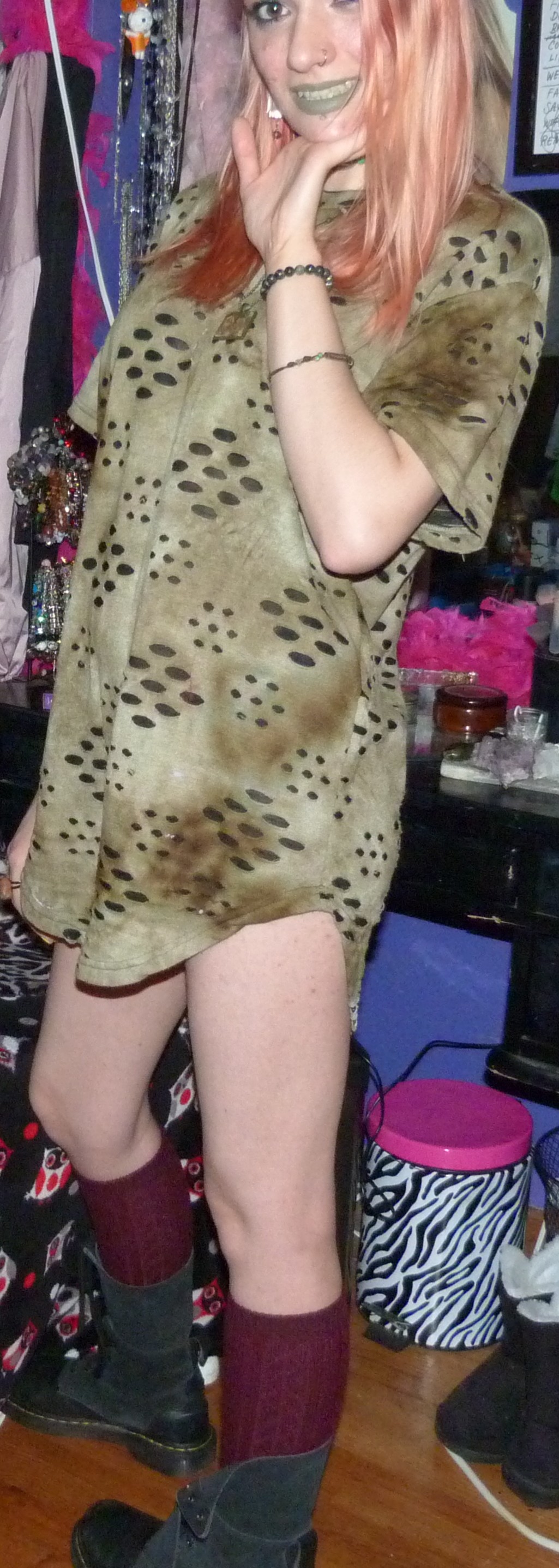 - Green distressed, grungy t-shirt dress that I wore as a dress. I got this from my friend Gordon in like 2020 or some year like that, along with a few other things.