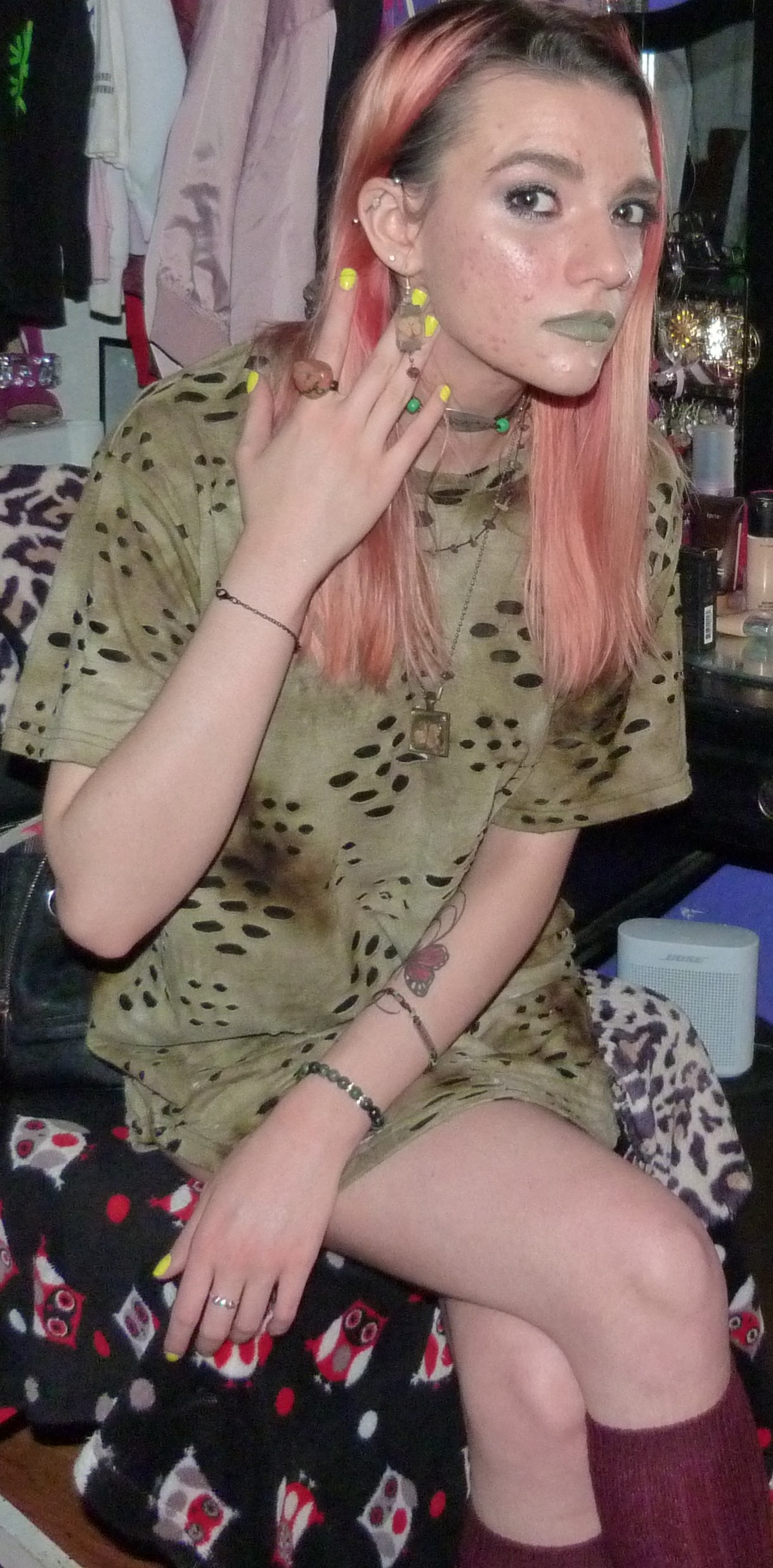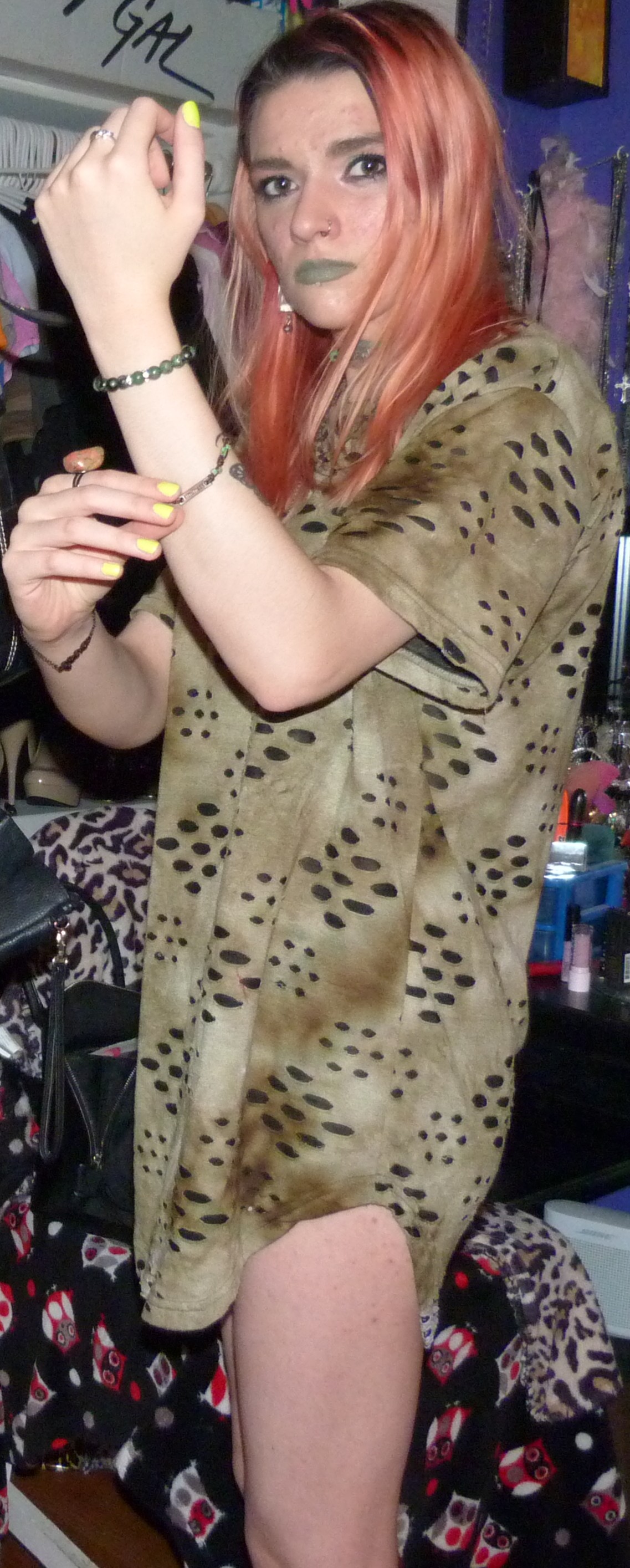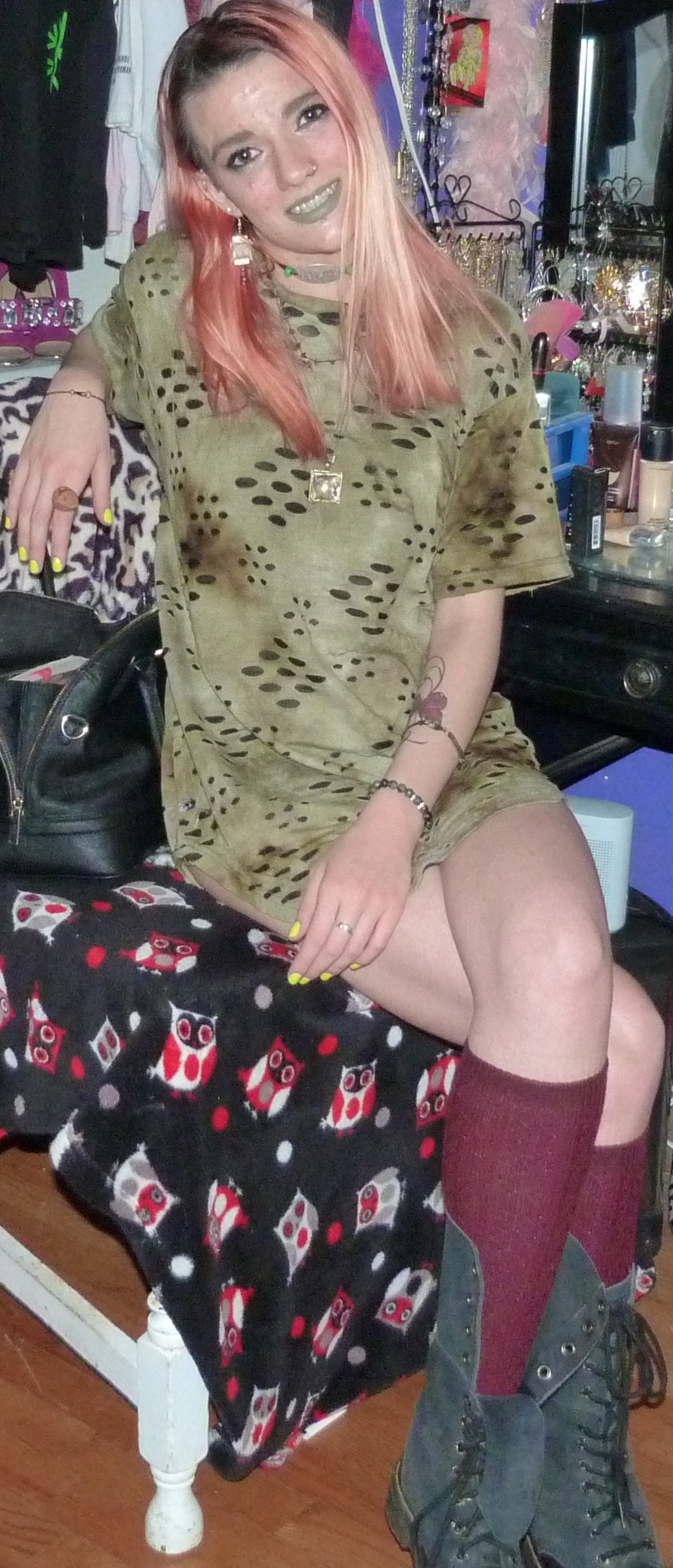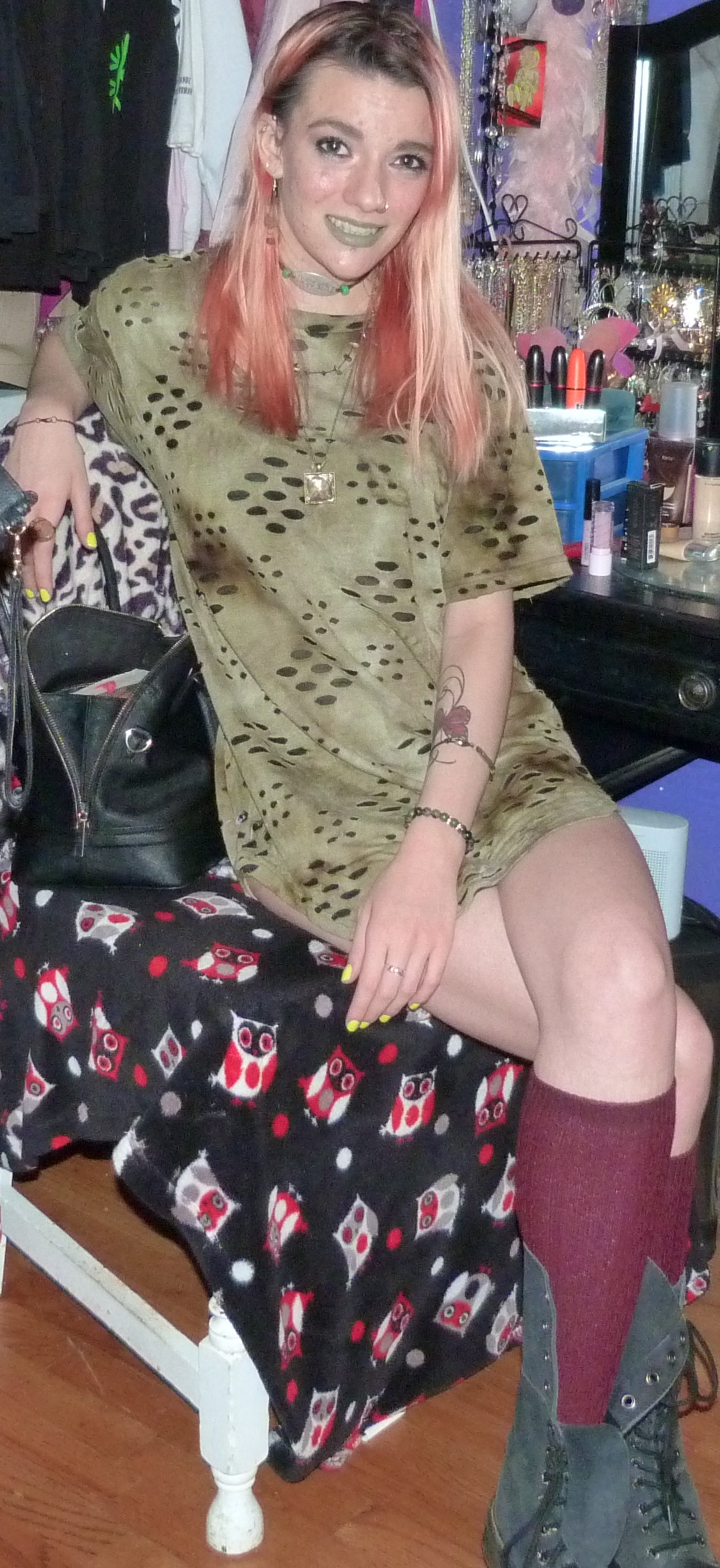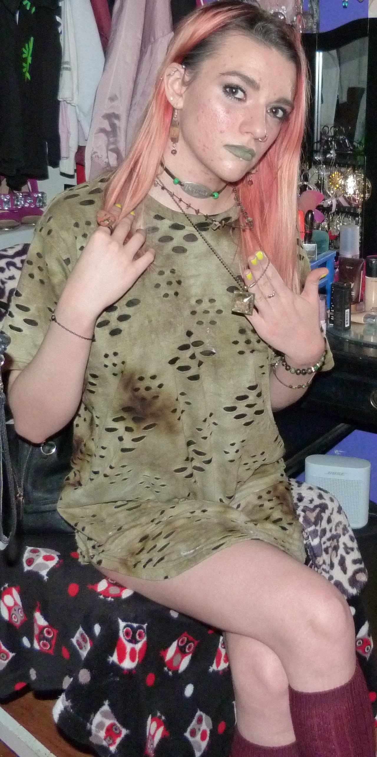 - Green distressed, grungy t-shirt dress that I wore as a dress. I got this from my friend Gordon in like 2020 or some year like that, along with a few other things.