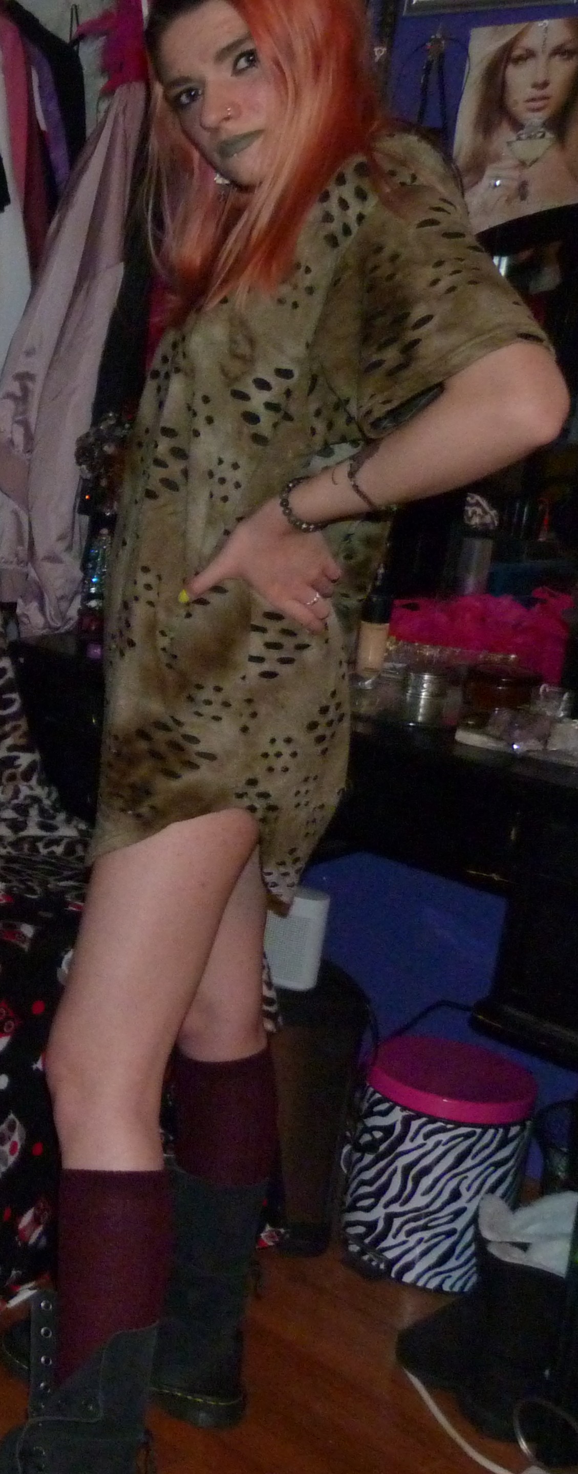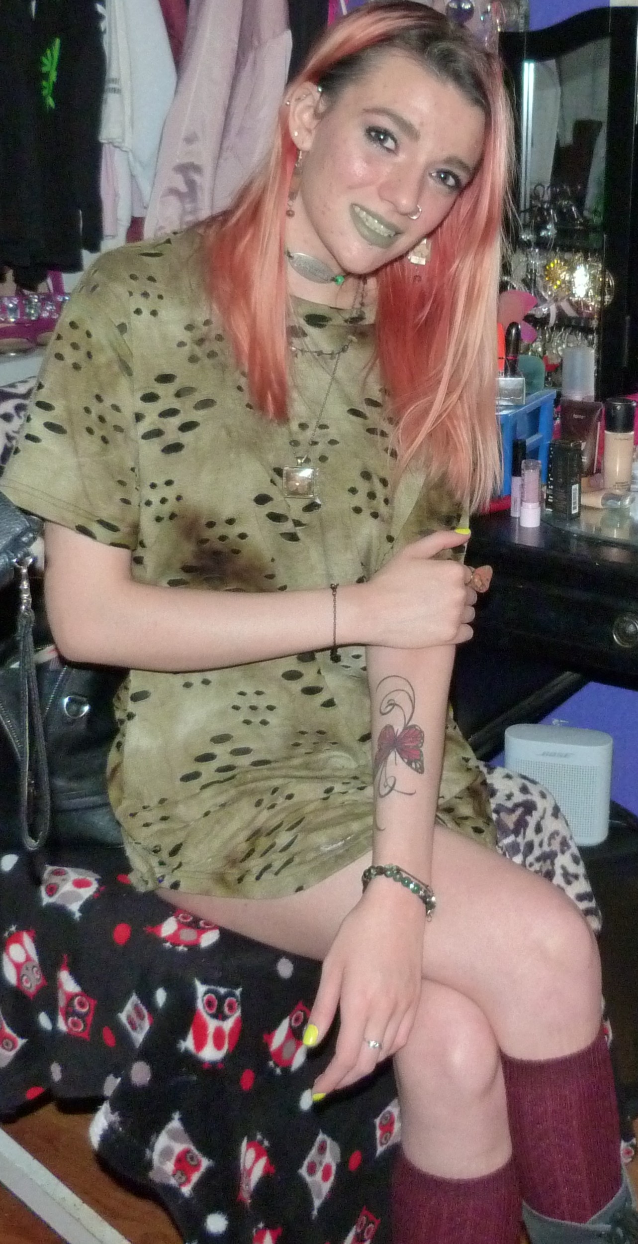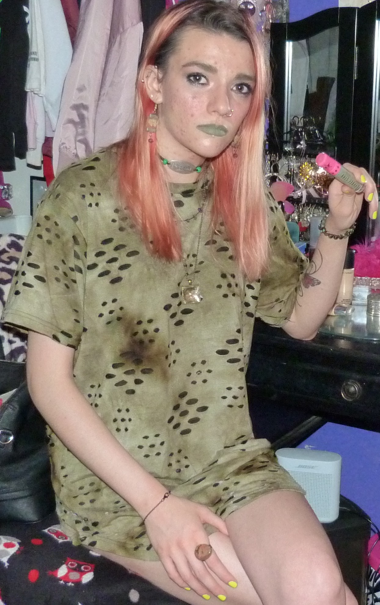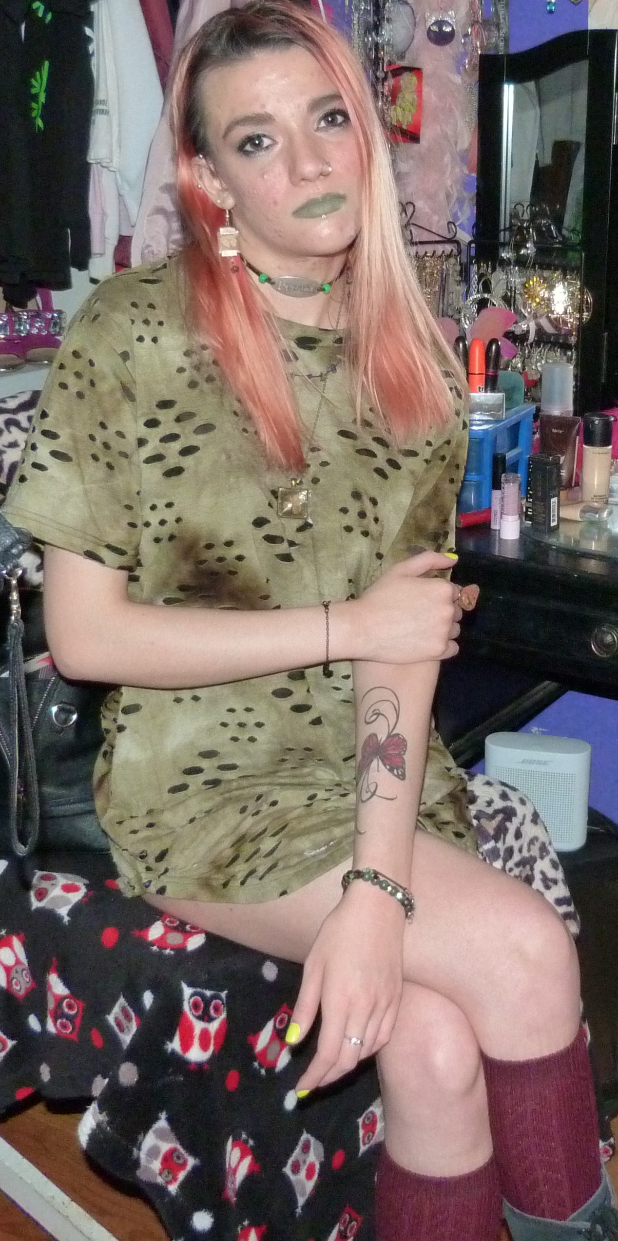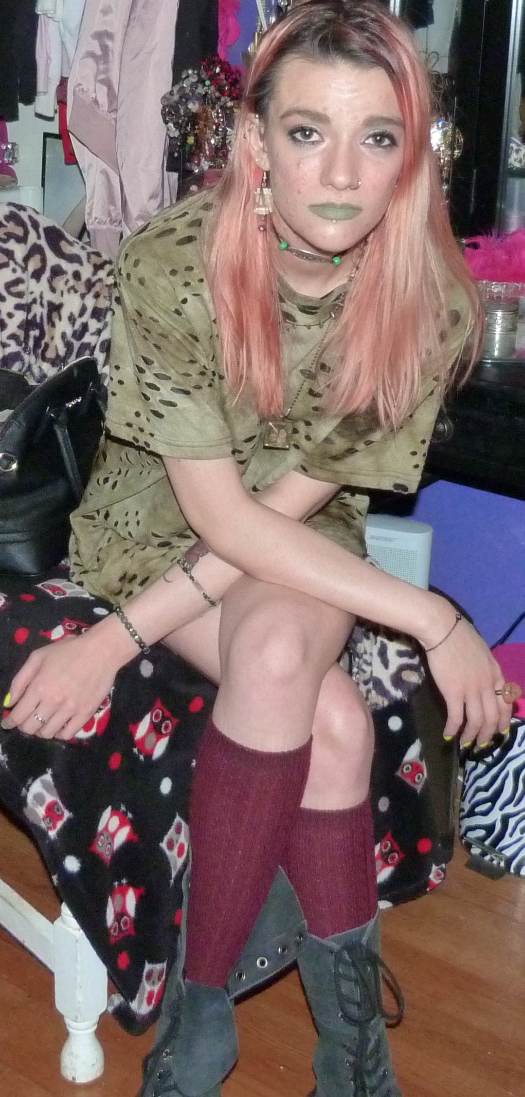 - Green distressed, grungy t-shirt dress that I wore as a dress. I got this from my friend Gordon in like 2020 or some year like that, along with a few other things.