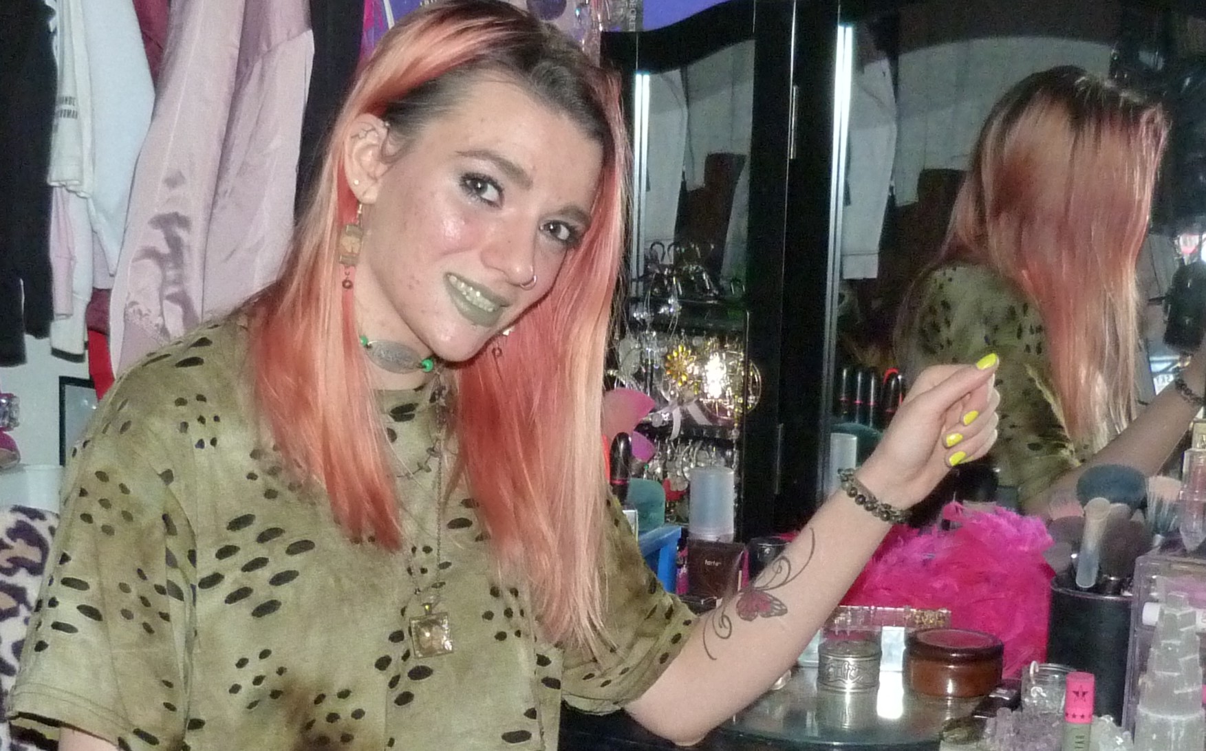 I don’t usually do much for the holidays except dress up, but I love doing that for each one. My mom has always been pretty festive with me growing up, and she still decorates our living room and kitchen with color-schemed decorations for each holiday, and I totally love that. I don’t have a lot of green clothes, but I picked this shirt dress for this photoshoot and I love how it looks. I have other green things that I have used in other photoshoots and posts like that, or things I will eventually get to, but I’m glad I picked this one for this post! You can check out my similar shirt that I got from the same friend as this green one, which is a tye-dye blue one, in my blog post called Death Row I did last summer. That one had a bit more glam to it and this one would be the grunge, and I love these two together! I wore a pair of false lashes a pink lipstick for that blog post, but for this one I just put on some pretty eyeshadow and my green lipstick that I love. I really did love how my makeup turned out in both though, you’ll see it later on in this shoot! Thanks so much for being a reader or a follower, let’s start the collages!