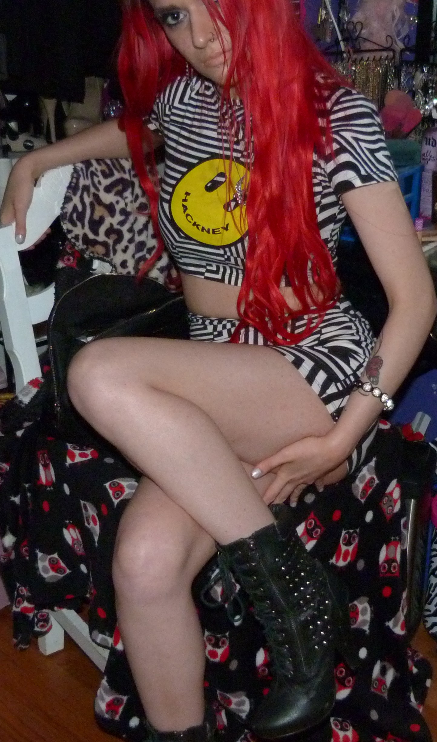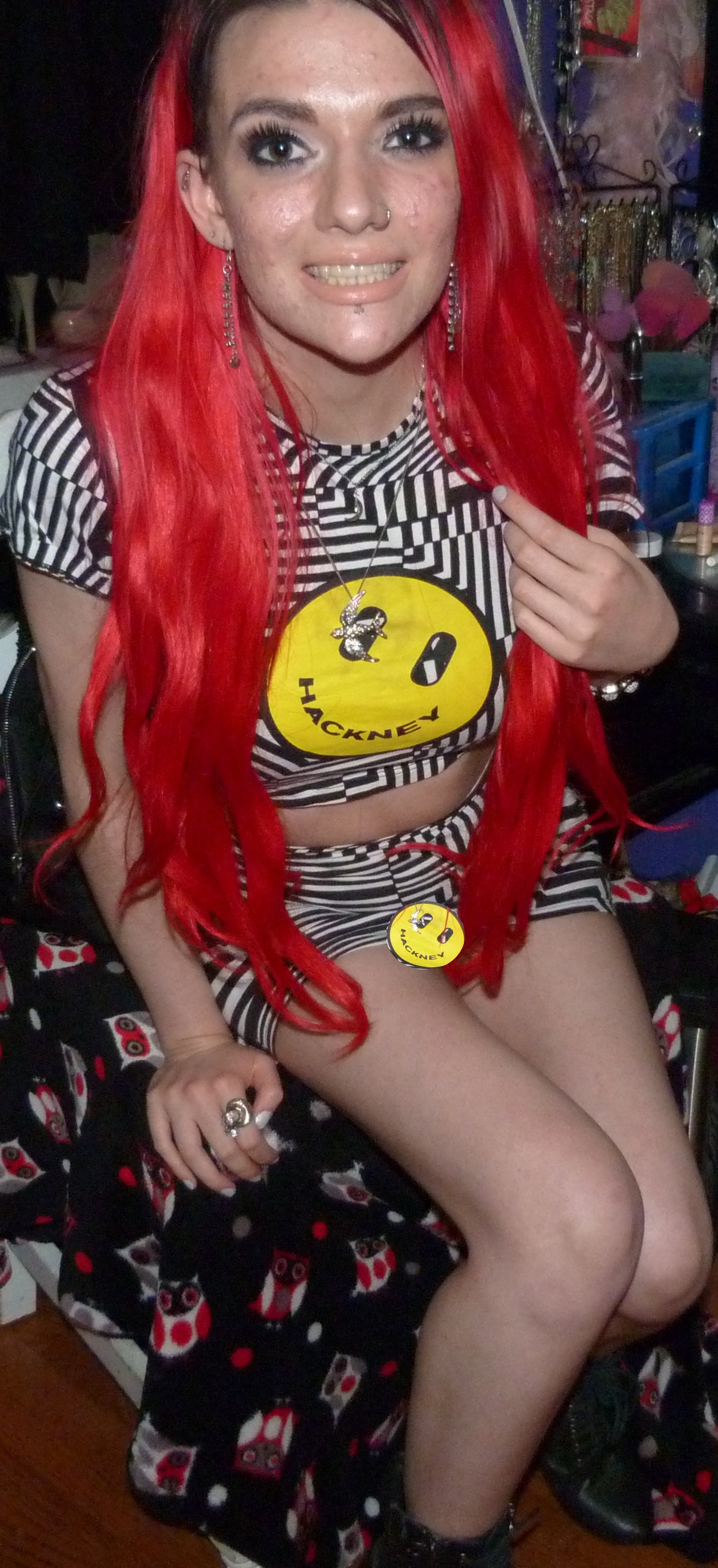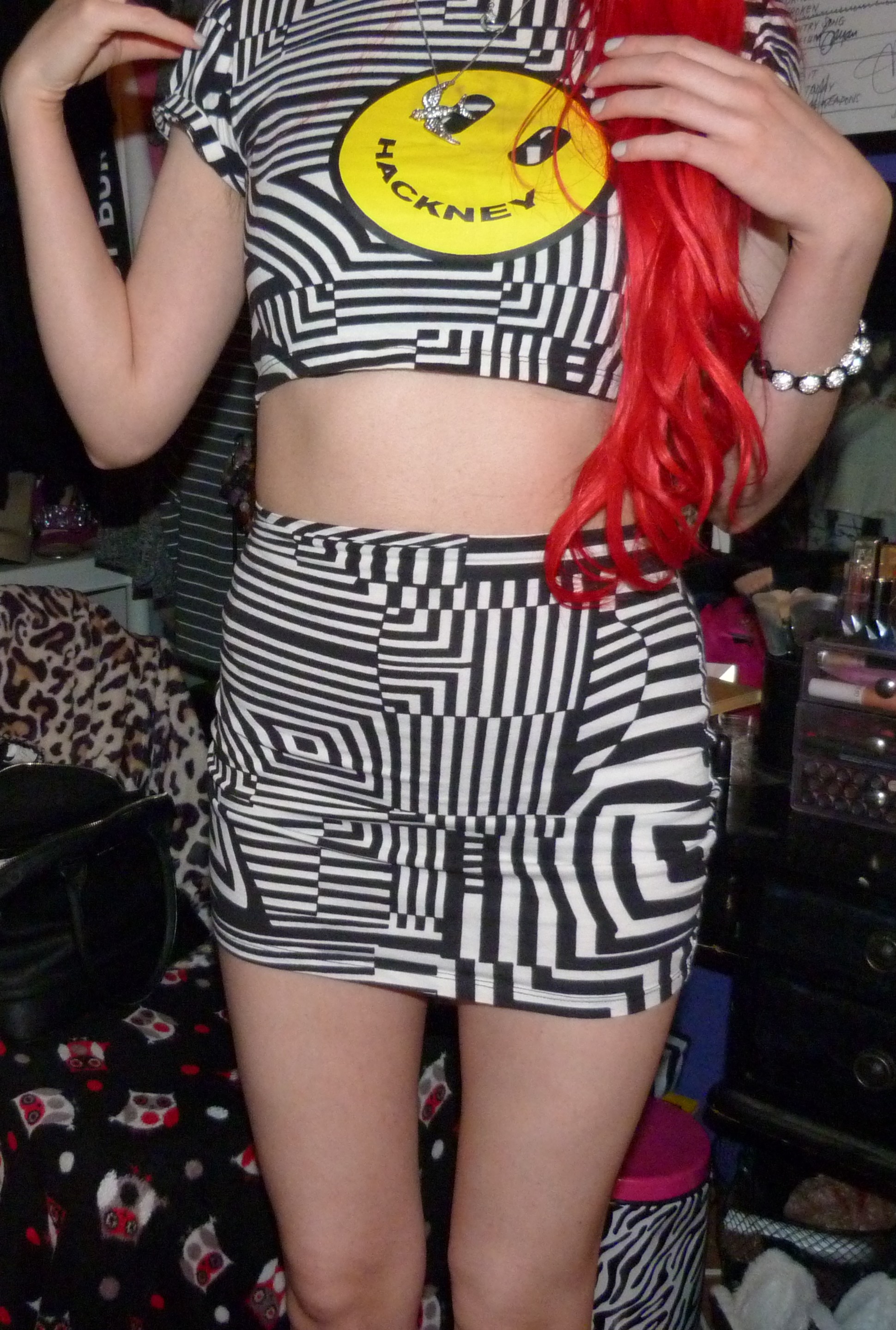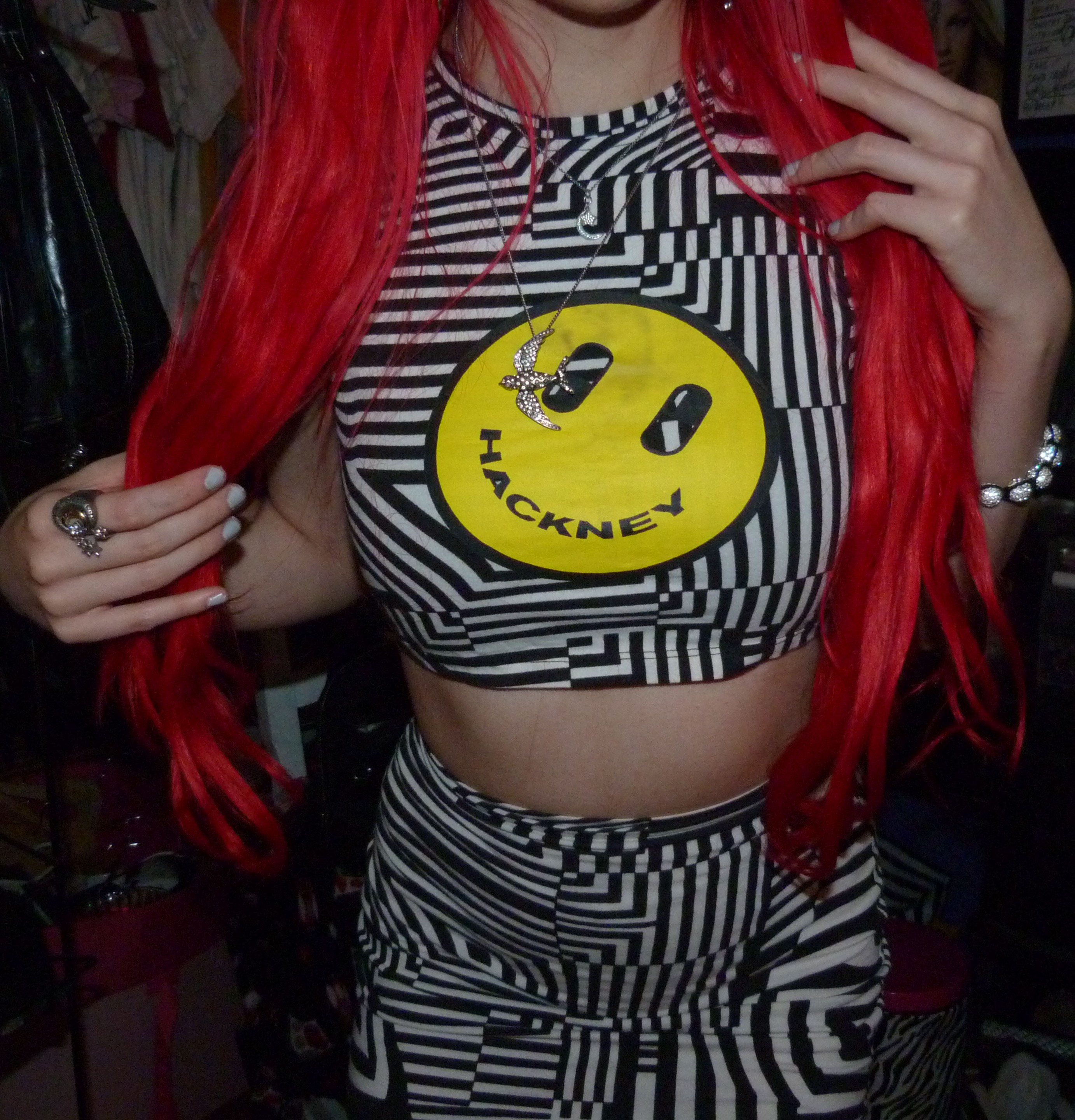 - Nelle & Kimmy Skirt Set $55 from the brand Motel from Dolls Kill online, that says ‘Hackney’ on a yellow smiley face on the front of the crop top. I got this two-piece set in January of 2020 too.