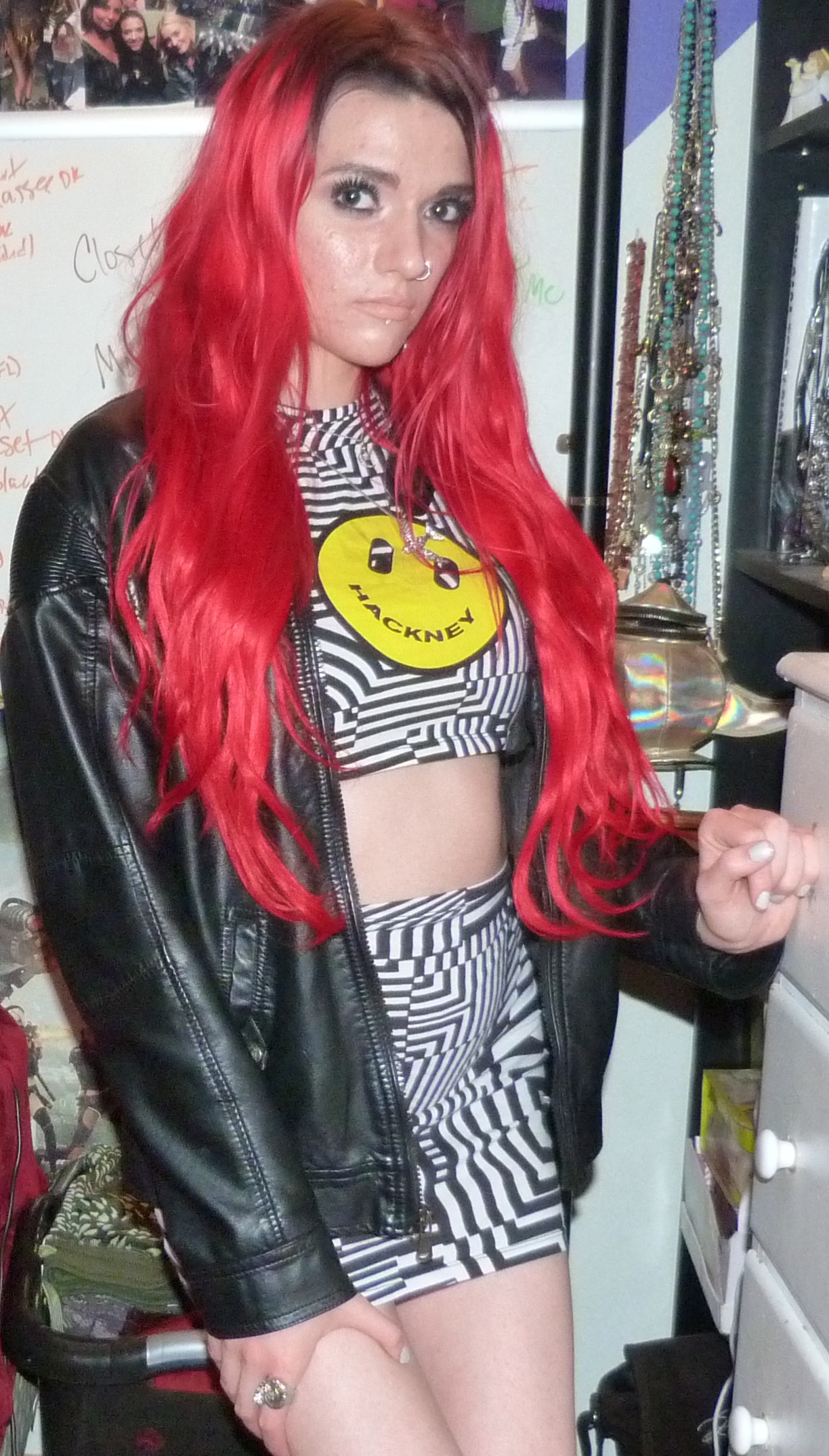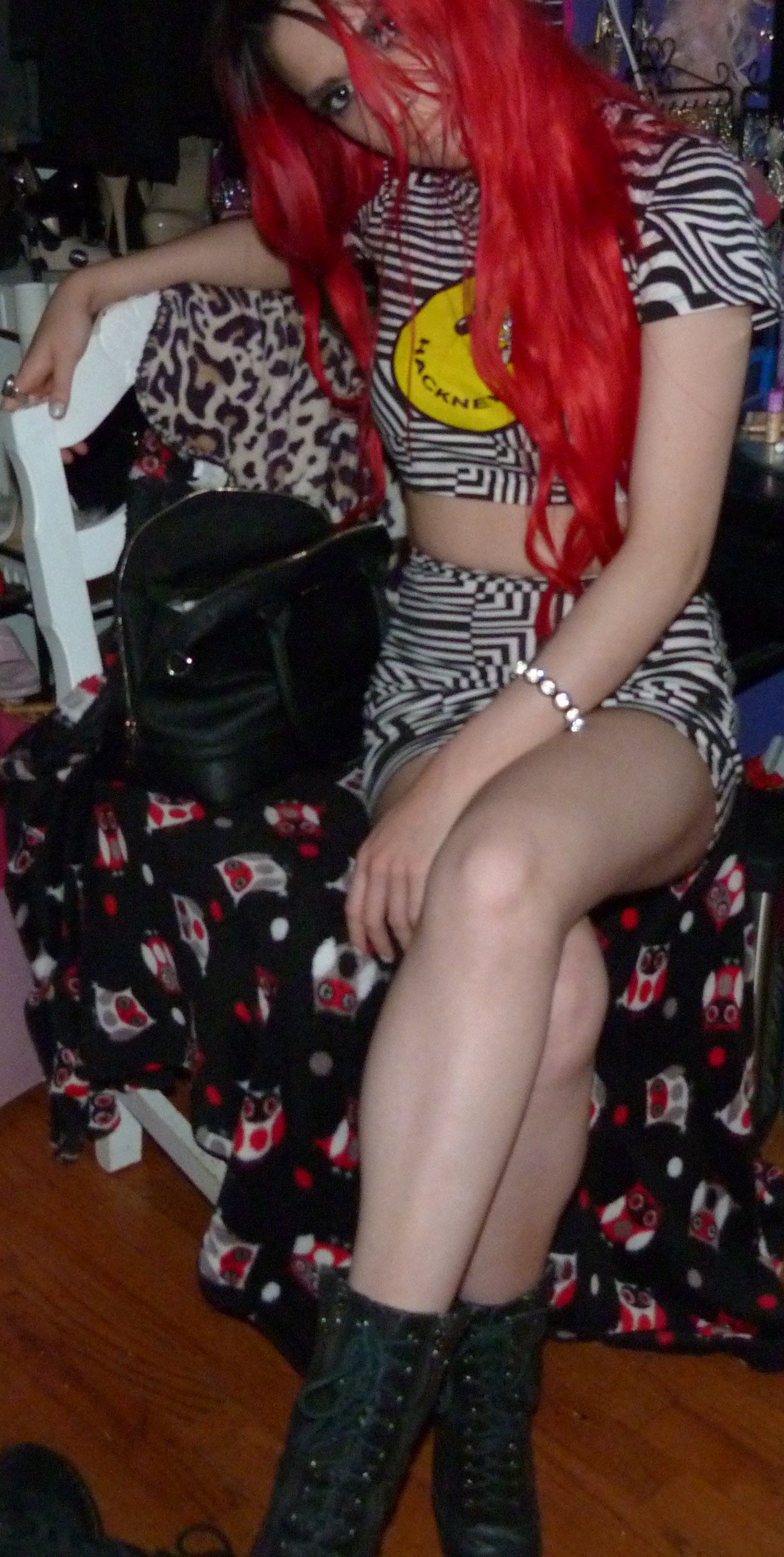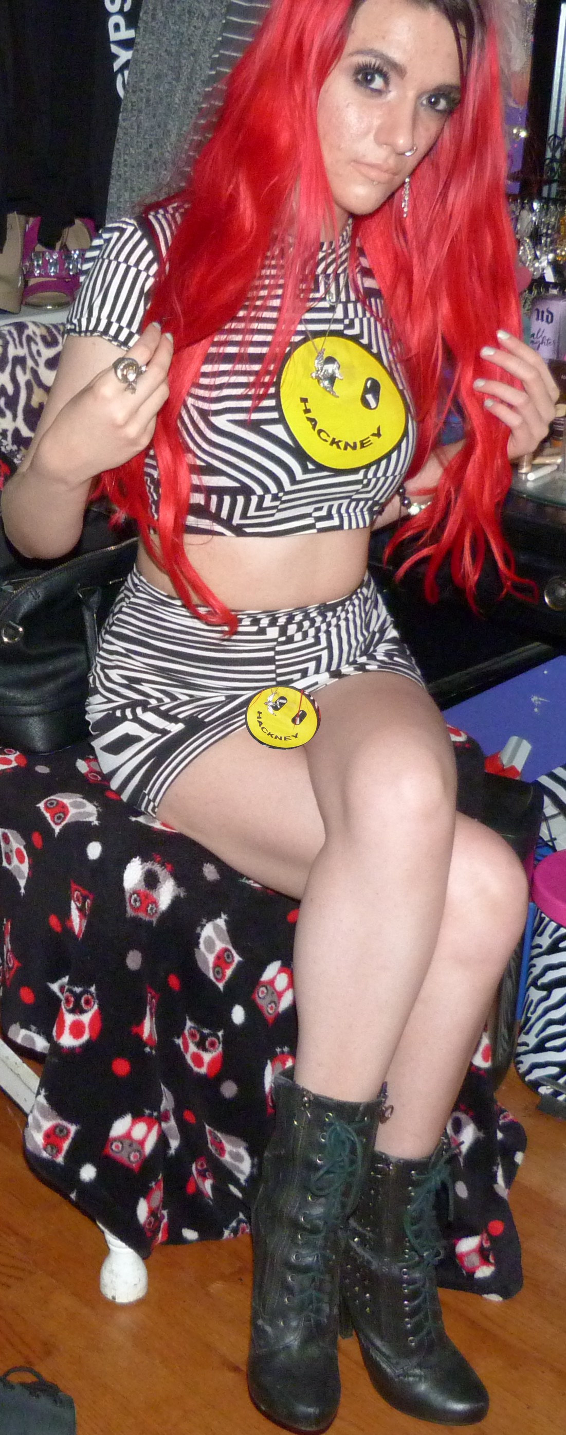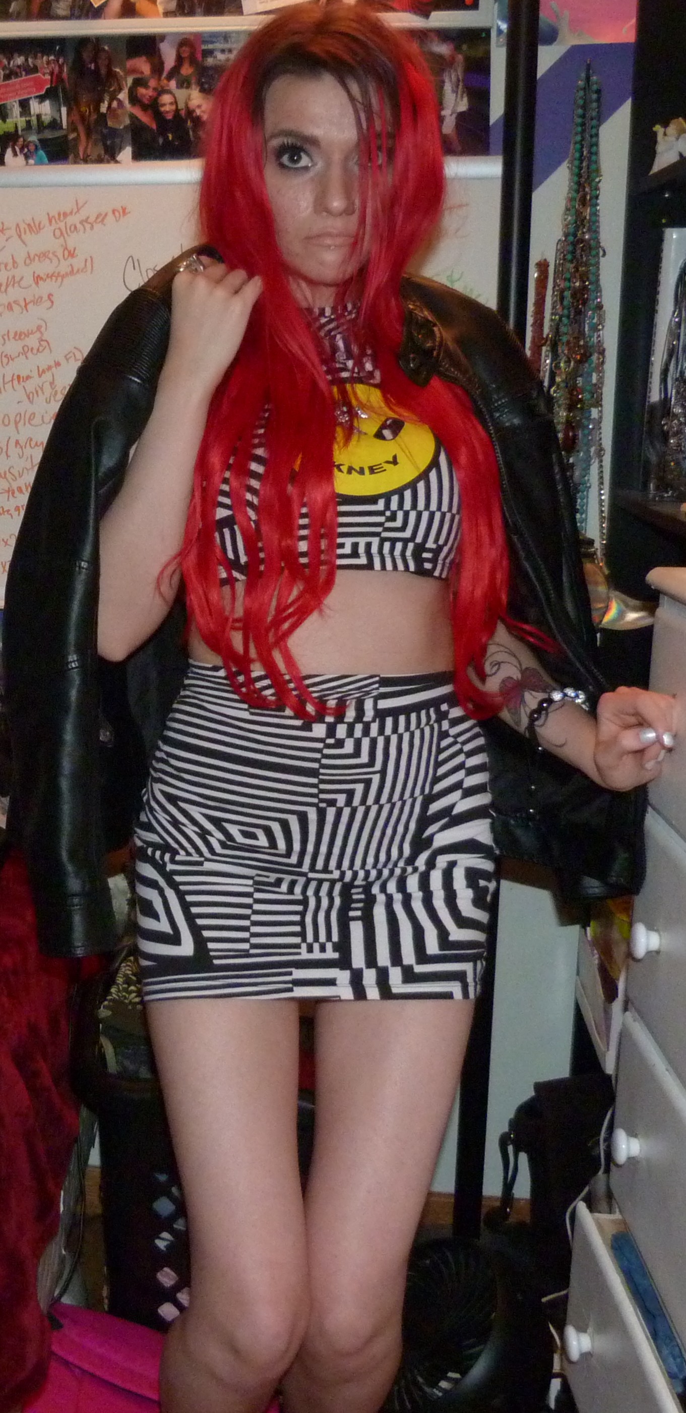 - Nelle & Kimmy Skirt Set $55 from the brand Motel from Dolls Kill online, that says ‘Hackney’ on a yellow smiley face on the front of the crop top. I got this two-piece set in January of 2020 too.