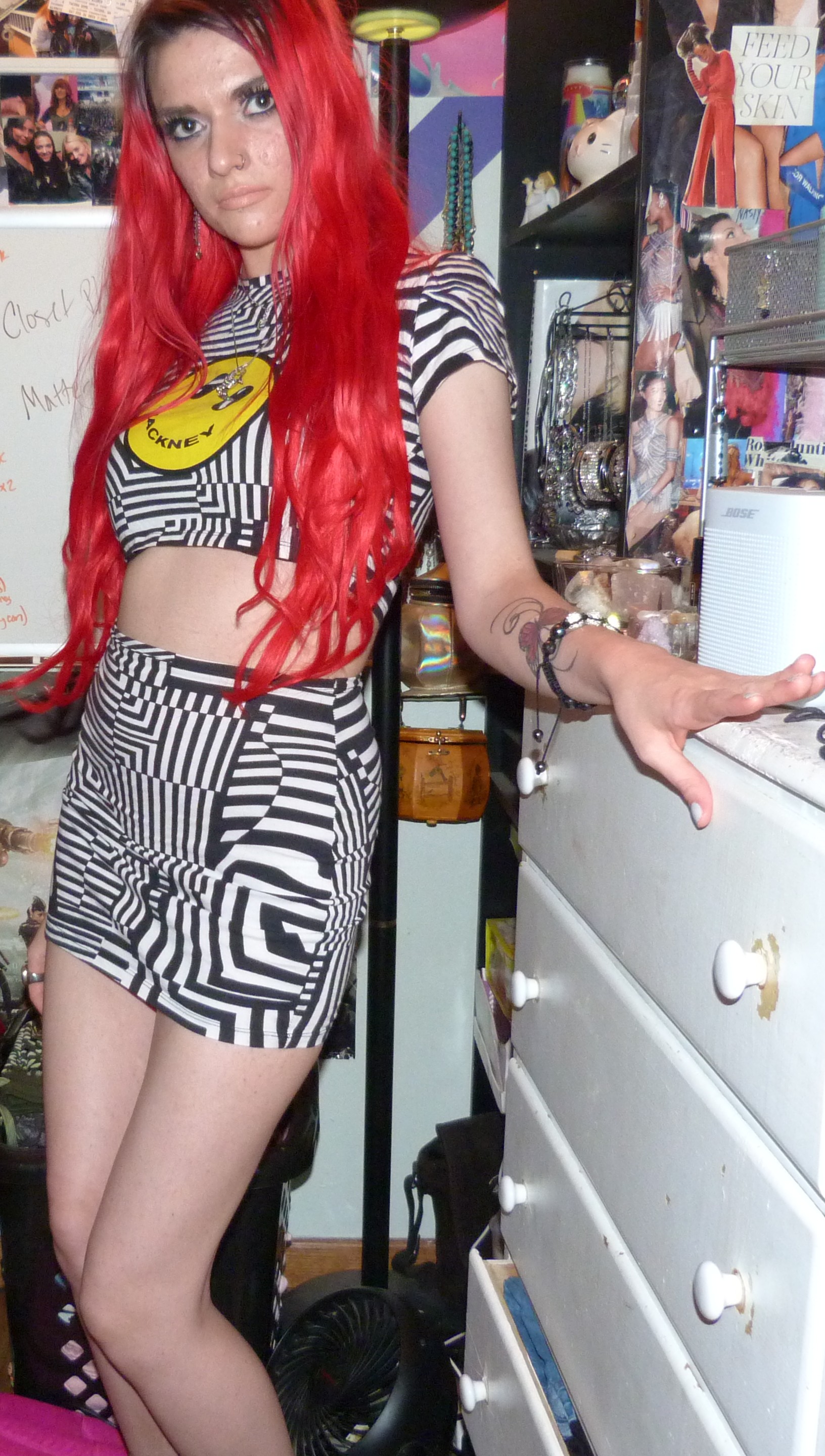 Dolls Kill is usually my favorite place to buy clothes online. I have been taking a break recently in the last year or half from buying much new clothes just so I can wear what I have more and catch up on photoshoots, but I do love finding new things on Dolls Kill and will eventually get back to buying more! In the meantime, this outfit is one of my favorite things I have from there. I still have a few other things I have from there and love with all my heart but haven’t done a shoot for yet, but this one was a good one to do next and I really love it. I have most things I want to do a photoshoot for on a list on my whiteboard, and you’ll see with the very last picture I use what that looks like and everything. I really love this ‘Hackney’ two-piece set, it reminds me of like 2013 on Instagram and stuff (with my old Britney Spears IG I called @/britneyobsessed and then gave the account name to my friend) when everyone was referring to Britney as like ‘Godney’ or something! That’s what I was reminded of when I bought this set, I thought it would be a cool reference to that if you know how big I am on celebrities or merchandise or whatever. Either way of whatever it actually means, I think this is a hot two-piece set. I bought it in January of 2020 for some reason, which was a crazy time period for me. I’m glad I saved this set for this photoshoot though, for me in this time – I was really glad about it turned out. I used to want to shoot everything while it was newer but I really value getting around to these photoshoots at my age with all these really cool pieces I still have. A good example was a shoot I attempted to do in 2019 but never took a single picture, and then did the same-ish outfit in March 2021 with my boyfriend called Genie Atrapado. That was a head-to-toe Dolls Kill outfit that I got in like 2019, and it took me so long to get around to it. I, like I said only have like a few things more from there and then I’m caught up on my favorite store! I’m so glad about how everything is eventually turning out too. I’m also glad it’s finally summer, because most of the things I have waiting on my whiteboard are like, summer things or something. Let’s checkout the collages.