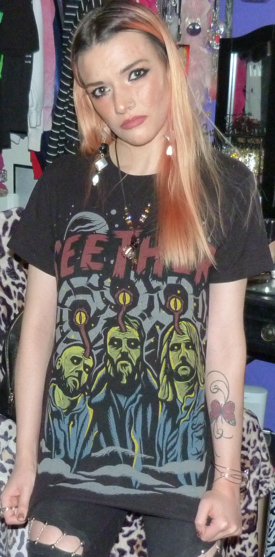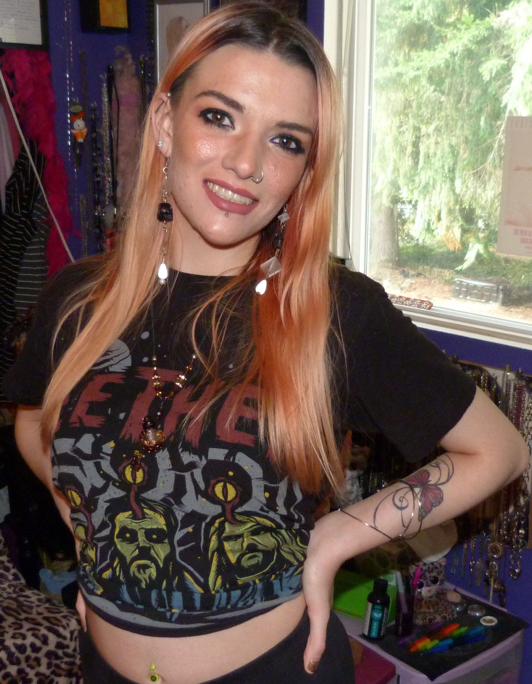 It’s finally time for me to do a good Halloween post! I do holiday posts sometimes throughout the years but a Halloween themed photoshoot or blog post I haven’t really done as much as I could’ve until today. The only other Halloween related blog post I’ve done until now is one I called Scorpio Season back in 2017, with a Halloween themed outfit and a Scorpio themed outfit. That one was pretty great, I think it turned out pretty good! This one is pretty much just a cute themed photoshoot with a Seether t-shirt I got for Halloween in 2015 called Mind Control, and it’s a totally awesome t-shirt! I just basically wore that and my chain leggings that I always love, and it was a pretty good outfit. One day I’ll find some sort of costume to do for a that kind of photoshoot, but I rarely ever dress up for Halloween! So I guess it was just cool to shoot down this photoshoot for both blogs of mine, including Celebrity Merch Base where I post things that I collect. I like how this turned out, I did some pictures for both the full-length shirt and the shirt tied up in the back to make it a crop top! I wanted to make sure I got the entire shirt in the picture but also it looked really cute tied up. I also love the picture I used for my featured photo below, I think the eye look looked pretty good with the name of the t-shirt (Mind Control) that matched the look pretty well! Anyway, I love this Seether t-shirt, because I can definitely wear it other times of the year but it definitely was a Halloween t-shirt that they put out so it’s perfect to finally do a photoshoot for for this Halloween. I can’t believe how long I’ve had all my Seether merchandise! I always love it. Let’s get more into the photoshoot now.