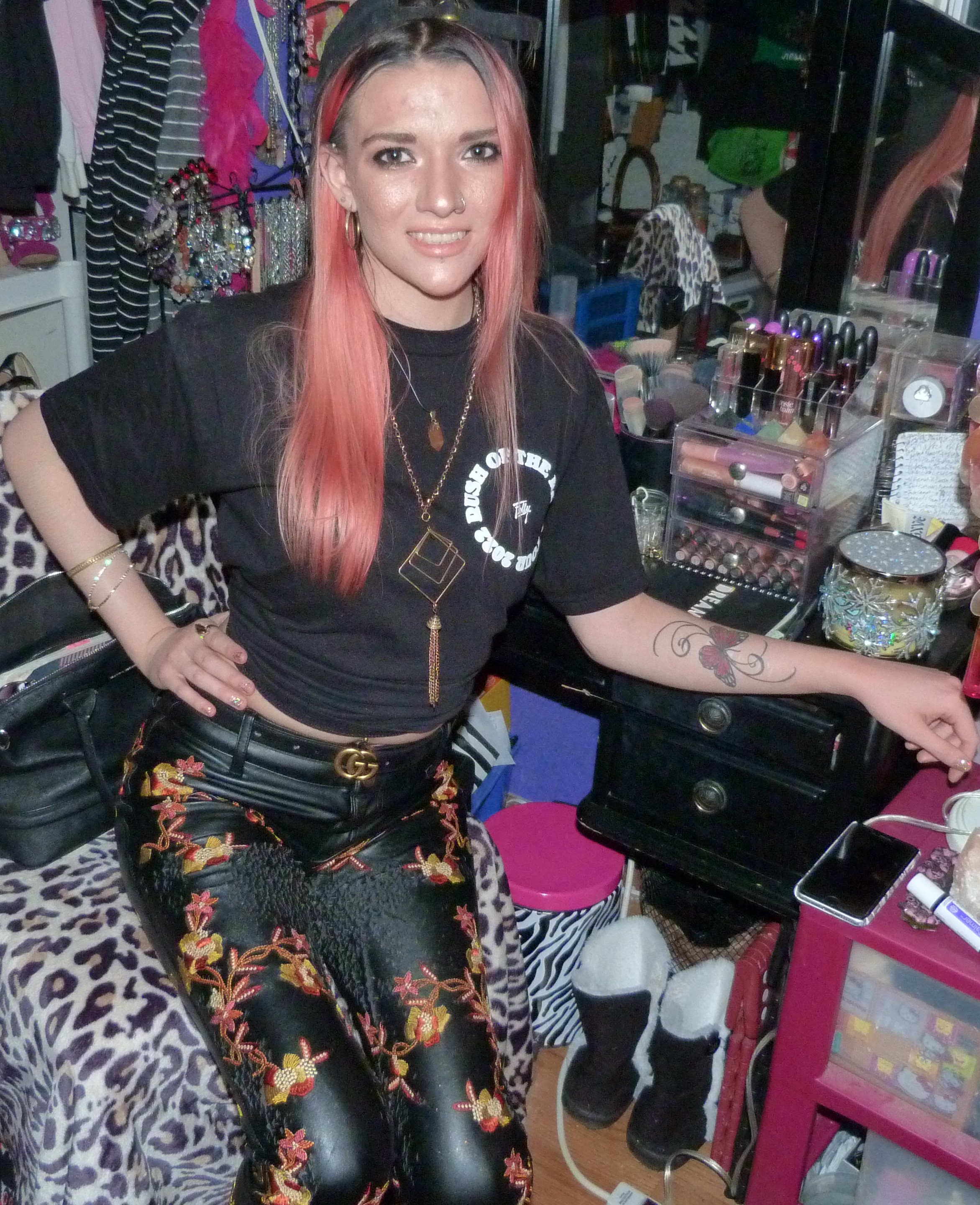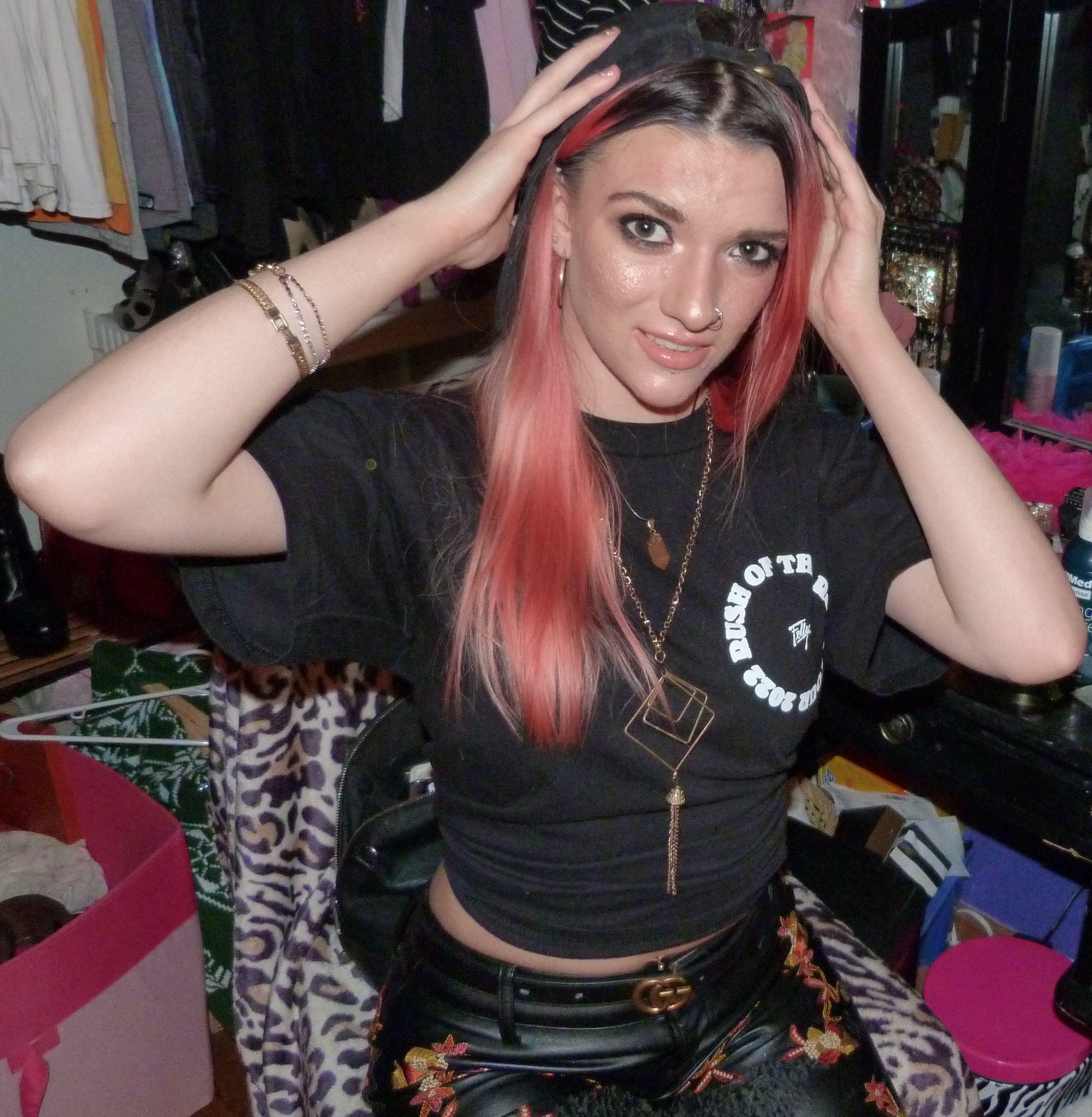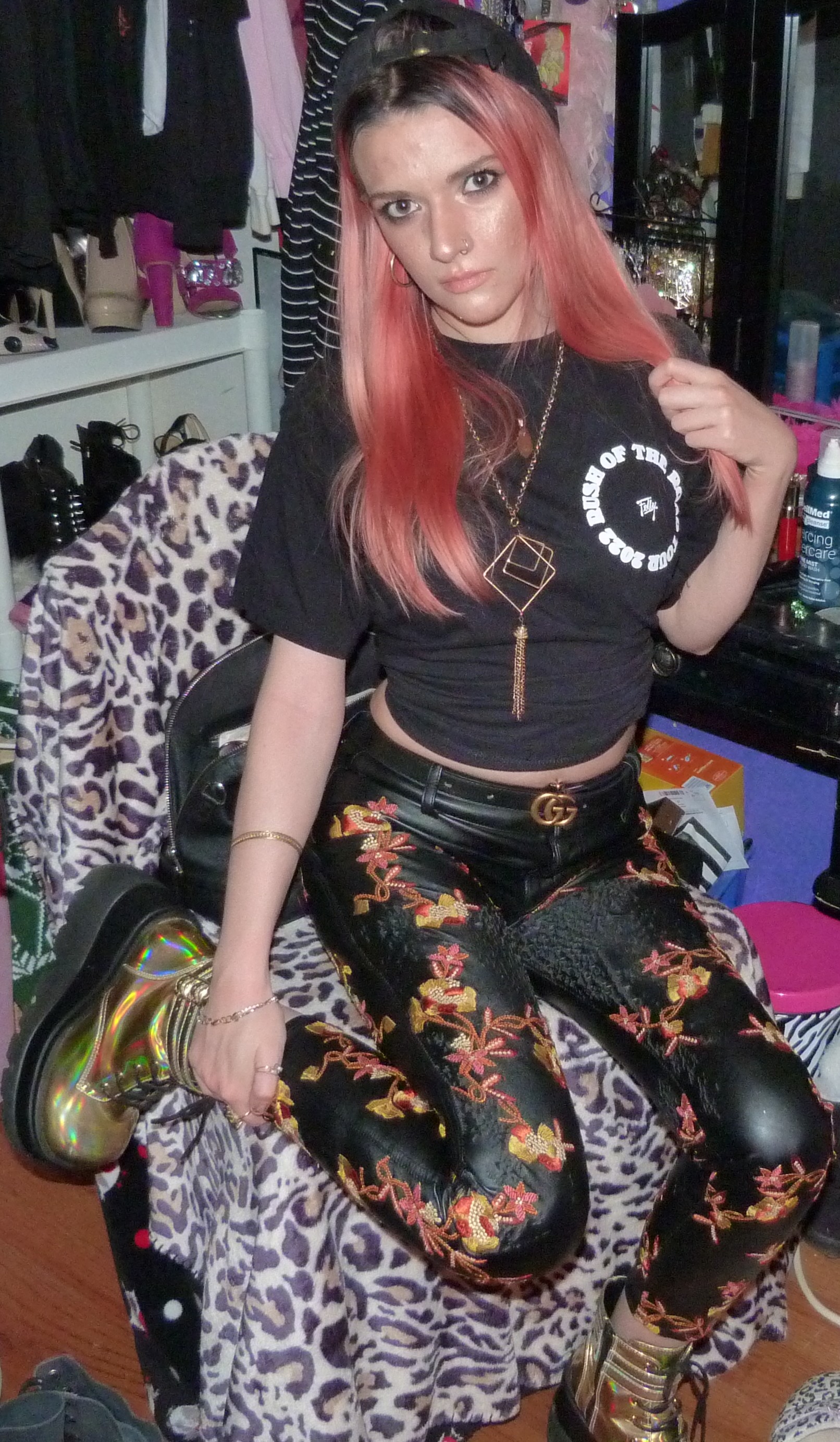Hey guys, it’s finally time for this outfit I put together from one of my other birthday presents from last month. It’s totally my new gold Gucci belt that I got from my mom for my 24th birthday! I put together this cool gold outfit with it to finally do my post for it before the year is over. I included my signed Felly shirt that I got from meeting him at his concert in Seattle in February, which was so awesome! I only got two shirts from concerts this year since I have so many, but I’m glad I was finally able to get this one into this photoshoot before the year was over! This shirt is signed in (my) black Sharpie on the back of the shirt (in this white circle on the back). I also wore my big gold boots and these leather pants that I have from Nasty Gal from way back in the day, and some other merch hat as well. I loved this look, it was a pretty good one! I wear gold sometimes and it rocks, and I love how I put this look together, I think it’s perfect with all that there is there together. The makeup look was a pretty good one, too, I love how that’s turning out. I named this photoshoot after a song Felly did on his recent album, Young Fel 2, called ‘Pot of Gold’ which is on one of my playlists I haven’t mentioned much before, that I started mid last year, called Untitled. It’s a pretty good song! I of course named the blog post Gucci Gold though, which references to a Gucci post I did in 2016 that I’ll mention more later. I also wore my Gucci Guilty Eau perfume with the outfit as well as a Gucci lipstick from back in the day with this look. I love all that I have from the brand! I included 3 Gucci items total I think for this look. Definitely go ahead and read more of this under the picture. Thanks for checking me out!