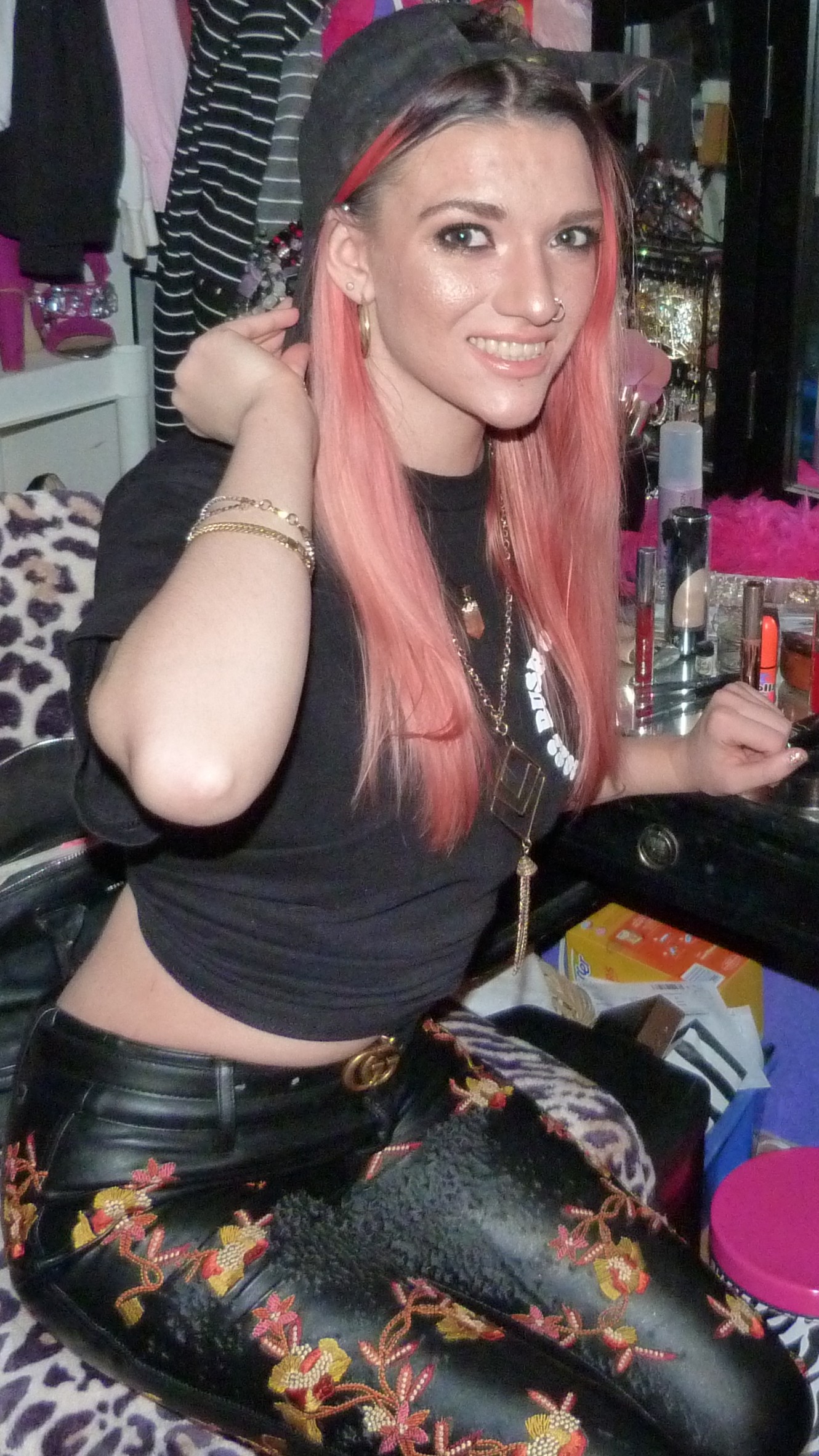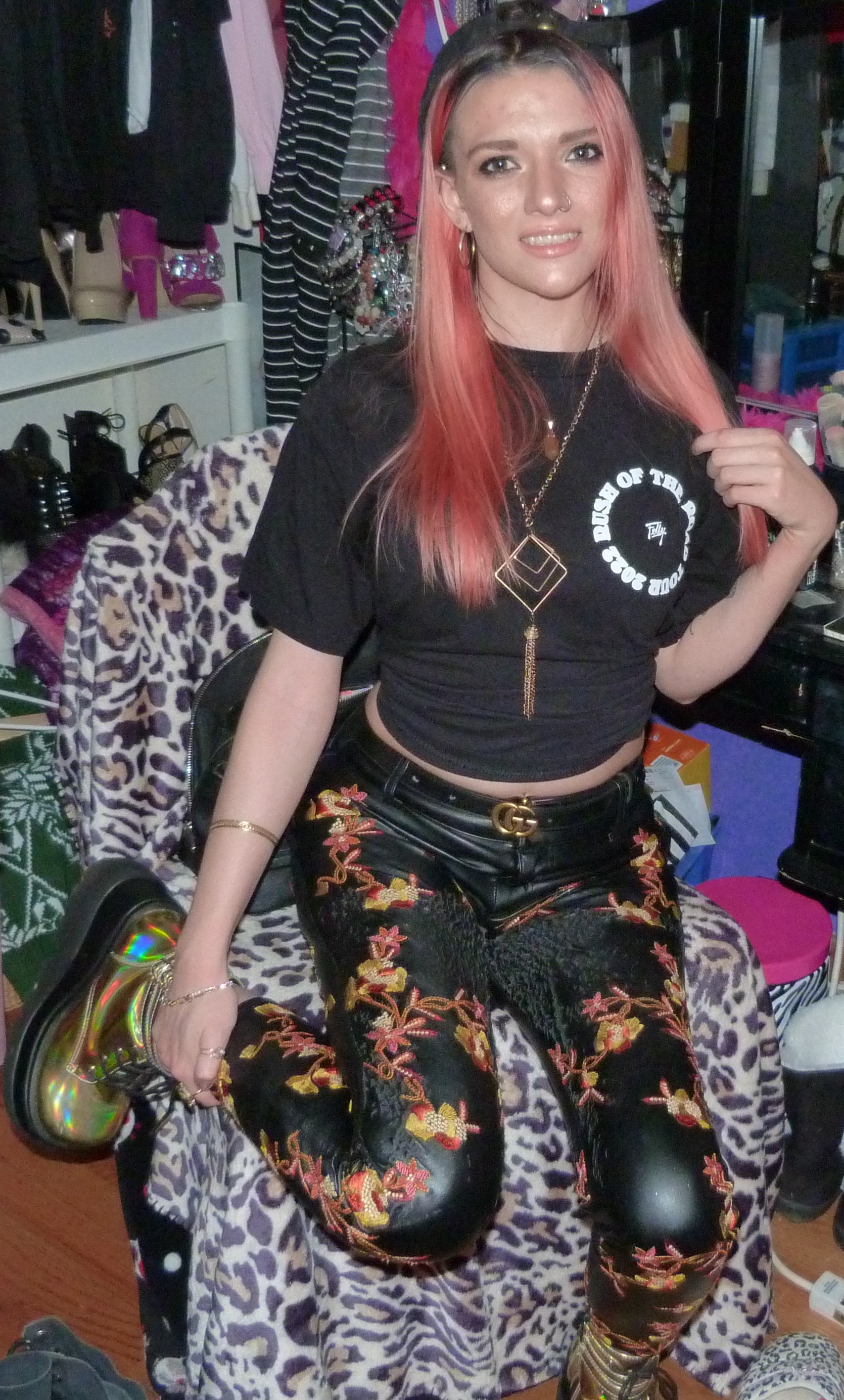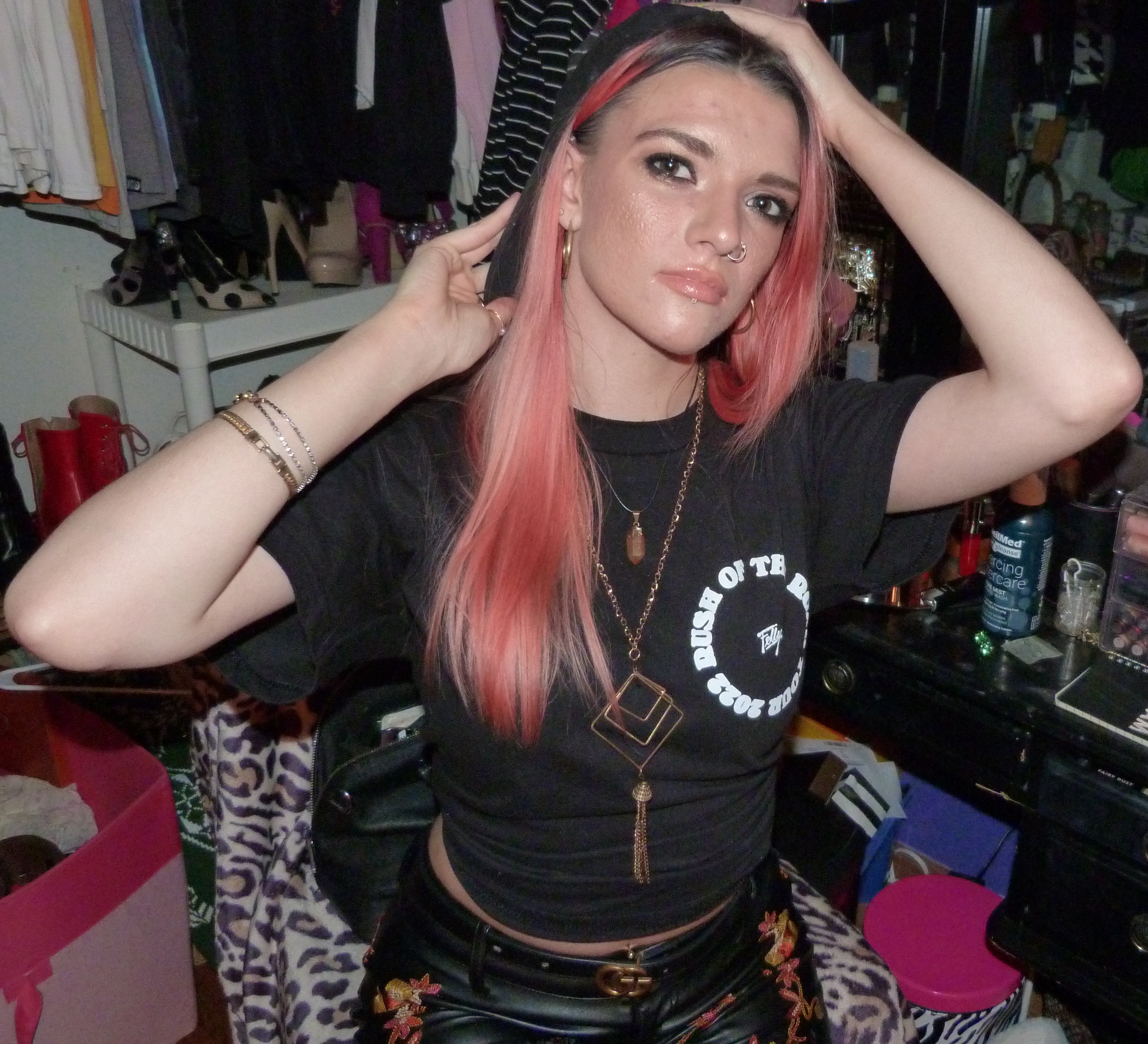 Hey guys, it’s finally time for this outfit I put together from one of my other birthday presents from last month. It’s totally my new gold Gucci belt that I got from my mom for my 24th birthday! I put together this cool gold outfit with it to finally do my post for it before the year is over. I included my signed Felly shirt that I got from meeting him at his concert in Seattle in February, which was so awesome! I only got two shirts from concerts this year since I have so many, but I’m glad I was finally able to get this one into this photoshoot before the year was over! This shirt is signed in (my) black Sharpie on the back of the shirt (in this white circle on the back). I also wore my big gold boots and these leather pants that I have from Nasty Gal from way back in the day, and some other merch hat as well. I loved this look, it was a pretty good one! I wear gold sometimes and it rocks, and I love how I put this look together, I think it’s perfect with all that there is there together. The makeup look was a pretty good one, too, I love how that’s turning out. I named this photoshoot after a song Felly did on his recent album, Young Fel 2, called ‘Pot of Gold’ which is on one of my playlists I haven’t mentioned much before, that I started mid last year, called Untitled. It’s a pretty good song! I of course named the blog post Gucci Gold though, which references to a Gucci post I did in 2016 that I’ll mention more later. I also wore my Gucci Guilty Eau perfume with the outfit as well as a Gucci lipstick from back in the day with this look. I love all that I have from the brand! I included 3 Gucci items total I think for this look. Definitely go ahead and read more of this under the picture. Thanks for checking me out!