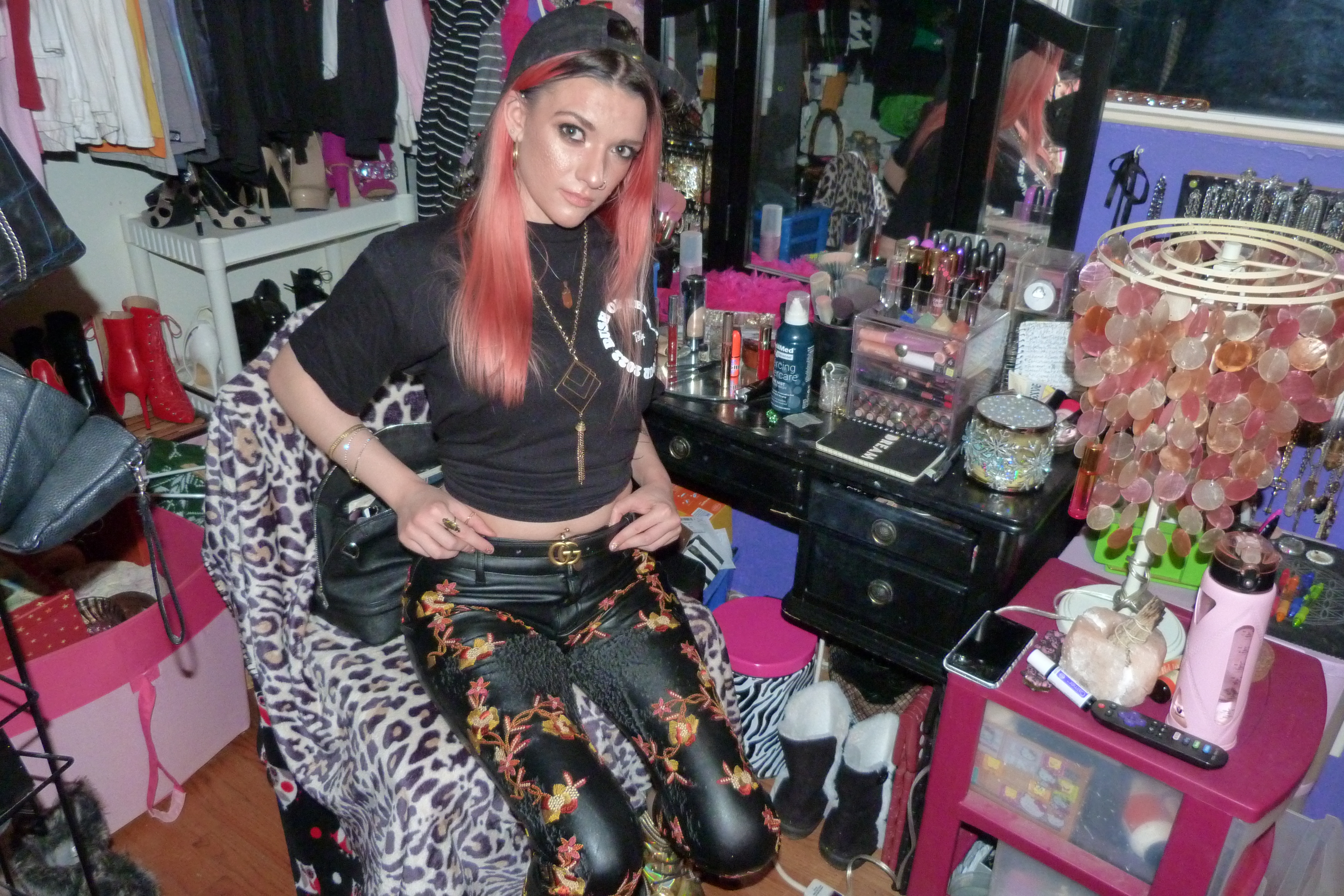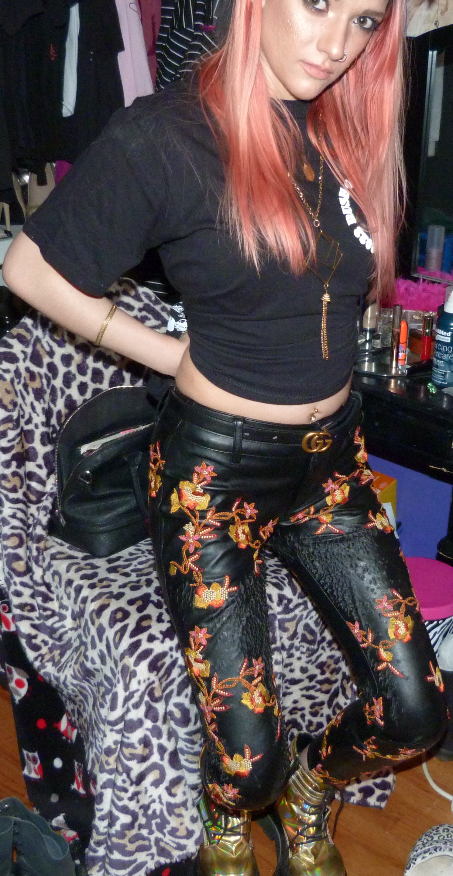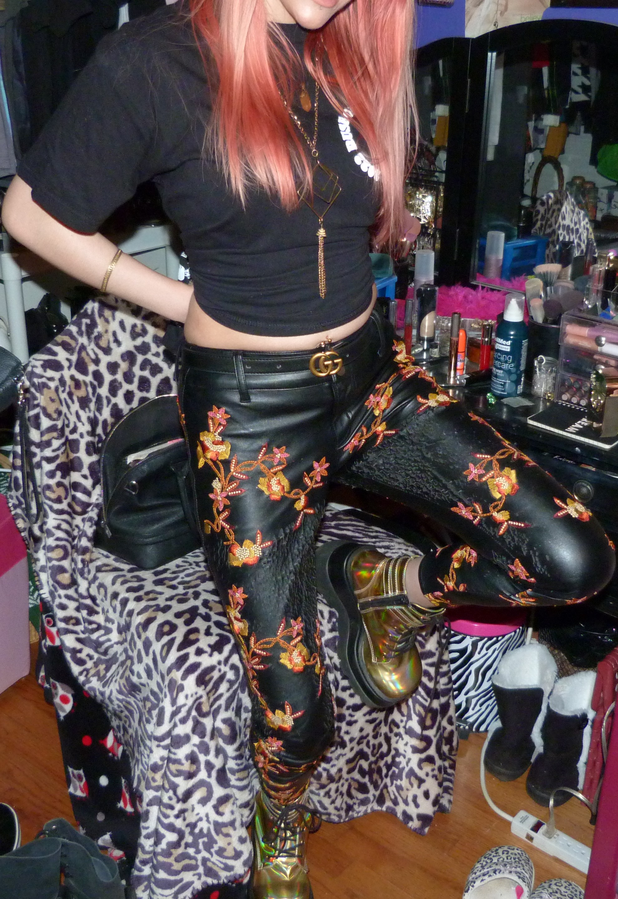 - Orange & yellow embroidered black faux leather pants in size XXS from Nasty Gal that I got in like 2016 or something. I also wore the pants for a photoshoot & blog post I did in 2018 called Snowblind!