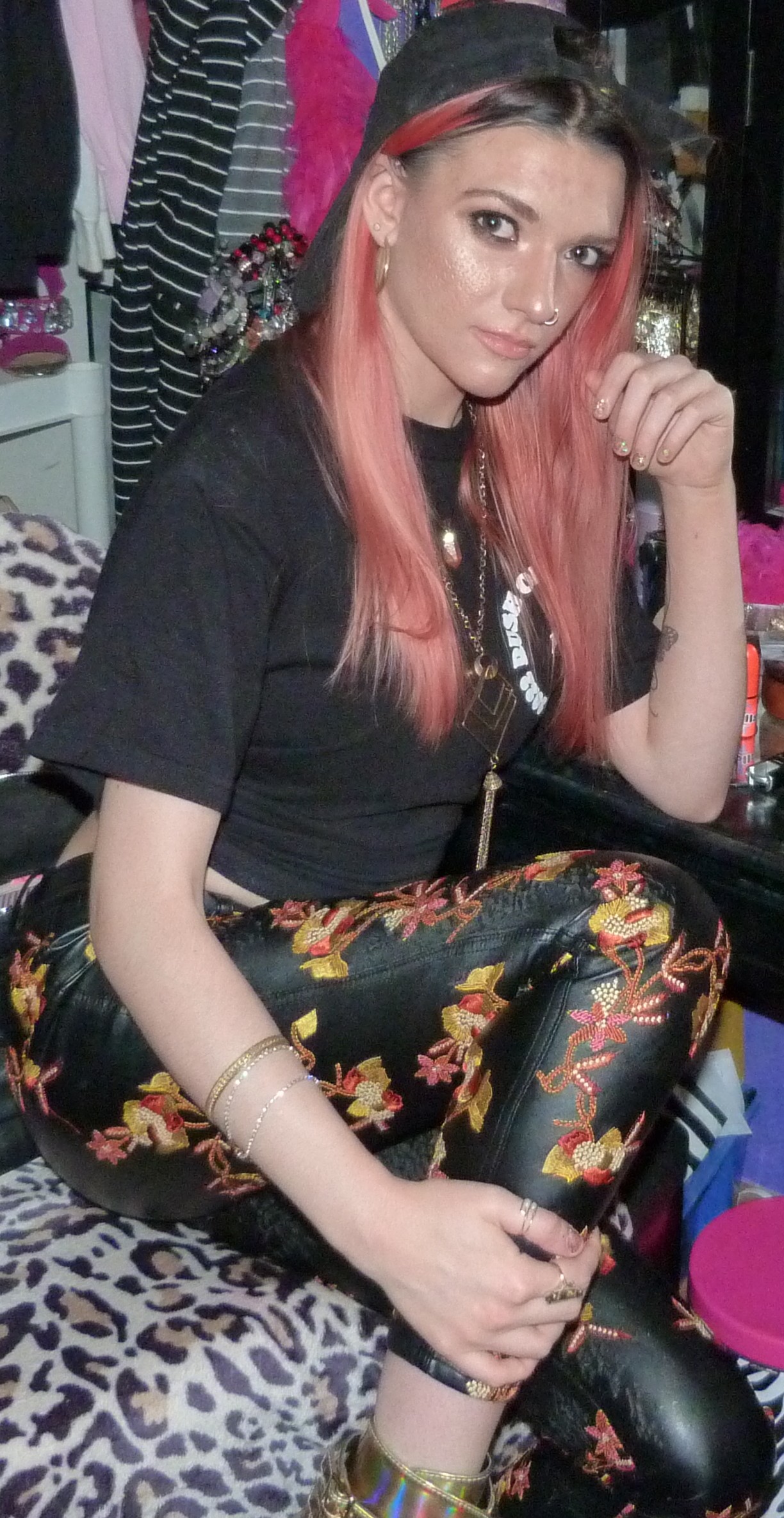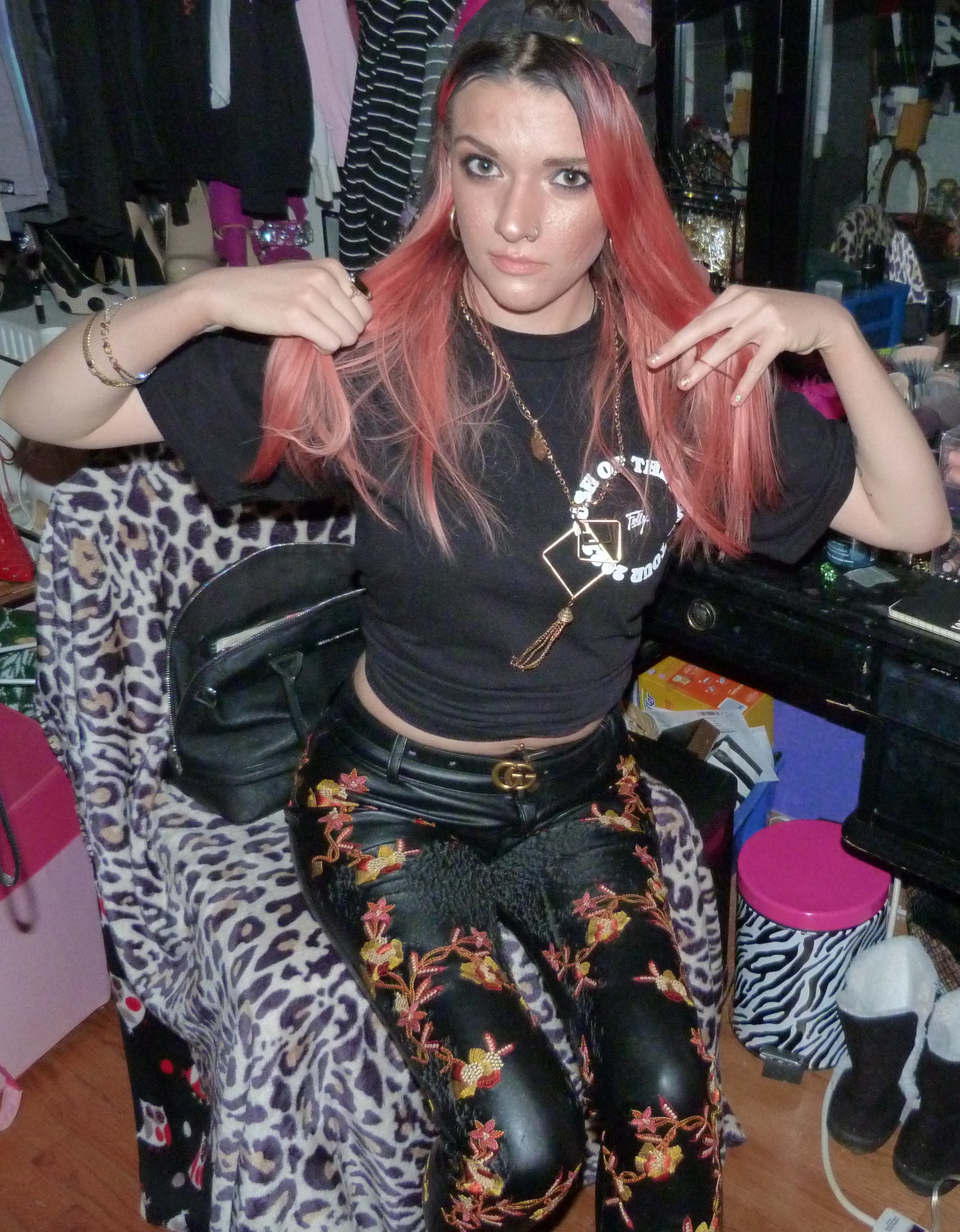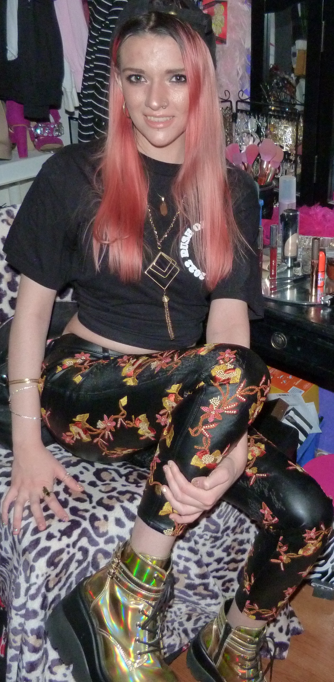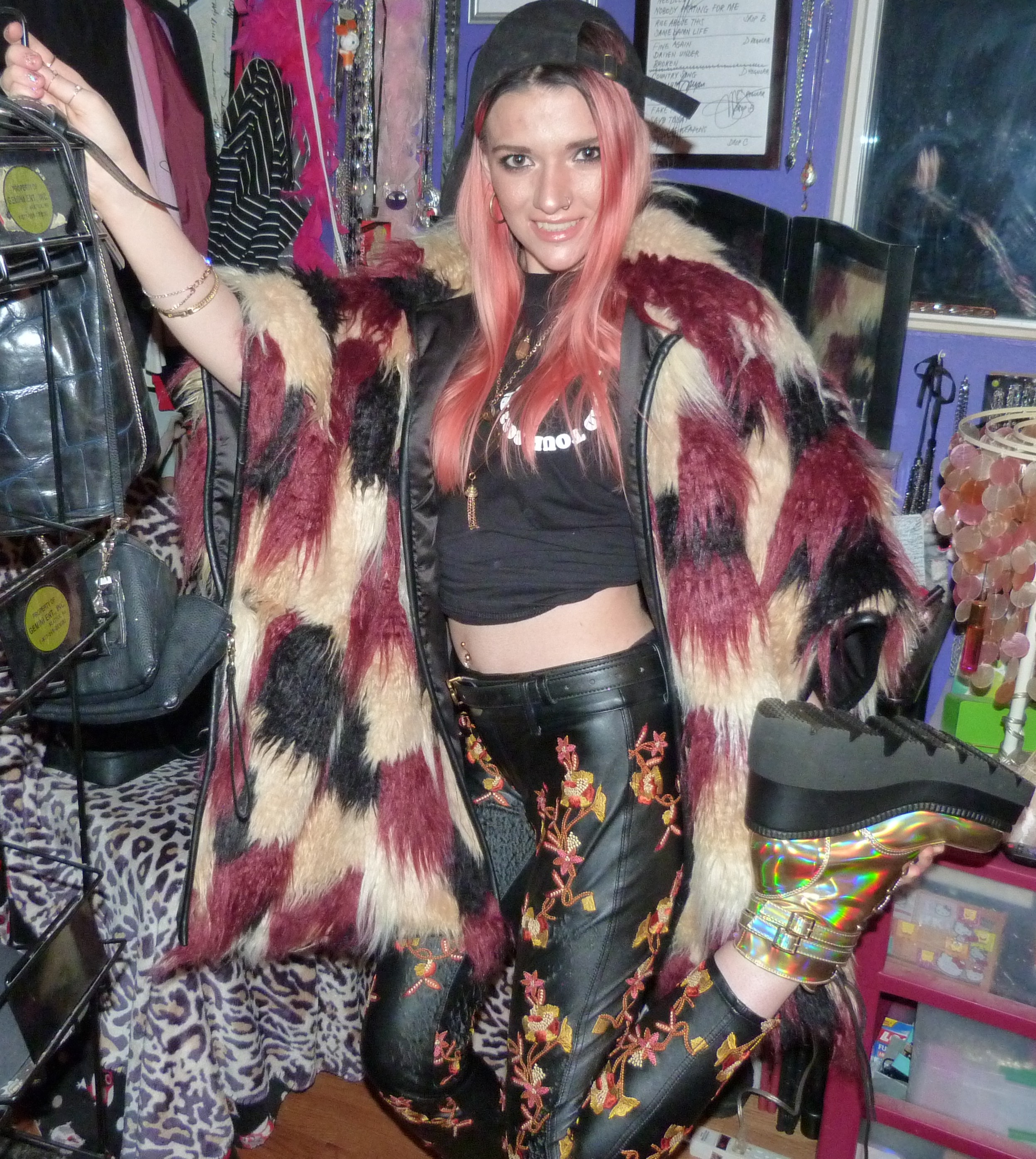 - Orange & yellow embroidered black faux leather pants in size XXS from Nasty Gal that I got in like 2016 or something. I also wore the pants for a photoshoot & blog post I did in 2018 called Snowblind!