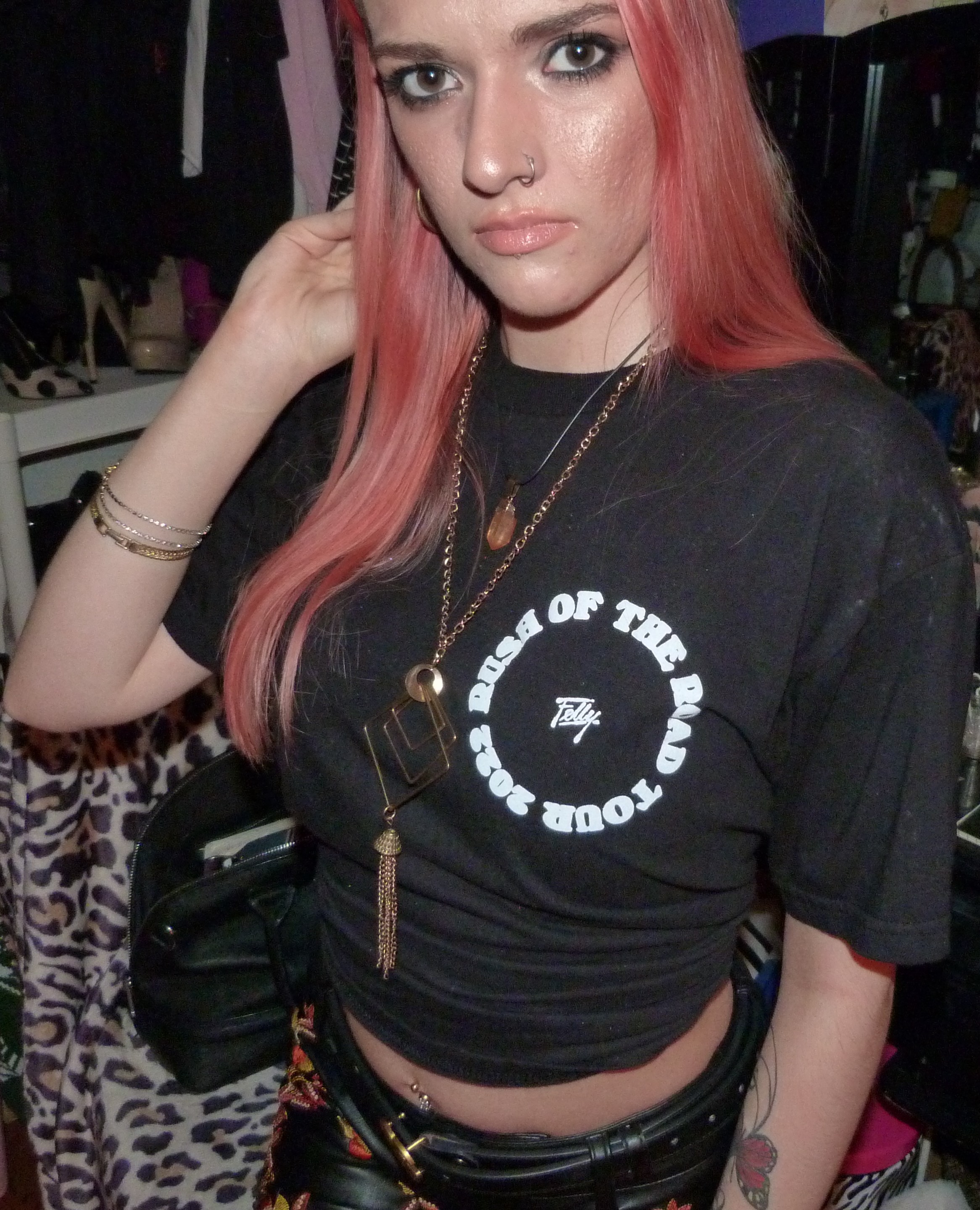I’m so excited that I got this belt for my birthday, that was a good idea of something to get me for this year! My birthday was on the 15th and I’ve already worn it like 2-3 times since then and I love it. Plus, this outfit was a pretty good idea as well, I’m glad about how it turned out. These pants I’ve had since like 2016 or something, but I have only shot them basically one other time that I’ll mention later in the post, so I’m glad I was able to shoot them again this year! That was perfect anyway because I want to do some good outfits cycling through my pants, because I cycle through all of what I have like that. I just can’t believe I’ve only worn them in like one other post, that’s crazy. They looked awesome with this outfit though. I’m also, again, super glad I was able to get this Felly shirt in the post too. He was amazing live in February, and it was awesome getting to meet him! I brought a CD for him to sign as well, so I got that, the shirt, a poster & the VIP pass all signed by him and he used my Sharpie. Plus I even told him my name was Abby and he said he had a song named Abby and showed us a snippet of it! We were all on the stage jamming to whatever he wanted to show us, some other unreleased songs and stuff like that too. So that was totally cool, I loved this whole experience! Let’s get into the shoot.