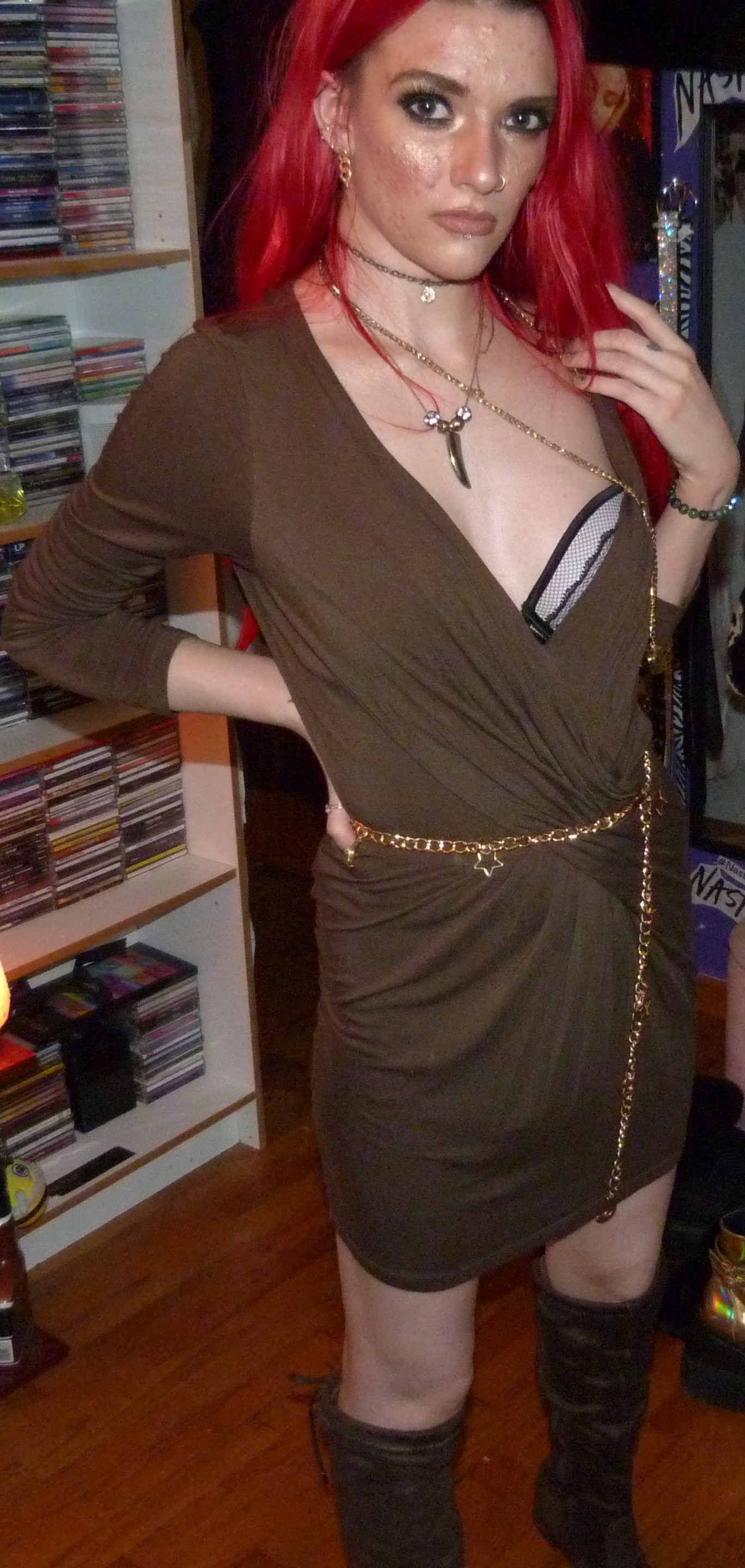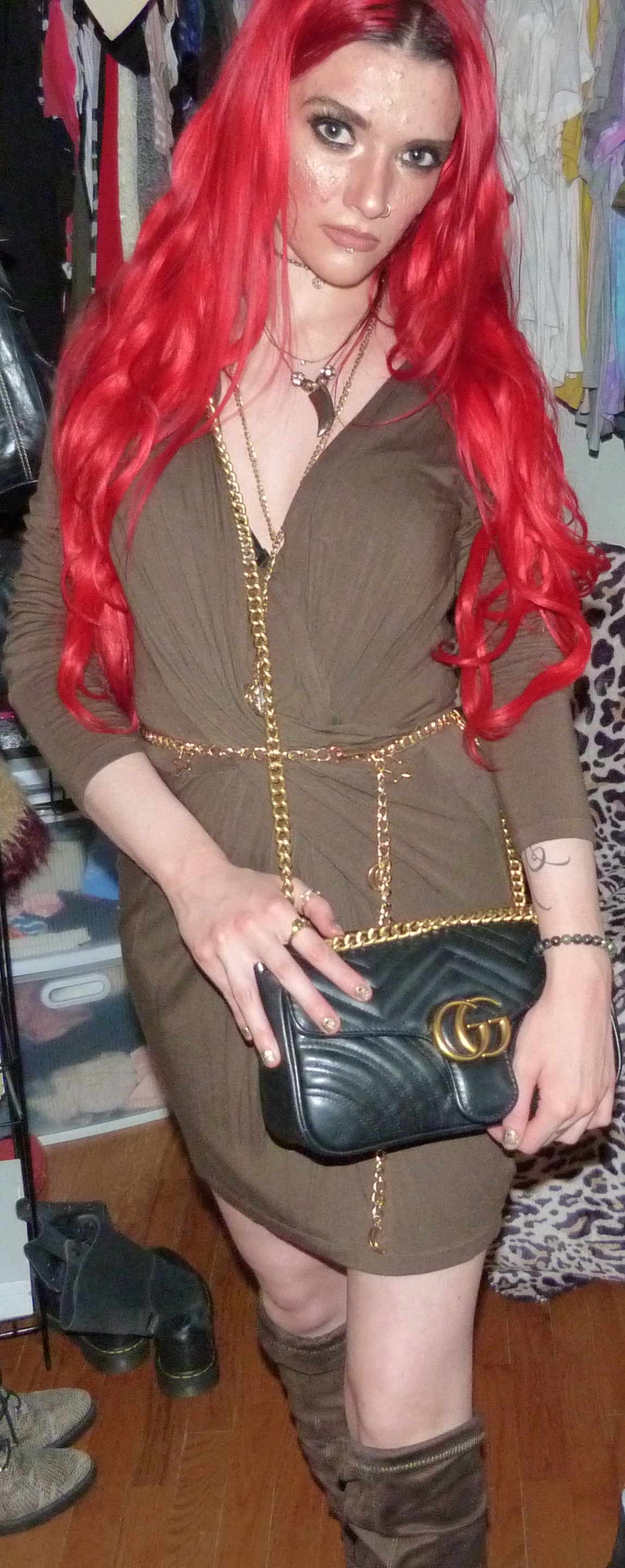 Good evening everyone, welcome to my blog & post! Today I have a pretty cool photoshoot to post again, with another cool dress that I hadn’t shot yet. I’ve been loving doing dresses this year, I’ve gotten back into them a bunch since I’ve been wearing them to the club all the time these days. I love catching up on shooting them, too, because I want to shoot all my dresses eventually! I’ve shot a bunch of them so far, but I still have a bunch more to get around to. Today’s post is this really pretty green dress that I have, long sleeves, that I got from StitchFix back in 2017. I was totally excited about this dress in the photoshoot, doing this shoot for St. Patrick’s Day, but the dress turned out looking like this sage color – kind of brown instead of green! I thought that was crazy honestly, because this dress is legitimately green. But I guess you’ll just have to trust me how green it is with how it showed up in the photoshoots! Anyway, this is my second all-gold photoshoot with all my new gold jewelry put into my face, so I named this the part two of a post I did last year, that I named Pot of Gold. So this is number two, because this is still my St. Patrick’s Day post for 2023 despite how the color showed up in the pictures. Green enough, right? I think it works well enough. My nail polish is at least a perfect green & gold color, you might not be able to tell but all of it was the perfect green for this. I love this outfit so much, it looks perfect with the gold jewelry. Let’s get into the rest of the photoshoot finally, I love how the picture below turned out too! It looks amazing, I love it so much.