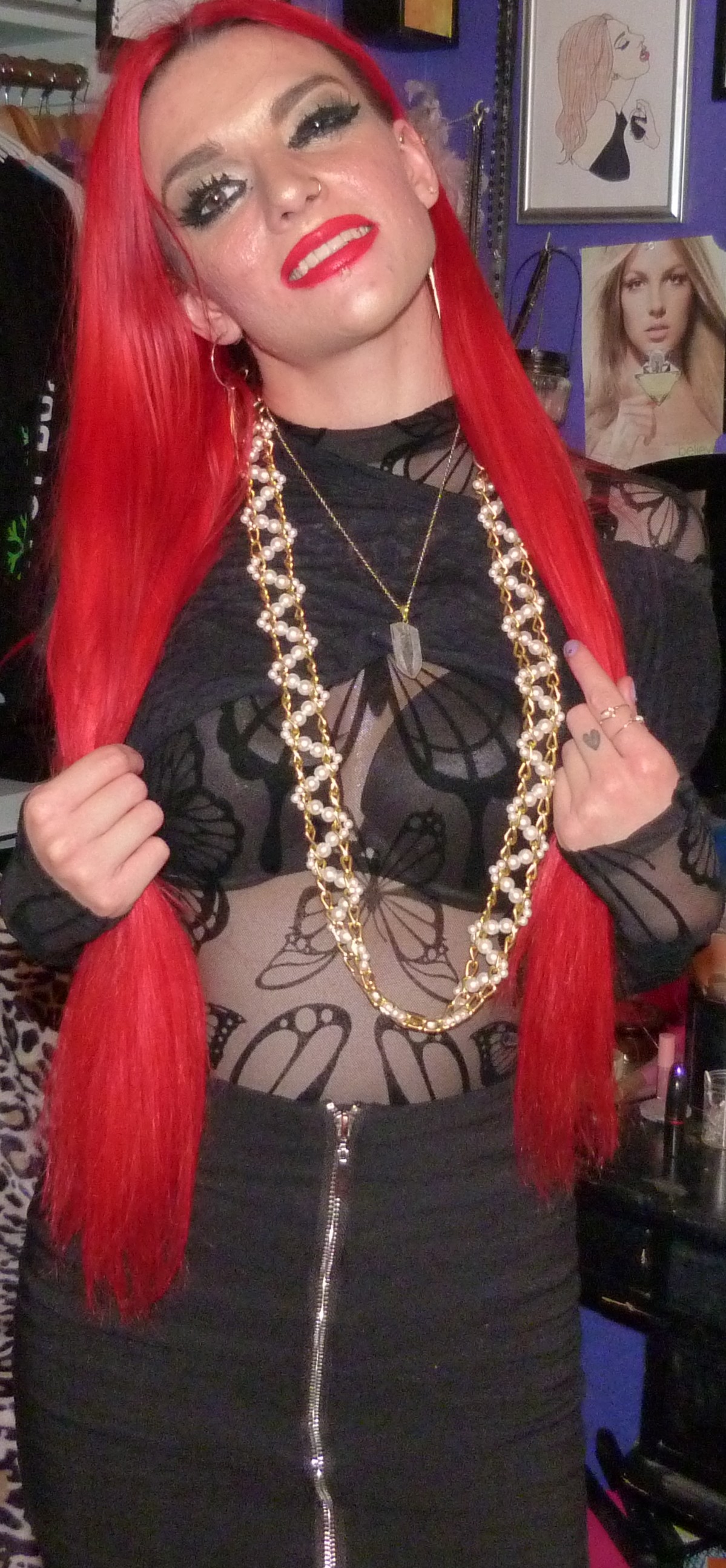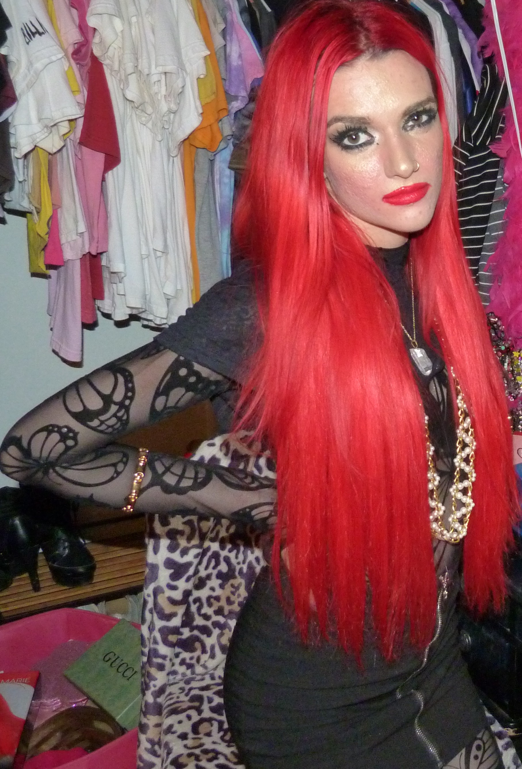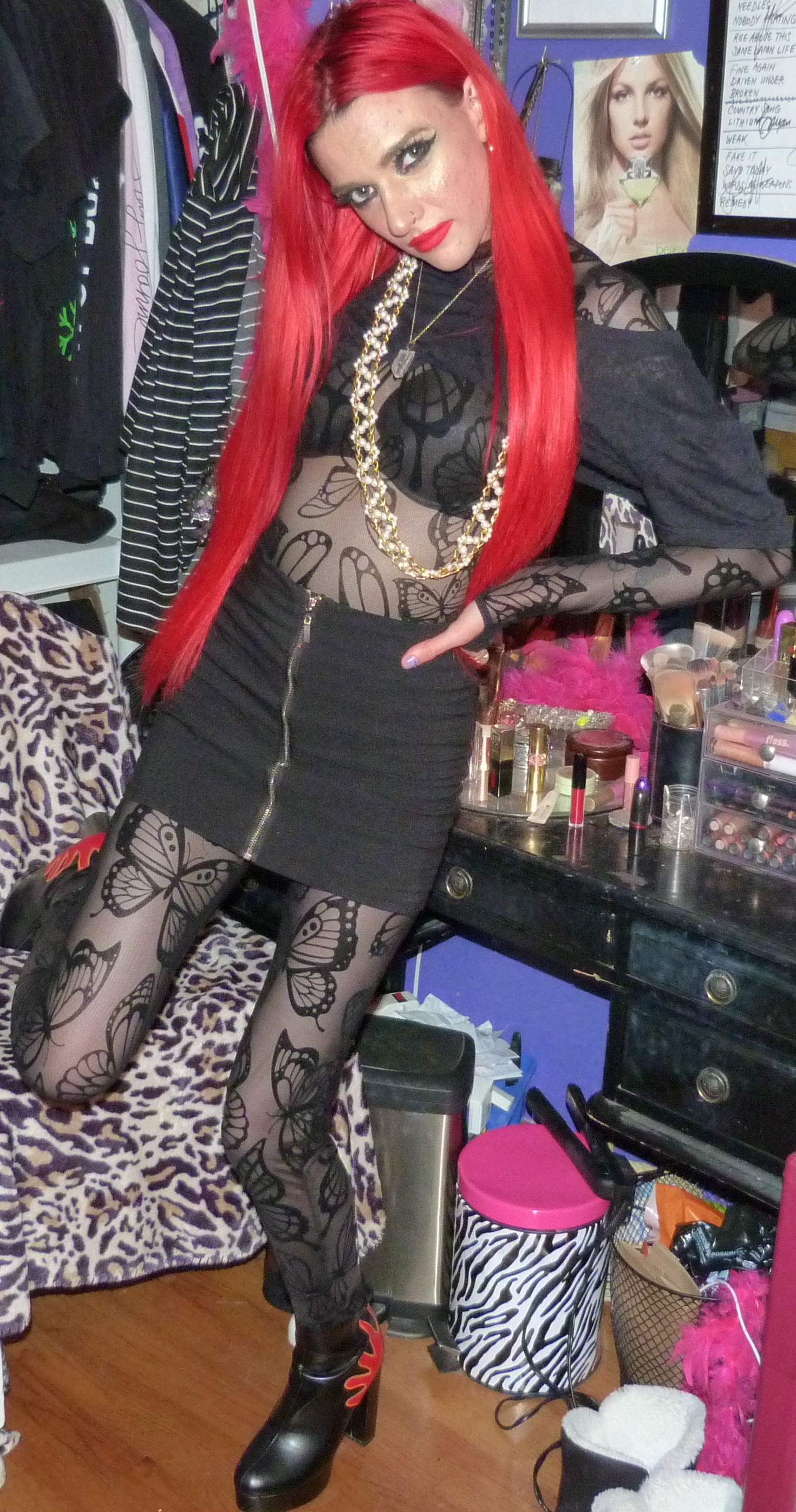 This photoshoot was this cool dark-er one to do, like I mentioned, right after my last post FLOWERS? I did last month, which was a pretty white shirt outfit that I wear as a dress like that. That was to end August after I did a bunch of different darker outfits right before that, which was pretty cool. I liked transitioning into that lighter, prettier shoot right after those. After all that, I decided to do this one, which is like the opposite of that white one, this dark all-black catsuit outfit with the red hair to start off September. We’ll see what I end up doing after this one, but I loved the contrast that I did for all of these photoshoots. Another photoshoot I did that was kind of similar to this one too & this is kind of inspired by that one, GEMINI (SEASON) that I did in June which also included a crop top cut to kind of show my bra too but like a white version of this outfit! I loved how I did all-white for that one with the black fishnets, that was perfect, & this outfit was a cool one to supplement that one in the end too so they kind of go together, those 2 & 3 shoots that I mentioned. It was cool how I did all of these, I’m excited to see what I’m going to do next too! Probably another shoot in my series of sorts, it definitely will be. I always love linking together my photoshoots like that & having them relate to each other in different ways, it’s so cool. Let’s get into ‘BUTTERFLY UTOPIA’ finally, I thought that was a pretty cool name for the catsuit too! It’s by the brand Club Exx which I got from Dolls Kill like I said, last month. Also, check out the outfit for the other thing I have from that brand, in the blog post Genie Atrapado!