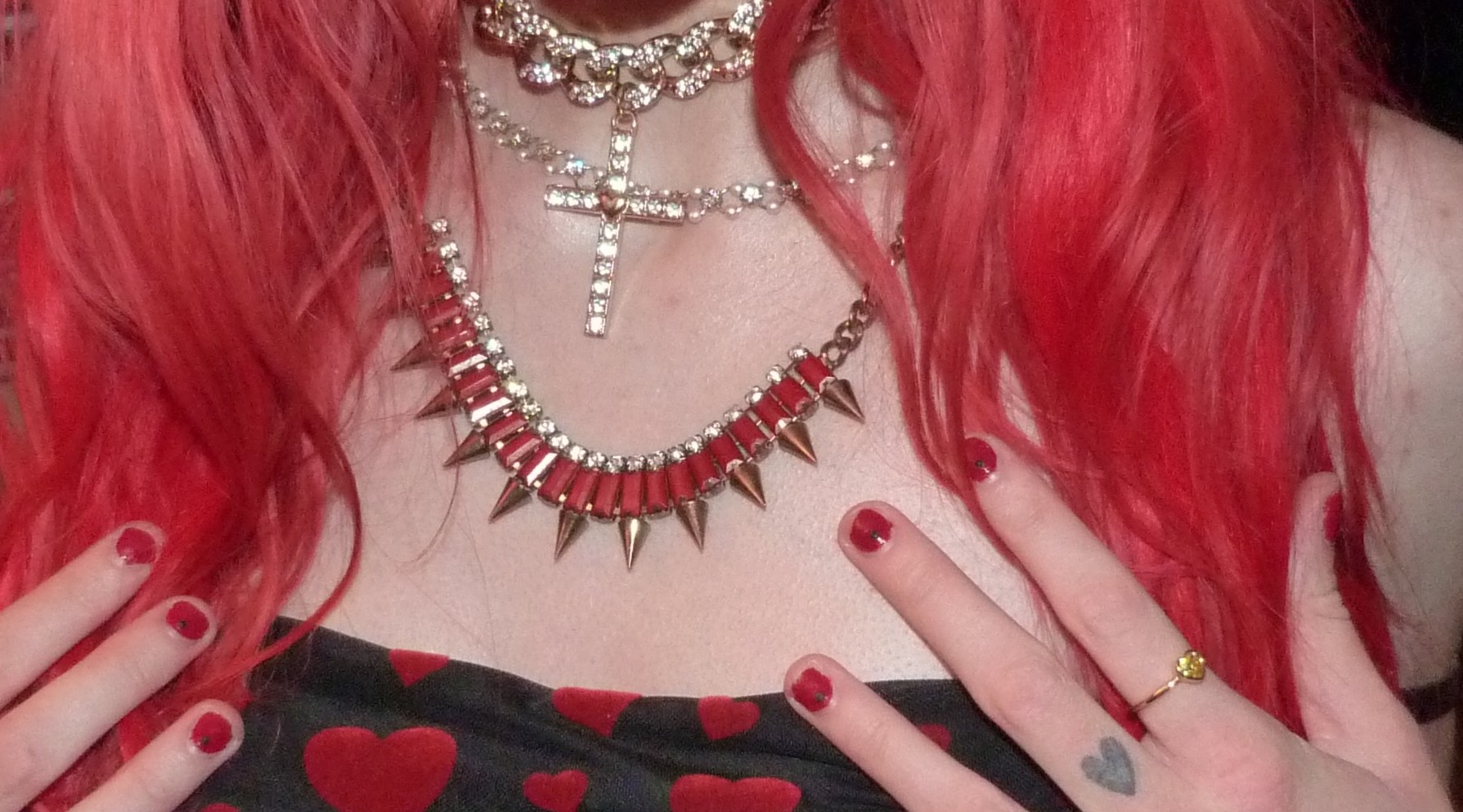This was such a cool photoshoot to do this time, I loved that I did it mostly on my bed again, but also with some pictures on the other side of my room too. I even finally remembered to include my Xtina iPhone case in some of the pictures of this photoshoot, I’ve had this case for a while but I finally got it in a photoshoot! This is like my favorite iPhone case ever right now as well, it’s this cool black & white Christina Aguilera picture from 2018 that I wrote XTINA on, for my new iPhone 11 Pro I got earlier in the year. I might’ve even gotten a chip in the corner of the case by now, but I still had to get it into the photoshoot! You can also check out my Xtina iPhone Case blog post too, on my Celebrity Merch Base blog for actual better pictures of the case, like by itself & everything also. The other thing I wanted to mention is how cool this gold cross choker was in this photoshoot, I again really loved that I was able to get the three gold chokers with the three new club dresses that I got from Dolls Kill! This one is the cross one, but I loved the other two a lot as well! This gold chain choker is really pretty & sparkly, it’s gold with the sparkly cross & a heart in the center of it which I really love. It’s really perfect for me, I love all these chokers so much. Here’s one more picture of the choker below, including my pretty new gold yellow heart ring, my amazing heart tattoo I got in January, with the red hair & everything too! My nails were also cute there, I did them a red nail polish color this time with black gems at the base of each nail. I’m so happy about how this photoshoot turned out & I’ll see you next time too! Thanks so much for checking this one out of course & I’m really happy about where I’ve finally gotten to now.