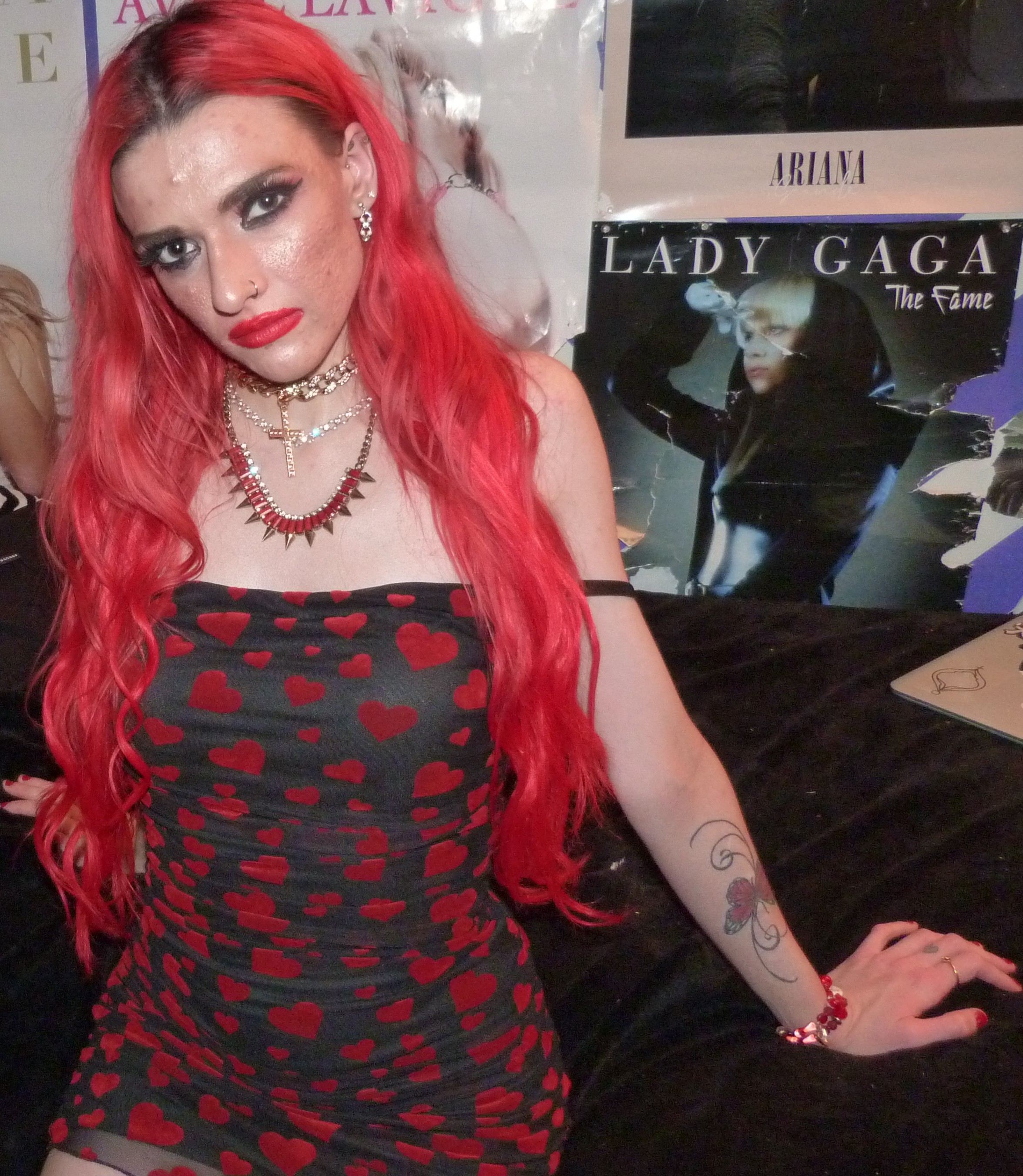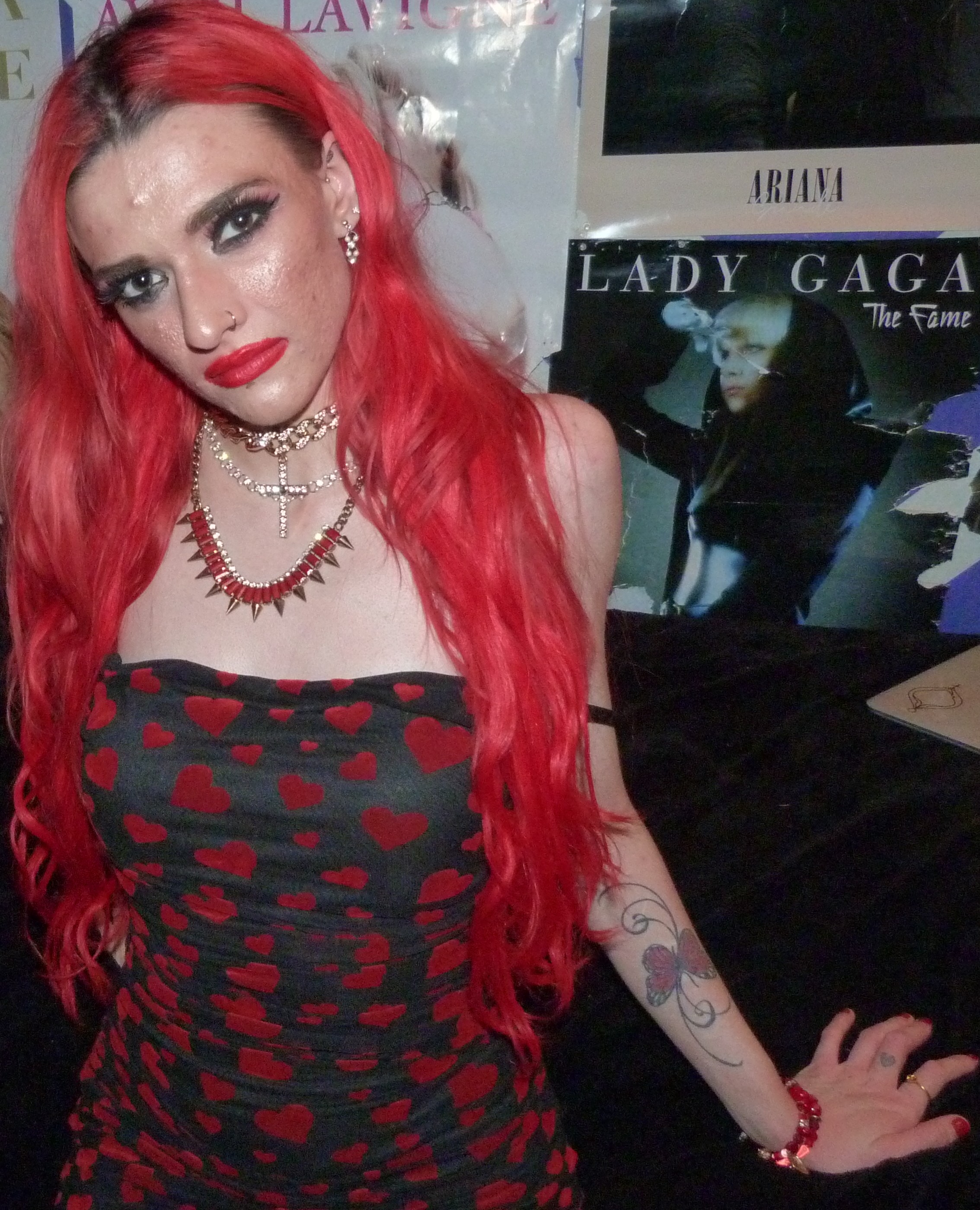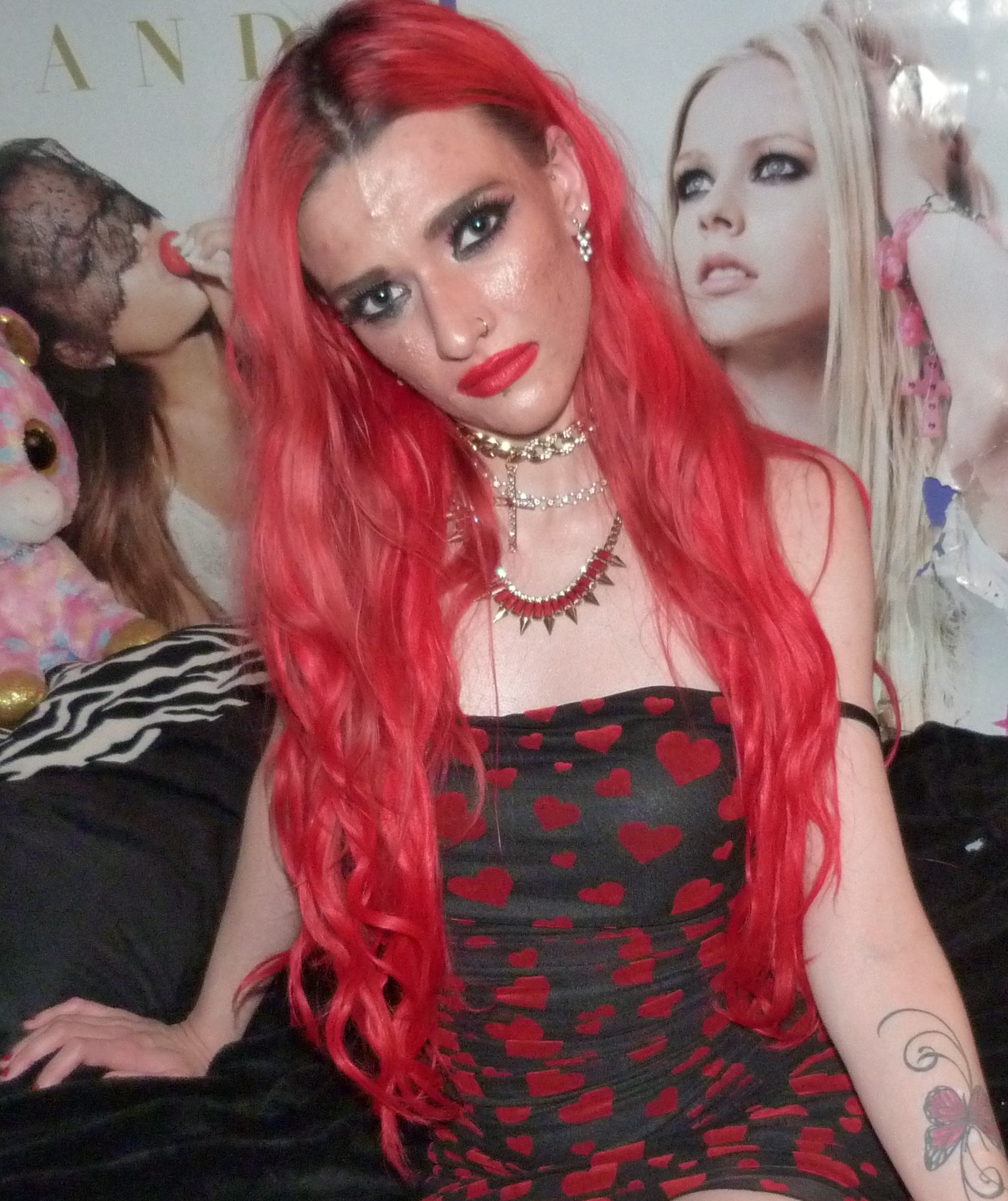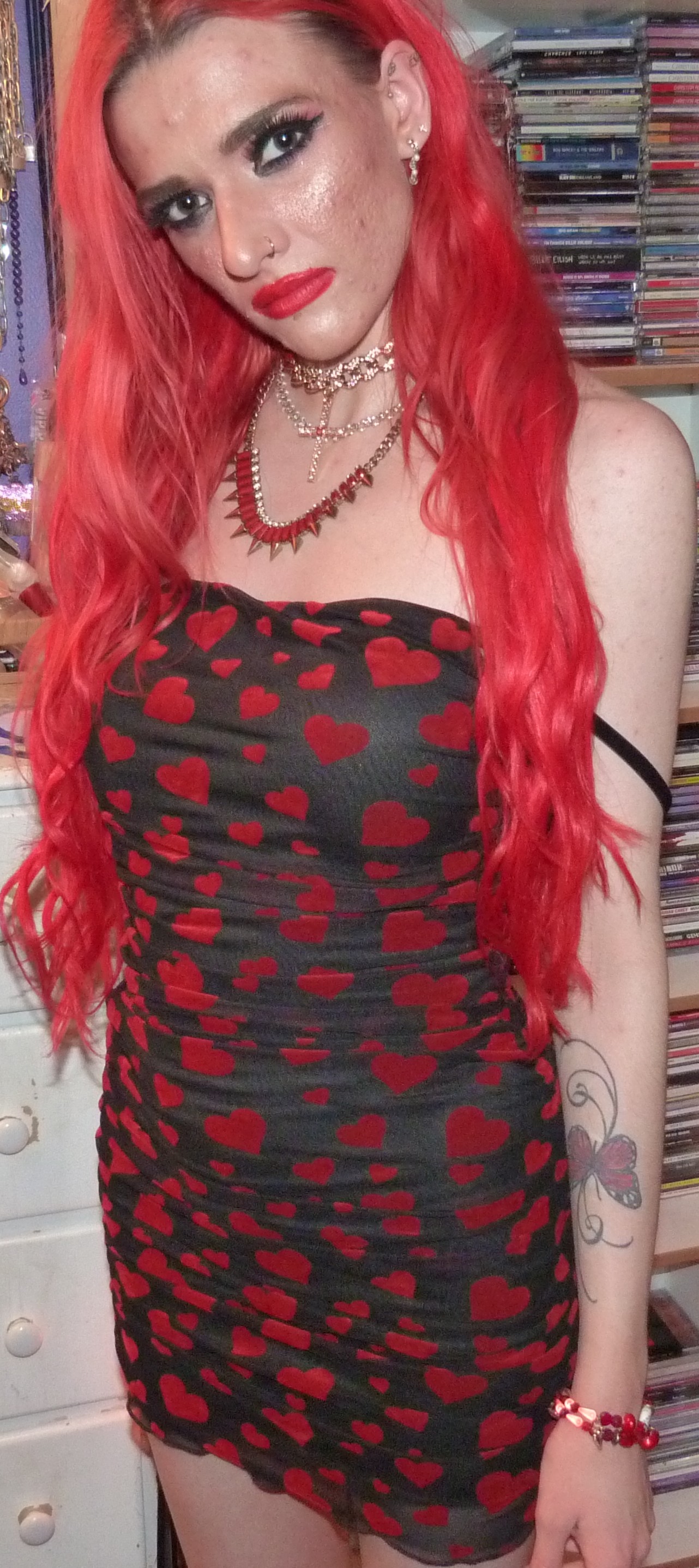 I love that I’ve been doing red & black themes for my last three blog posts, including this one! The last two outfits I did before this were all-black with my bright red hair, which were really cool. This one is the one with the actual red & black dress, it’s so perfect with the red hearts & everything! Before this was an all-black faux leather outfit I did called SPARKLE & FADE. with this old black shirt of mine & faux leather pants, with the bright red hair of course, which was really cool also. The other one I did, right before that was also an all-black outfit of mine that I did, with the bright red hair & everything too called ‘BUTTERFLY UTOPIA’ with a black catsuit that I loved. Those two outfits turned out pretty awesome, I love that I’ve been doing these darker outfits after dying my hair again. My hair was really light before those, but I’m finally going to keep my hair red again for a while now! I’m super happy I did this photoshoot though, because this dress was perfect for my blog this time. I especially love the Kesha lipstick, Raising Hell, with this look also. I’ve been meaning to wear it again for a photoshoot, this lipstick is amazing & I really love Kesha a lot! I’m glad I have this one, I’ve been wearing it more lately too. I just think this look ended up perfect this time & I’m really glad it came together like this!