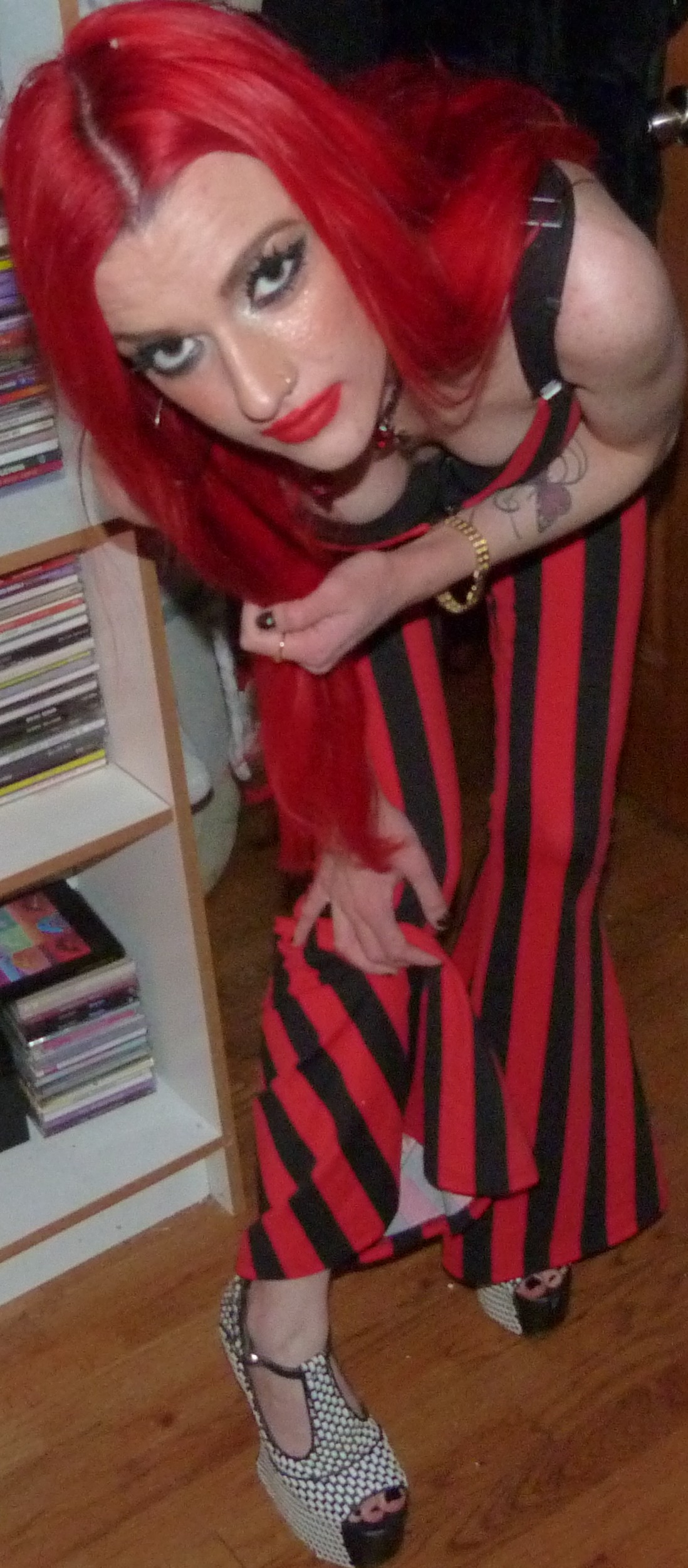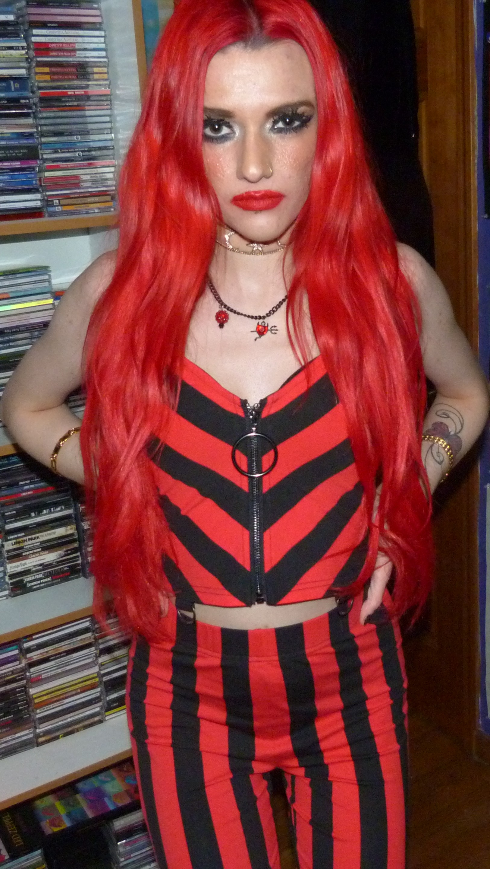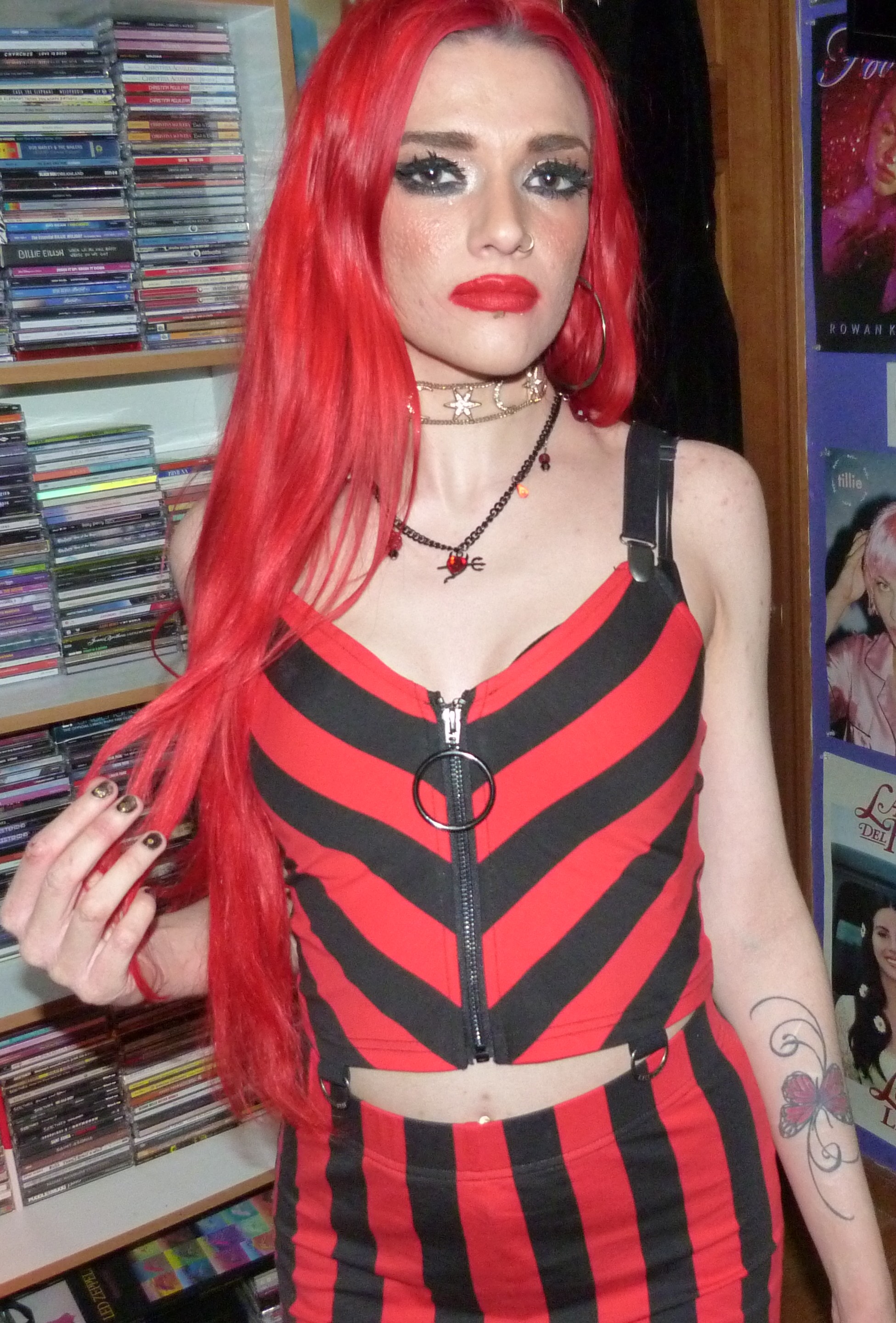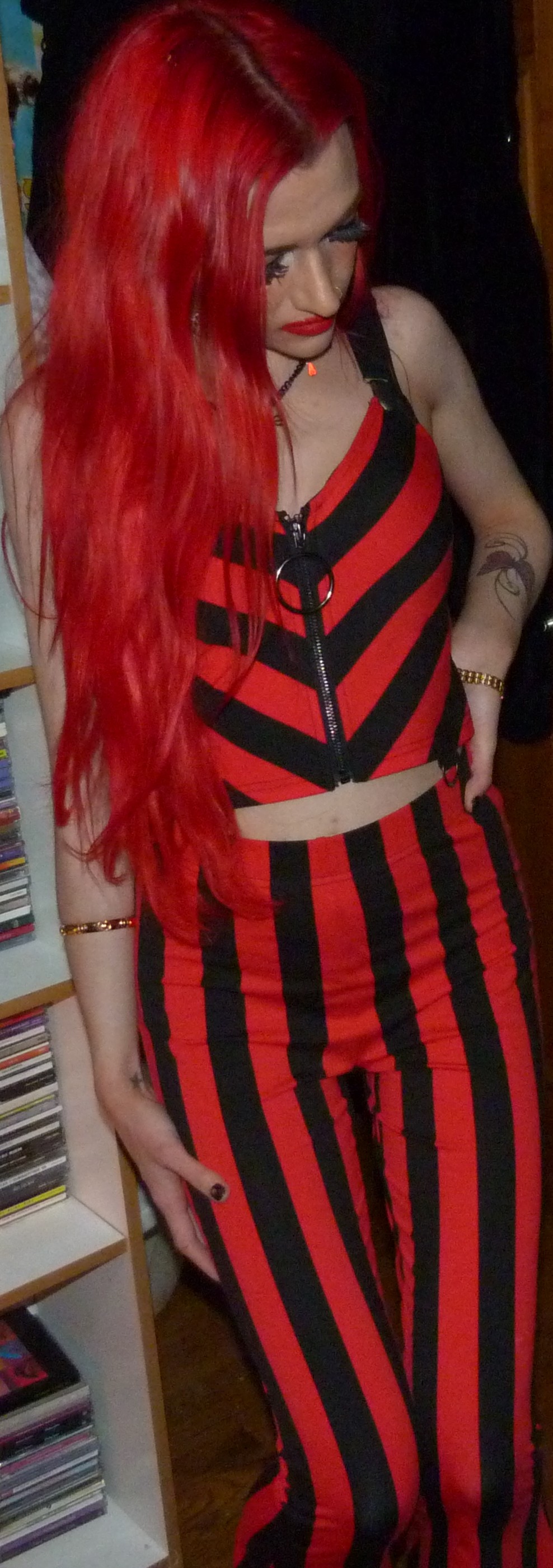 Another awesome outfit that I did with more from my recent Killstar x Avril Lavigne collection order. I did a different one last month but was excited to do this one, next! This outfit is made of two pieces of clothing from Avril’s third drop of clothes with Killstar, including this red & black striped chevron top called the Setlist Top as well as the red & black striped pants called Olley Flares I put together. It made a really cute outfit, I liked these two together, they’re awesome! These are the only two things I got from Avril’s third drop of clothes which was all like red & black clothes which are cool, but I got a bunch of clothes from her collections last time. I love that Avril did these collections for Killstar a lot, they’re really super awesome! All three drops happened last year which was cool. The first outfit I did with something from her collection was my Killstar (24th Birthday) post I did last November with the plaid dress from her second drop which was cool also. It’s going to be my 25th next week too which is awesome, I’m excited about that! The second Killstar post I ended up doing was with the pink dress from her first drop that I did last month, called KILLSTAR X AVRIL #2 which was two posts ago! I’m excited to finally do this one too, I’ve finally done at least one outfit from each of her drops from her collections! I have basically like two outfits left to do of Avril clothes I got last month but I’ll do those ones like maybe next month or in a couple months. I love everything I got a lot, I’m excited about this outfit as well because it looked really good with my red hair & lipstick this time! These were two cute pieces of clothing, I’m glad they looked this good together because they definitely looked like they go together. I love Avril Lavigne a lot & I’ve always really loved all her different clothing collections too! This outfit is a really good one, I’m glad I did this one next for November. I’m excited for this month!