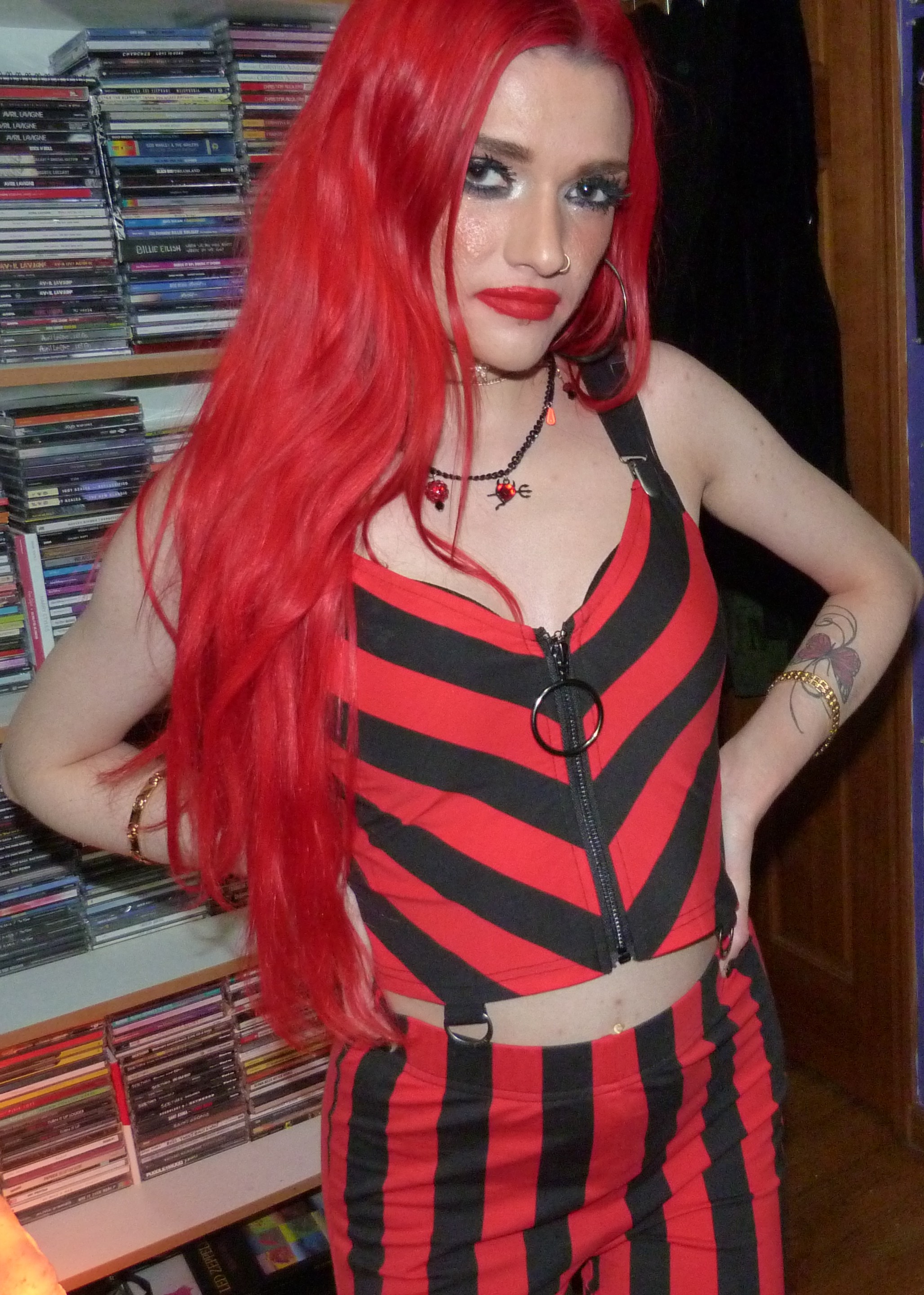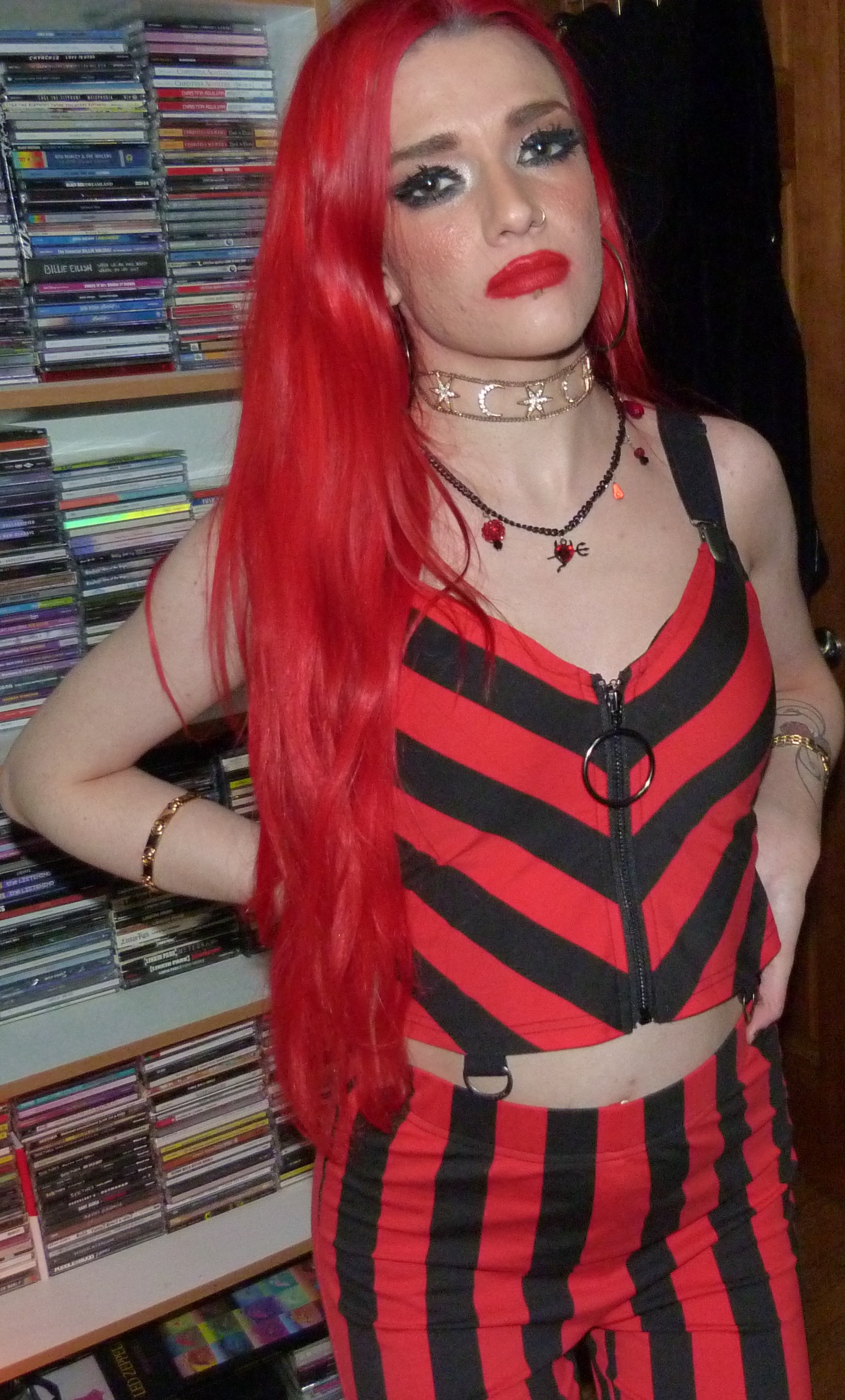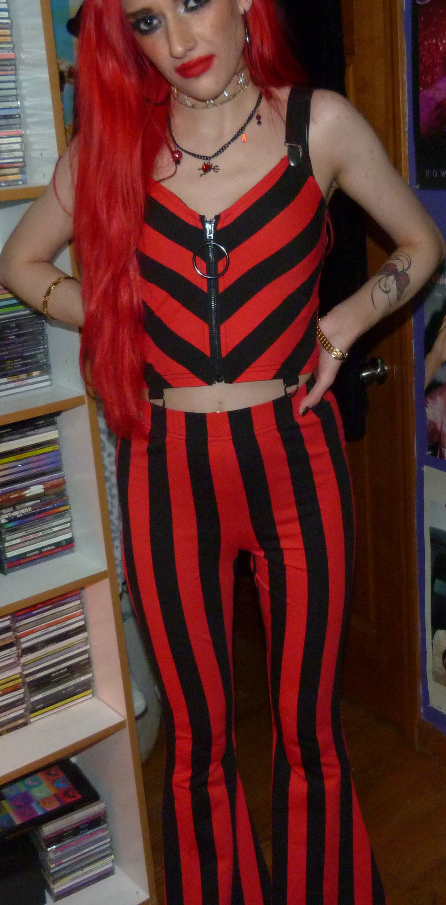 I loved this outfit, it’s so cute on me. I liked the all-red & black but mostly red, that was pretty cool. I even wore that cool red & black heart necklace of mine with it which was cool, that heart charm used to be this cool devil heart belly ring of mine. I put it on this necklace because I couldn’t get rid of it, it is super cute! My stepmom made it into this cool necklace for me. That necklace is mostly black & red but the rest of my jewelry of course was all gold pretty much, like I’ve been wearing for over half of a year. There is a little bit of silver like on the links of that black & red necklace too, but I like never mix gold & silver these days because I always always wear just gold with the rest of my body jewelry! But I had to include that necklace finally because that was so cool with the rest of the outfit, mostly the fact that it was a black metal. The hoop earrings were a gunmetal color though also, which went with the outfit too of course but it was cool to use those black-toned pieces of jewelry with my outfit this time. I love wearing all gold these days still too though but once in a while I throw in something with a little silver on it, but that’s just lately! Usually it’s always just only my gold jewelry, but who knows for how much longer. This was a pretty cool look on me though too, I liked the fun bright red almost circus-y vibes of the pants & top. Avril’s Drop 3 with Killstar was a pretty good one, I love that I got these two pieces from it! It was a lot of bright red & stripes with some black pieces of clothing as well but I’m so glad I was able to get these the last time I ordered! It was about time that I got a ton of awesome stuff from Avril’s collections with them, that was really cool & everything was on sale on there recently too!