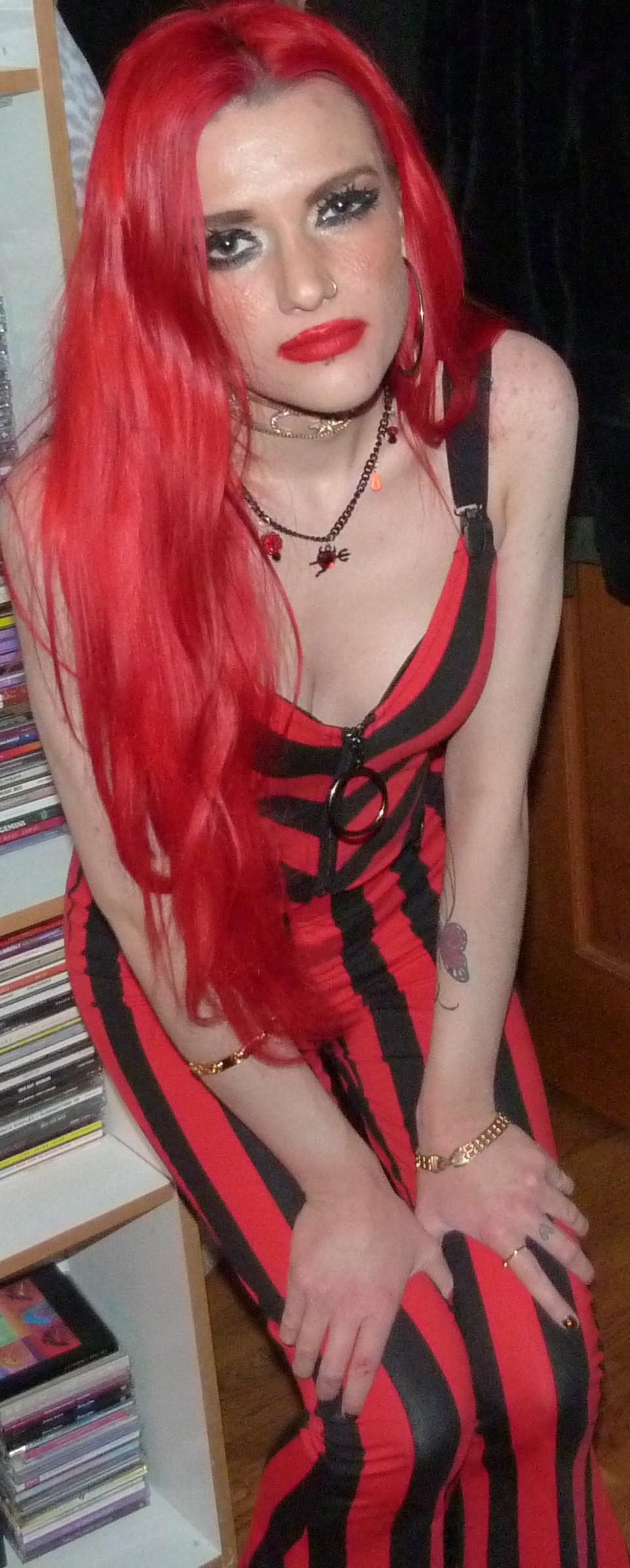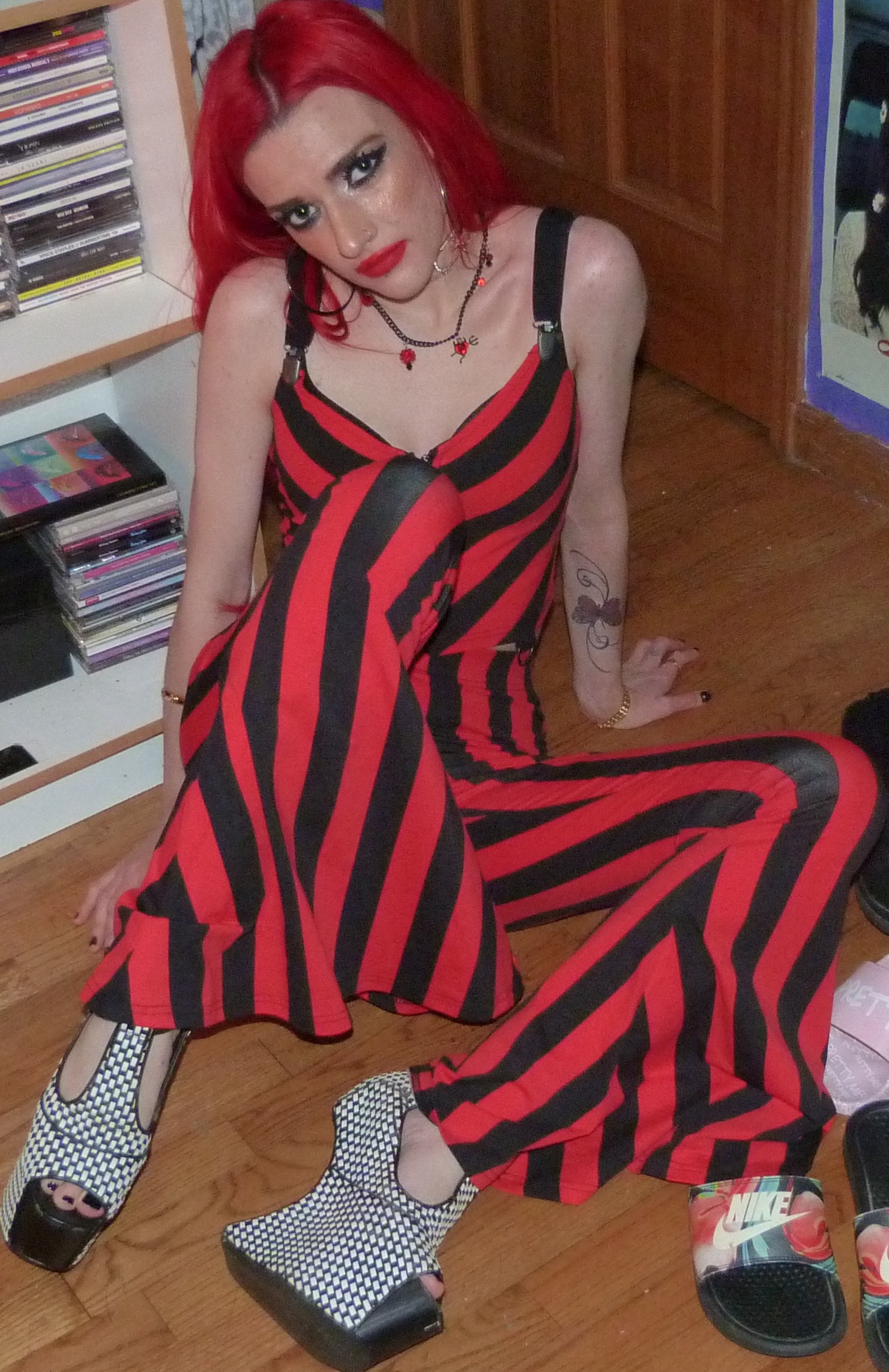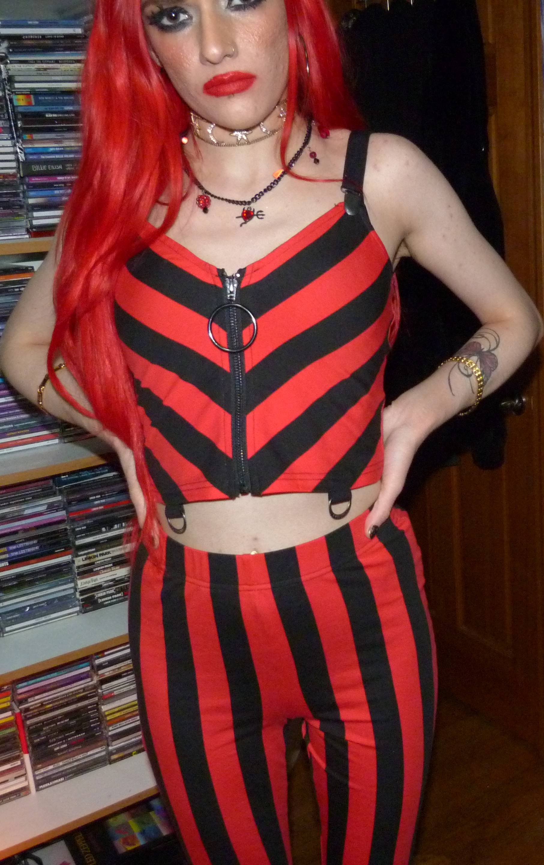 I loved this outfit, it’s so cute on me. I liked the all-red & black but mostly red, that was pretty cool. I even wore that cool red & black heart necklace of mine with it which was cool, that heart charm used to be this cool devil heart belly ring of mine. I put it on this necklace because I couldn’t get rid of it, it is super cute! My stepmom made it into this cool necklace for me. That necklace is mostly black & red but the rest of my jewelry of course was all gold pretty much, like I’ve been wearing for over half of a year. There is a little bit of silver like on the links of that black & red necklace too, but I like never mix gold & silver these days because I always always wear just gold with the rest of my body jewelry! But I had to include that necklace finally because that was so cool with the rest of the outfit, mostly the fact that it was a black metal. The hoop earrings were a gunmetal color though also, which went with the outfit too of course but it was cool to use those black-toned pieces of jewelry with my outfit this time. I love wearing all gold these days still too though but once in a while I throw in something with a little silver on it, but that’s just lately! Usually it’s always just only my gold jewelry, but who knows for how much longer. This was a pretty cool look on me though too, I liked the fun bright red almost circus-y vibes of the pants & top. Avril’s Drop 3 with Killstar was a pretty good one, I love that I got these two pieces from it! It was a lot of bright red & stripes with some black pieces of clothing as well but I’m so glad I was able to get these the last time I ordered! It was about time that I got a ton of awesome stuff from Avril’s collections with them, that was really cool & everything was on sale on there recently too!