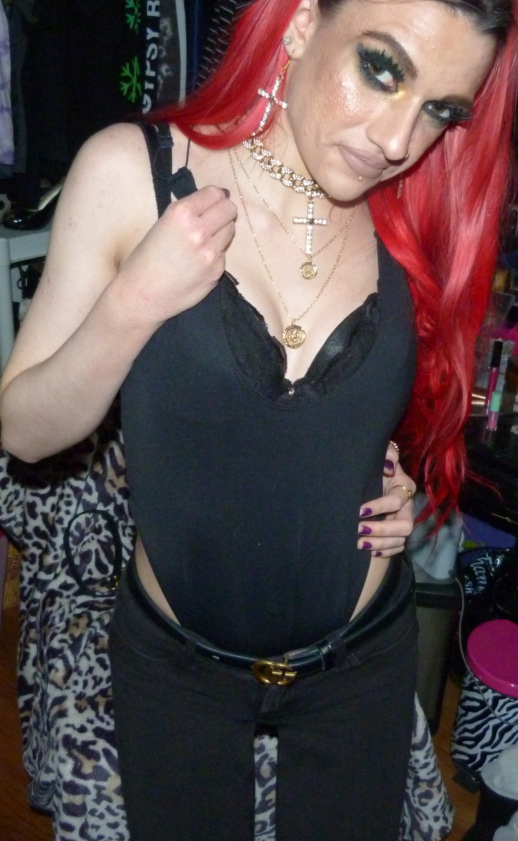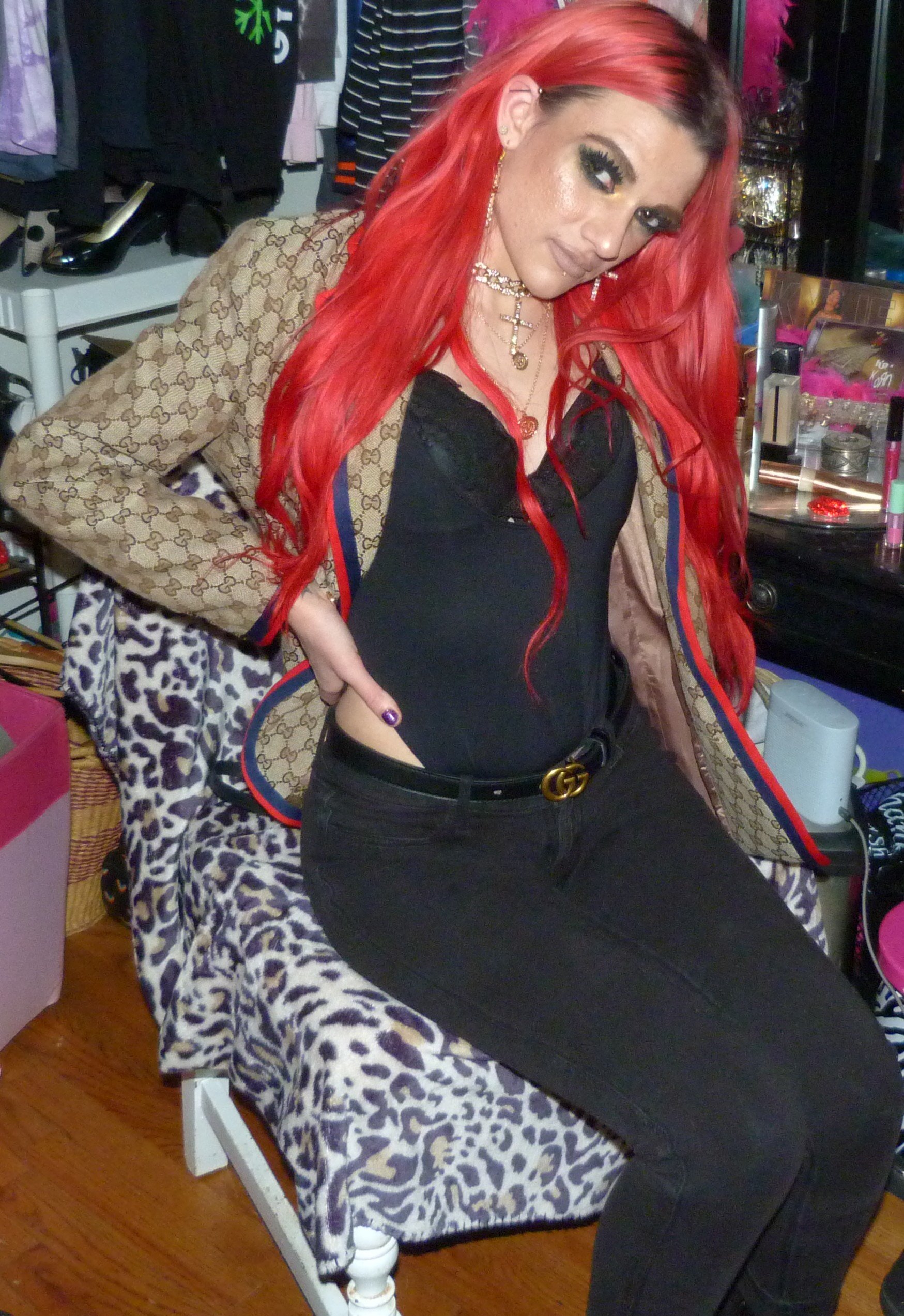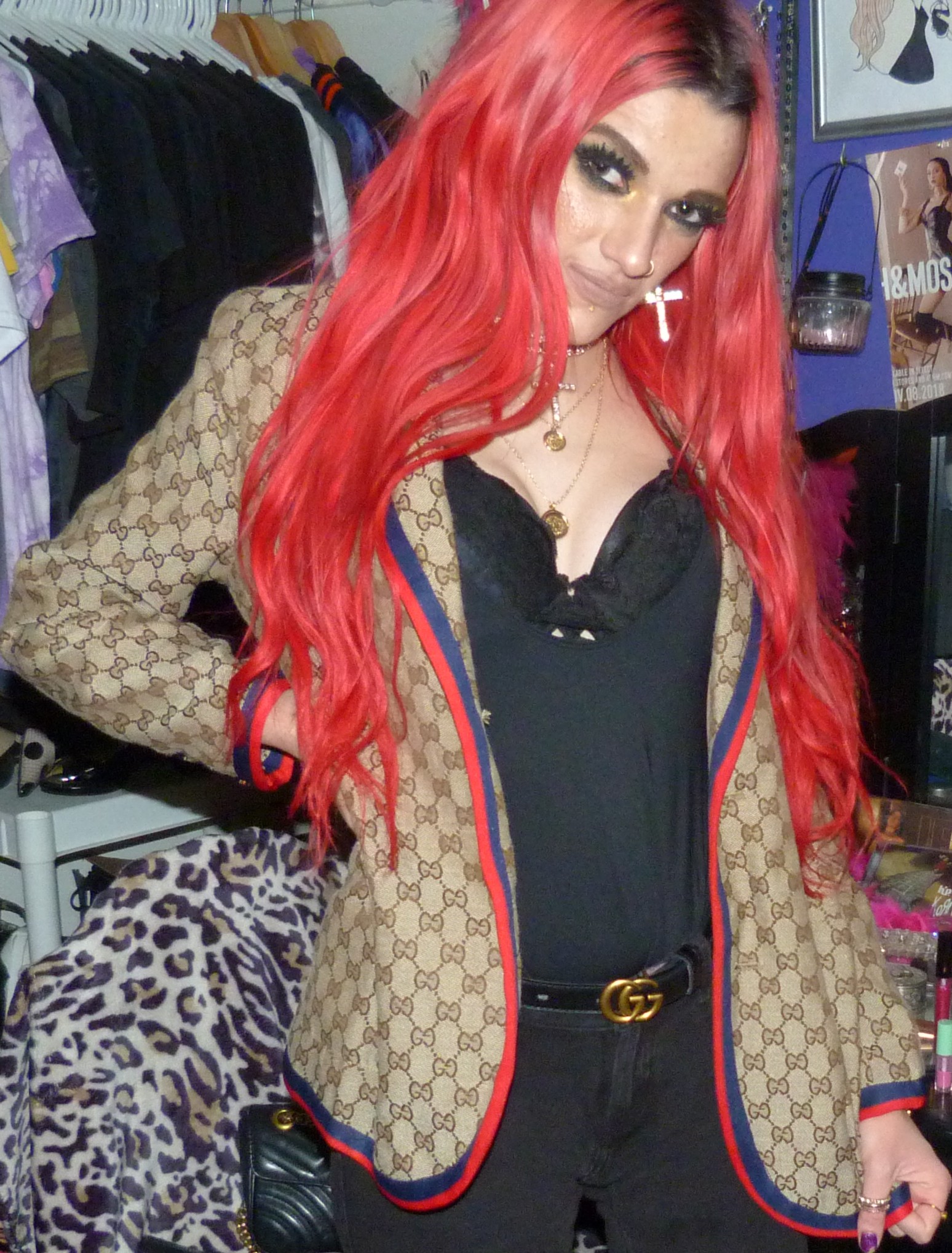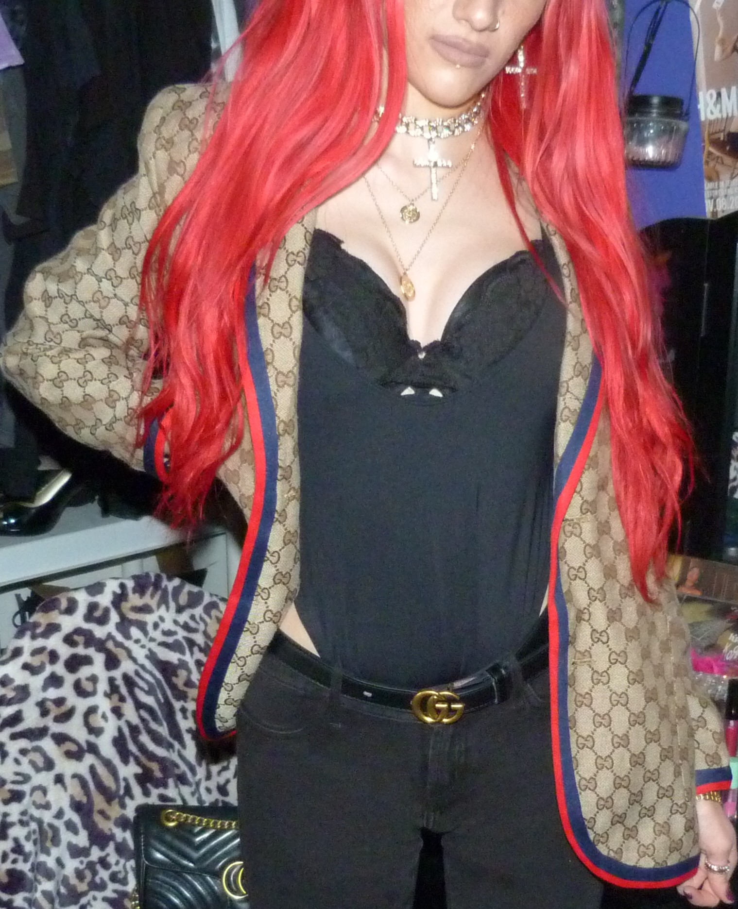 I loved that I did this new Gucci outfit & photoshoot, it’s a pretty awesome one! I wore this new Gucci jacket with this black Gucci belt of mine that I got in like 2o22, the Demi Lovato x Fabletics bodysuit I mentioned & the Dolls Kill cross choker & matching earrings too! I love that just I got more Gucci for Christmas though, I was excited to do a new Gucci post like this. I’ve also done two other posts so far that have Gucci in the title too, which is cool. I have other Gucci related posts too with my other belts & things that I have from Gucci, but the other two include one, my 2022 Gucci Gold post which is my original post for this belt! Then two, my first ever Gucci post with the Gucci bracelet that I got in 2016 called Gucci Guild too! I have like one more Gucci post after this one with another name like that that I could do for my next one like this, but for now I had to do this one next! This is a perfect one to have done, with the title & everything. I’m excited about this one too! I love Gucci so much, it’s my favorite high fashion brand. I have a bunch of different Gucci things too, you can check out all my other posts with my Gucci category! I’ve still been using my Gucci bag these days too, which is in the background of some of my photoshoots. Let’s get into the photoshoot finally, I did like a couple collages with this jacket & then a couple with just the bodysuit! It was a pretty good outfit, I liked how this turned out!