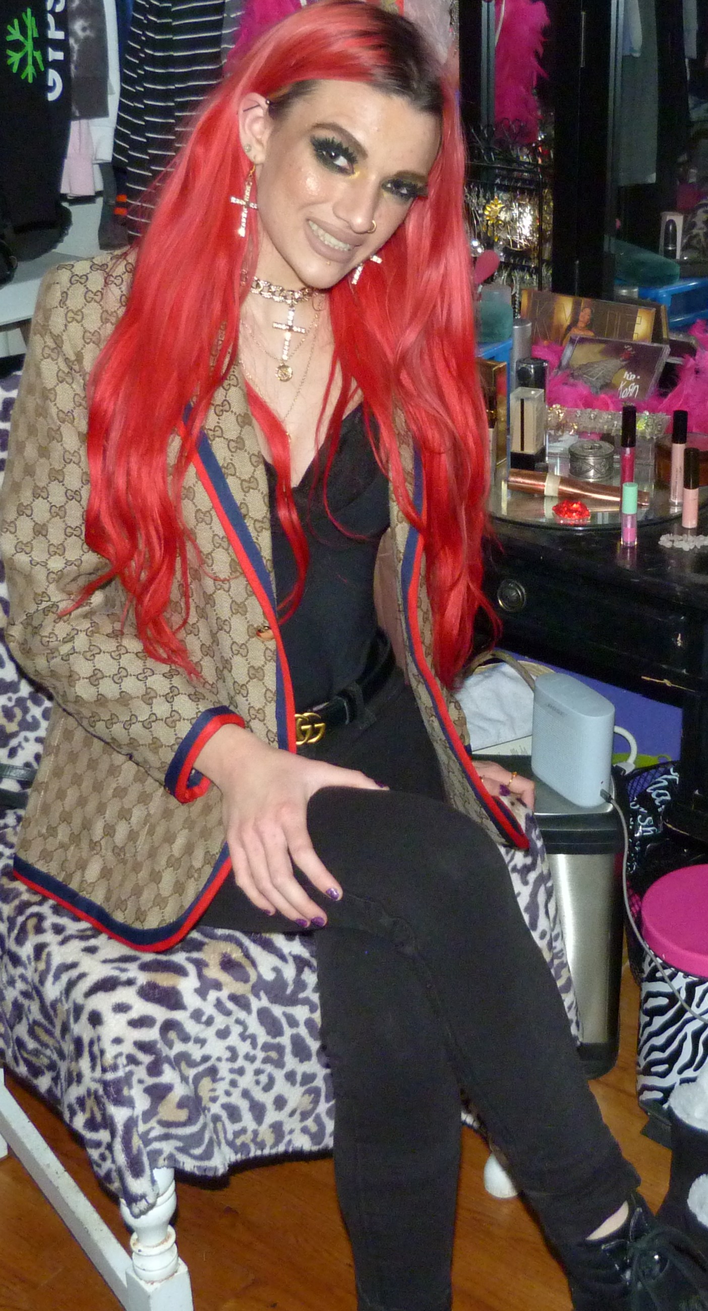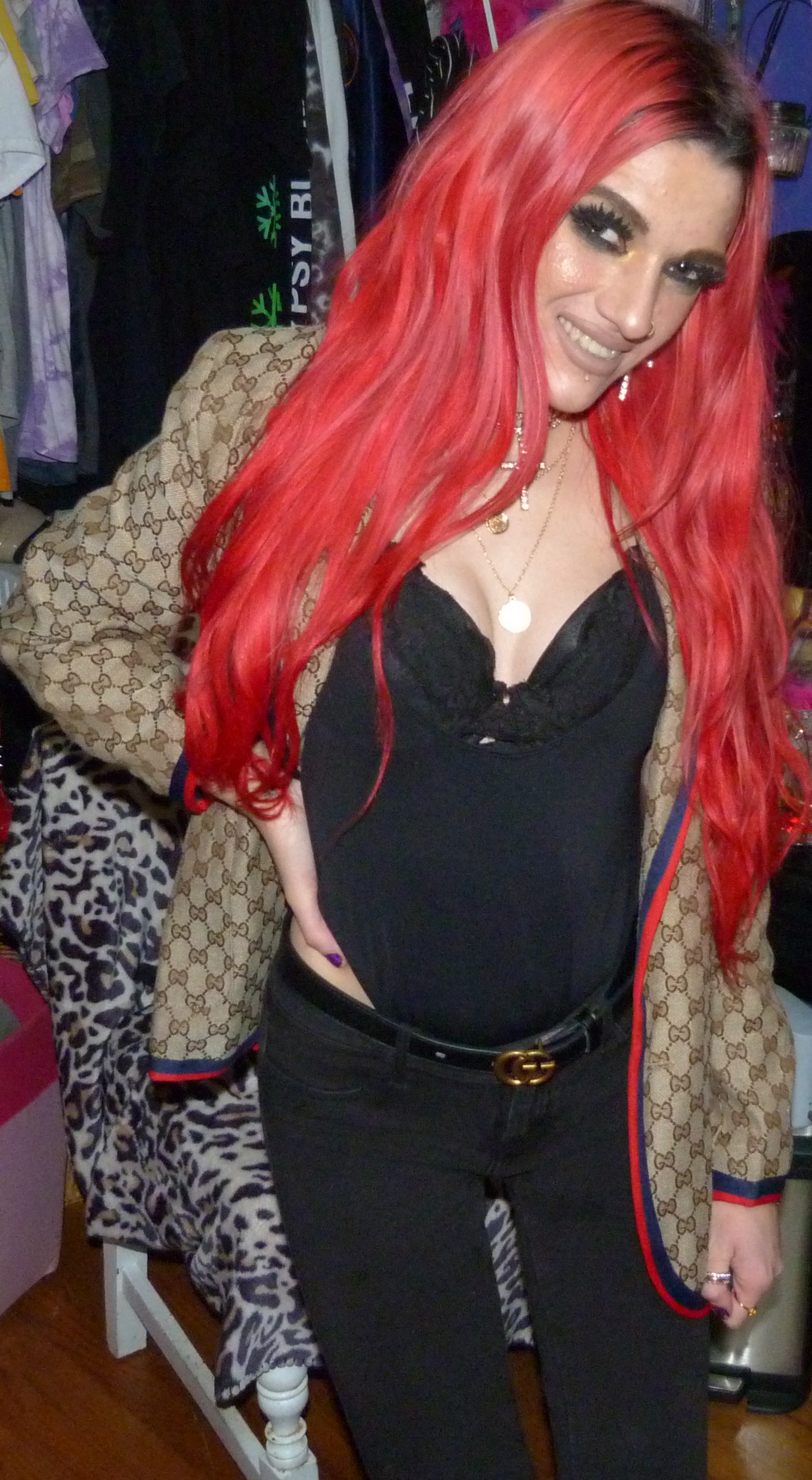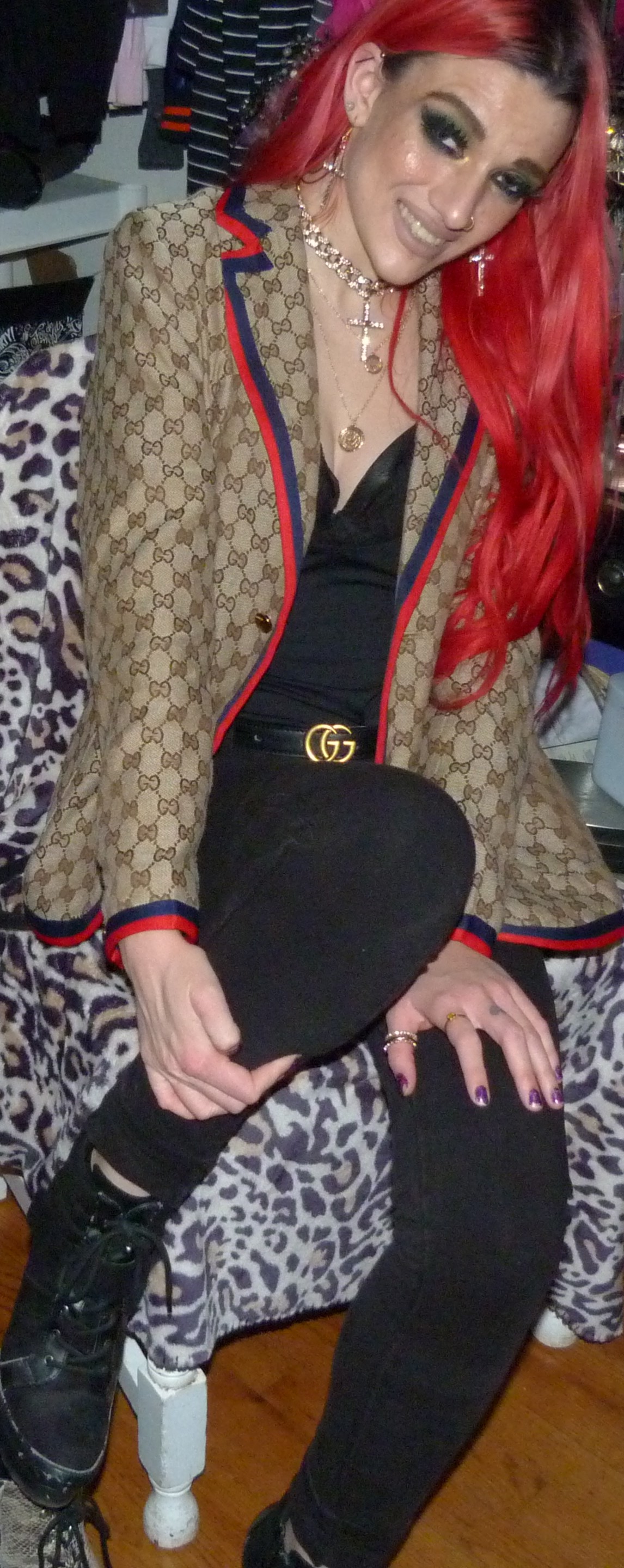 I loved that I did this new Gucci outfit & photoshoot, it’s a pretty awesome one! I wore this new Gucci jacket with this black Gucci belt of mine that I got in like 2o22, the Demi Lovato x Fabletics bodysuit I mentioned & the Dolls Kill cross choker & matching earrings too! I love that just I got more Gucci for Christmas though, I was excited to do a new Gucci post like this. I’ve also done two other posts so far that have Gucci in the title too, which is cool. I have other Gucci related posts too with my other belts & things that I have from Gucci, but the other two include one, my 2022 Gucci Gold post which is my original post for this belt! Then two, my first ever Gucci post with the Gucci bracelet that I got in 2016 called Gucci Guild too! I have like one more Gucci post after this one with another name like that that I could do for my next one like this, but for now I had to do this one next! This is a perfect one to have done, with the title & everything. I’m excited about this one too! I love Gucci so much, it’s my favorite high fashion brand. I have a bunch of different Gucci things too, you can check out all my other posts with my Gucci category! I’ve still been using my Gucci bag these days too, which is in the background of some of my photoshoots. Let’s get into the photoshoot finally, I did like a couple collages with this jacket & then a couple with just the bodysuit! It was a pretty good outfit, I liked how this turned out!