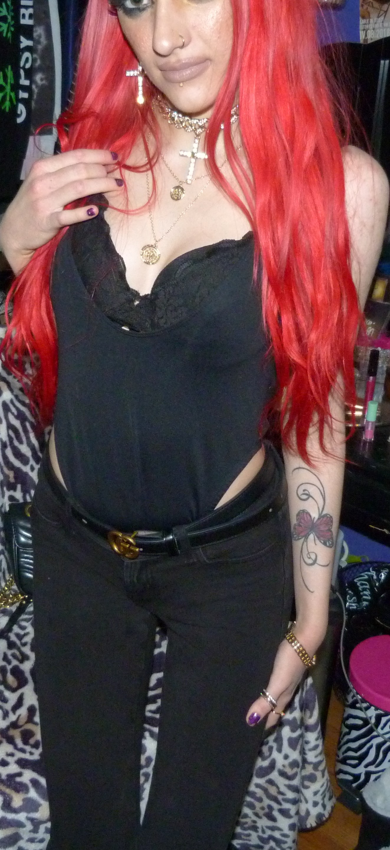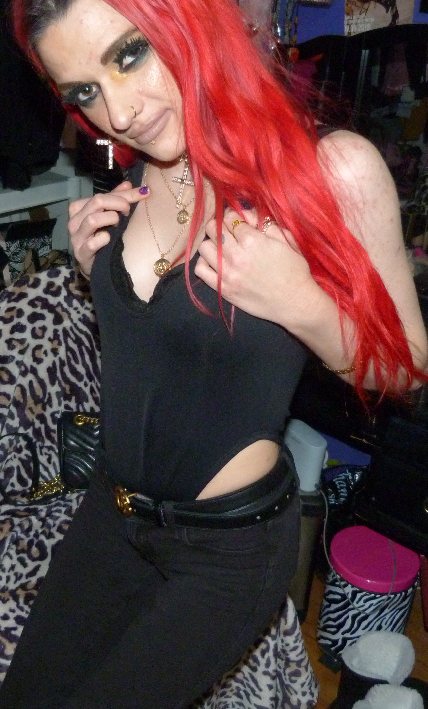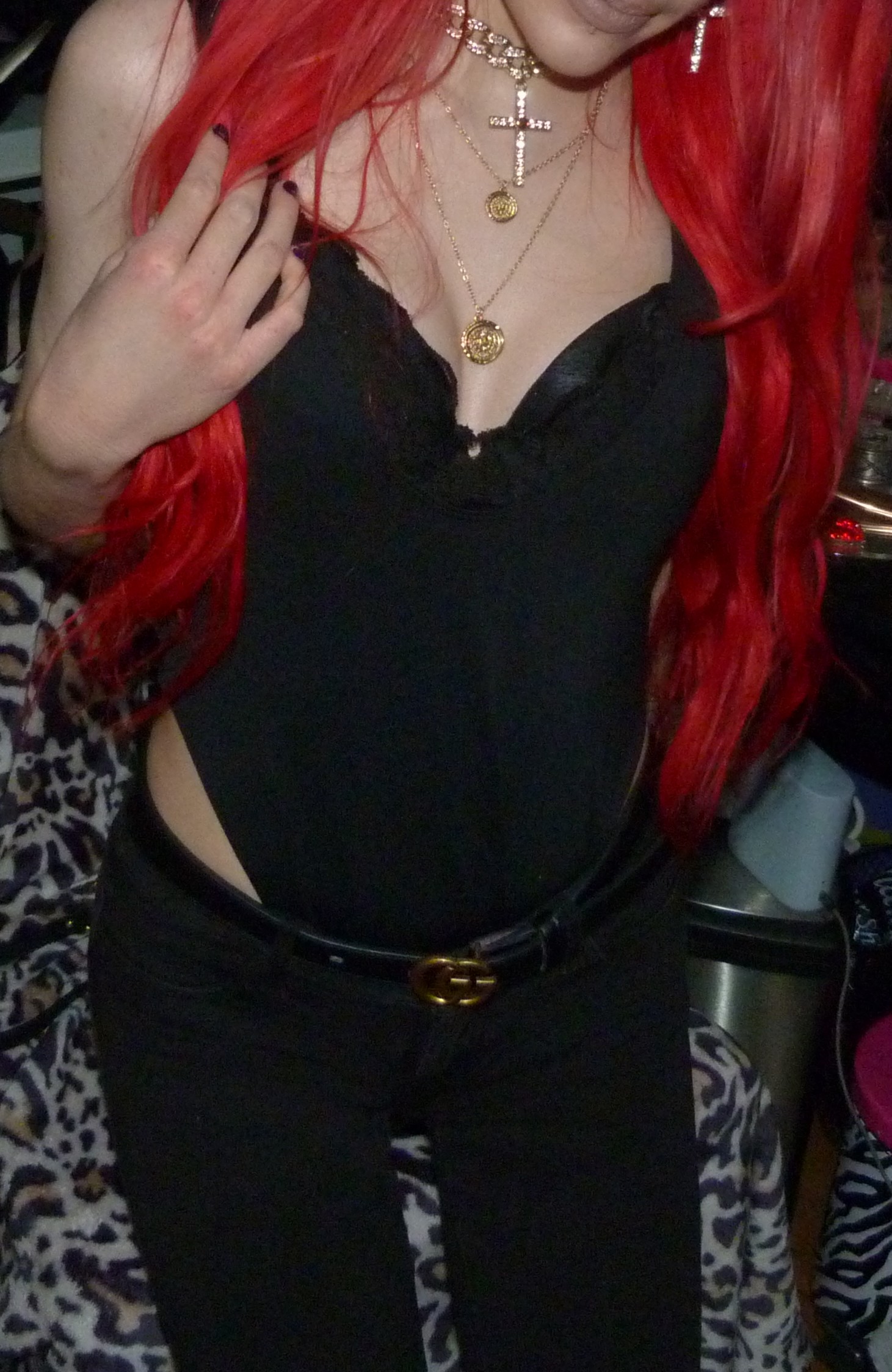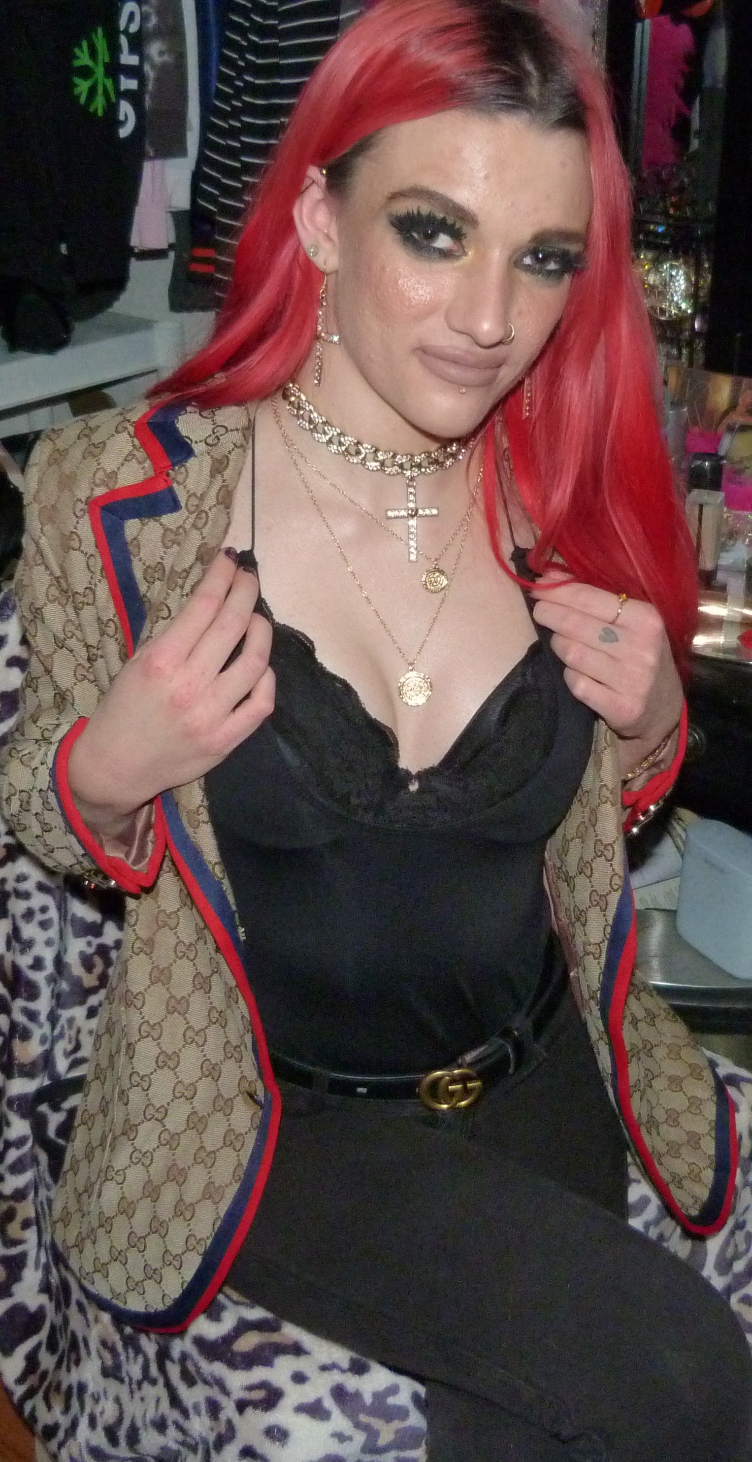 I loved that I did this new Gucci outfit & photoshoot, it’s a pretty awesome one! I wore this new Gucci jacket with this black Gucci belt of mine that I got in like 2o22, the Demi Lovato x Fabletics bodysuit I mentioned & the Dolls Kill cross choker & matching earrings too! I love that just I got more Gucci for Christmas though, I was excited to do a new Gucci post like this. I’ve also done two other posts so far that have Gucci in the title too, which is cool. I have other Gucci related posts too with my other belts & things that I have from Gucci, but the other two include one, my 2022 Gucci Gold post which is my original post for this belt! Then two, my first ever Gucci post with the Gucci bracelet that I got in 2016 called Gucci Guild too! I have like one more Gucci post after this one with another name like that that I could do for my next one like this, but for now I had to do this one next! This is a perfect one to have done, with the title & everything. I’m excited about this one too! I love Gucci so much, it’s my favorite high fashion brand. I have a bunch of different Gucci things too, you can check out all my other posts with my Gucci category! I’ve still been using my Gucci bag these days too, which is in the background of some of my photoshoots. Let’s get into the photoshoot finally, I did like a couple collages with this jacket & then a couple with just the bodysuit! It was a pretty good outfit, I liked how this turned out!