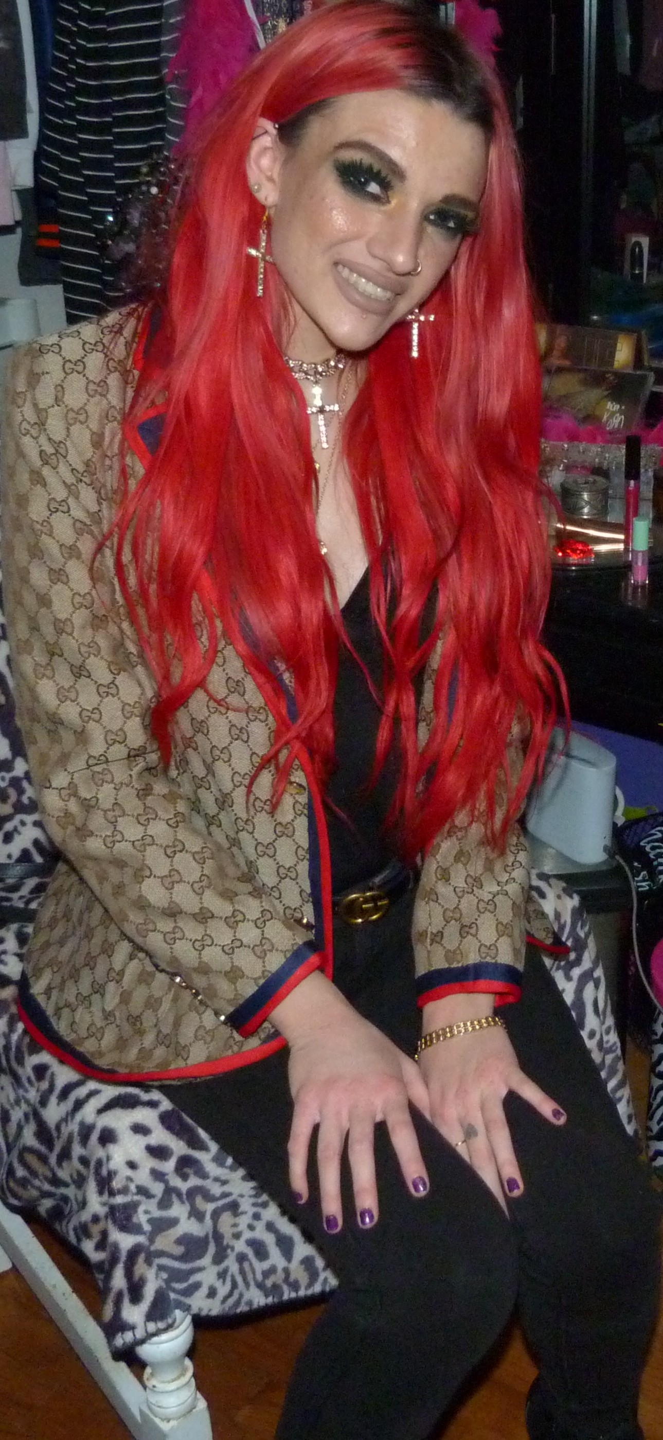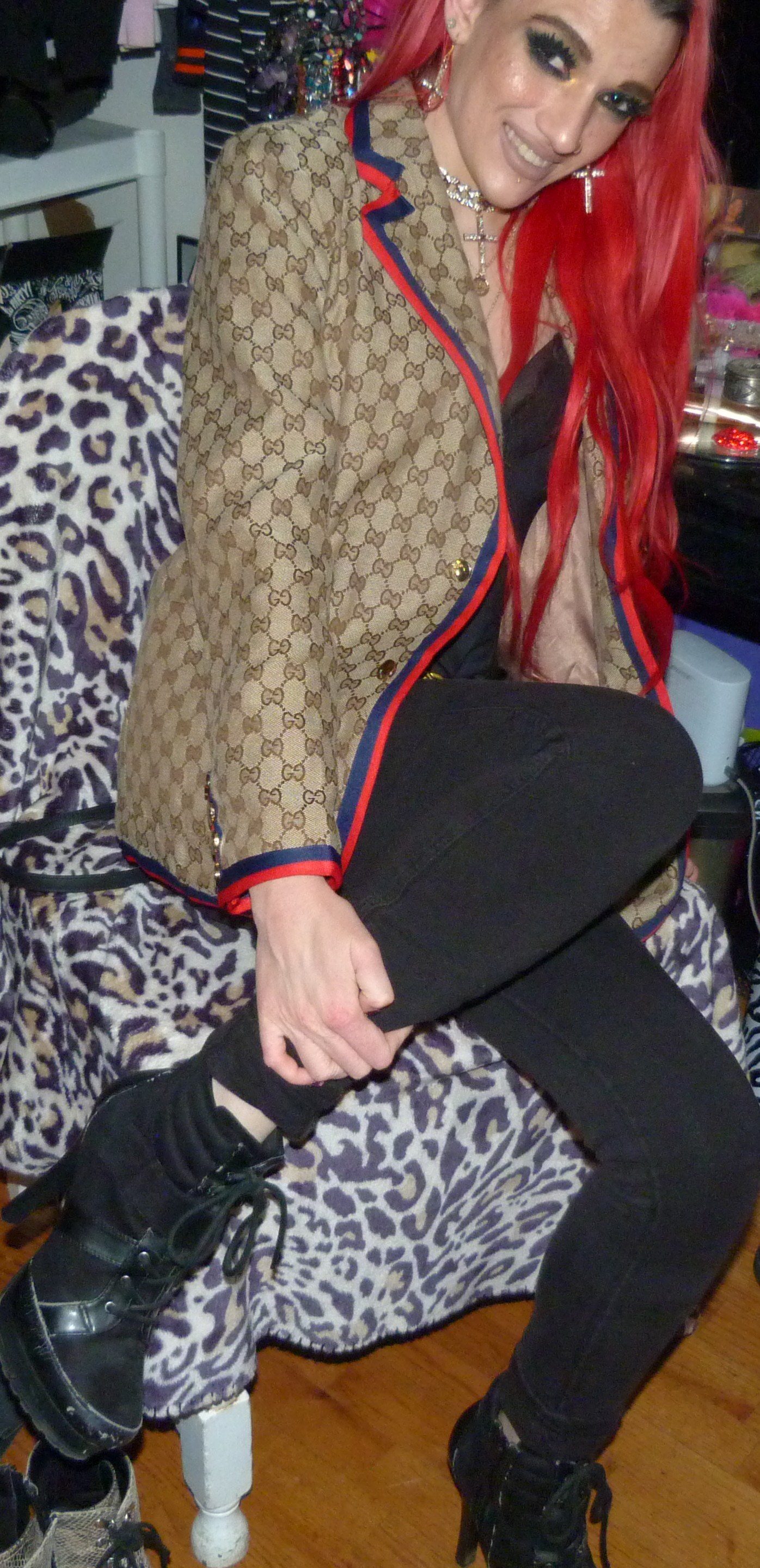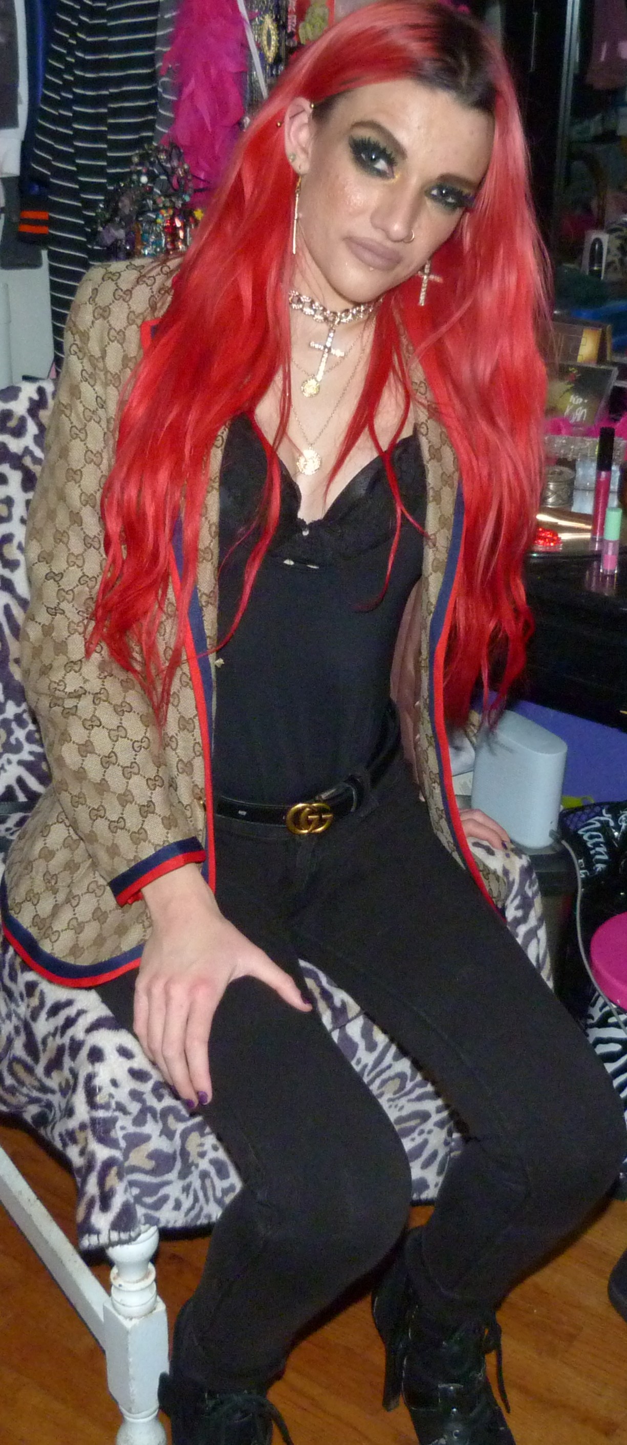 It’s good to be back with my second post of the year, this awesome Gucci photoshoot of mine! I ended up getting this awesome beige Gucci jacket last Christmas as one of my presents & it’s really cool too! I always love Gucci so much, I asked for more Gucci for Christmas last month from my mom & so she got me this awesome jacket. It was perfect to wear this for my second post of January too, it is perfect to finally do a Christmas present! I also had this perfect Demi Lovato x Fabletics bodysuit too to wear with it, I’ve been meaning to do a photoshoot with it finally! It was so perfect to wear that with it too, that turned out awesome. I also used a perfect Demi song to name the photoshoot, 4 EVER 4 ME that I love from her HOLY FVCK album she did, in 2022. I thought that was a good idea with the bodysuit! I always loved Demi so much back in the day when she used to do Fabletics also, I used to get a bunch of her workout clothes but this was the only thing I got that is a wearable piece of clothing. But I’m so glad I finally found a perfect outfit for this bodysuit that I also got in like, late 2018! This is also such a good outfit & photoshoot that I loved, it turned out really good. I also loved getting to finally wear my gold cross choker with the matching earrings too that I got a while ago, from Dolls Kill. I’ve been like really meaning to wear them together! This is a really good look though & I’m happy about this shoot. The lipstick is really perfect here, too. I’m so excited I put together such a good outfit with this jacket!