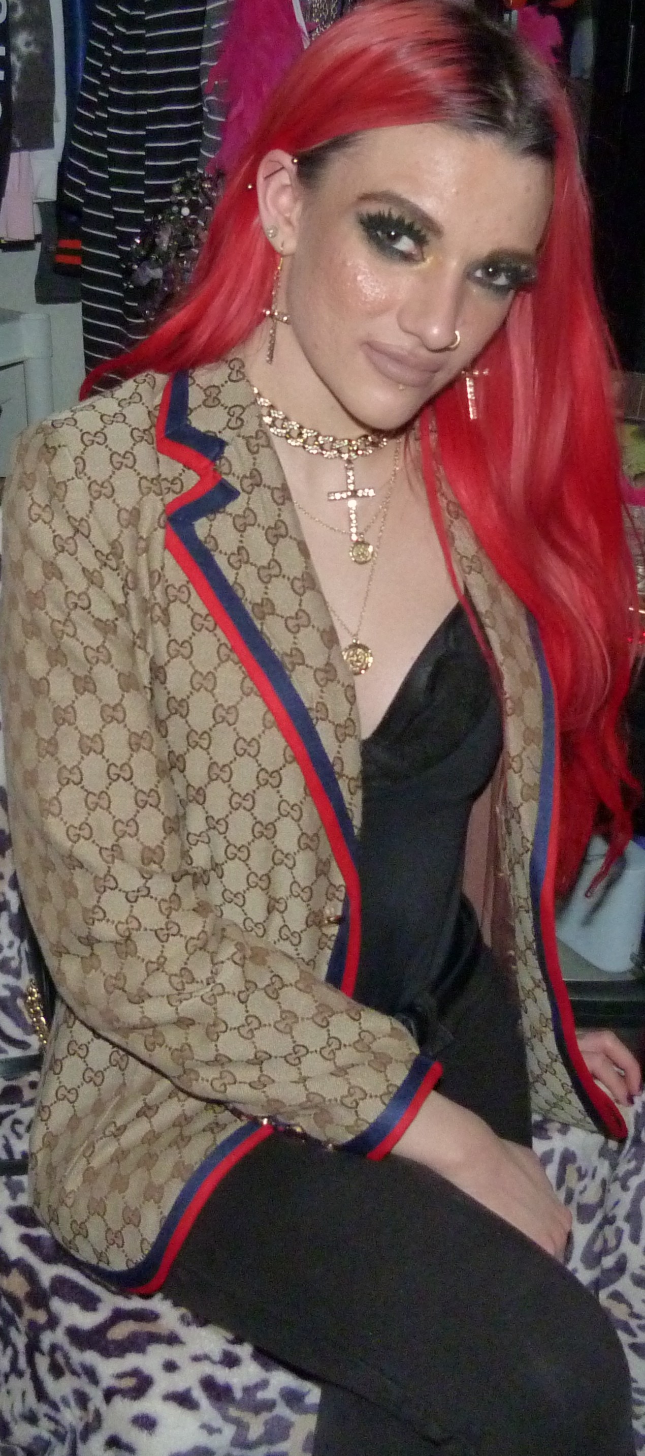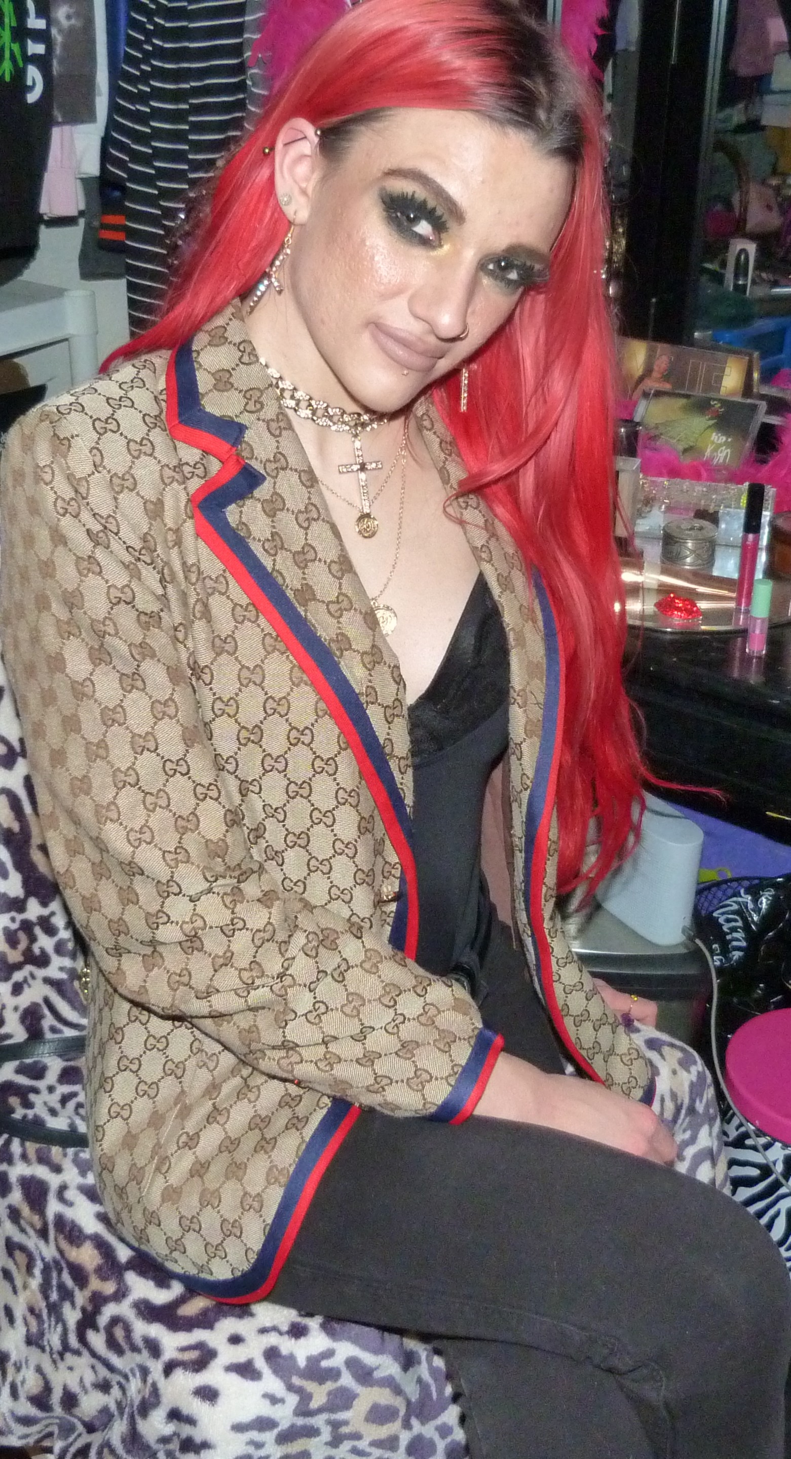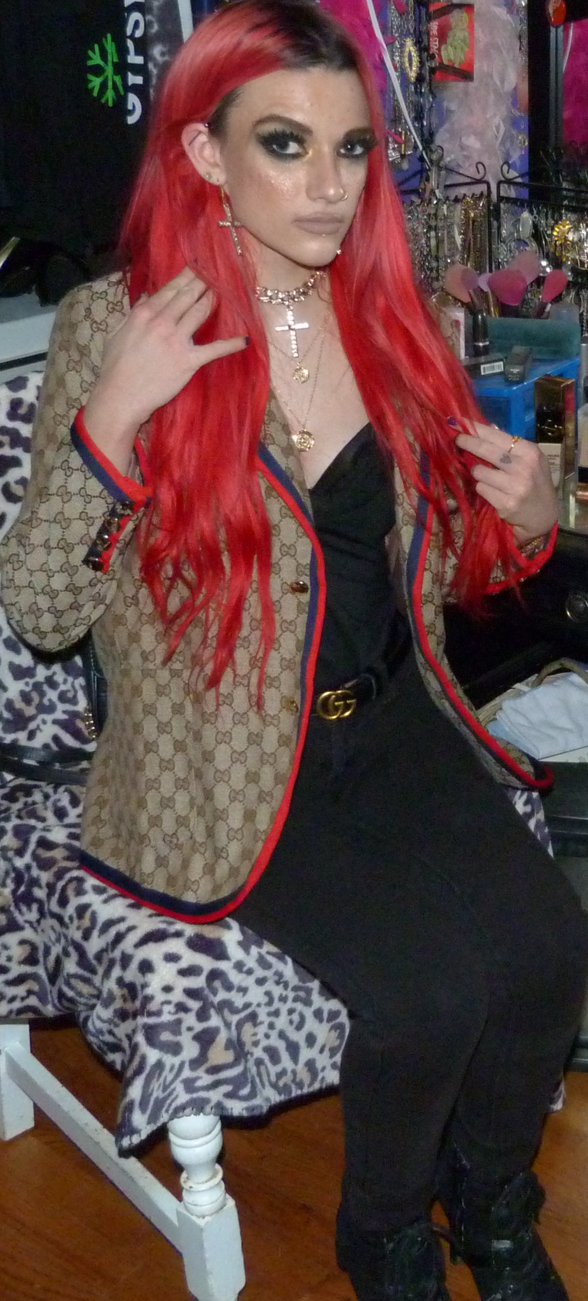 It’s good to be back with my second post of the year, this awesome Gucci photoshoot of mine! I ended up getting this awesome beige Gucci jacket last Christmas as one of my presents & it’s really cool too! I always love Gucci so much, I asked for more Gucci for Christmas last month from my mom & so she got me this awesome jacket. It was perfect to wear this for my second post of January too, it is perfect to finally do a Christmas present! I also had this perfect Demi Lovato x Fabletics bodysuit too to wear with it, I’ve been meaning to do a photoshoot with it finally! It was so perfect to wear that with it too, that turned out awesome. I also used a perfect Demi song to name the photoshoot, 4 EVER 4 ME that I love from her HOLY FVCK album she did, in 2022. I thought that was a good idea with the bodysuit! I always loved Demi so much back in the day when she used to do Fabletics also, I used to get a bunch of her workout clothes but this was the only thing I got that is a wearable piece of clothing. But I’m so glad I finally found a perfect outfit for this bodysuit that I also got in like, late 2018! This is also such a good outfit & photoshoot that I loved, it turned out really good. I also loved getting to finally wear my gold cross choker with the matching earrings too that I got a while ago, from Dolls Kill. I’ve been like really meaning to wear them together! This is a really good look though & I’m happy about this shoot. The lipstick is really perfect here, too. I’m so excited I put together such a good outfit with this jacket!
