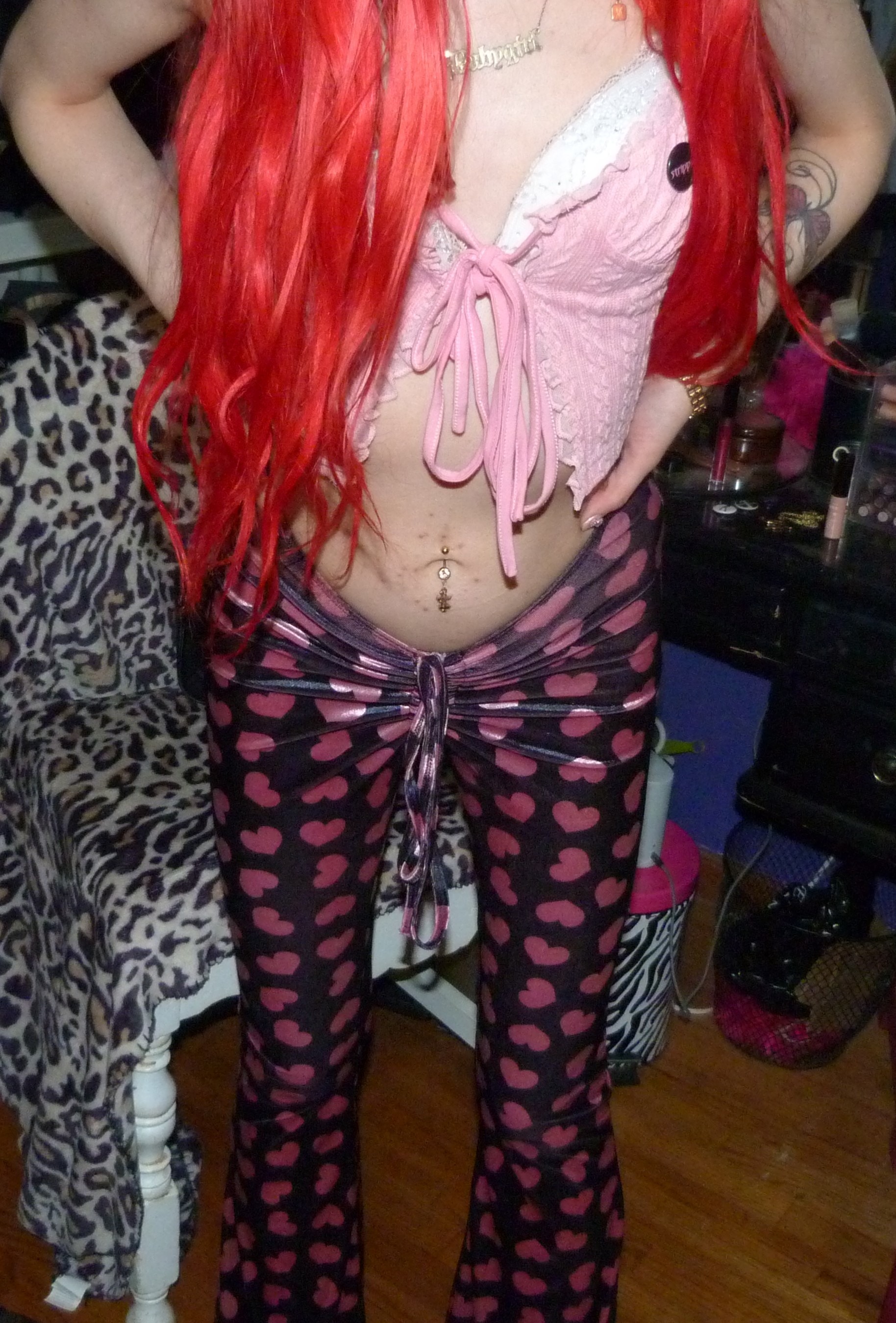 - Maneater V-Cut Bell Bottoms $48 also by Sugar Thrillz from Dolls Kill that I got from the same order. These are cute with hearts all over them that are just like the pants from Xtina’s Stripped era, too!