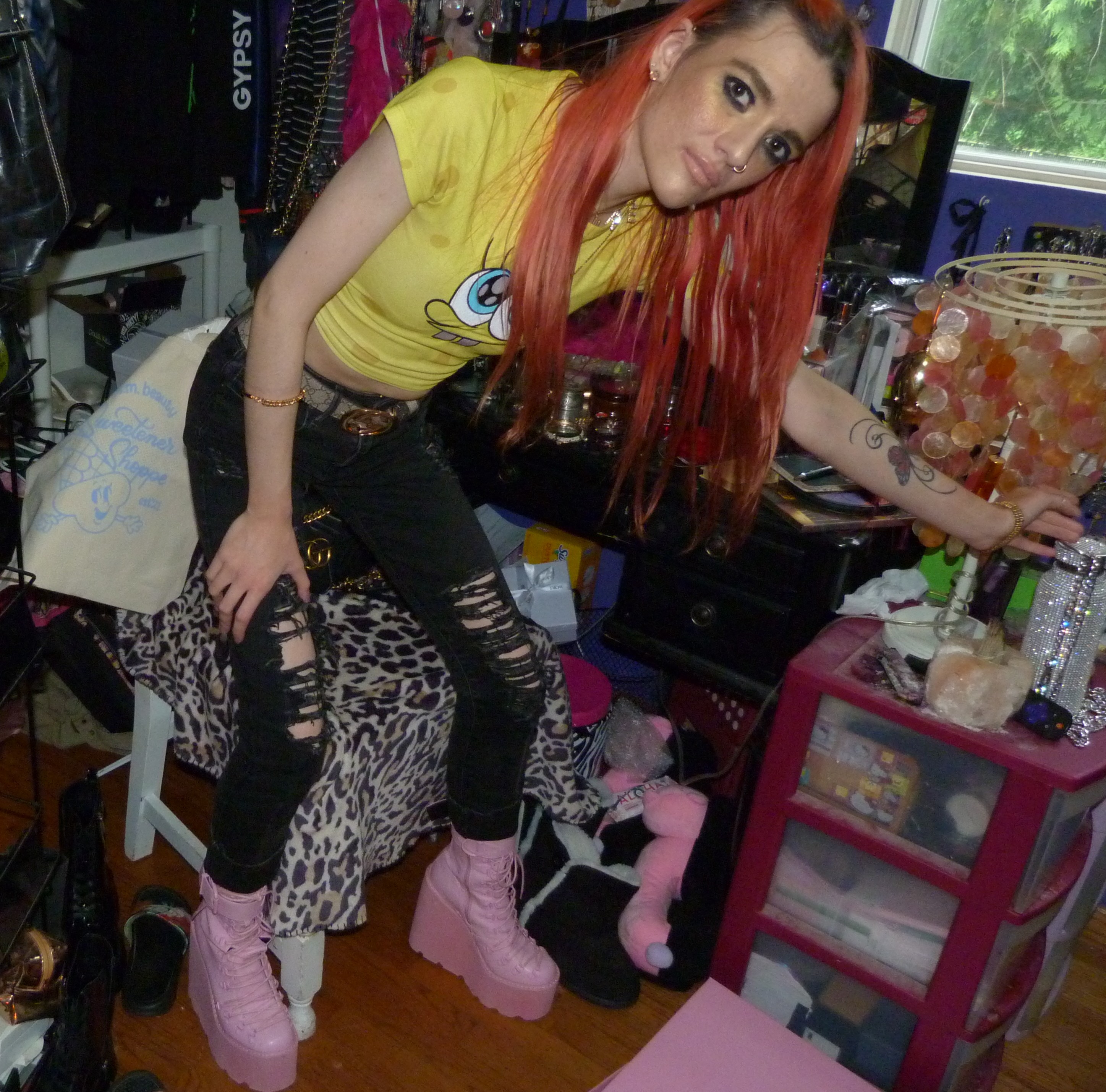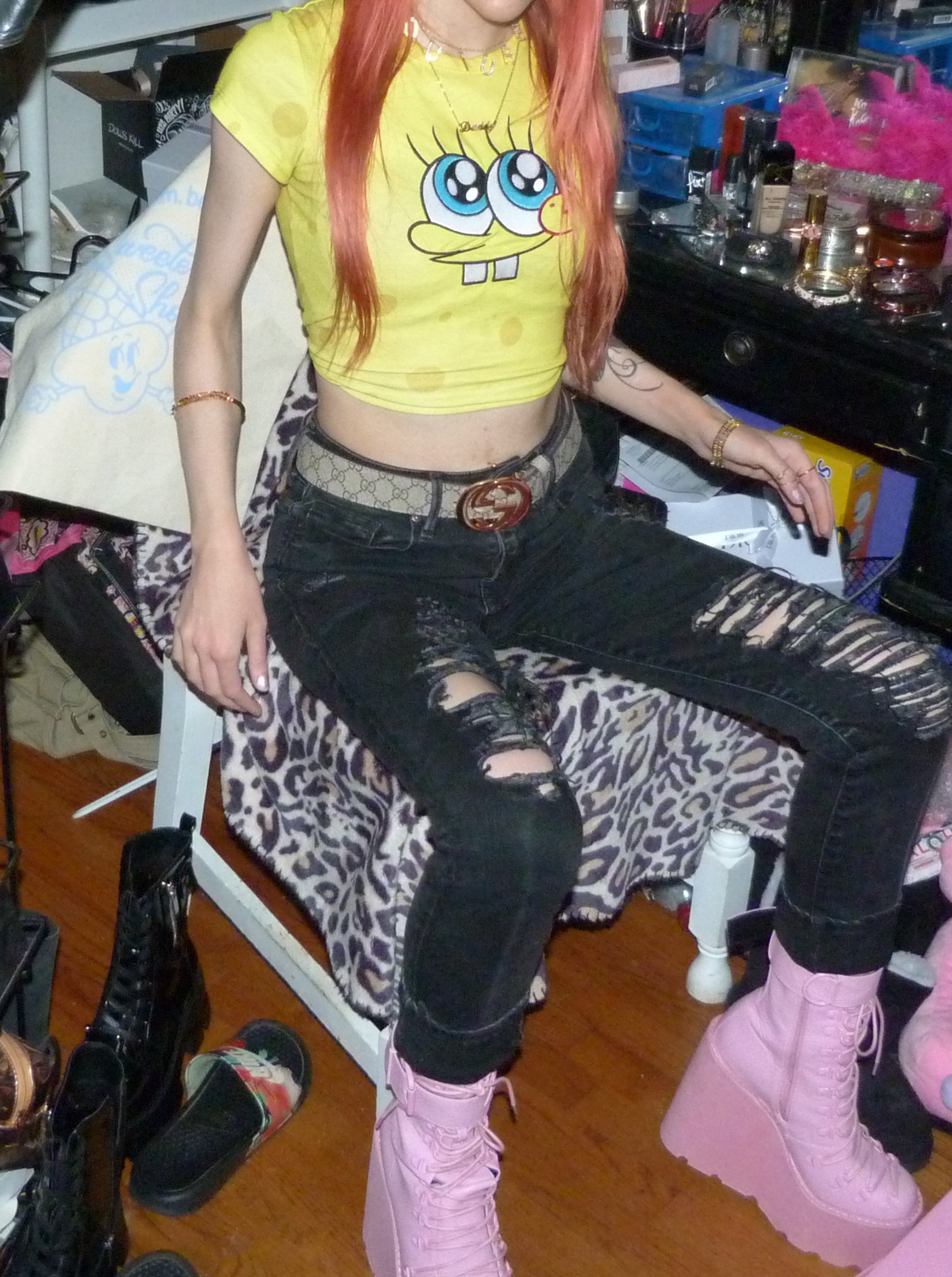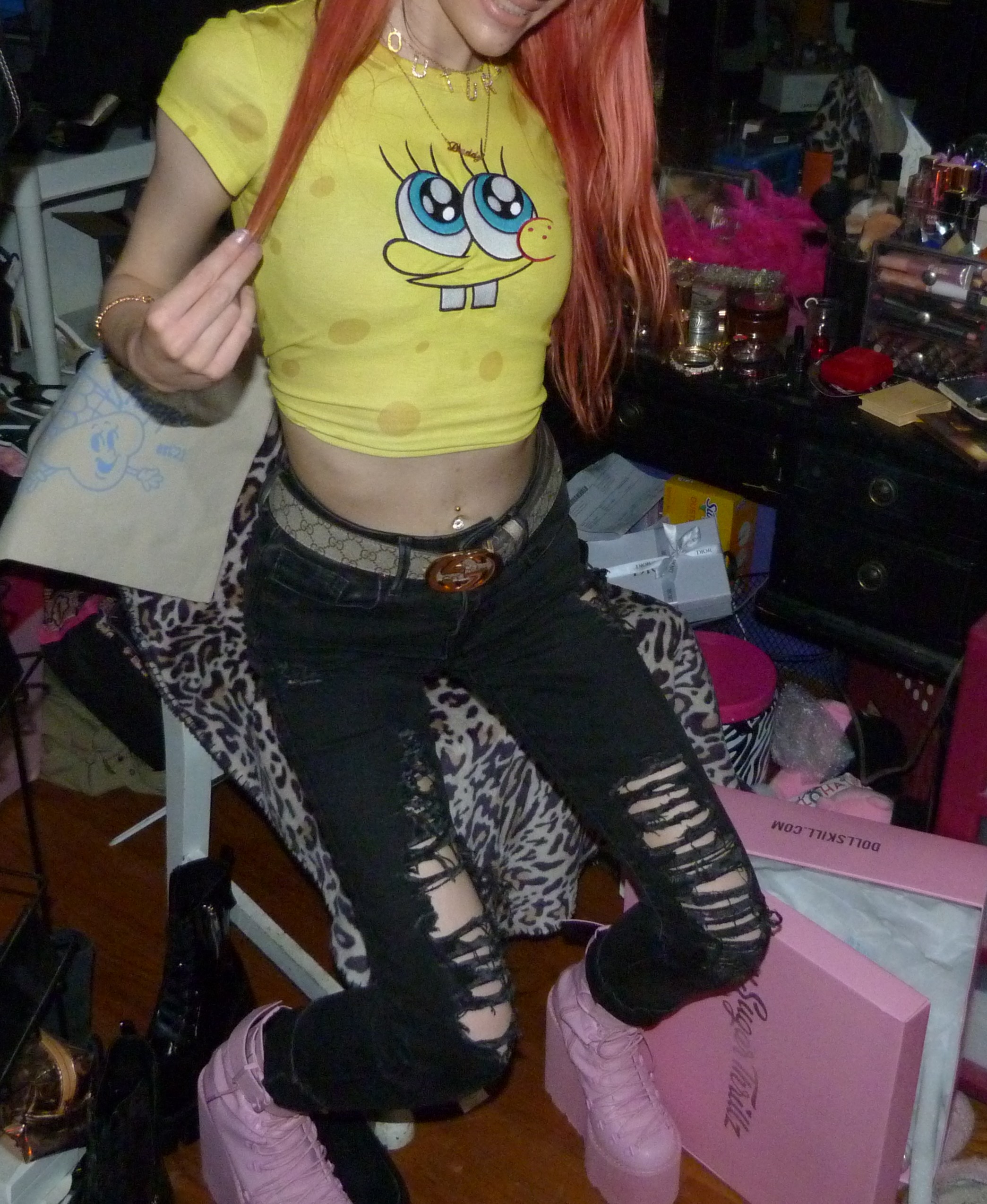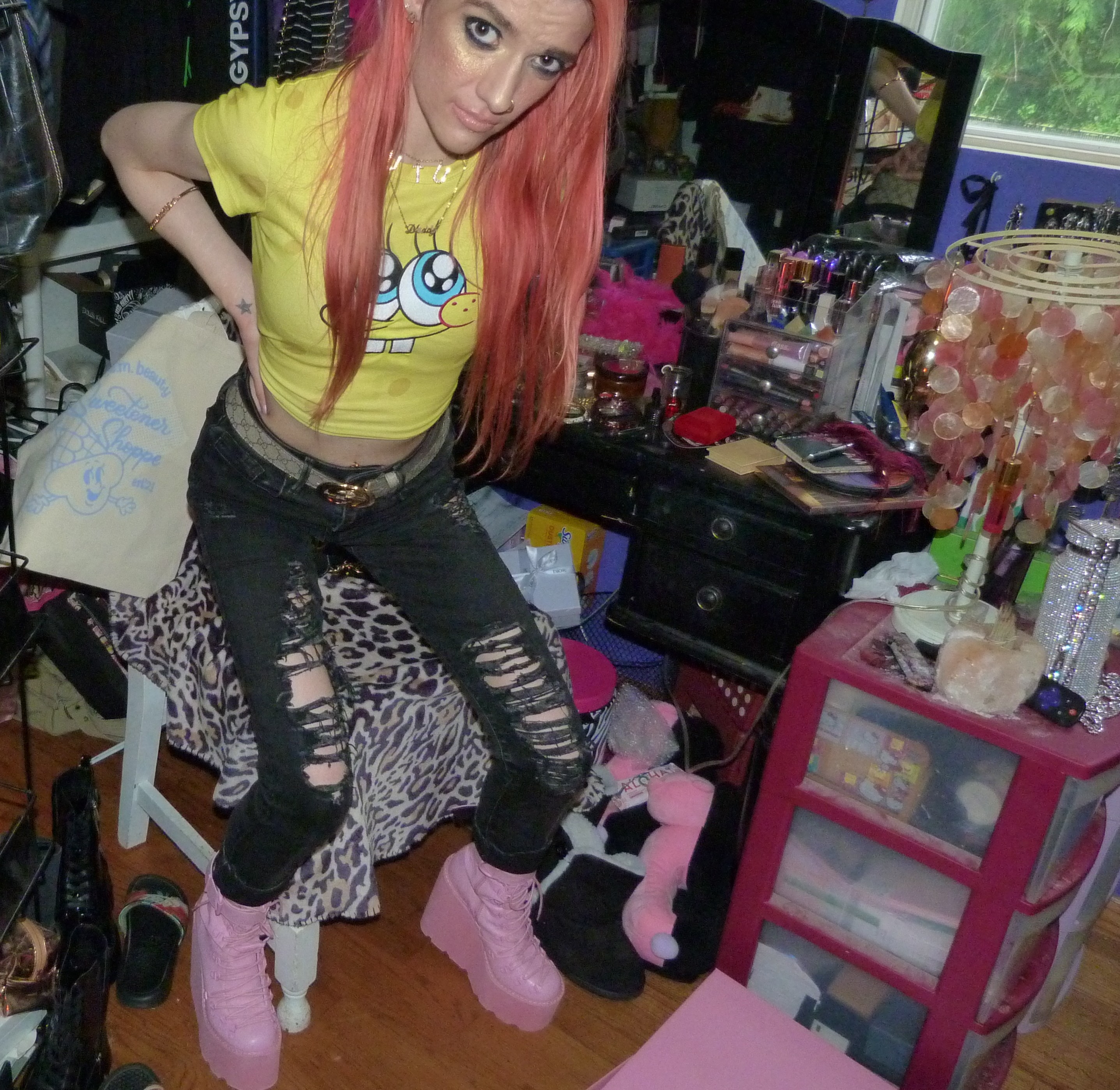 SPONGEBOB SQUAREPARENTS! Peach hair with Ariana Grande REM x2 hair clips, Daddy necklace, new Dolls Kill Bubblegum Traitor Boots that I just bought & a Dolls Kill x SpongeBob Collection Top!