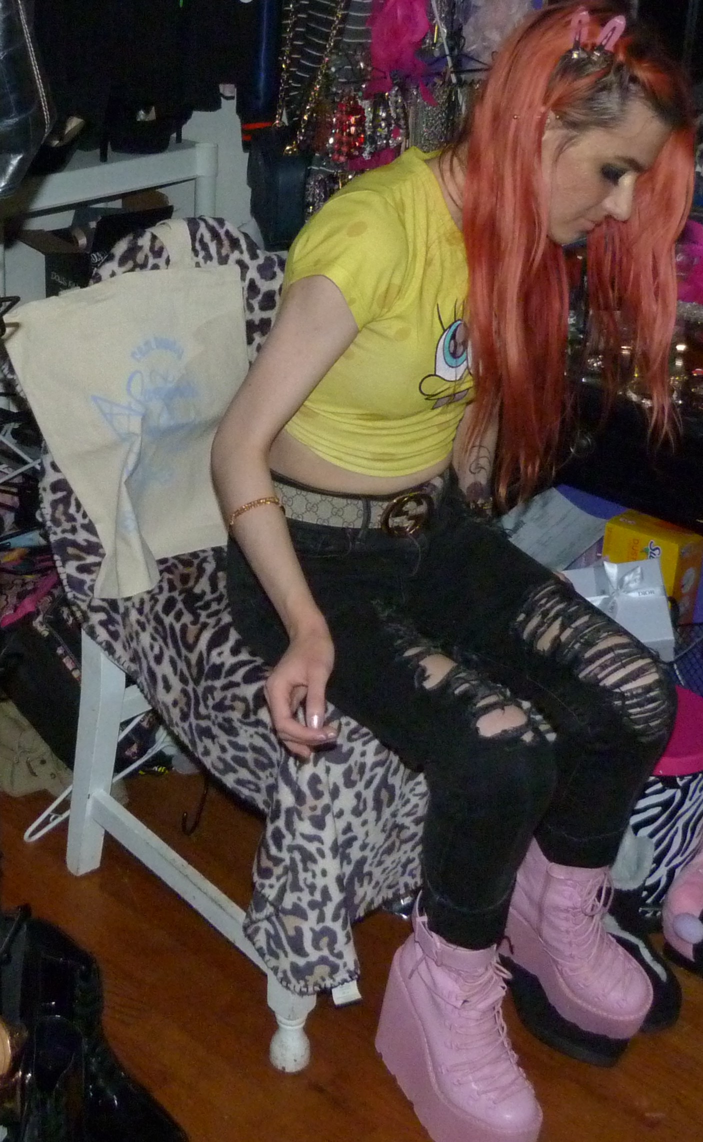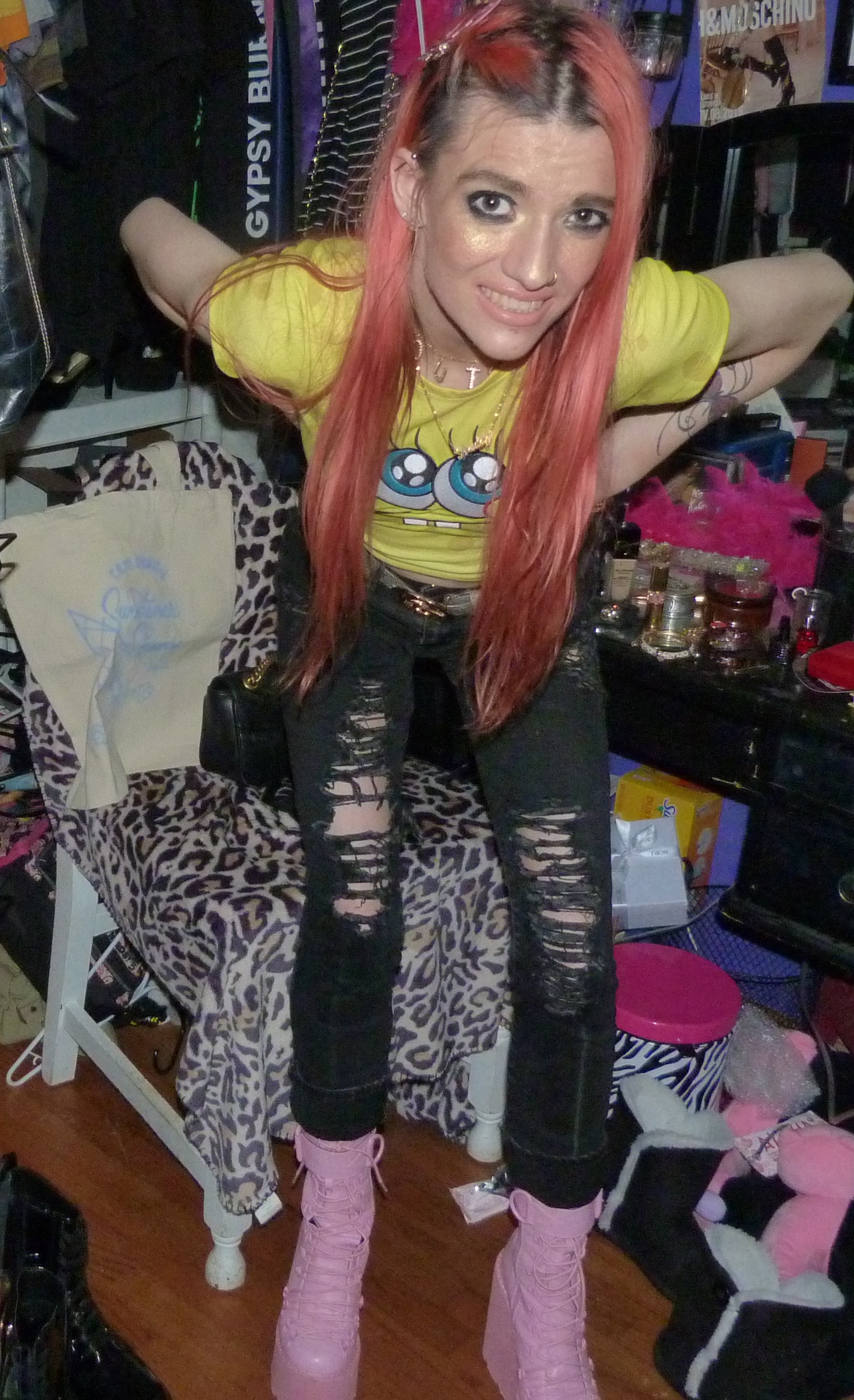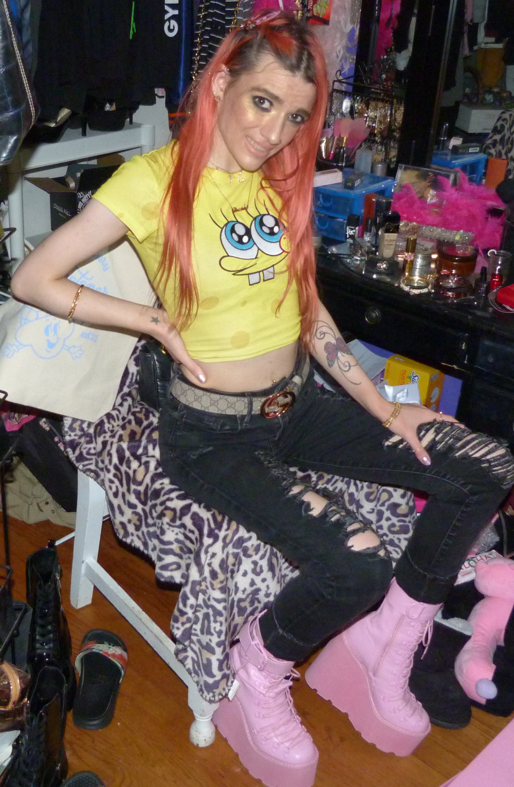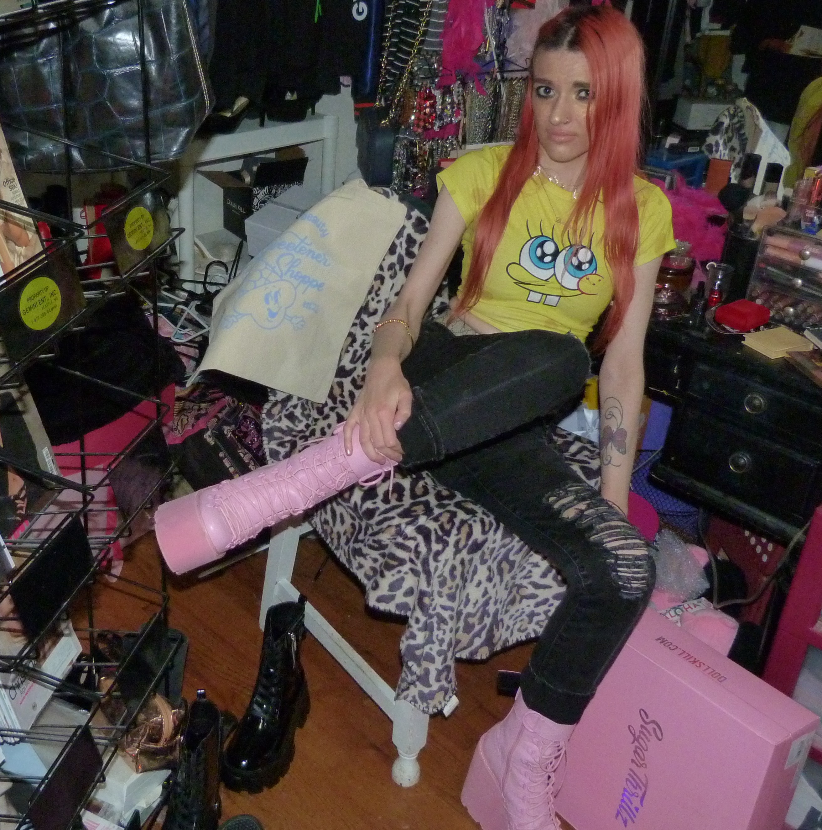 SPONGEBOB SQUAREPARENTS! Peach hair with Ariana Grande REM x2 hair clips, Daddy necklace, new Dolls Kill Bubblegum Traitor Boots that I just bought & a Dolls Kill x SpongeBob Collection Top!